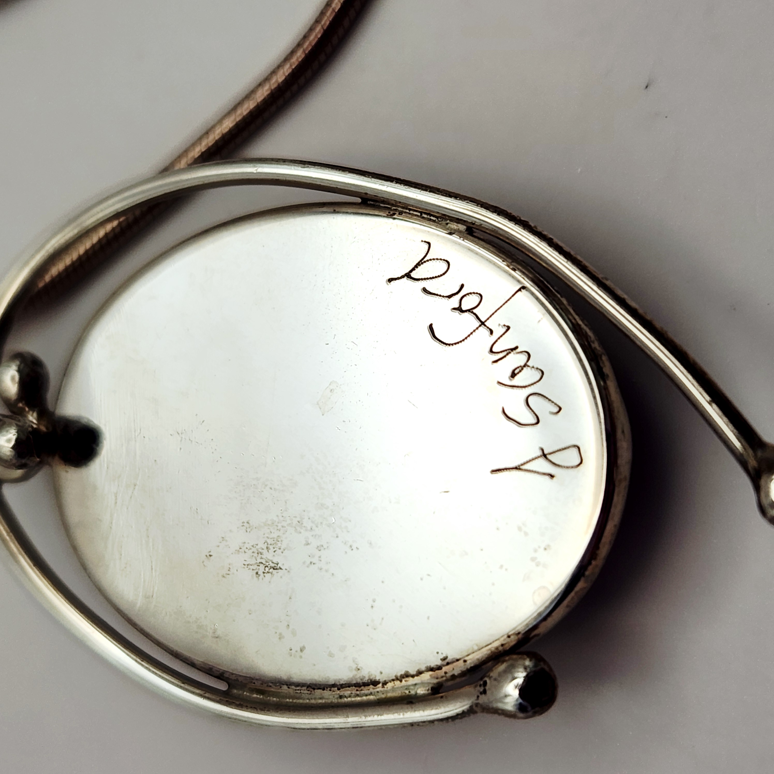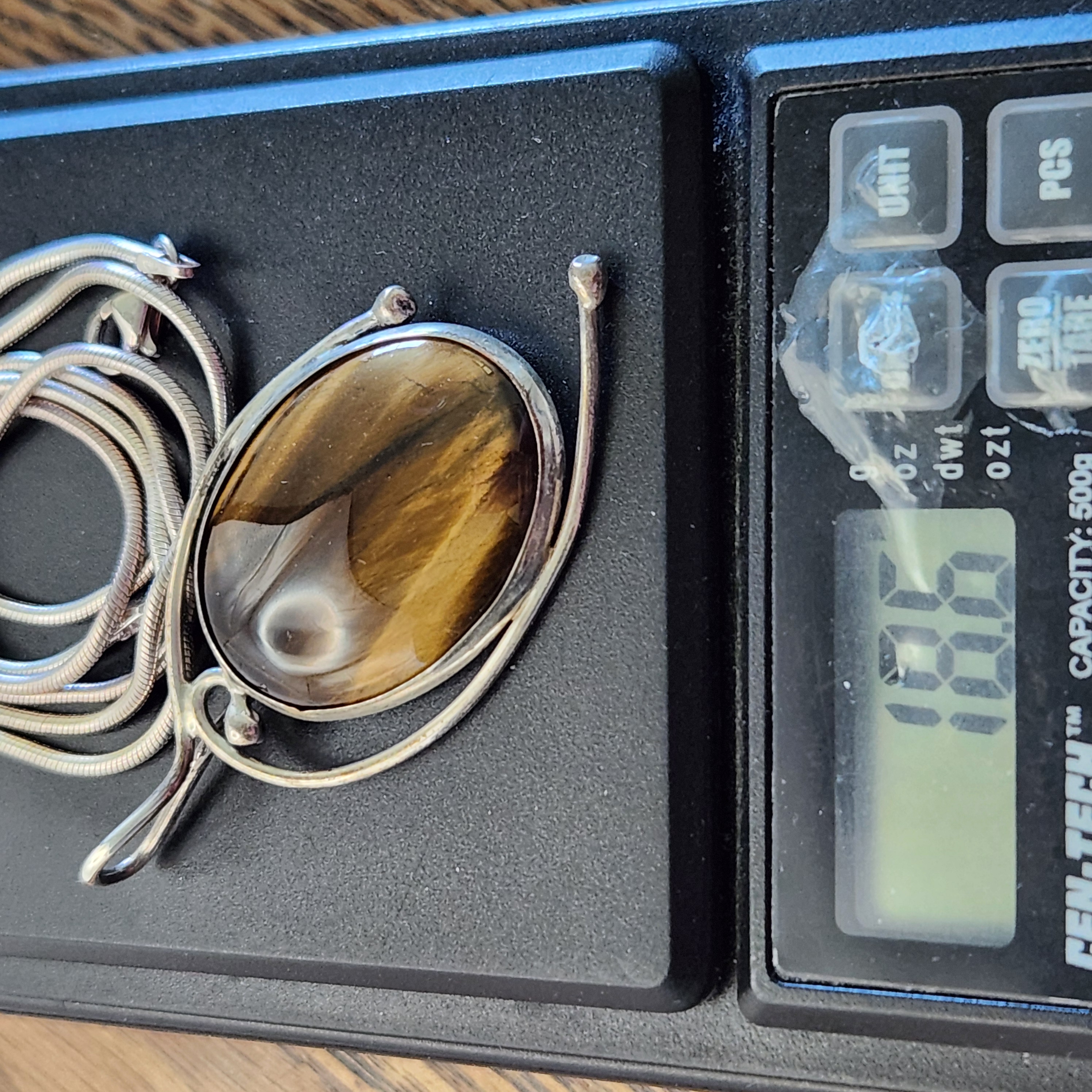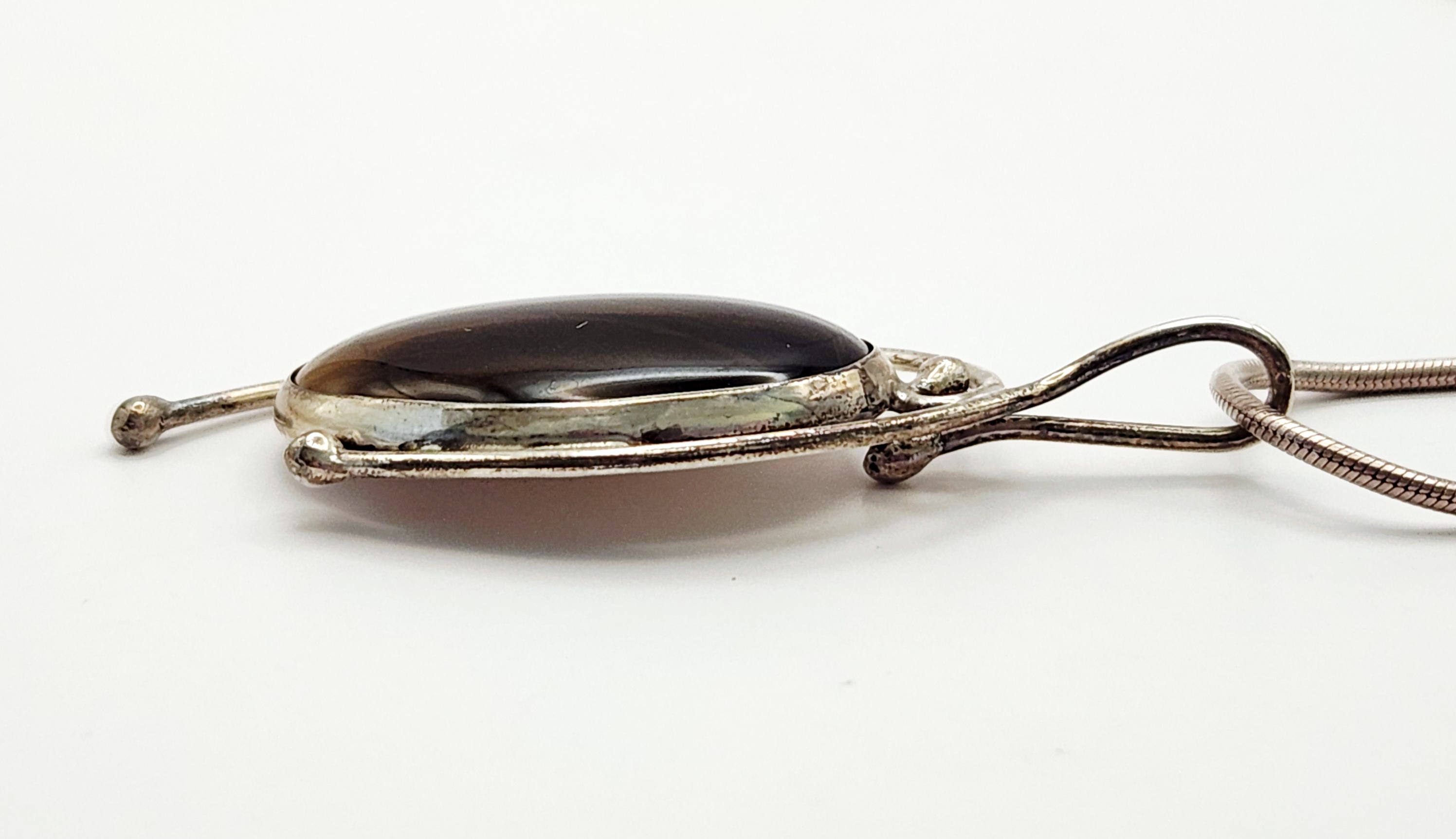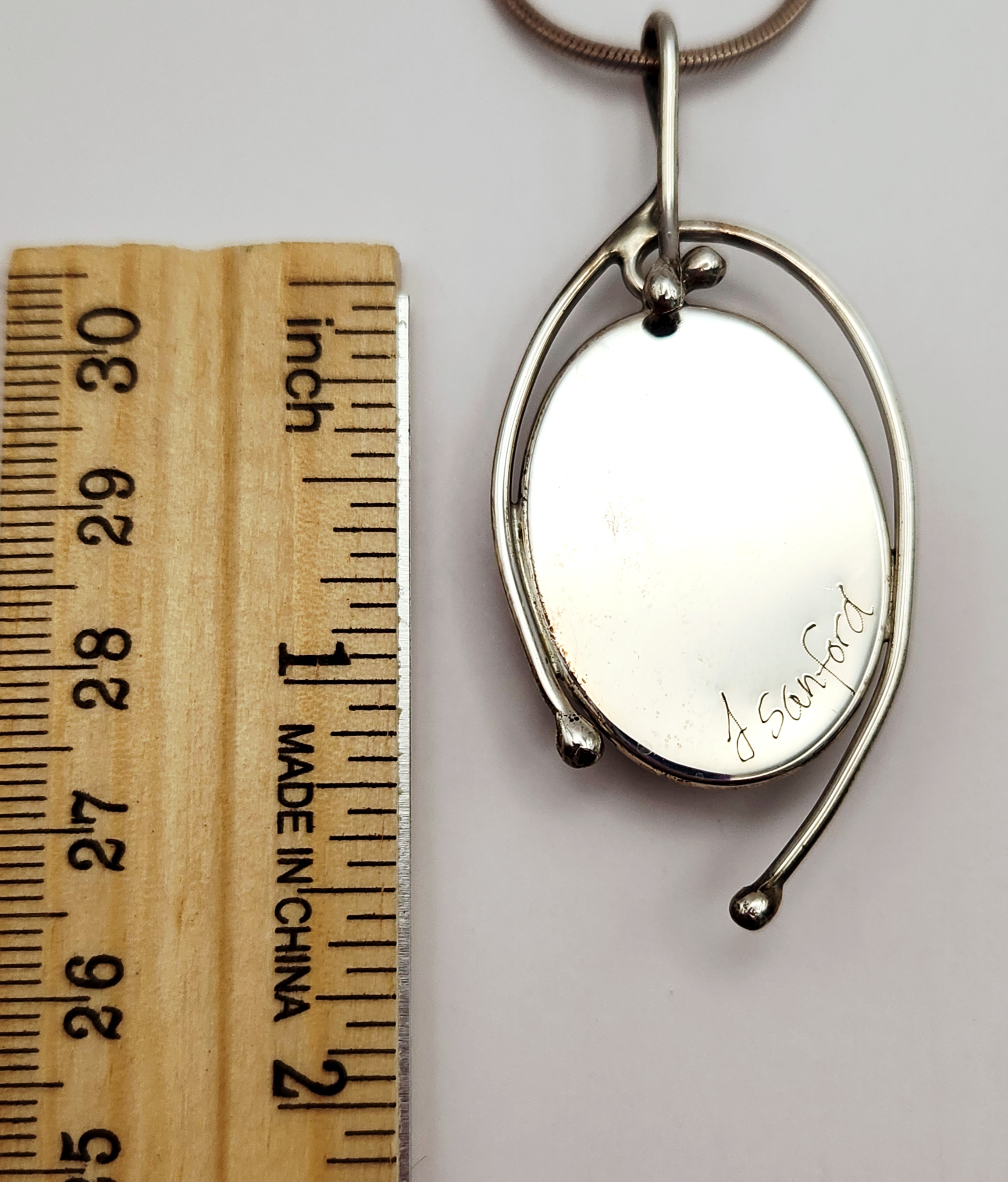 A modernist studio jewelry necklace featuring a pendant by J. Sanford. The pendant consists of a large oval tiger’s eye cabochon set within a stylized sterling silver frame featuring openwork wire designs and ball terminals. The pendant is suspended from a sterling silver snake chain. The reverse of the pendant is hand-engraved J Sanford. The lobster claw clasp and the chain end caps are stamped 925. Pendant length: approximately 1.5 inches Total weight: 18.6 grams. Good condition with minor surface scratches and light tarnish throughout consistent with age and wear.