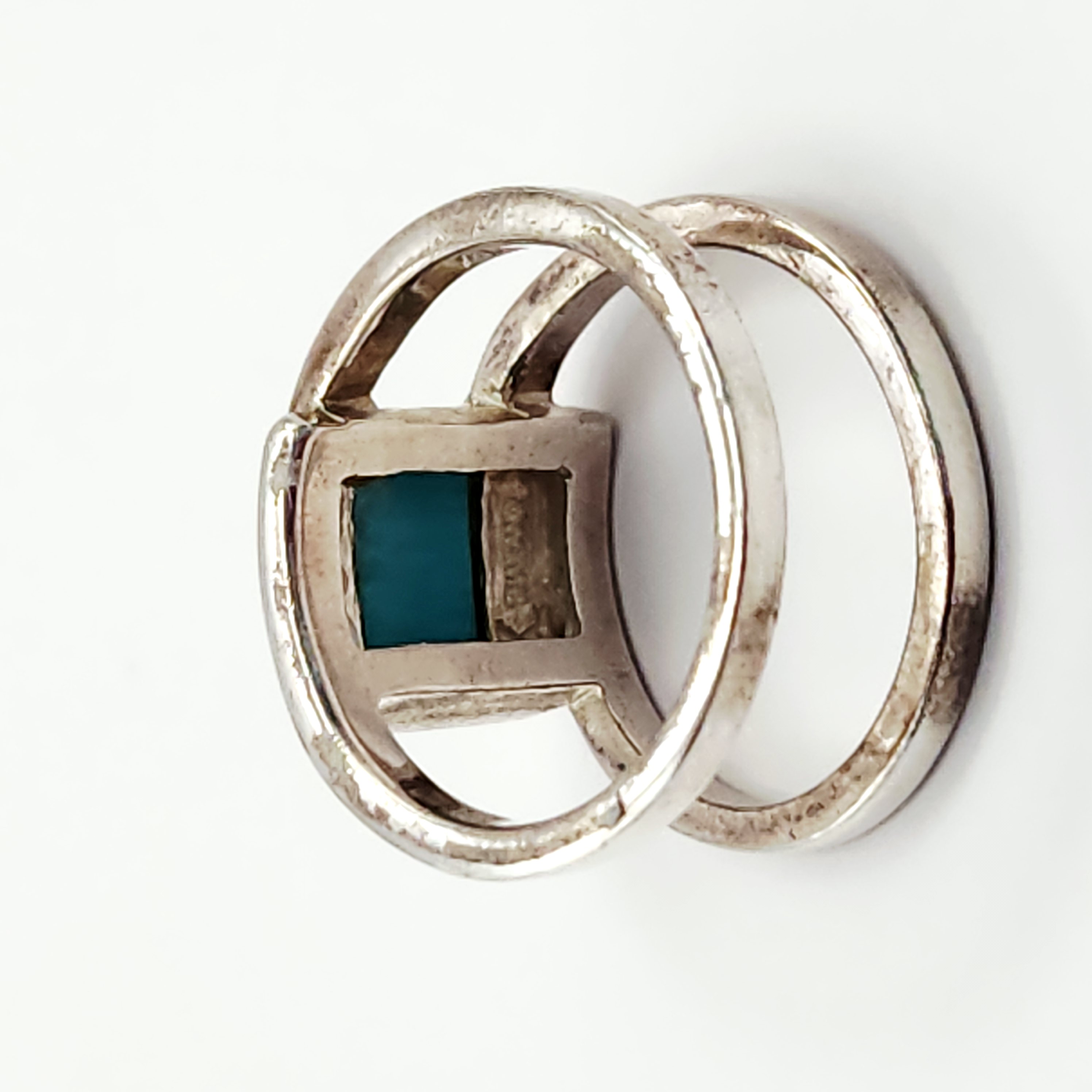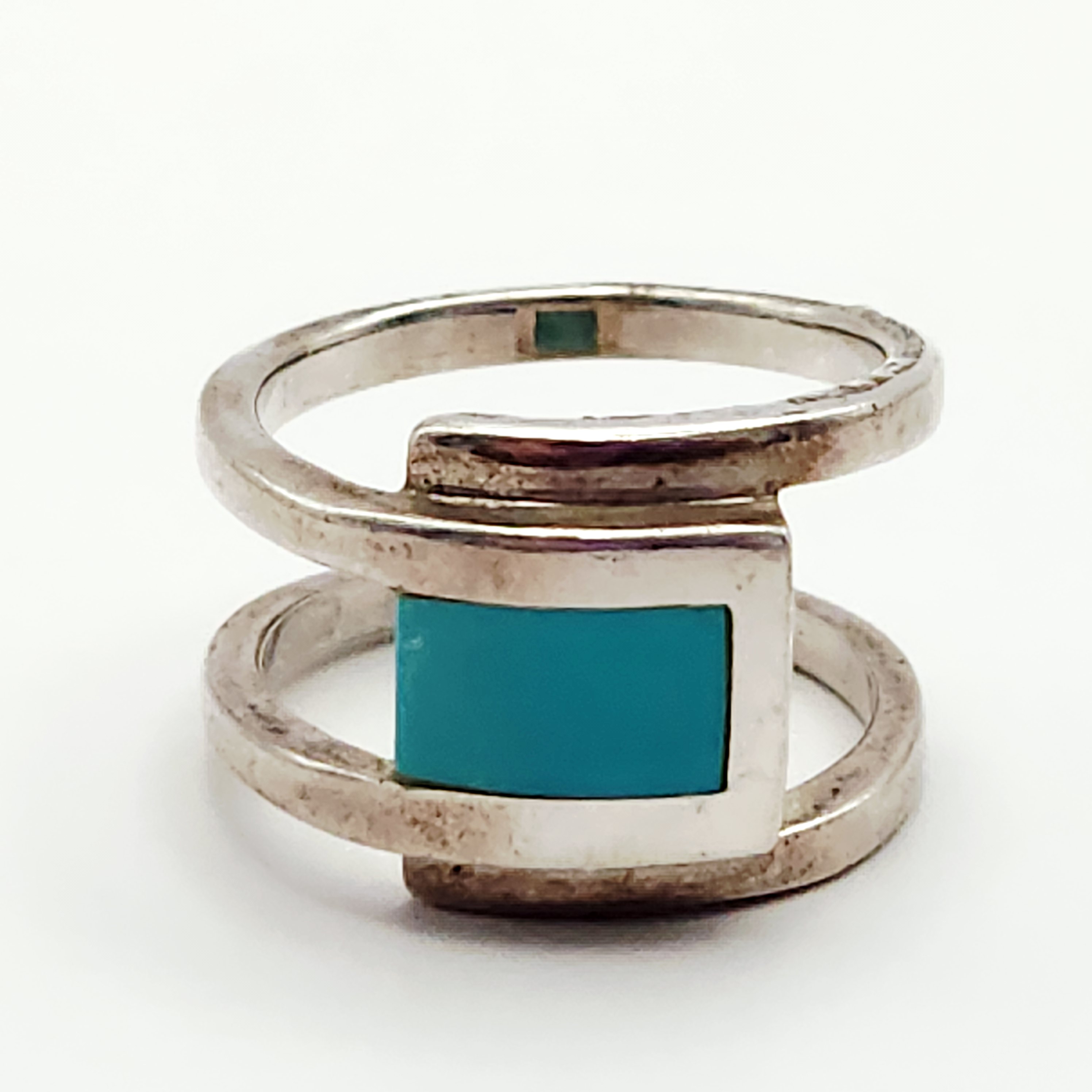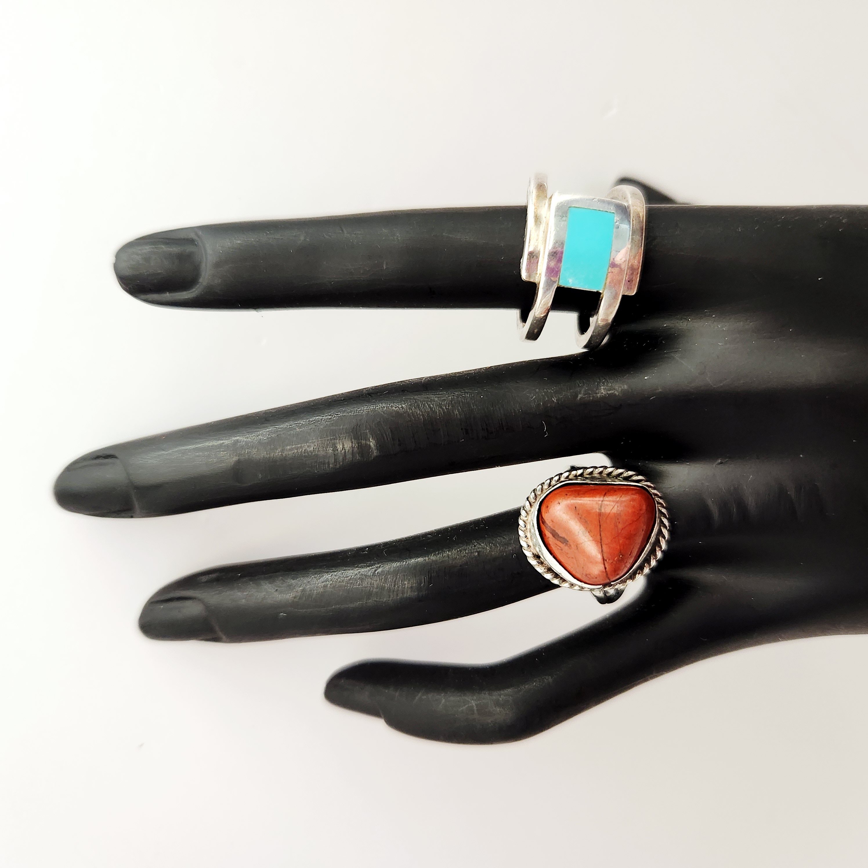 A group of two rings including one Southwestern-style and one modernist bypass-style. The Southwestern-style ring features a triangular polished red stone, resembling jasper, set within a rope-twist bezel on a split-shank band acid tested sterling. The reverse of the setting is incised with the letters E, L, E. The modernist bypass-style ring is set with a rectangular turquoise inlay and is stamped 925 alongside a circular maker’s mark containing the letter G. Size: 7.5 Weight: 13.4 grams.