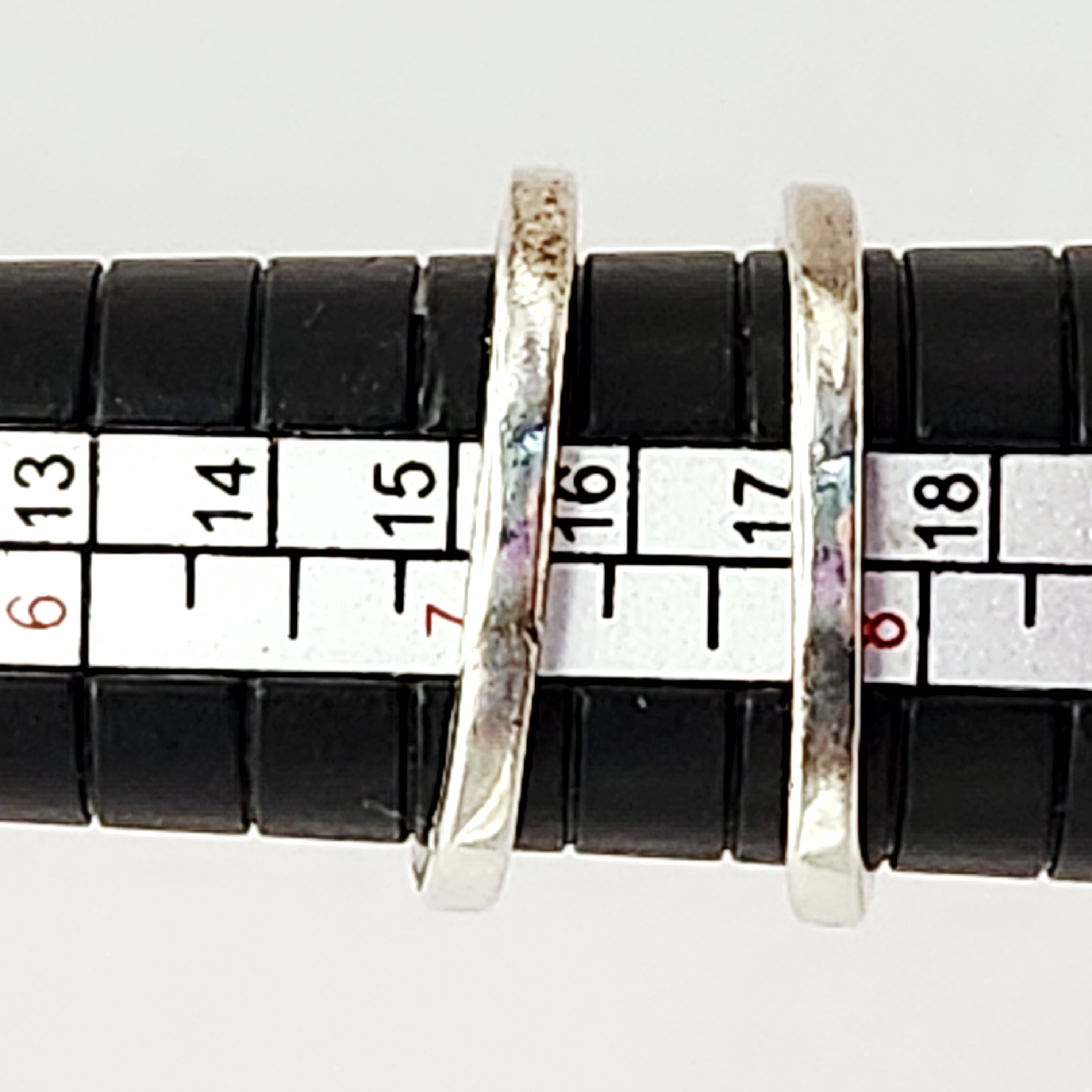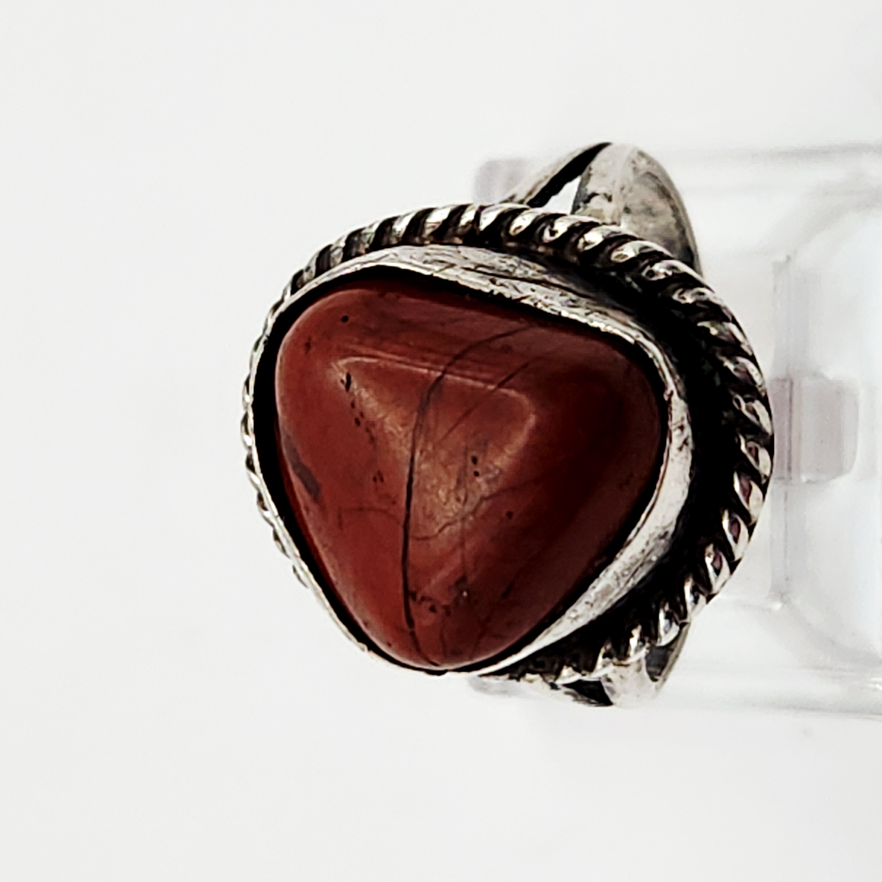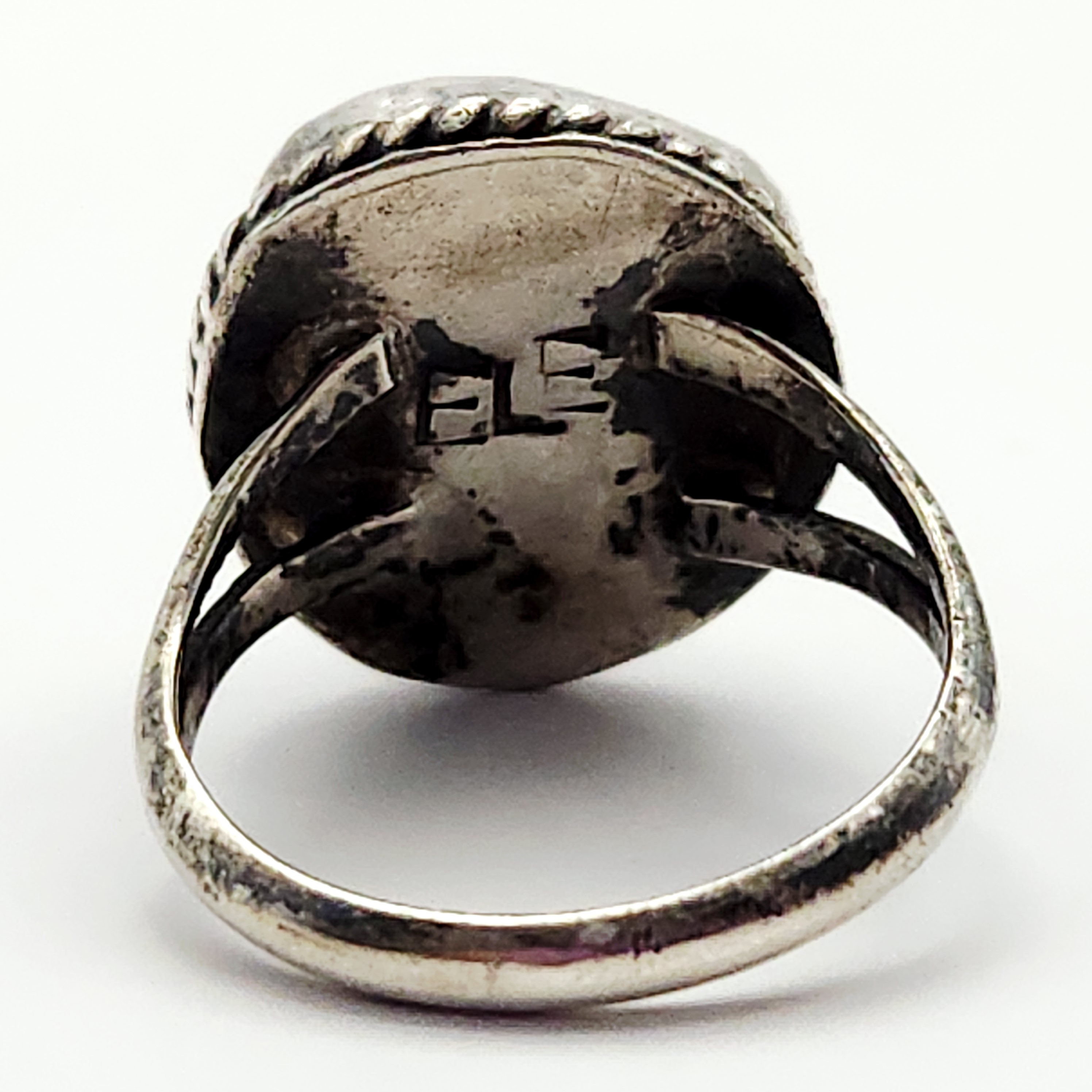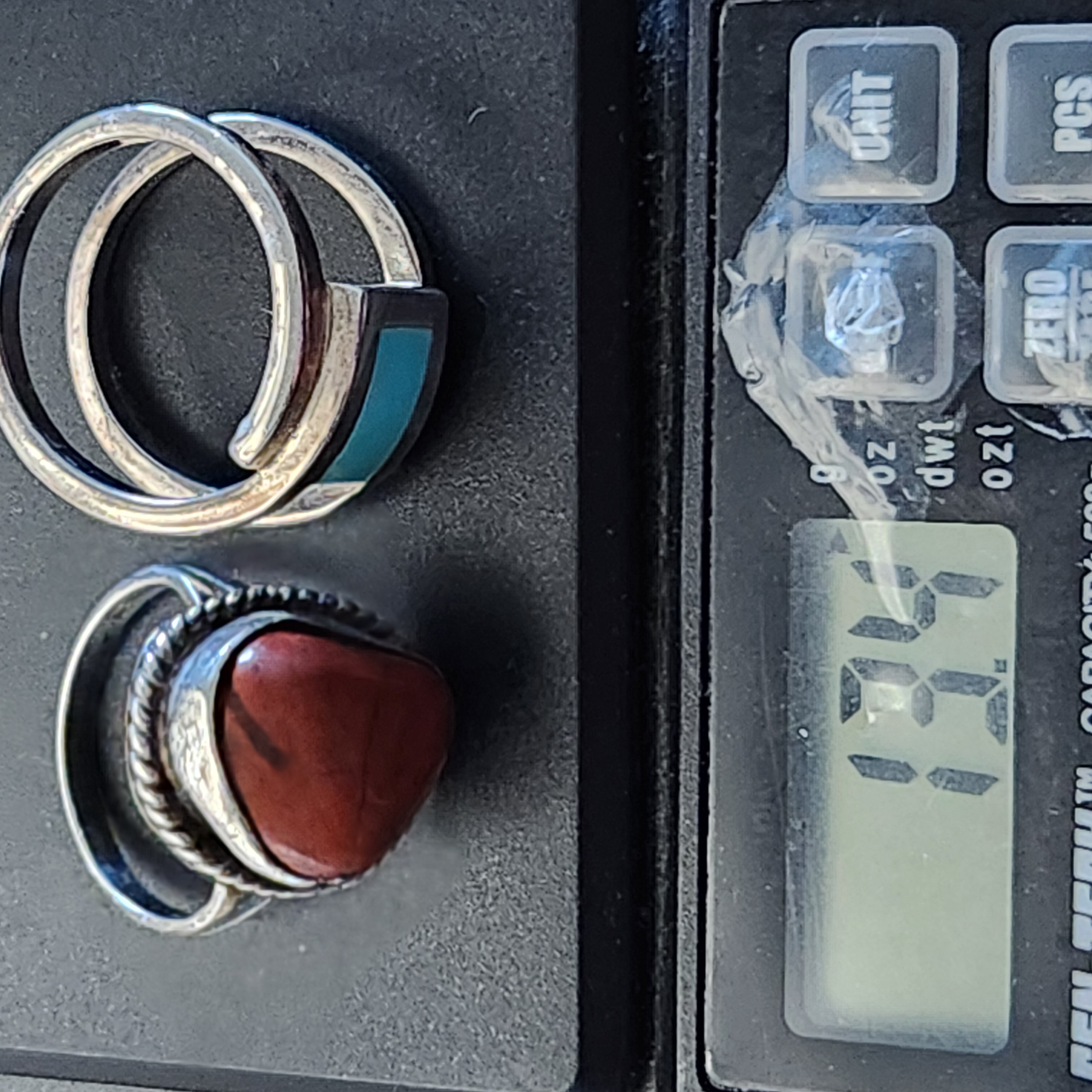 A group of two rings including one Southwestern-style and one modernist bypass-style. The Southwestern-style ring features a triangular polished red stone, resembling jasper, set within a rope-twist bezel on a split-shank band acid tested sterling. The reverse of the setting is incised with the letters E, L, E. The modernist bypass-style ring is set with a rectangular turquoise inlay and is stamped 925 alongside a circular maker’s mark containing the letter G. Size: 7.5 Weight: 13.4 grams.