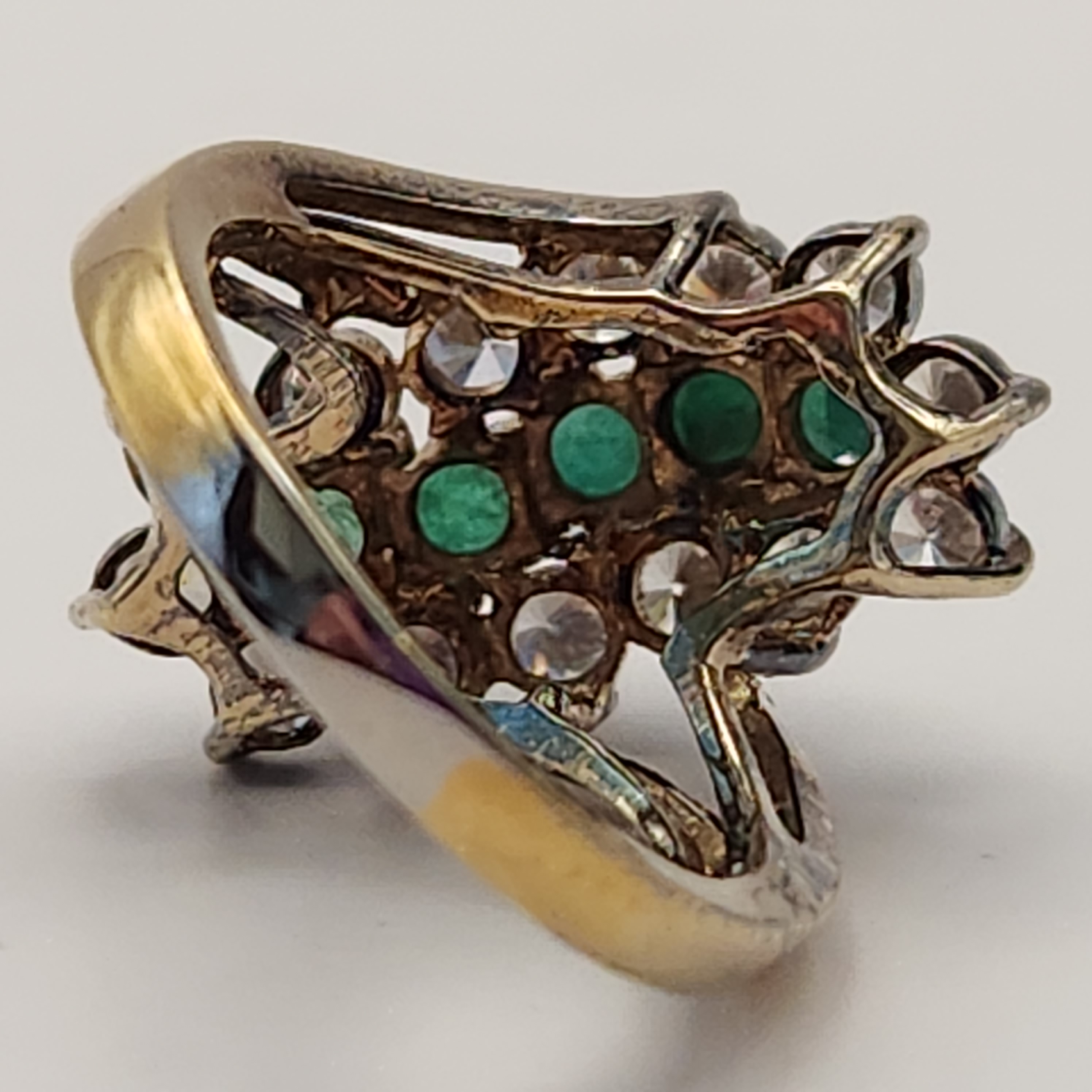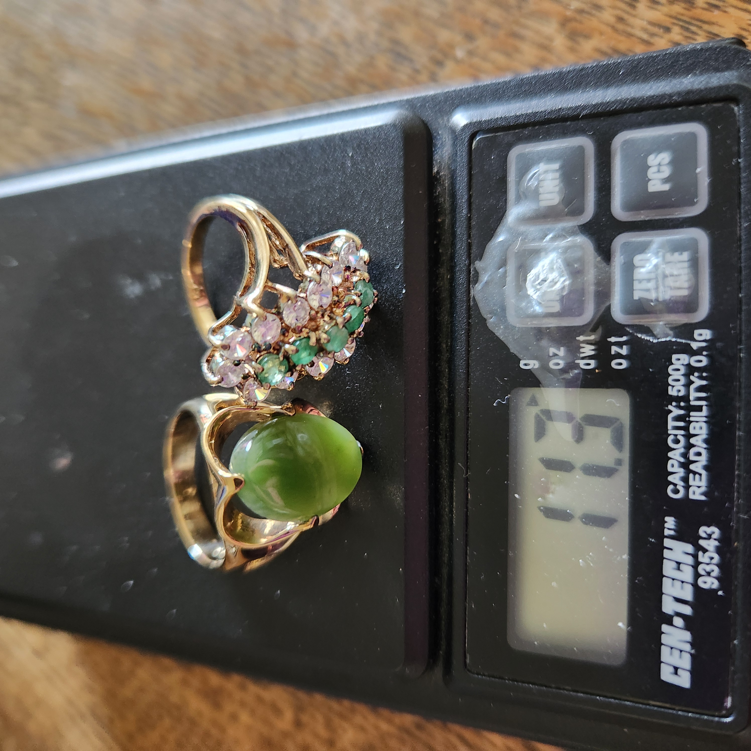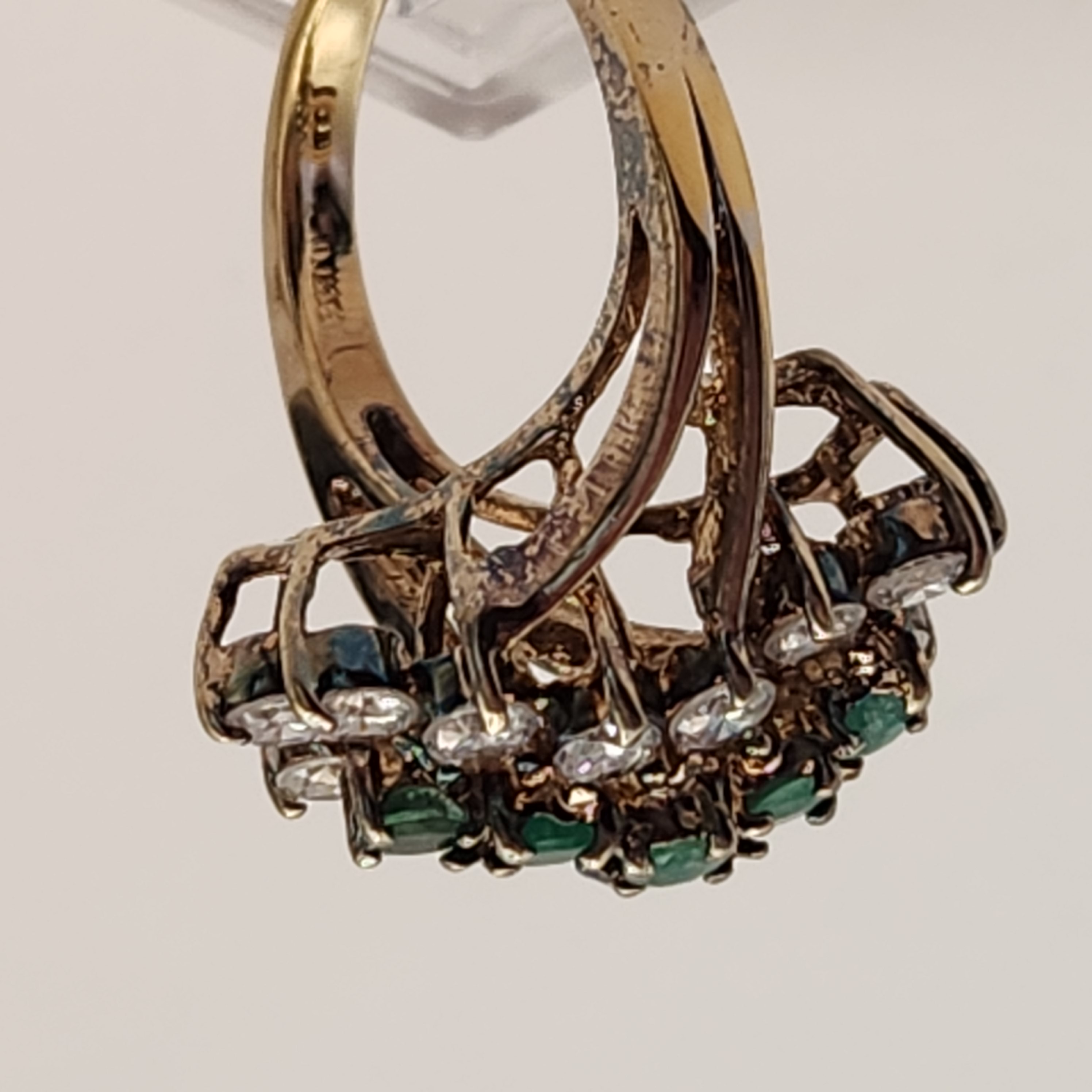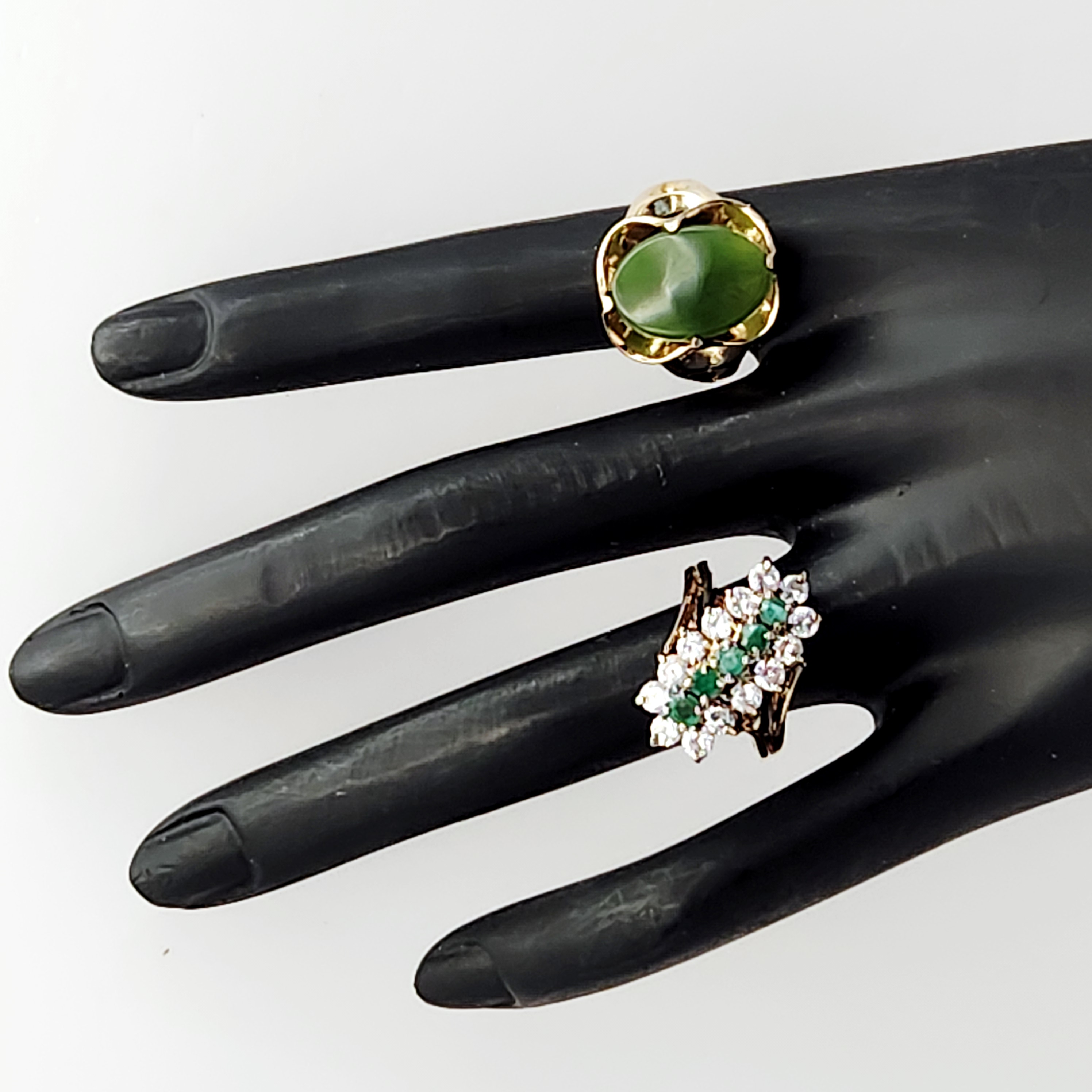 This lot consists of two vintage gold over sterling, vermeil, cocktail rings featuring various gemstones. The first ring is a solitaire style featuring one large oval cabochon-cut opaque green stone consistent with nephrite jade. The stone is bezel-set within a scalloped floral-style gallery. The interior of the shank is incised with a gold over sterling 14K hallmark, vermeil. The second ring is a tiered cluster ring in a marquise-shaped arrangement. The setting features a central row of five round-cut green stones, likely emeralds, flanked by two rows of fourteen round-cut clear accent stones. All stones are prong-set on a split decorative shank. The interior of the shank is stamped sterling. Nephrite stone: approximately 16mm x 12mm Ring sizes: 7.25 and 5.5 Total combined weight: 11.4 grams. The nephrite jade ring is in good vintage condition with light surface wear and minor scratches to the gold consistent with age. The emerald and clear stone cluster ring is in fair to good condition with moderate surface wear.
