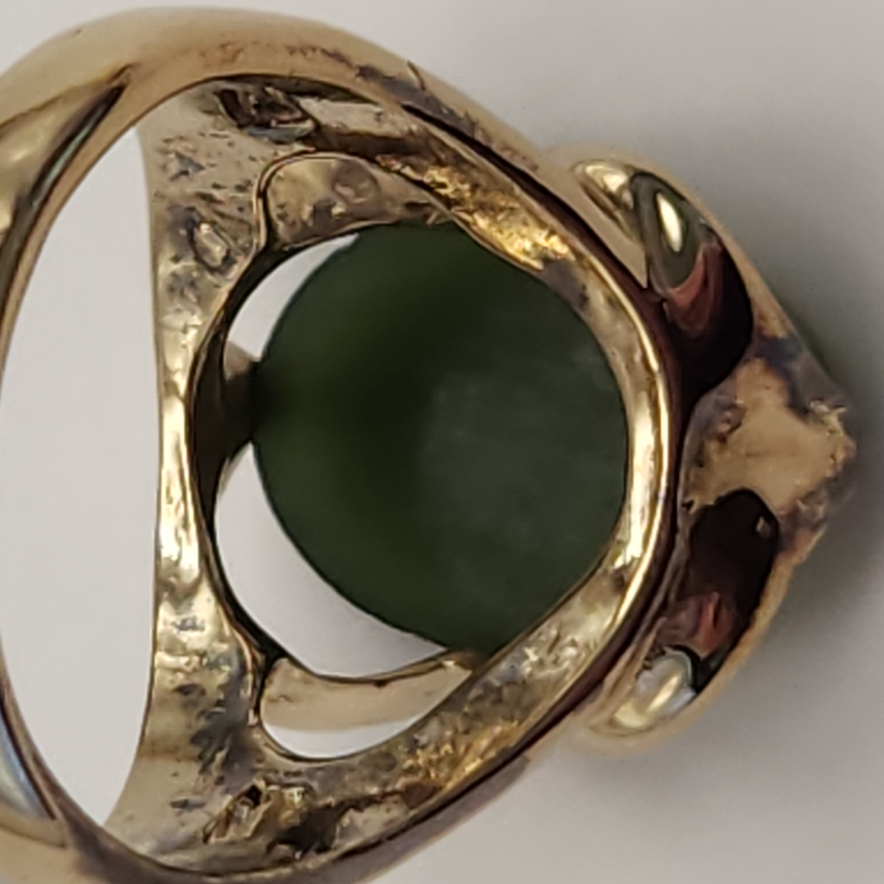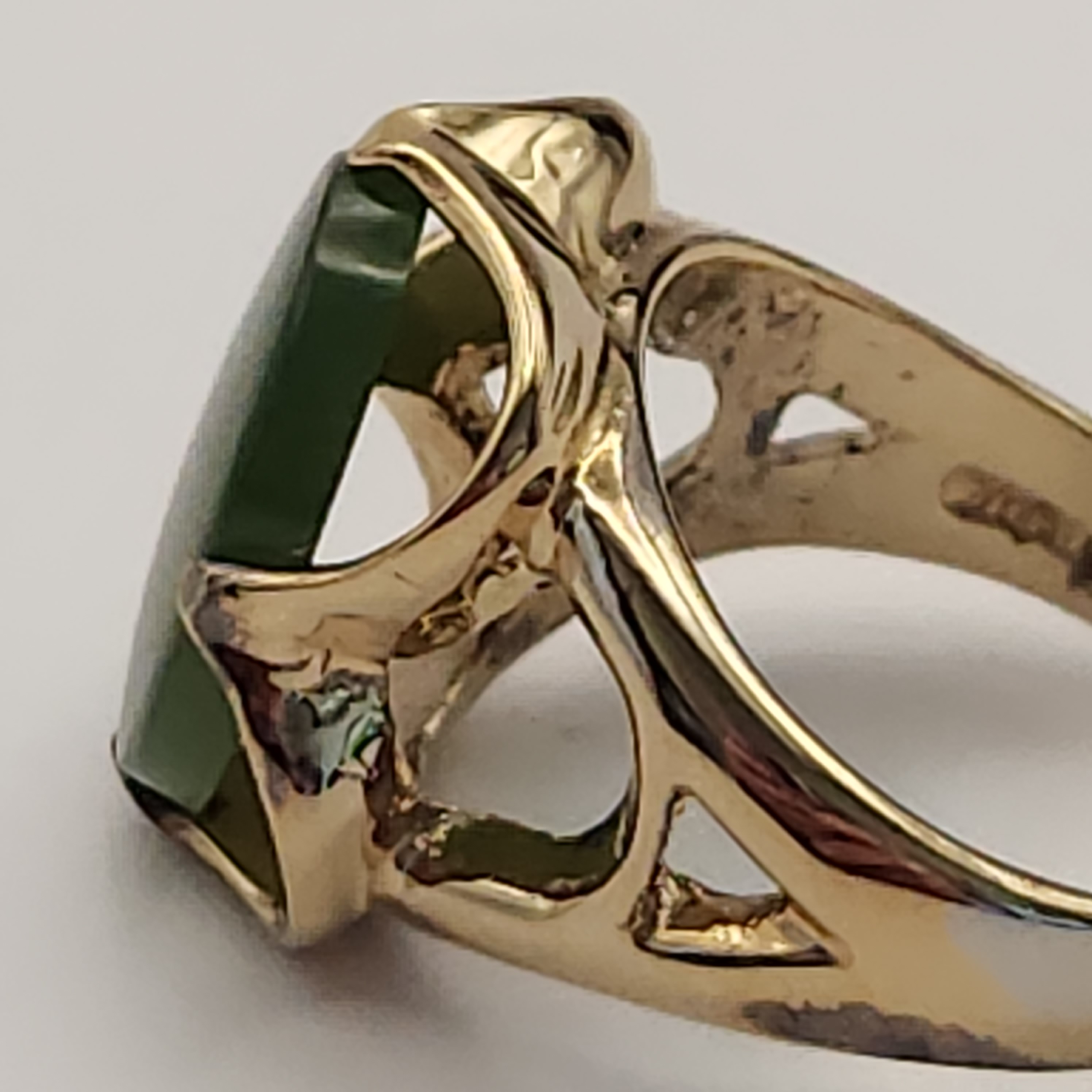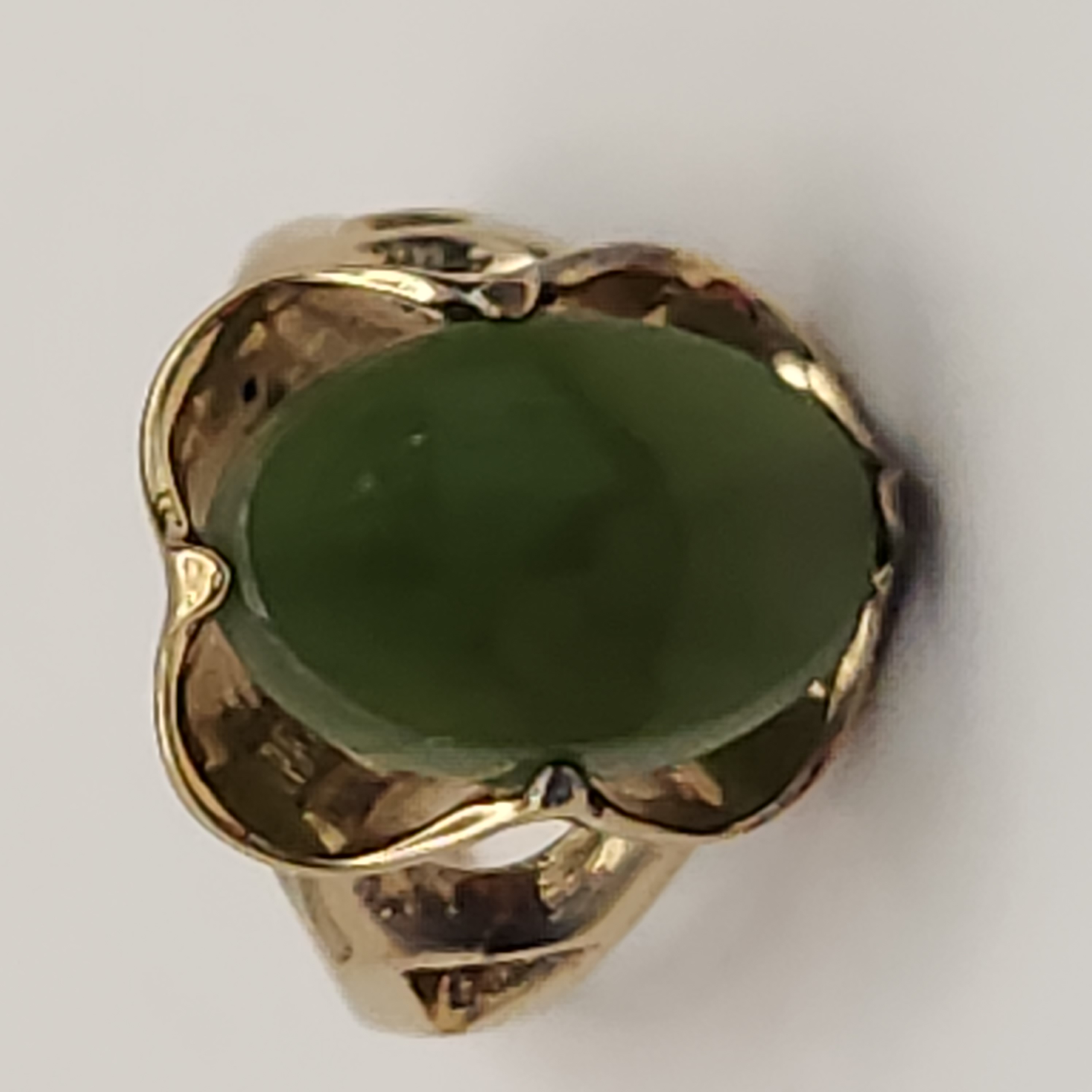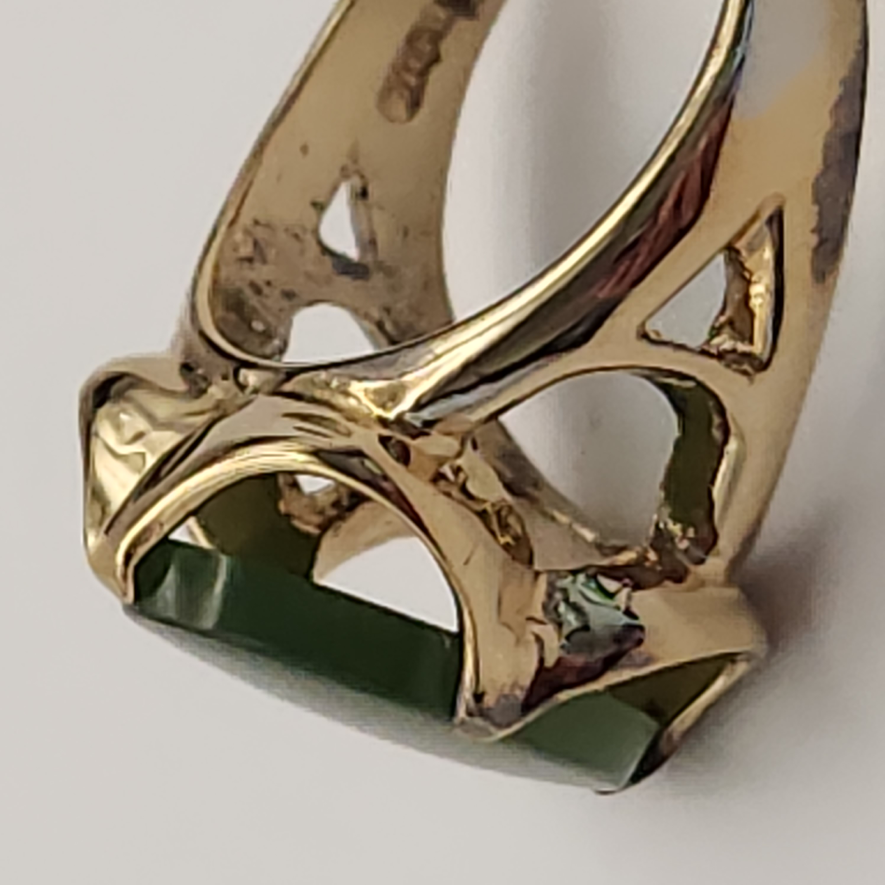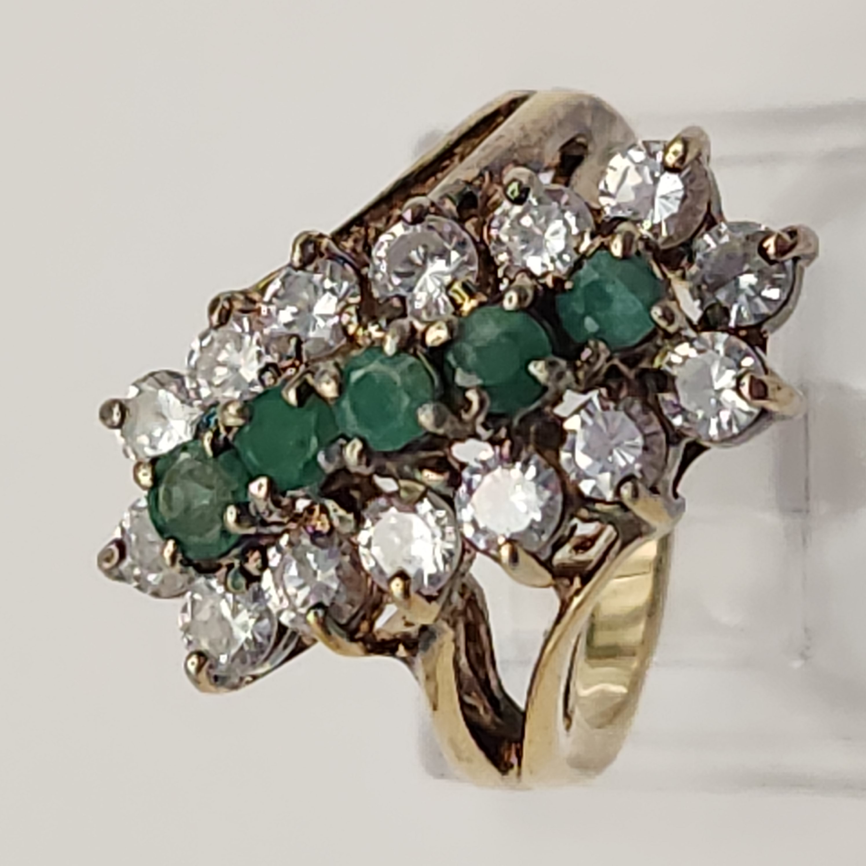 This lot consists of two vintage gold over sterling, vermeil, cocktail rings featuring various gemstones. The first ring is a solitaire style featuring one large oval cabochon-cut opaque green stone consistent with nephrite jade. The stone is bezel-set within a scalloped floral-style gallery. The interior of the shank is incised with a gold over sterling 14K hallmark, vermeil. The second ring is a tiered cluster ring in a marquise-shaped arrangement. The setting features a central row of five round-cut green stones, likely emeralds, flanked by two rows of fourteen round-cut clear accent stones. All stones are prong-set on a split decorative shank. The interior of the shank is stamped sterling. Nephrite stone: approximately 16mm x 12mm Ring sizes: 7.25 and 5.5 Total combined weight: 11.4 grams. The nephrite jade ring is in good vintage condition with light surface wear and minor scratches to the gold consistent with age. The emerald and clear stone cluster ring is in fair to good condition with moderate surface wear.