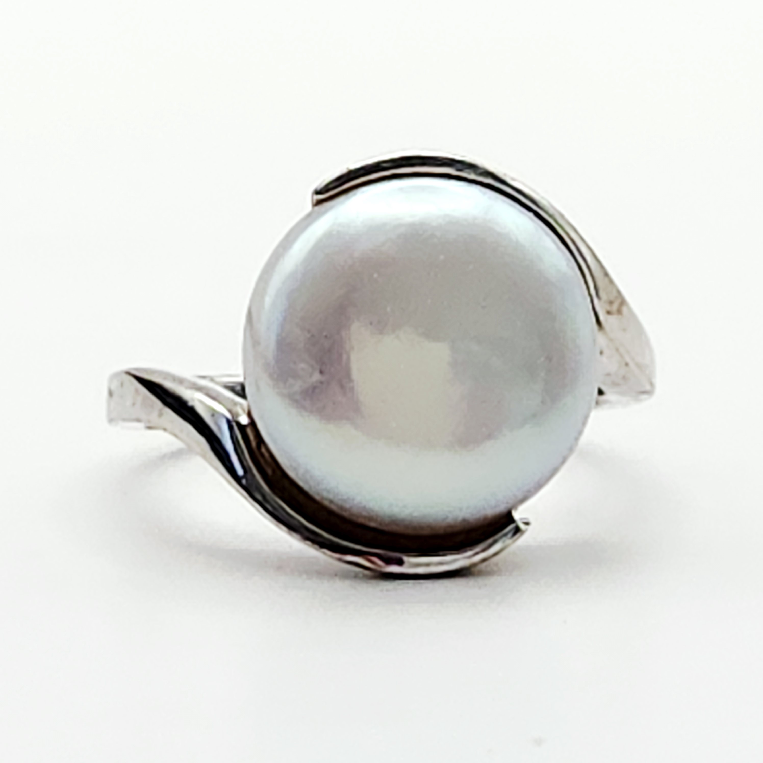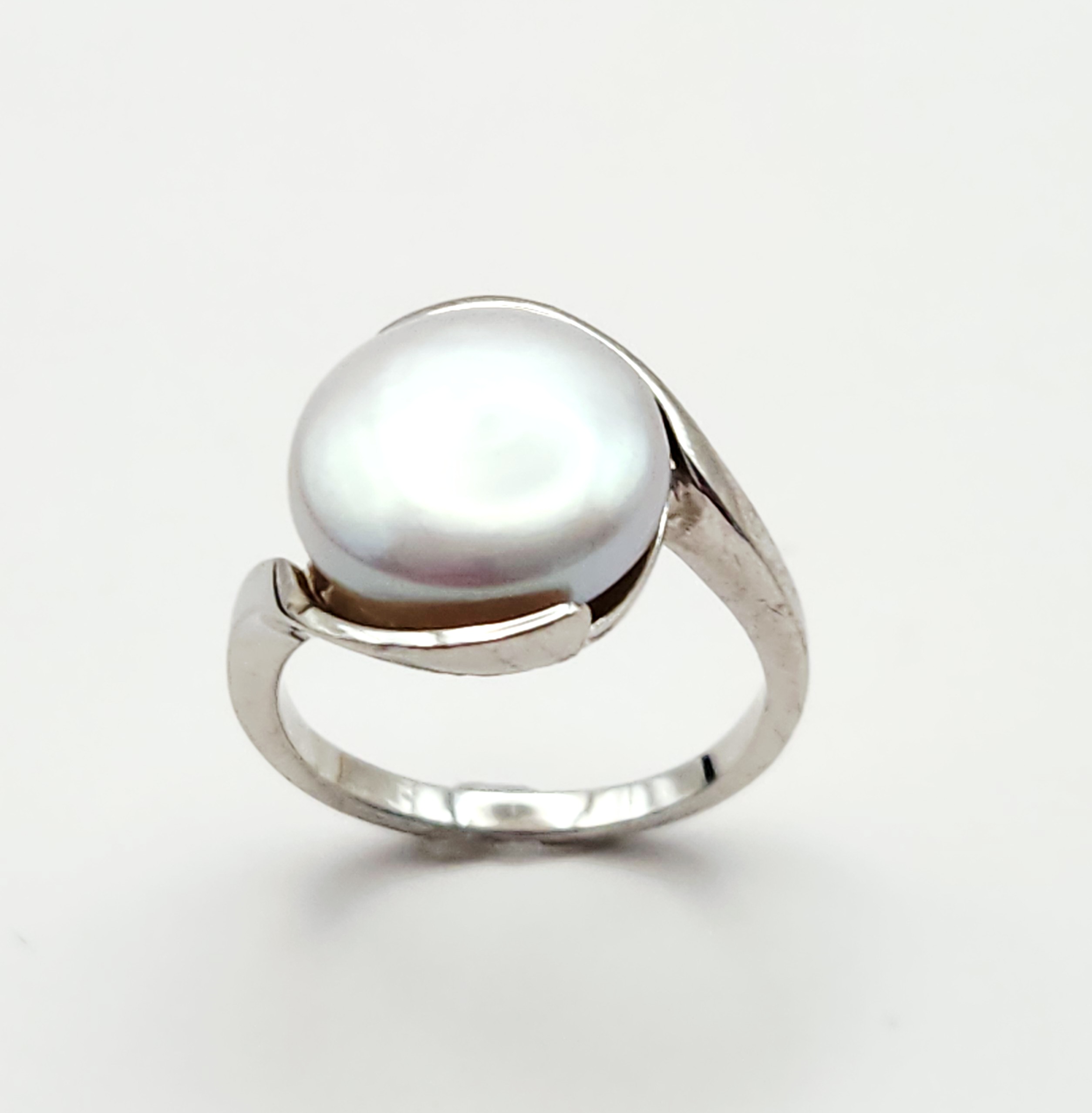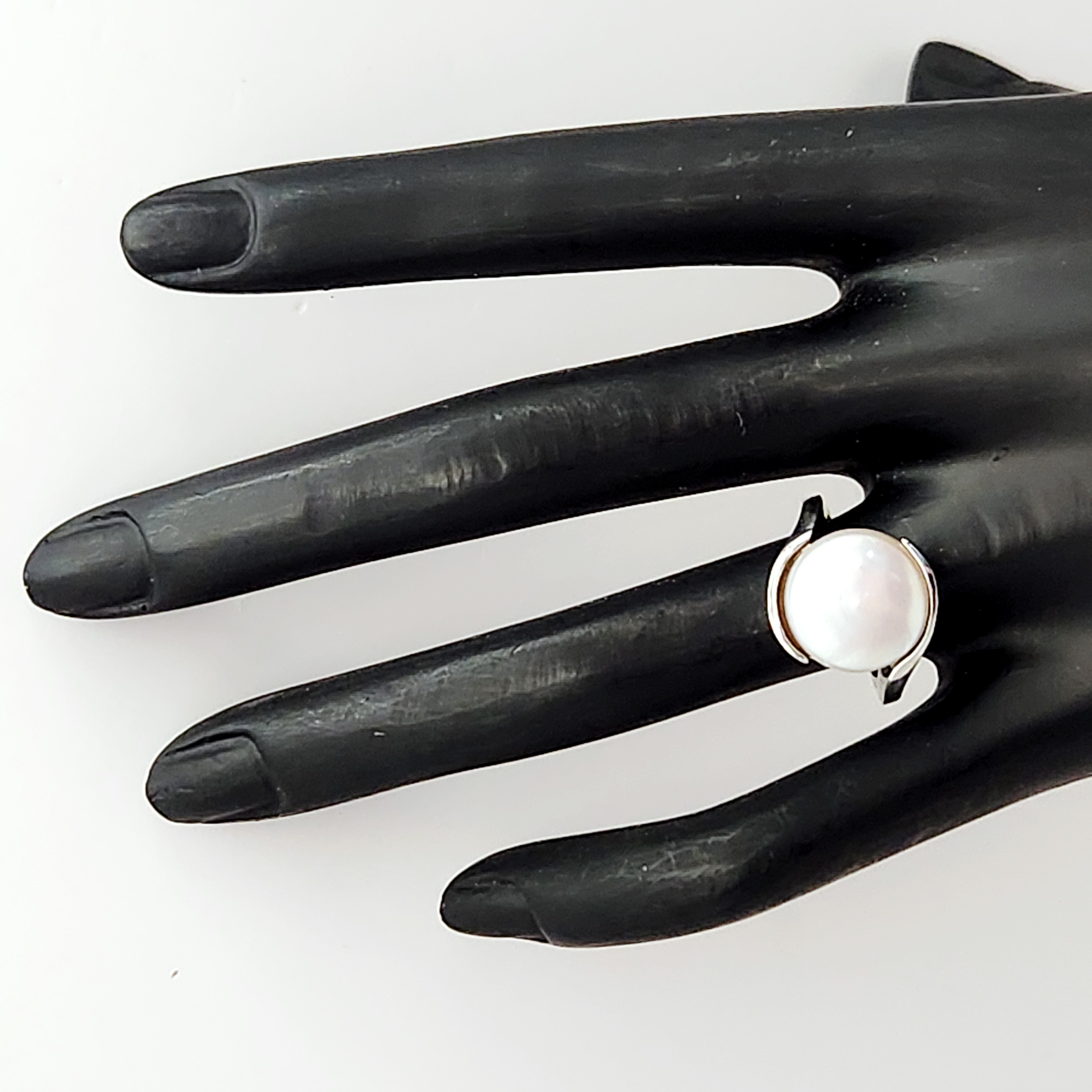 A sterling silver ring featuring a large, round button-shaped cultured pearl. The pearl exhibits a white body color with silvery orient and is secured in an asymmetrical bypass-style setting of polished white metal. The interior of the shank bears the stamped purity mark 925 and the maker mark OP. Ring size: 6.75 Total weight: 4.9 grams Pearl diameter: Approximately 12mm. Overall good condition with minor surface scratches and light wear to the metal consistent with age and use.