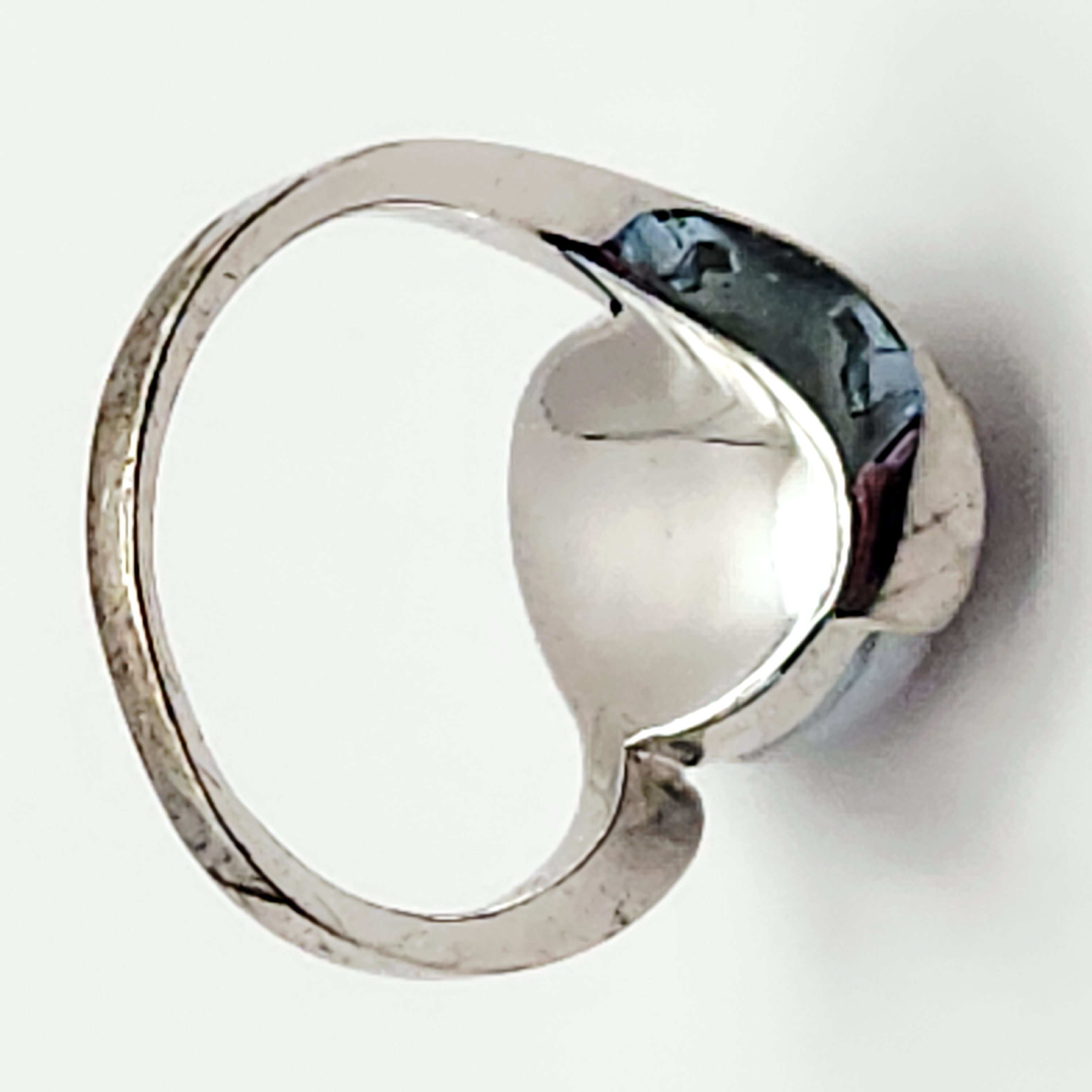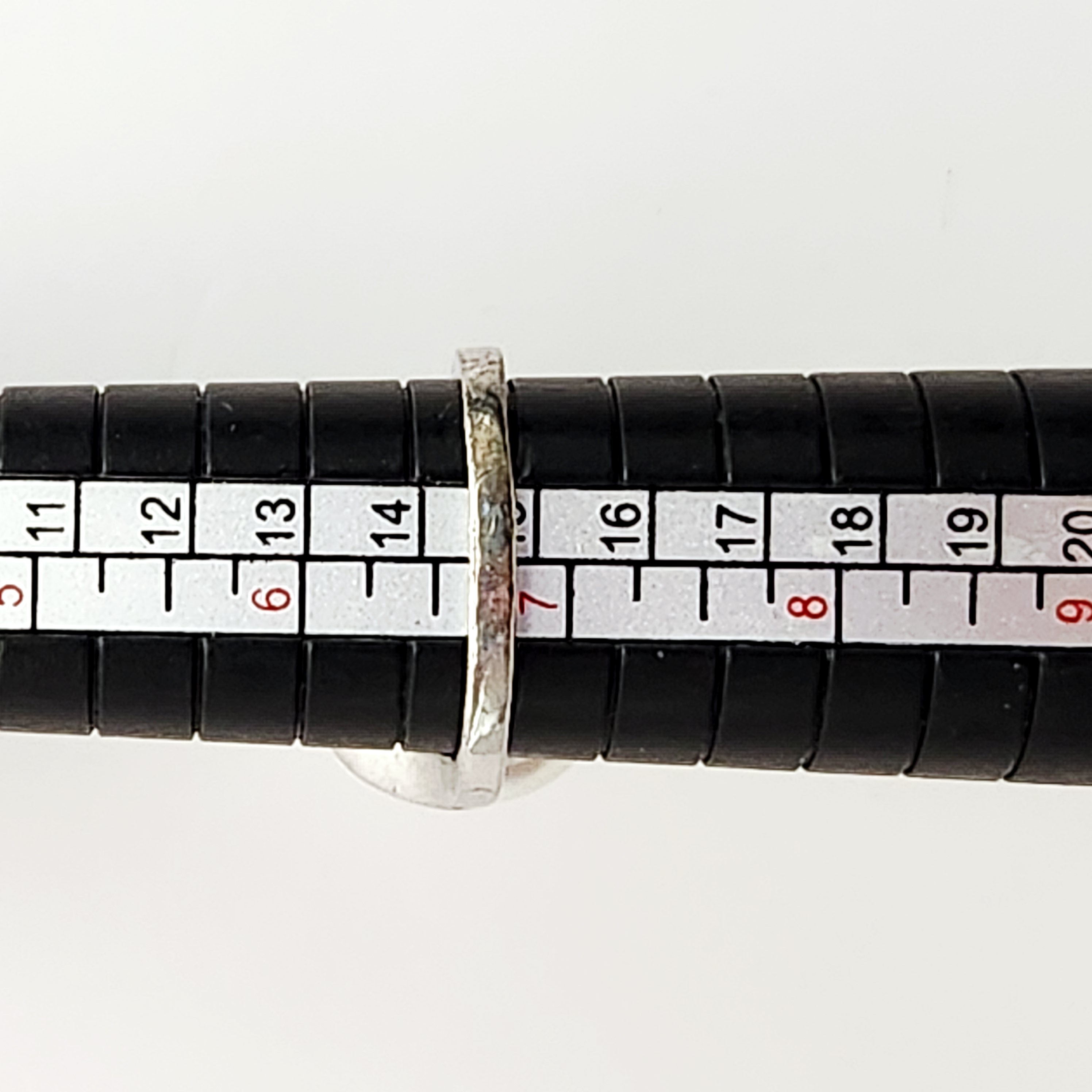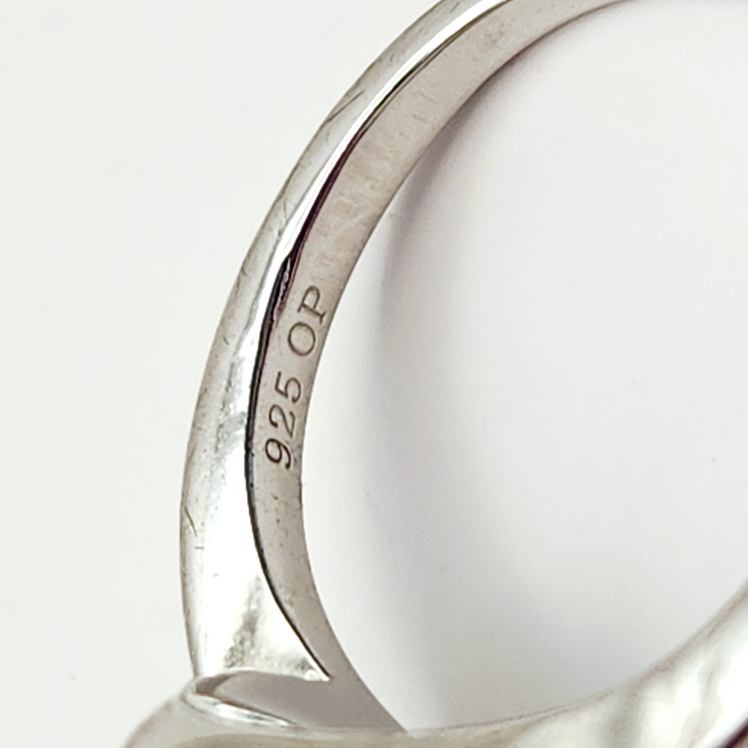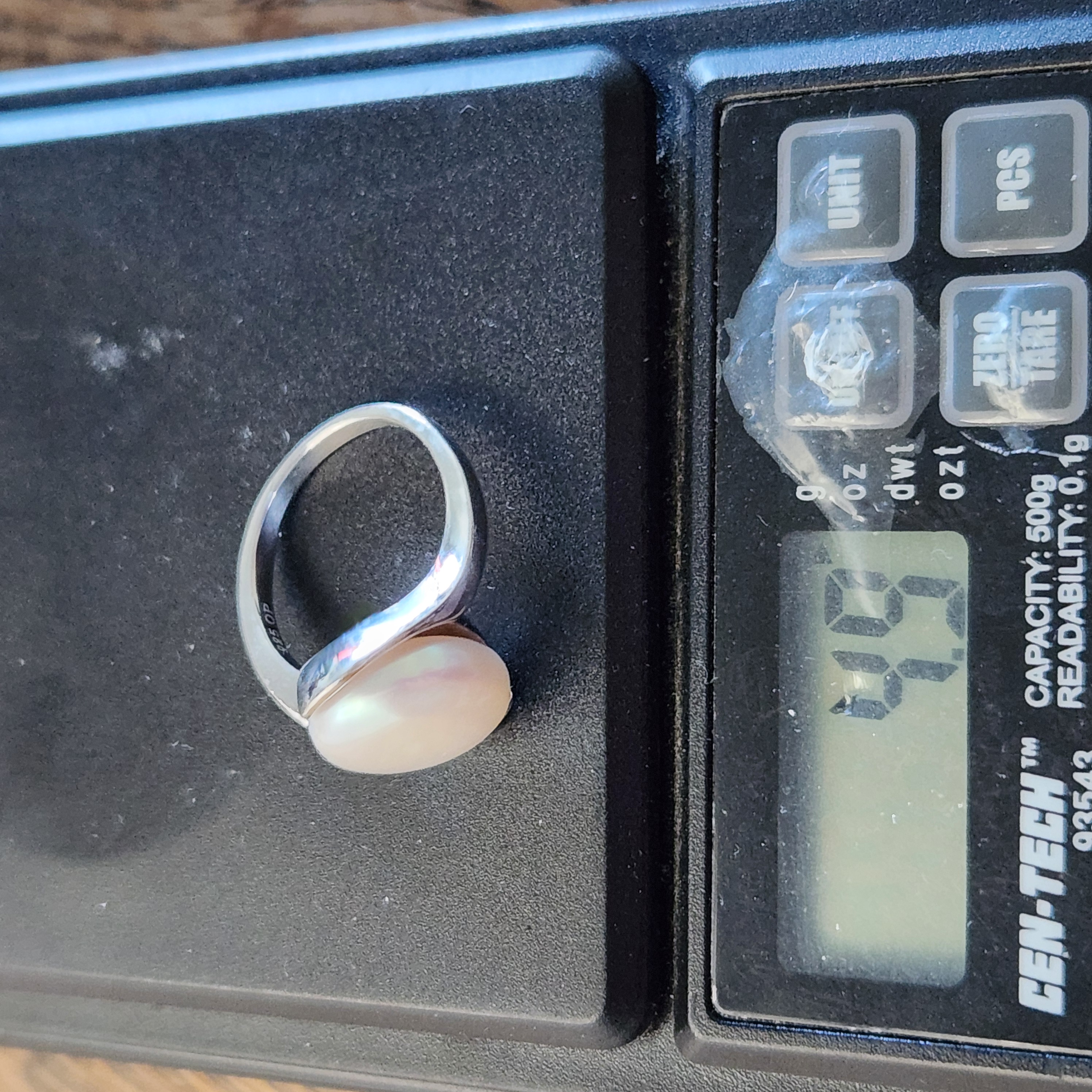 A sterling silver ring featuring a large, round button-shaped cultured pearl. The pearl exhibits a white body color with silvery orient and is secured in an asymmetrical bypass-style setting of polished white metal. The interior of the shank bears the stamped purity mark 925 and the maker mark OP. Ring size: 6.75 Total weight: 4.9 grams Pearl diameter: Approximately 12mm. Overall good condition with minor surface scratches and light wear to the metal consistent with age and use.