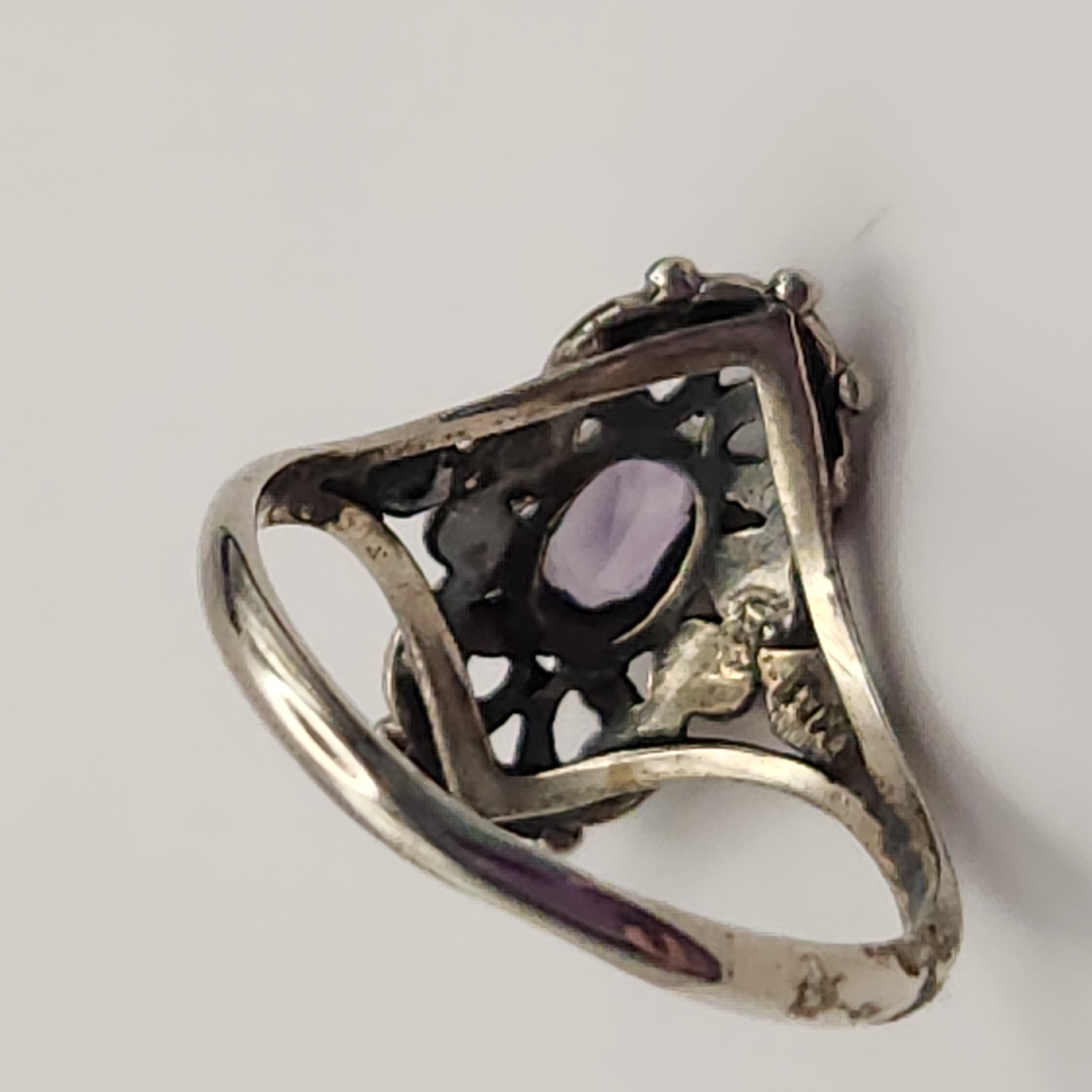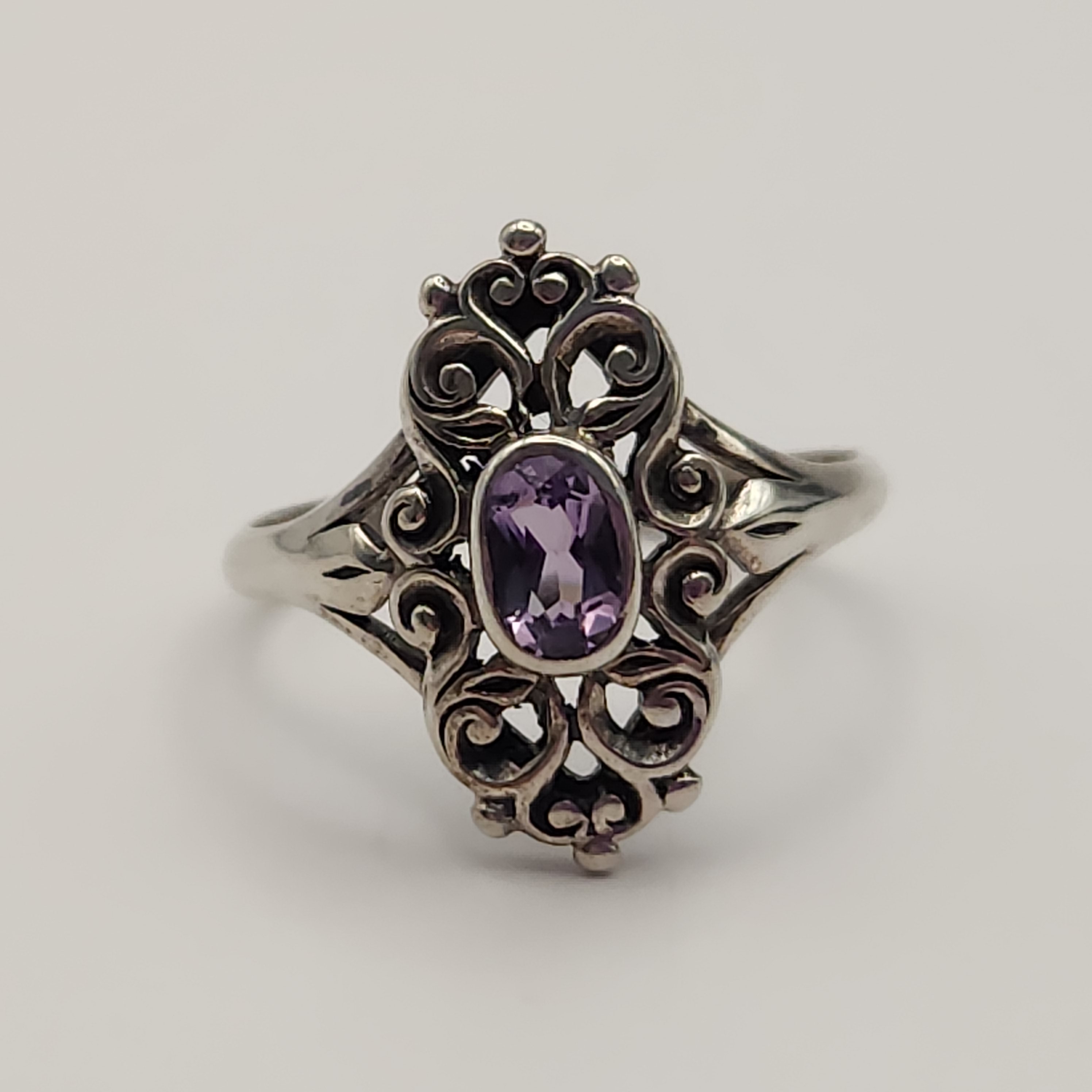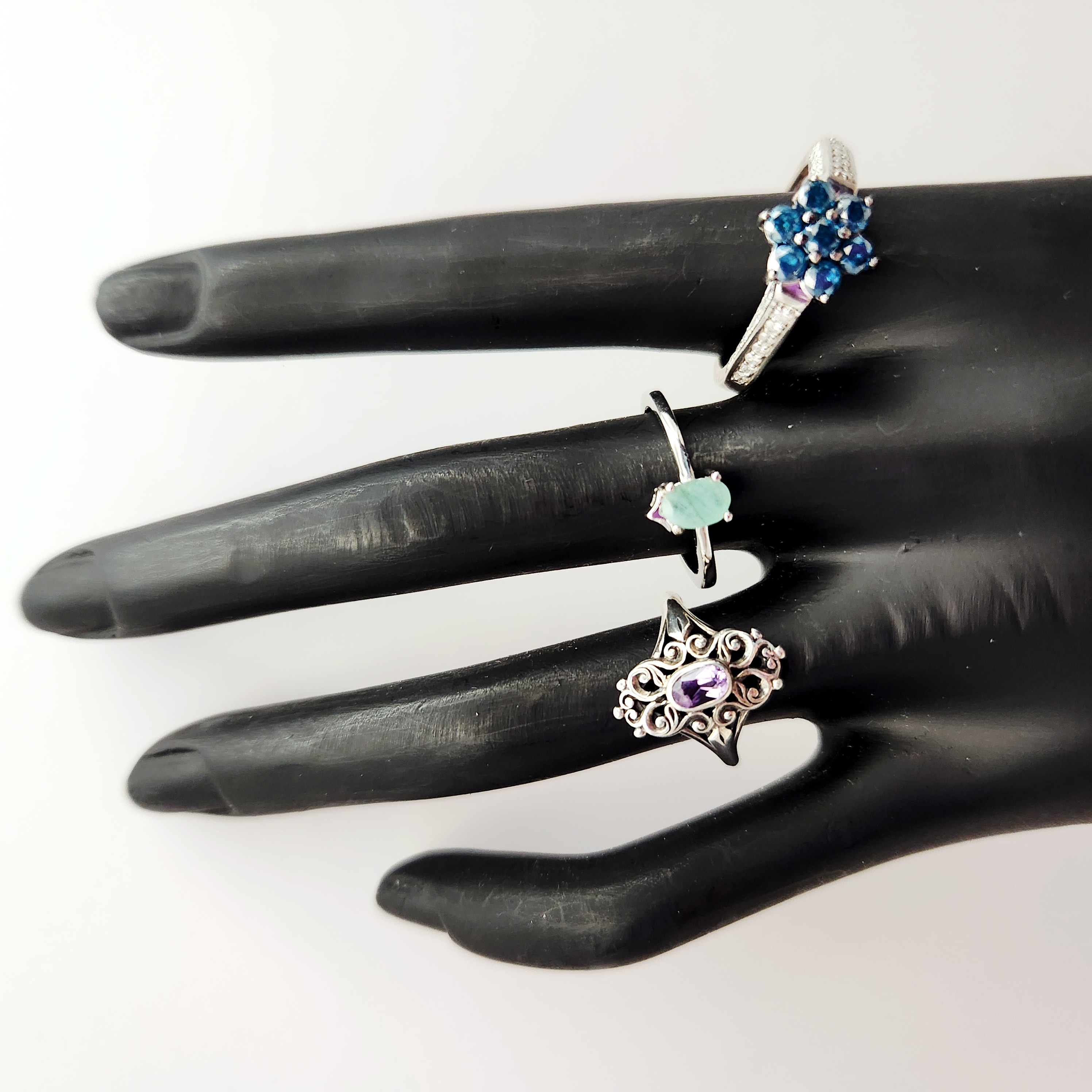 This collection of rings features various gemstone-style settings. The group includes an ornate scrolling openwork mounting centering an oval-cut purple stone with illegible marks on the underside, a petite oval-cut light green stone set on a plain sterling silver band with the interior stamped S925, and a floral cluster of faceted dark blue stones with shoulders set with small clear stones. Unmarked rings acid tested sterling. Sizes: 6, 6.5, and 10.5 Total weight: 8.2 grams. Overall good condition. Minor tarnish and surface wear present on the bands.