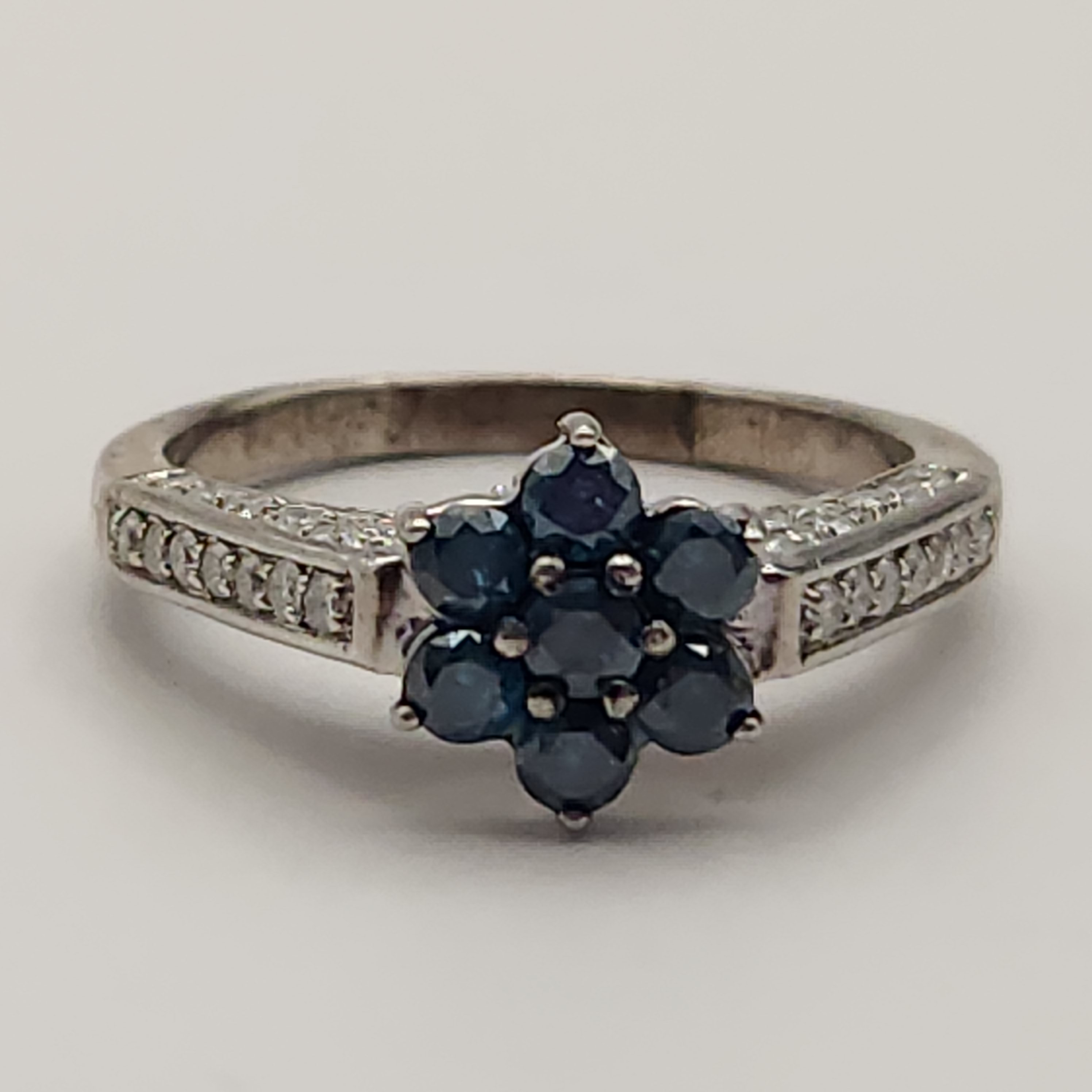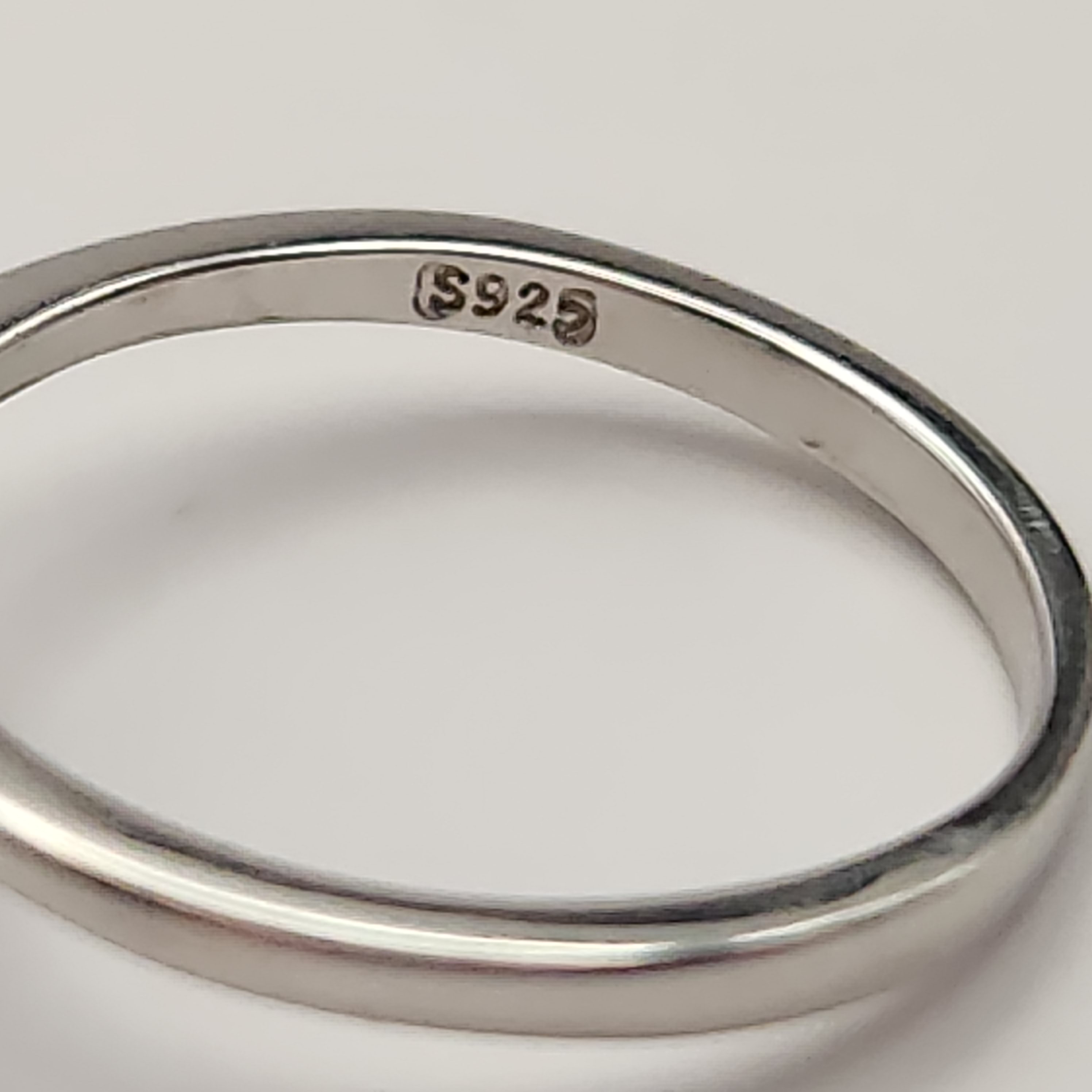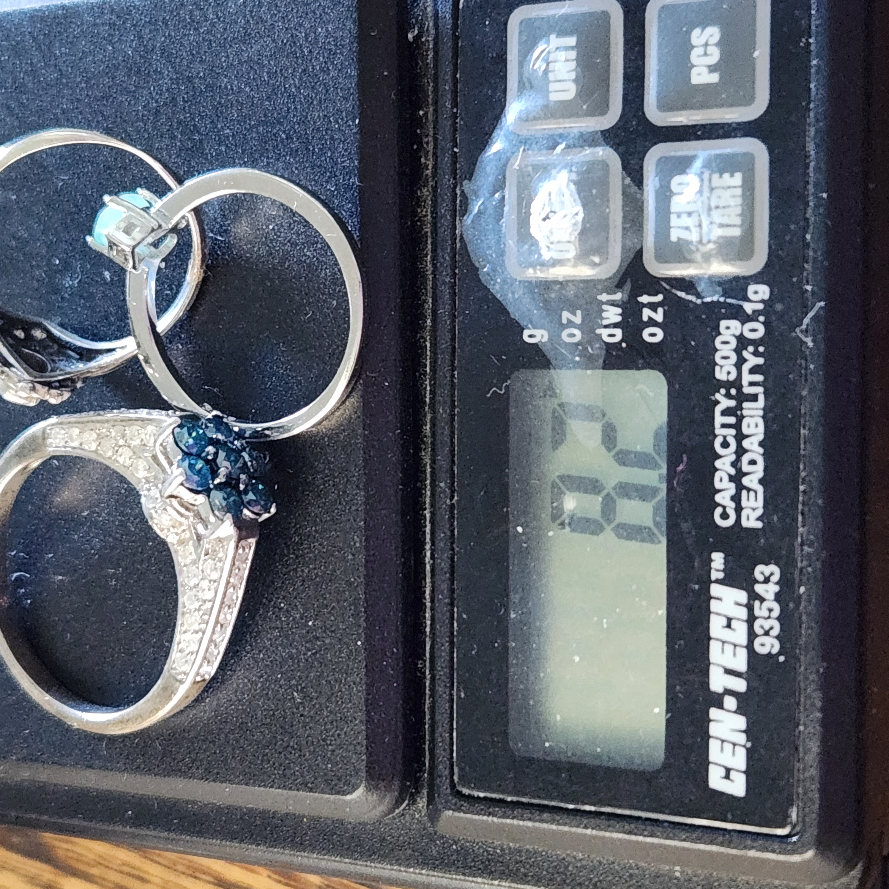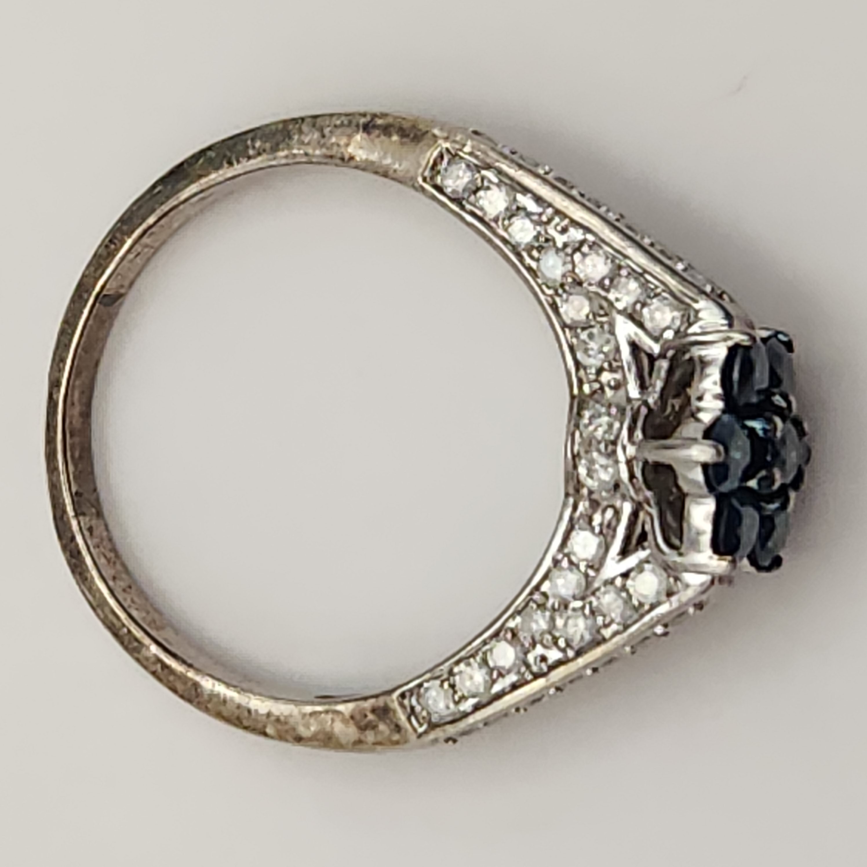 This collection of rings features various gemstone-style settings. The group includes an ornate scrolling openwork mounting centering an oval-cut purple stone with illegible marks on the underside, a petite oval-cut light green stone set on a plain sterling silver band with the interior stamped S925, and a floral cluster of faceted dark blue stones with shoulders set with small clear stones. Unmarked rings acid tested sterling. Sizes: 6, 6.5, and 10.5 Total weight: 8.2 grams. Overall good condition. Minor tarnish and surface wear present on the bands.
