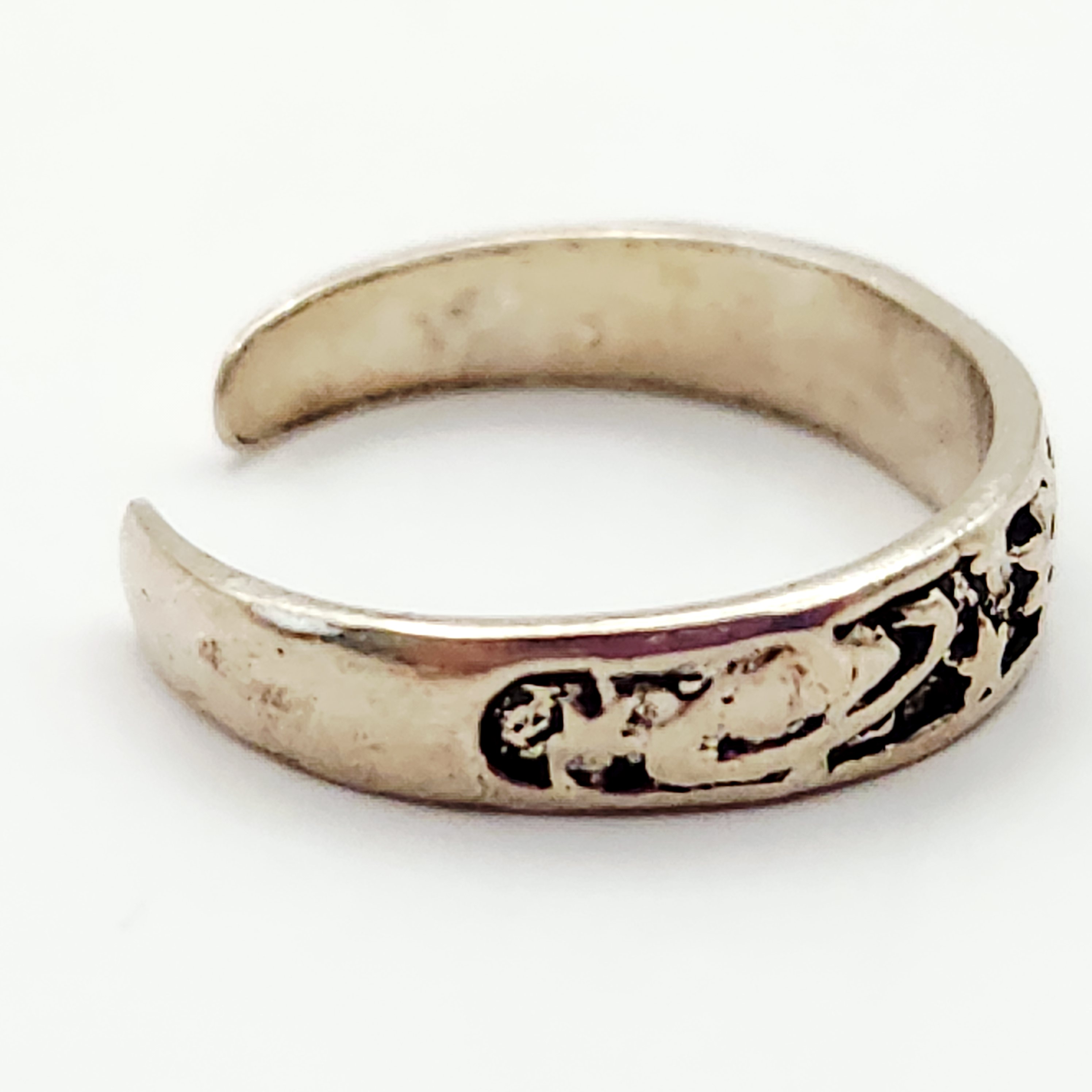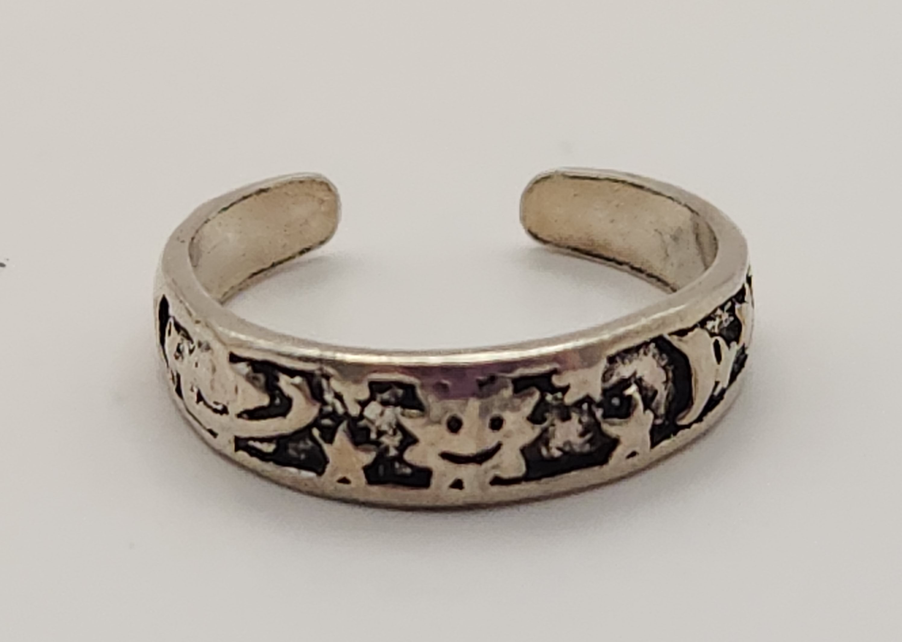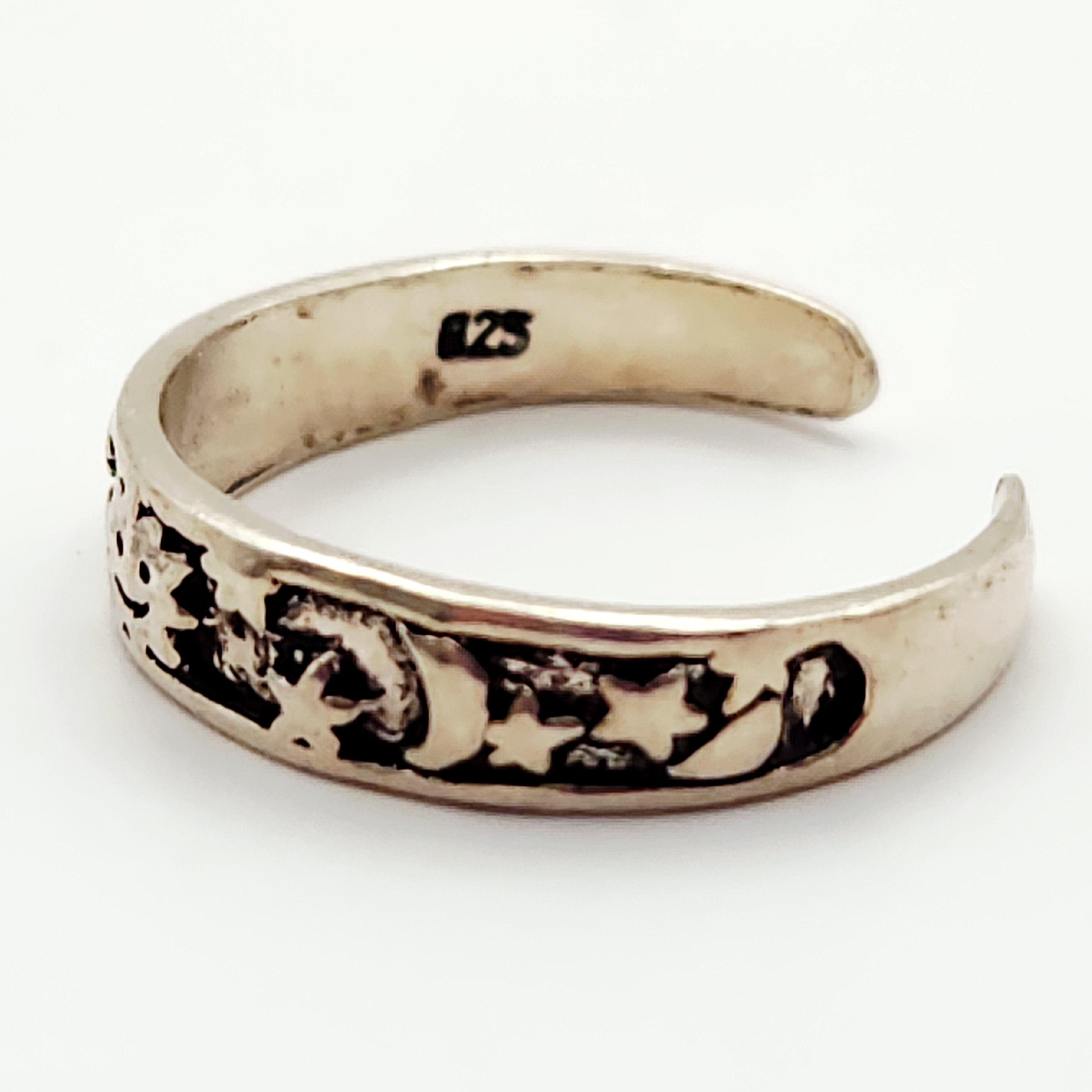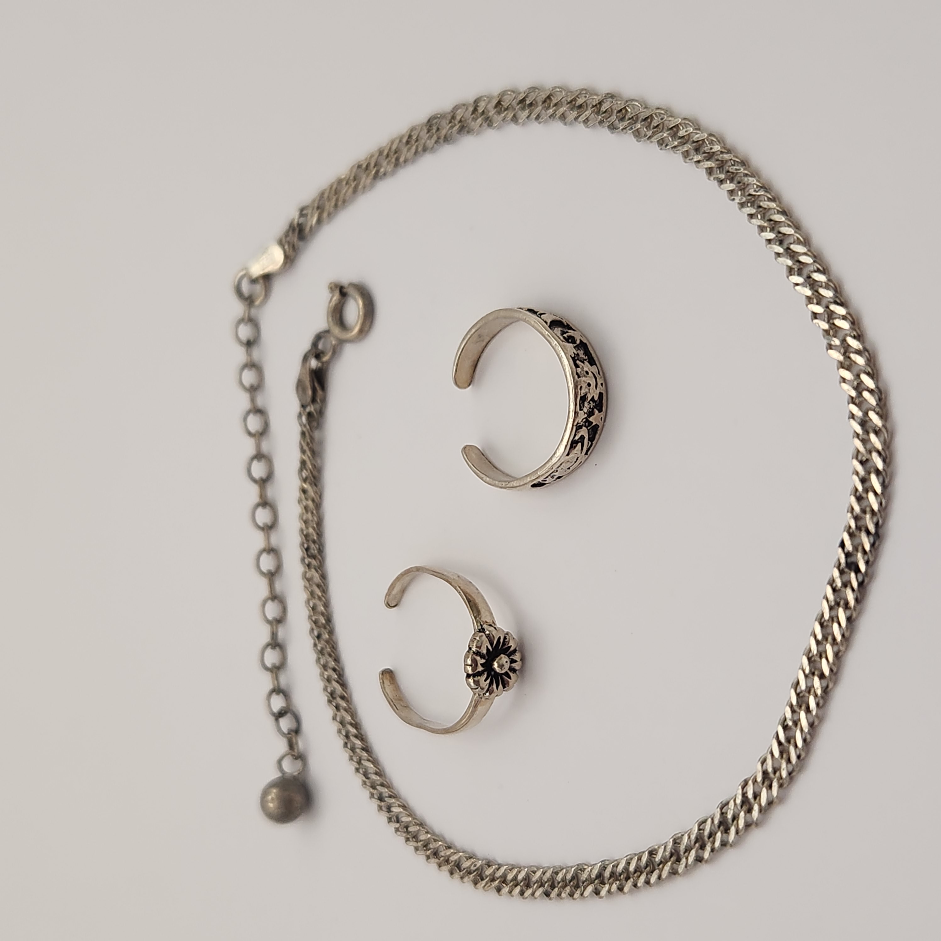 A trio of sterling silver jewelry items including a curb link ankle bracelet and toe rings. The chain features a fine curb link design, a spring ring clasp, an extender chain, and a small spherical terminal charm. The chain is marked 925 ITALY on the end connector and AGI on the metal tag. The celestial-themed ring is an open-back band featuring raised sun, moon, and star motifs against an oxidized background, marked 925 on the inner band. The floral-themed ring is an open-back band featuring a central raised floral motif, marked 925 on the inner band. Total Weight: 8.2 grams Chain Length: 11 inches Ring Sizes: 4 & 4.75 Items are in used condition. Visible surface wear, scratches, and moderate tarnish and oxidation are present throughout the grouping, consistent with age and previous use.