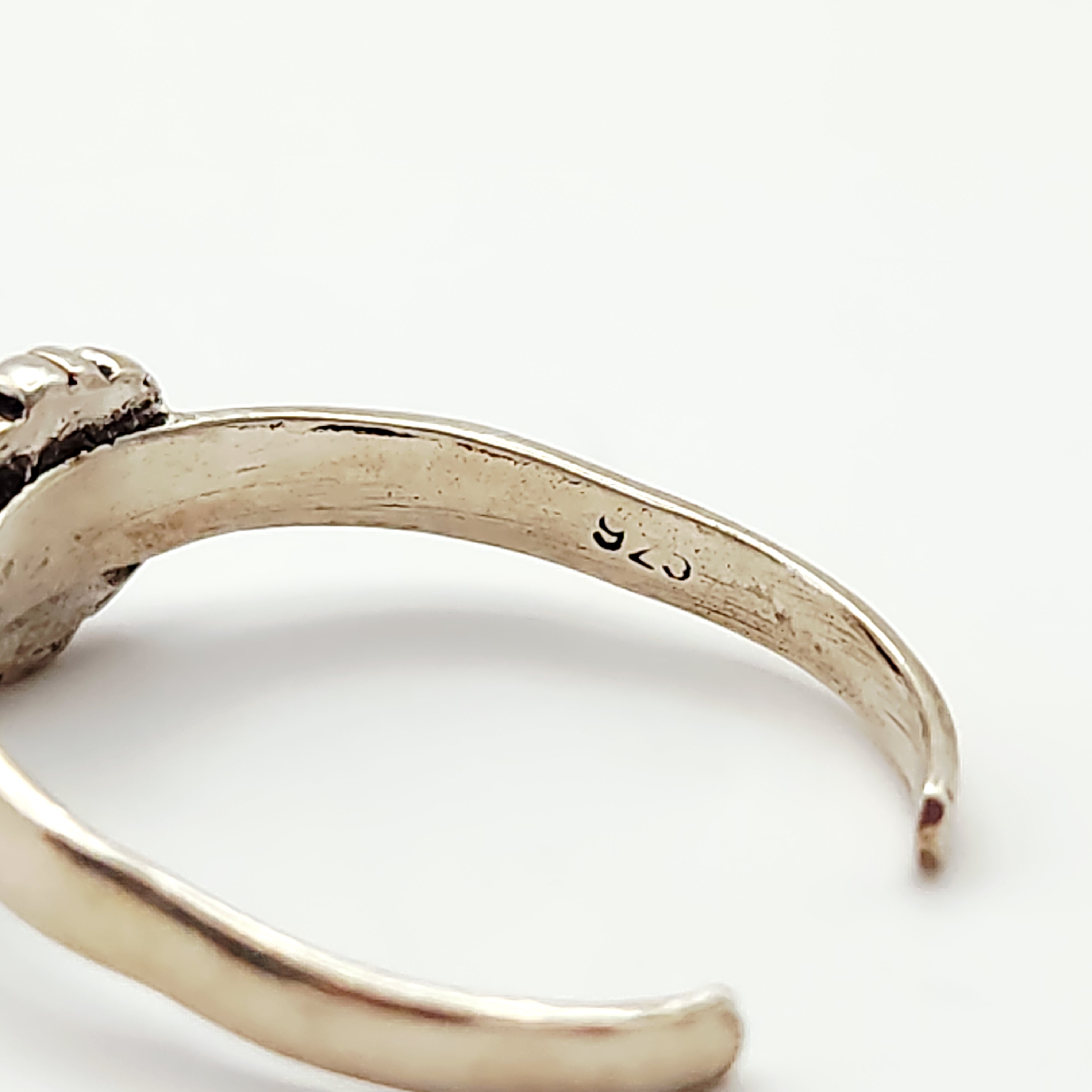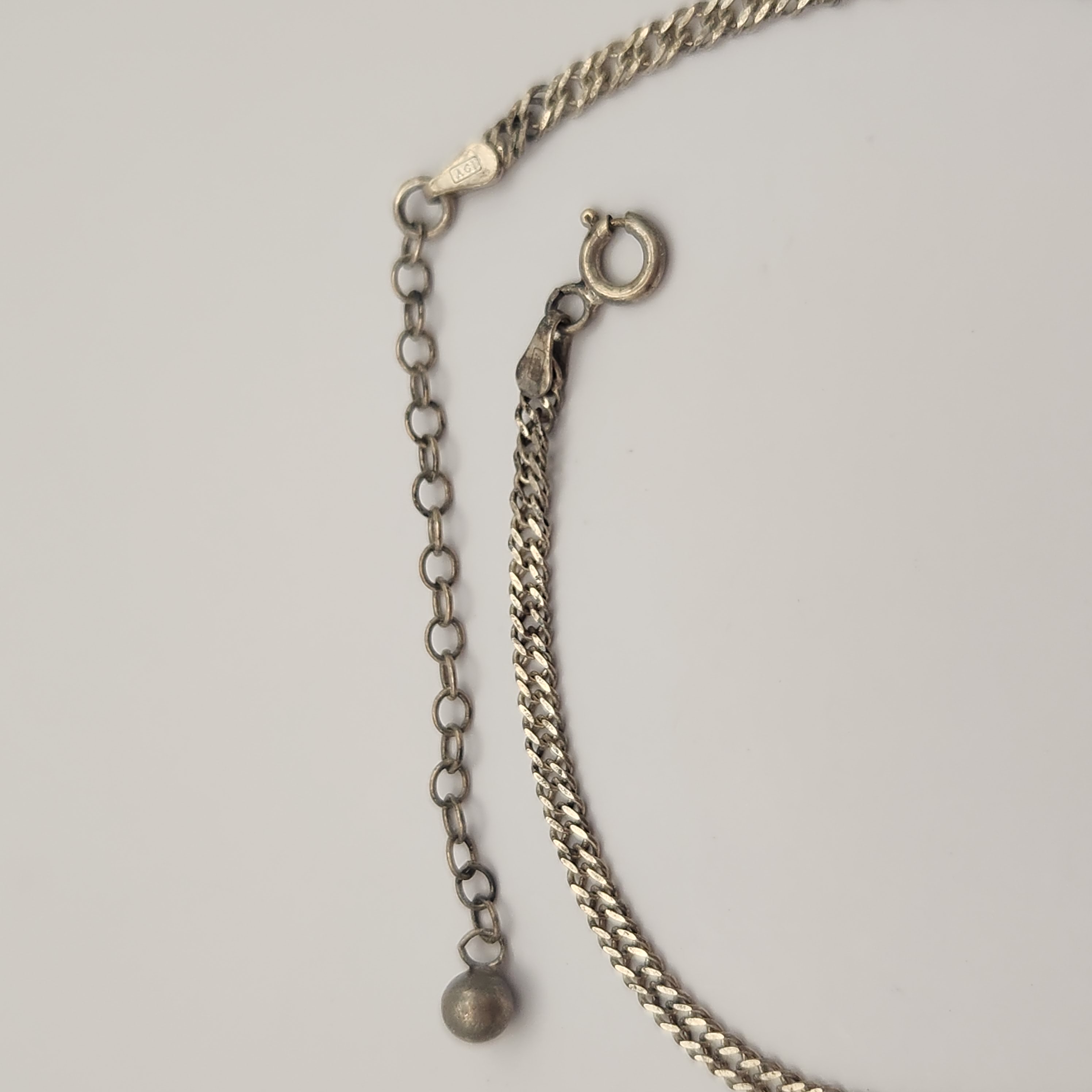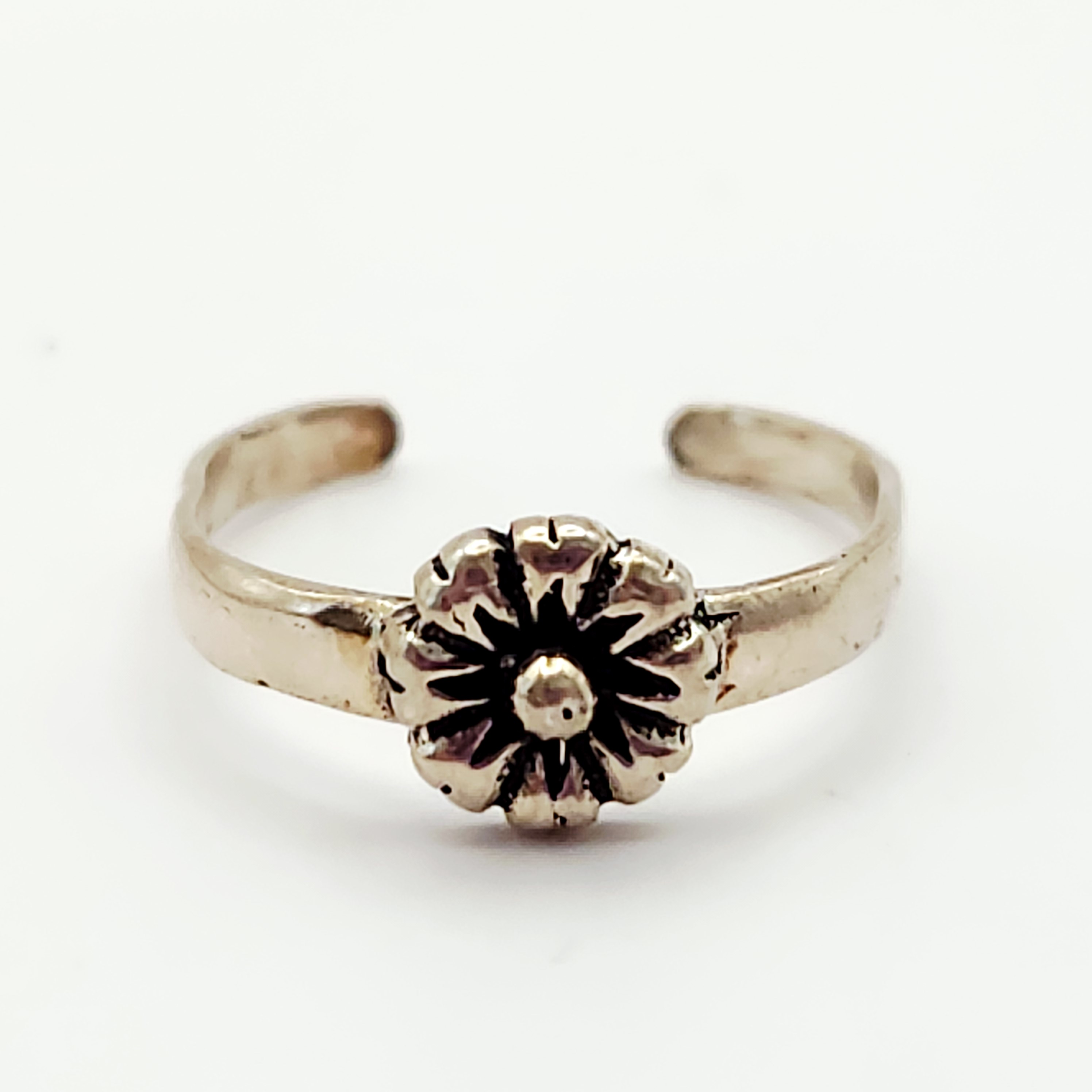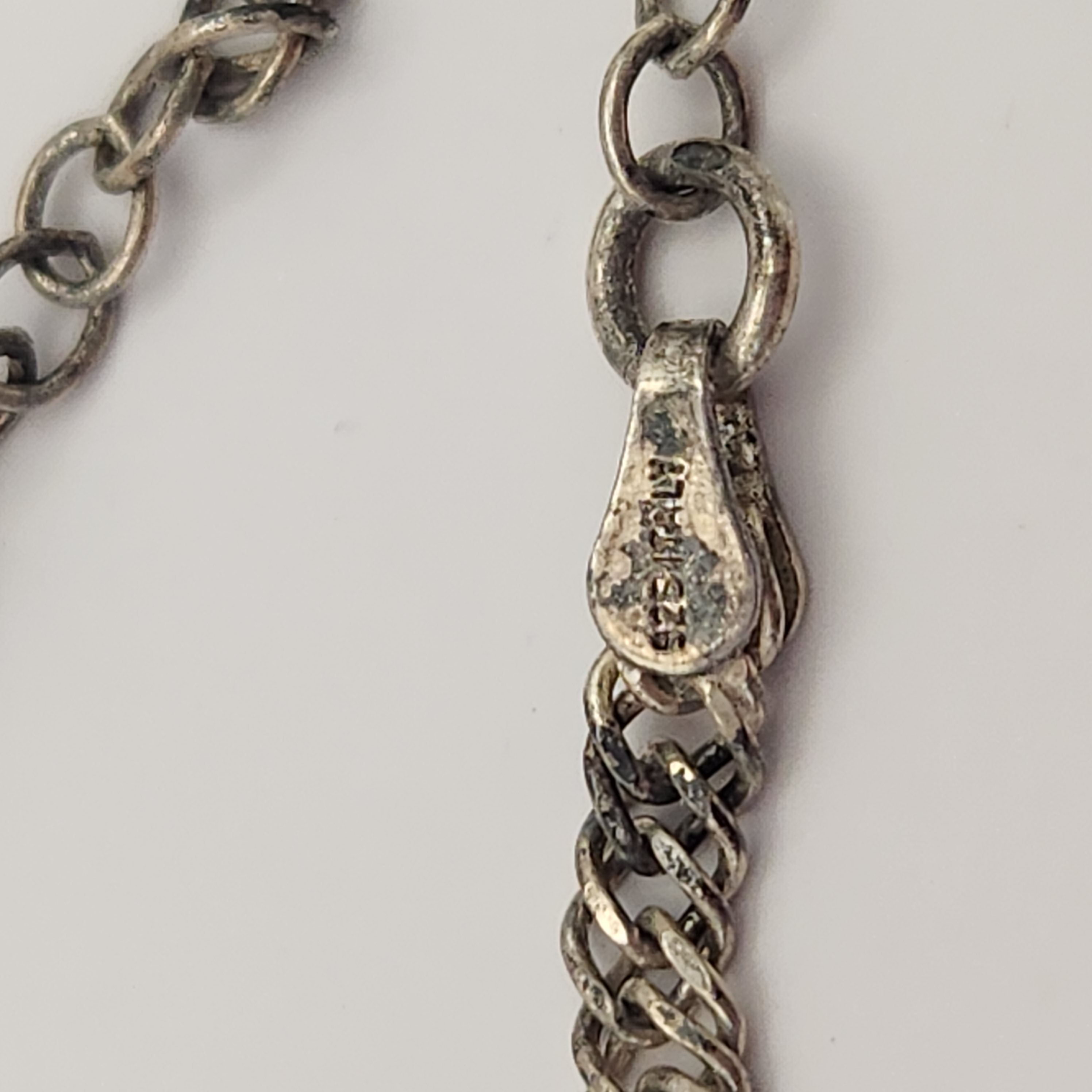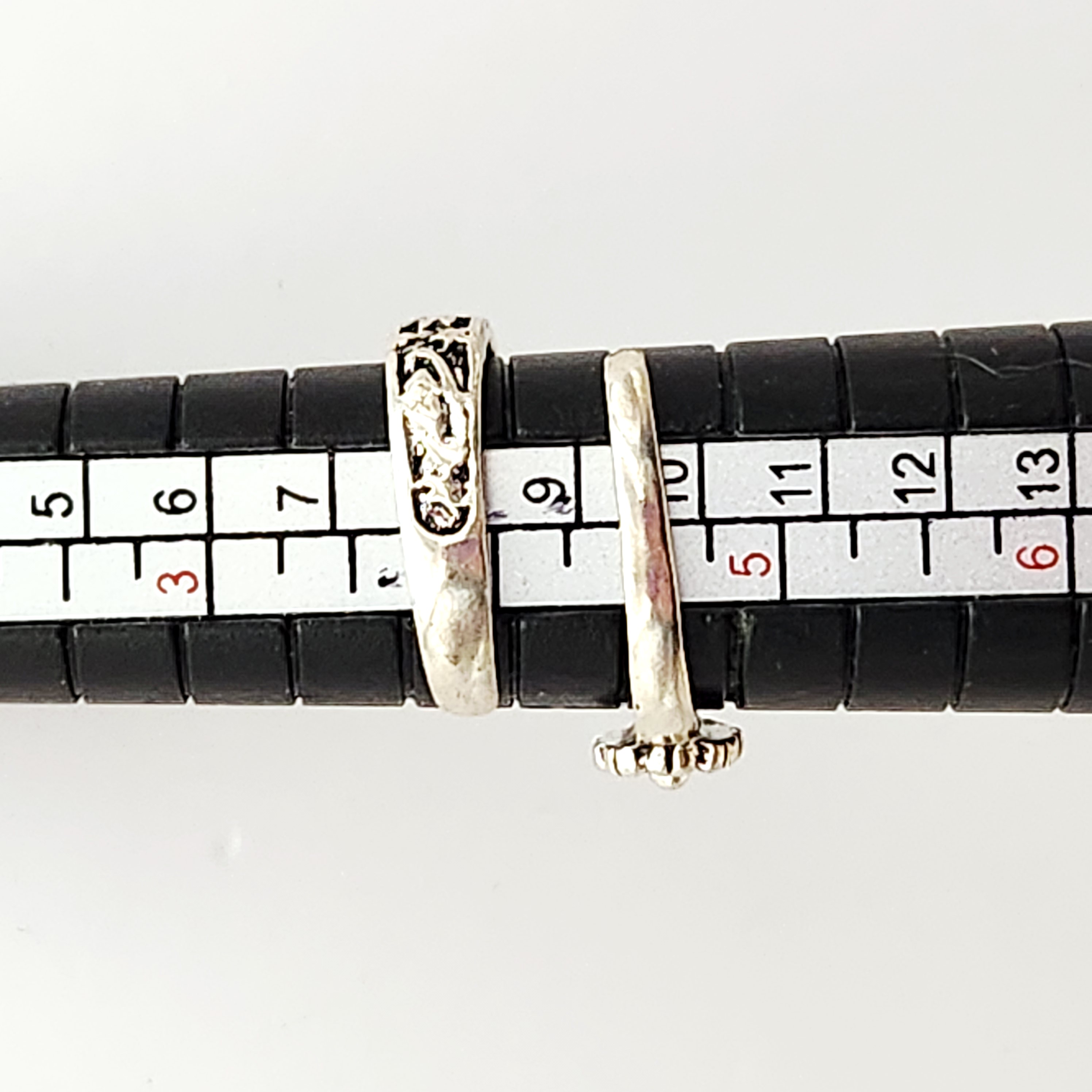 A trio of sterling silver jewelry items including a curb link ankle bracelet and toe rings. The chain features a fine curb link design, a spring ring clasp, an extender chain, and a small spherical terminal charm. The chain is marked 925 ITALY on the end connector and AGI on the metal tag. The celestial-themed ring is an open-back band featuring raised sun, moon, and star motifs against an oxidized background, marked 925 on the inner band. The floral-themed ring is an open-back band featuring a central raised floral motif, marked 925 on the inner band. Total Weight: 8.2 grams Chain Length: 11 inches Ring Sizes: 4 & 4.75 Items are in used condition. Visible surface wear, scratches, and moderate tarnish and oxidation are present throughout the grouping, consistent with age and previous use.