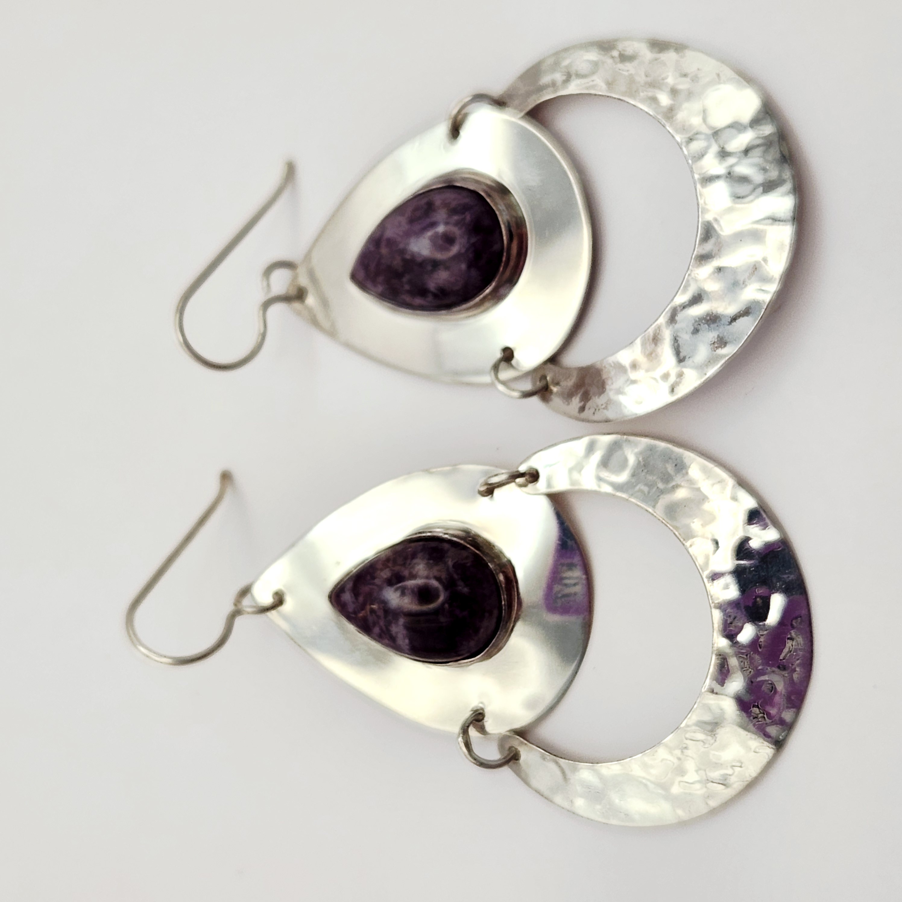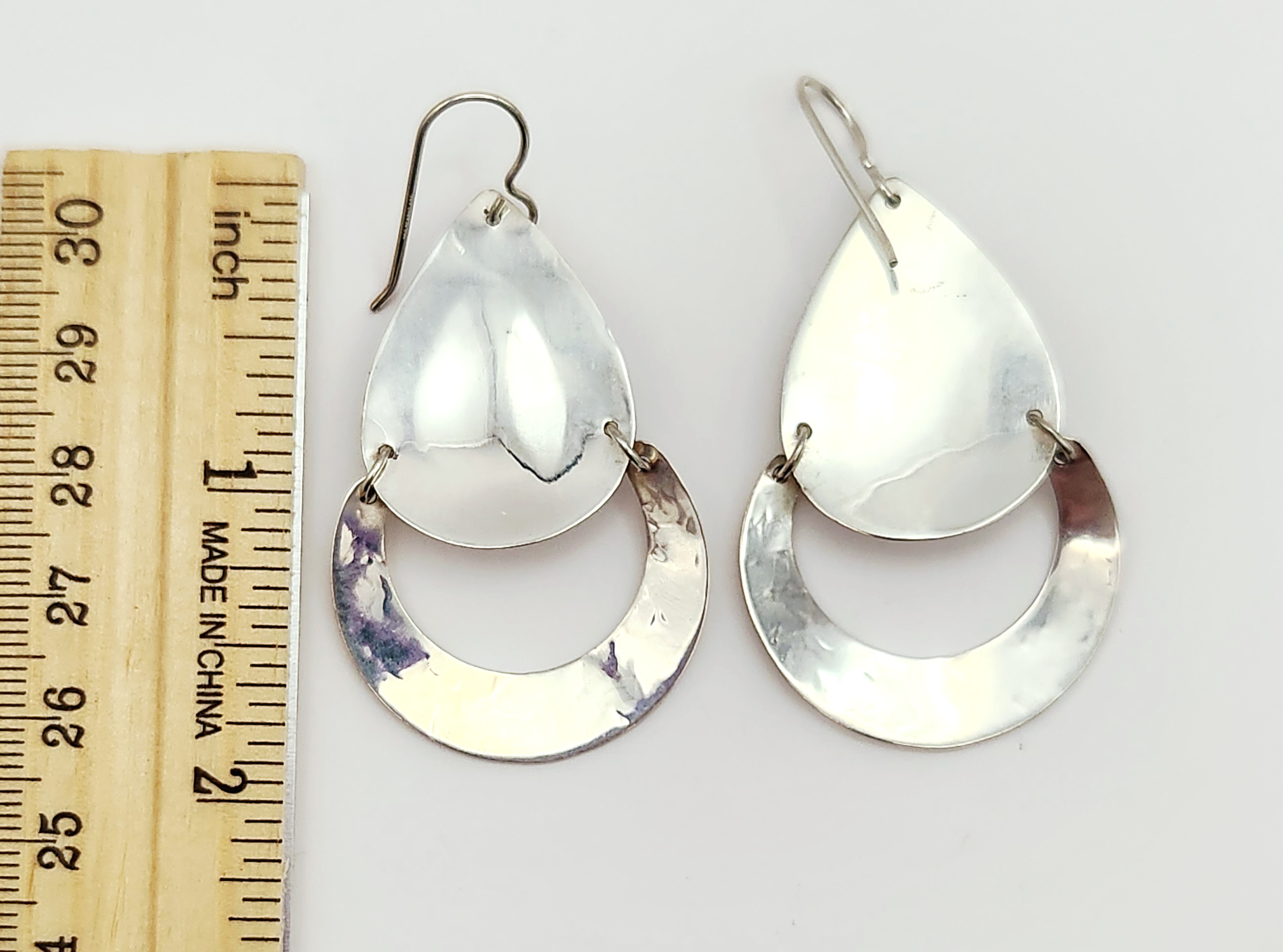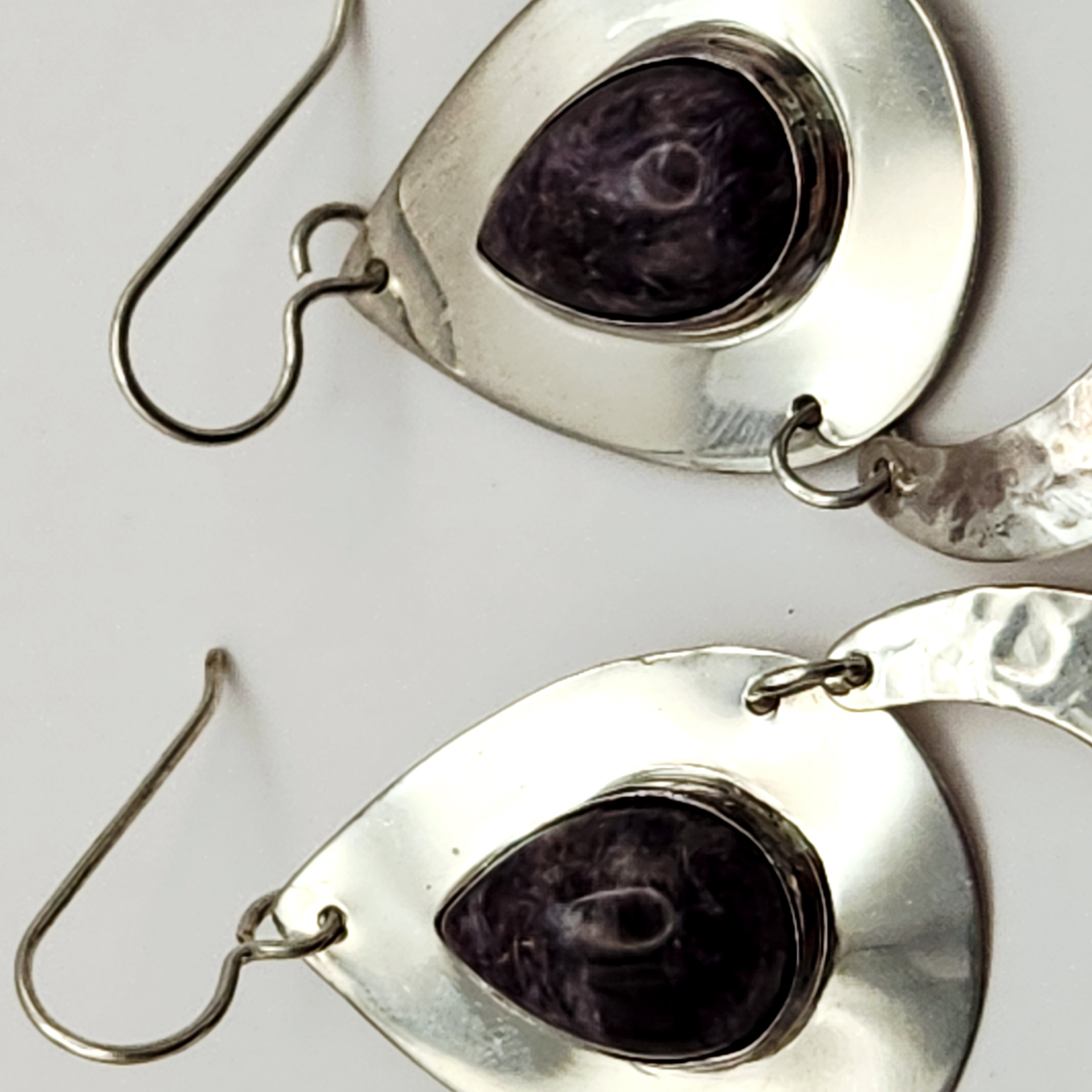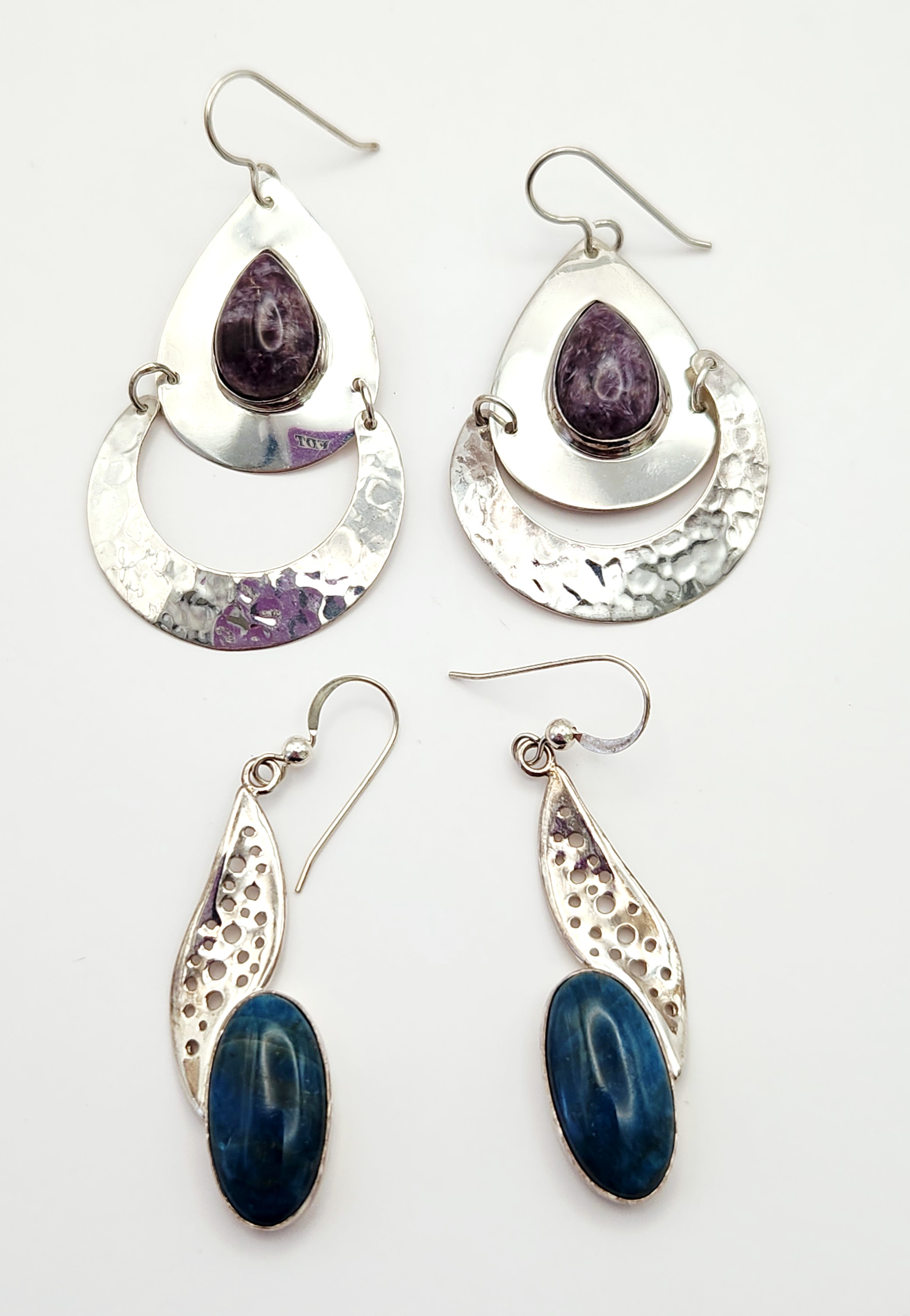 This collection consists of two pairs of artisan-crafted dangle earrings in a sterling. The first pair features teardrop-shaped plates bezel-set with pear-cut purple mottled cabochons, resembling charoite, finished with suspended hammered crescent-shaped drops on hook wires. The second pair consists of elongated, curved drops with pierced openwork detailing, each bezel-set with an oval blue chatoyant cabochon, resembling kyanite, on hook wires marked 925. Both pairs exhibit a polished finish. Unmarked pair acid tested sterling. Length: 2 to 2.25 inches Weight: 18.9 grams. Both pairs exhibit minor surface wear and light patina consistent with use.