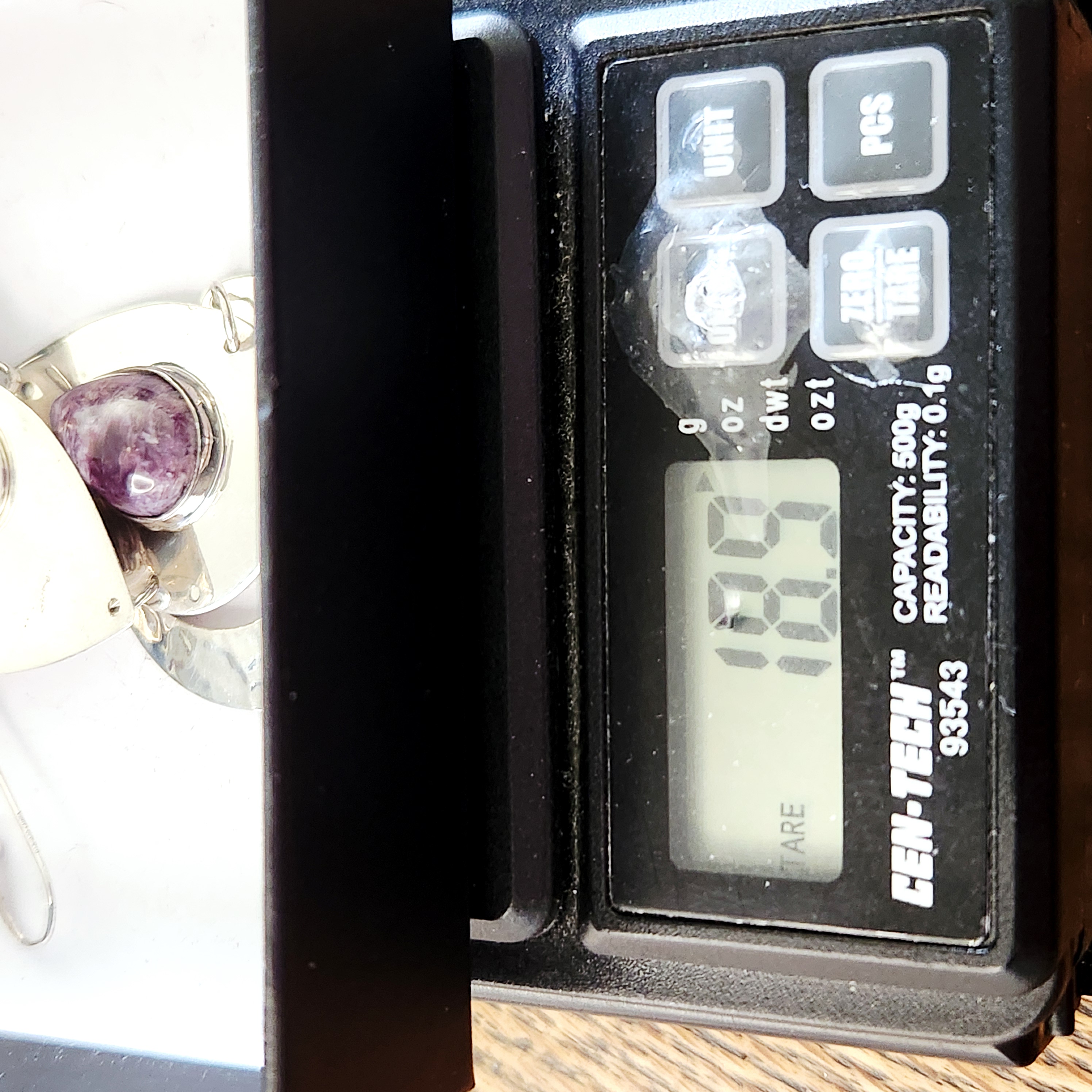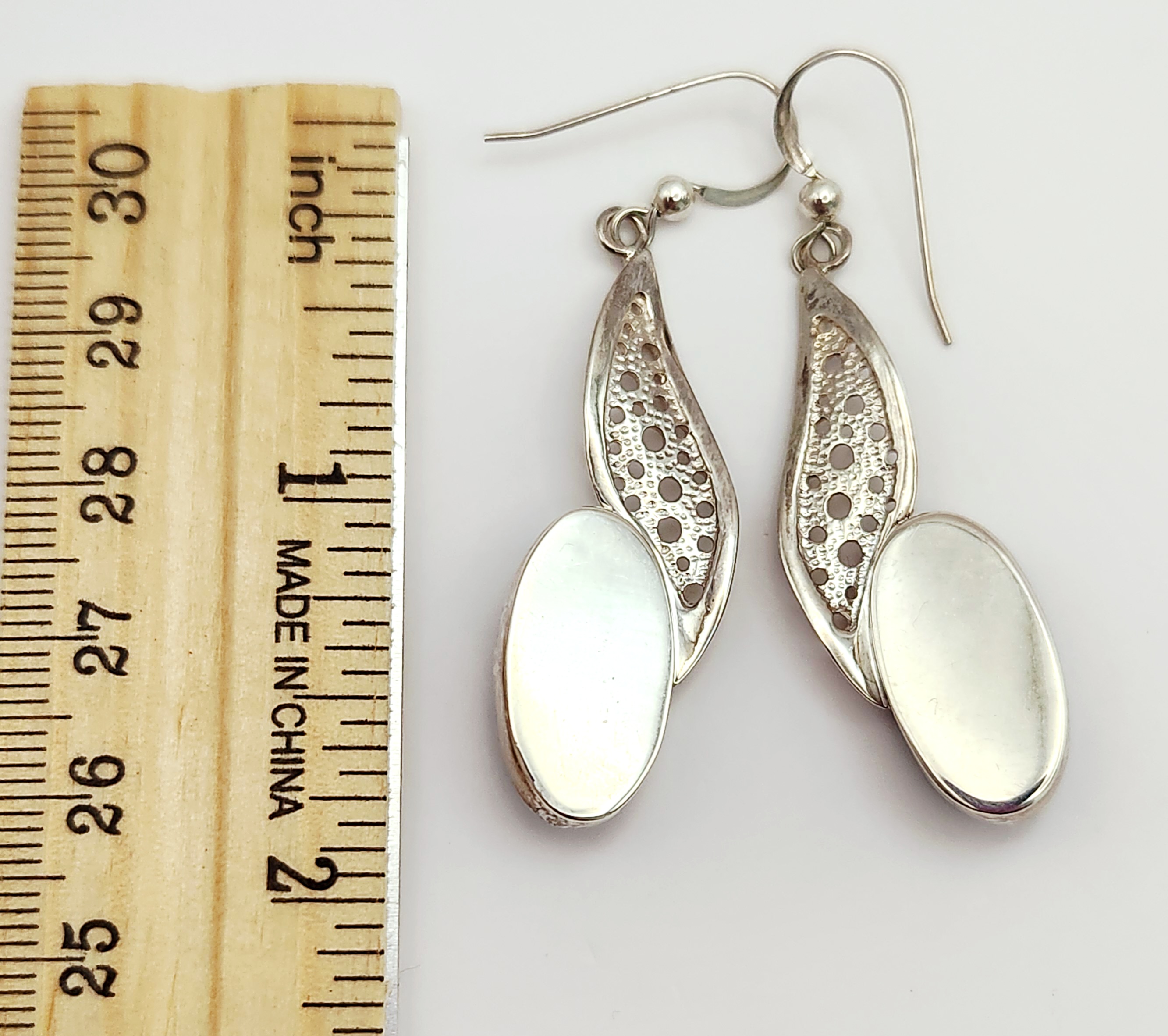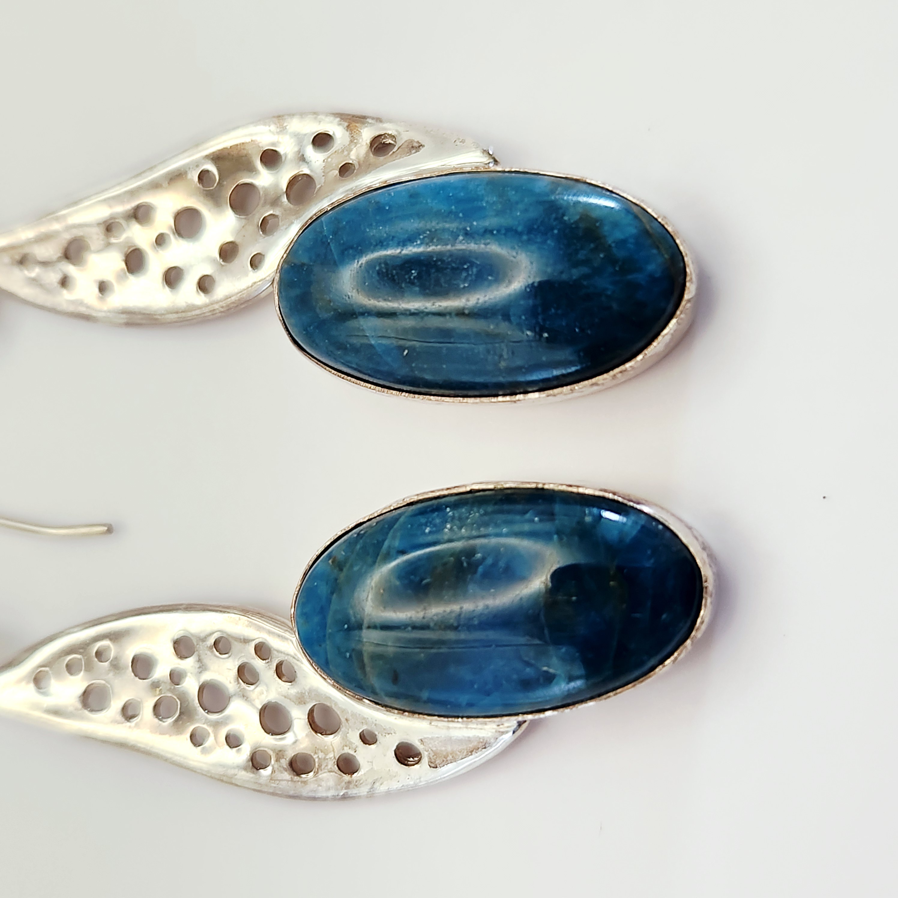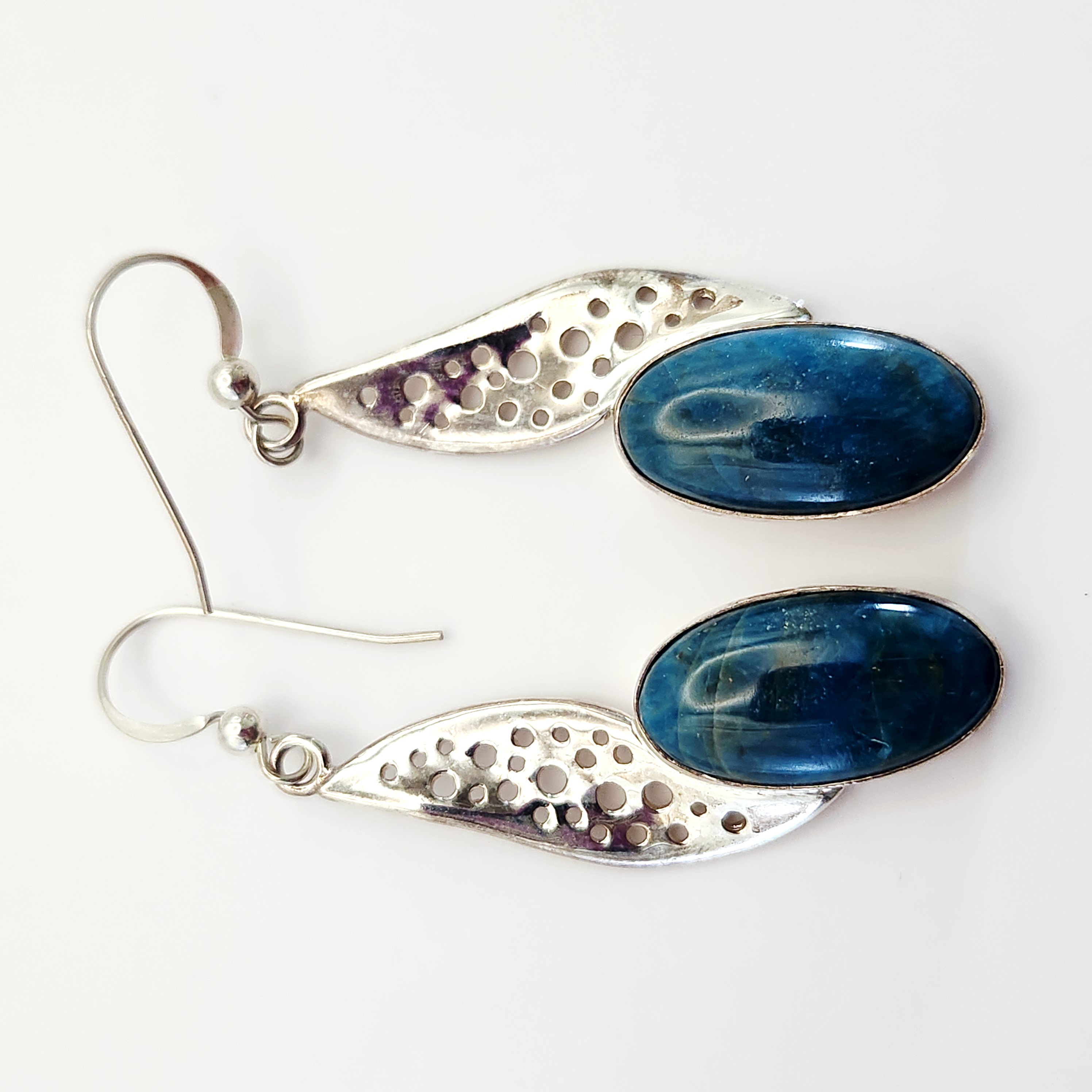 This collection consists of two pairs of artisan-crafted dangle earrings in a sterling. The first pair features teardrop-shaped plates bezel-set with pear-cut purple mottled cabochons, resembling charoite, finished with suspended hammered crescent-shaped drops on hook wires. The second pair consists of elongated, curved drops with pierced openwork detailing, each bezel-set with an oval blue chatoyant cabochon, resembling kyanite, on hook wires marked 925. Both pairs exhibit a polished finish. Unmarked pair acid tested sterling. Length: 2 to 2.25 inches Weight: 18.9 grams. Both pairs exhibit minor surface wear and light patina consistent with use.