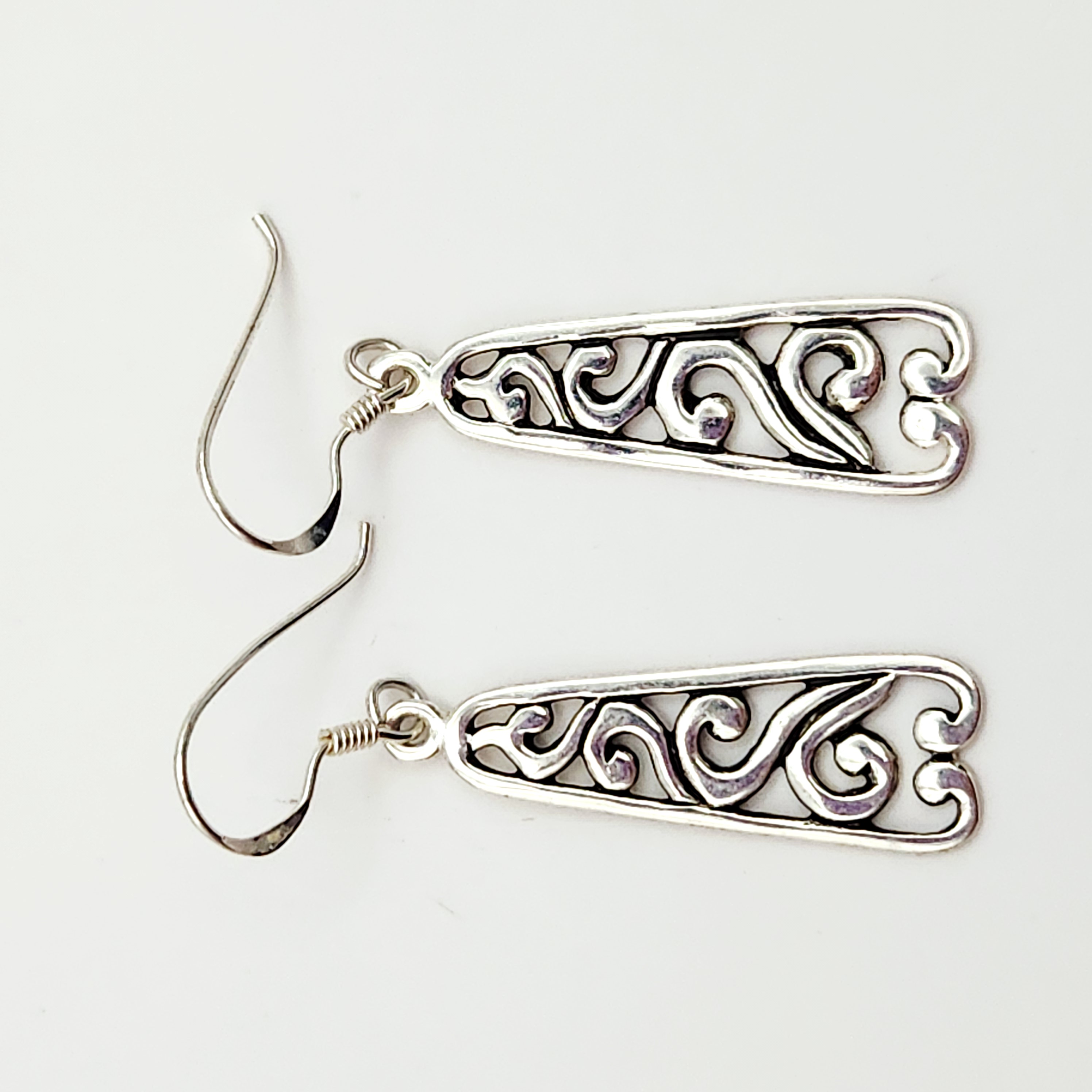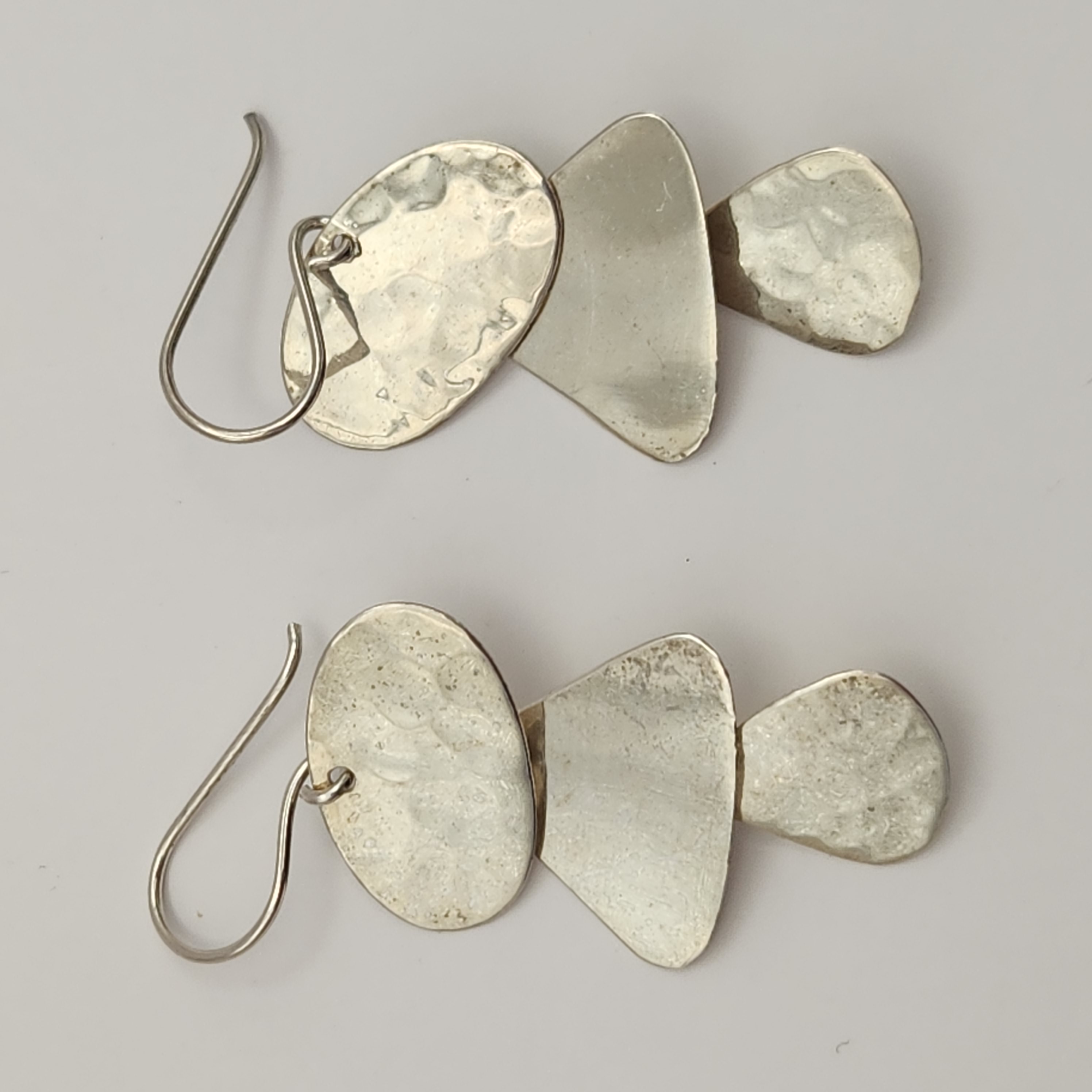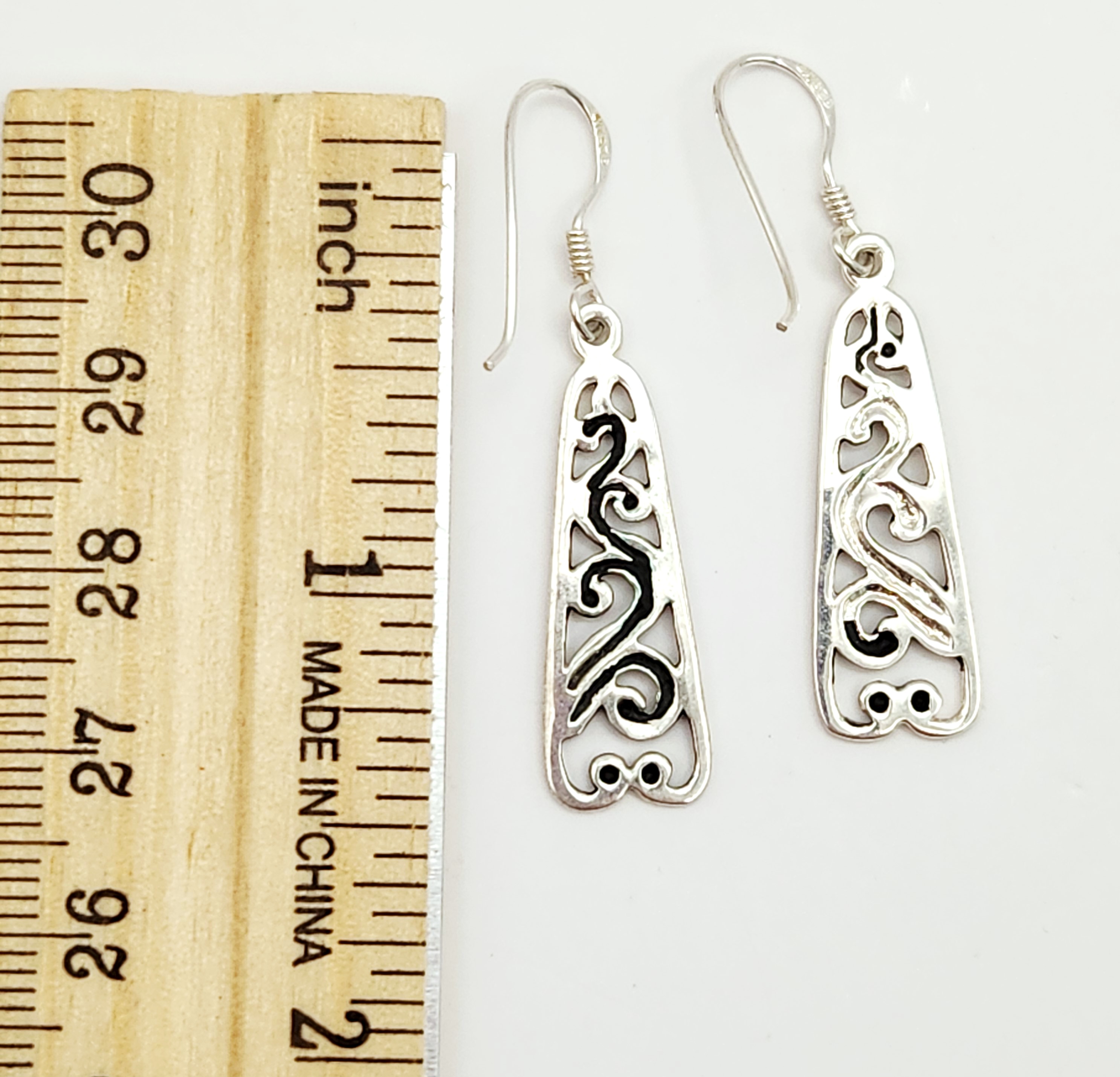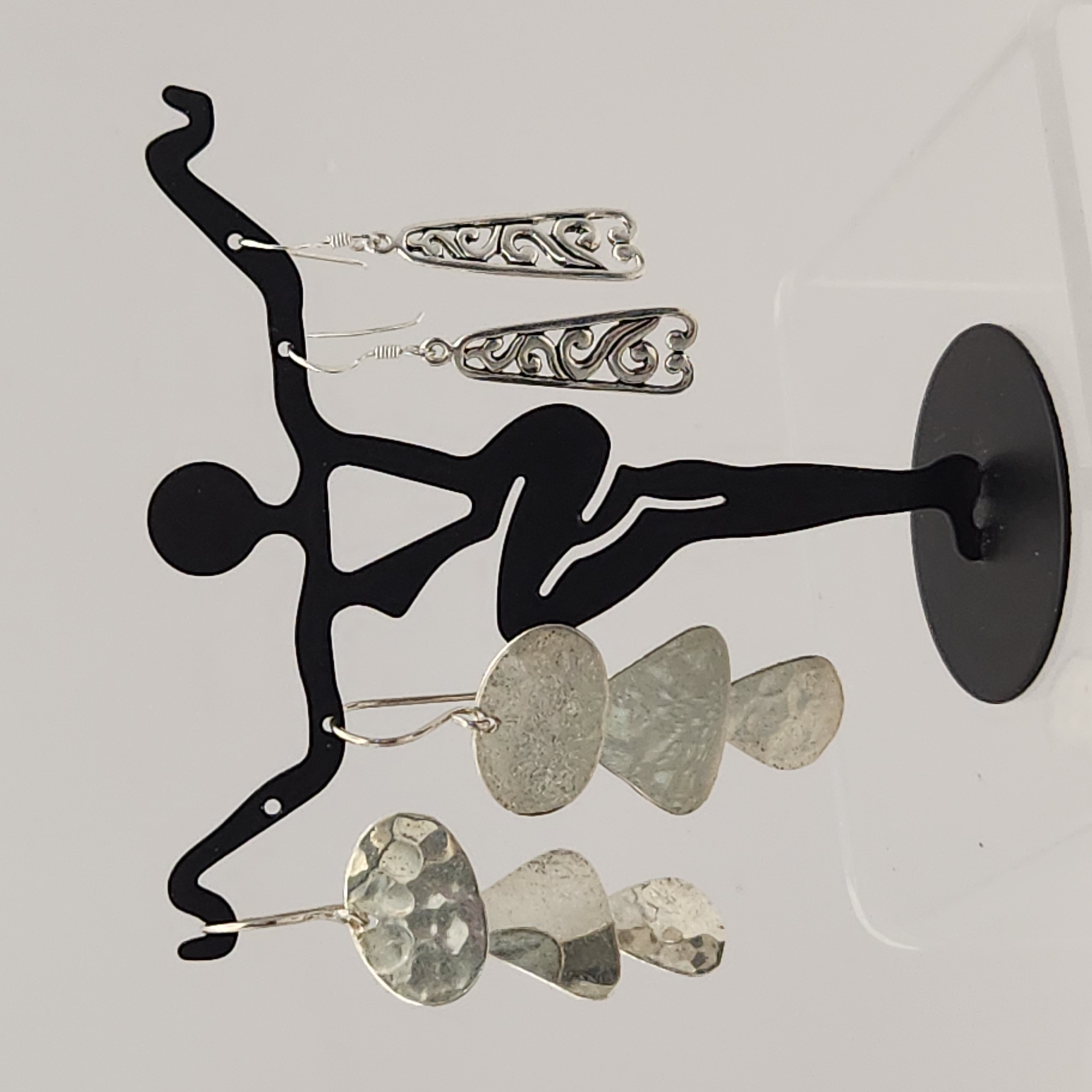 Two pairs of sterling silver earrings marked 925 MC featuring hammered graduated organic shapes and an openwork scrollwork design, weighing approximately 9.3 grams and measuring 1.5 to 1.75 inches long. Both pairs are in good condition.