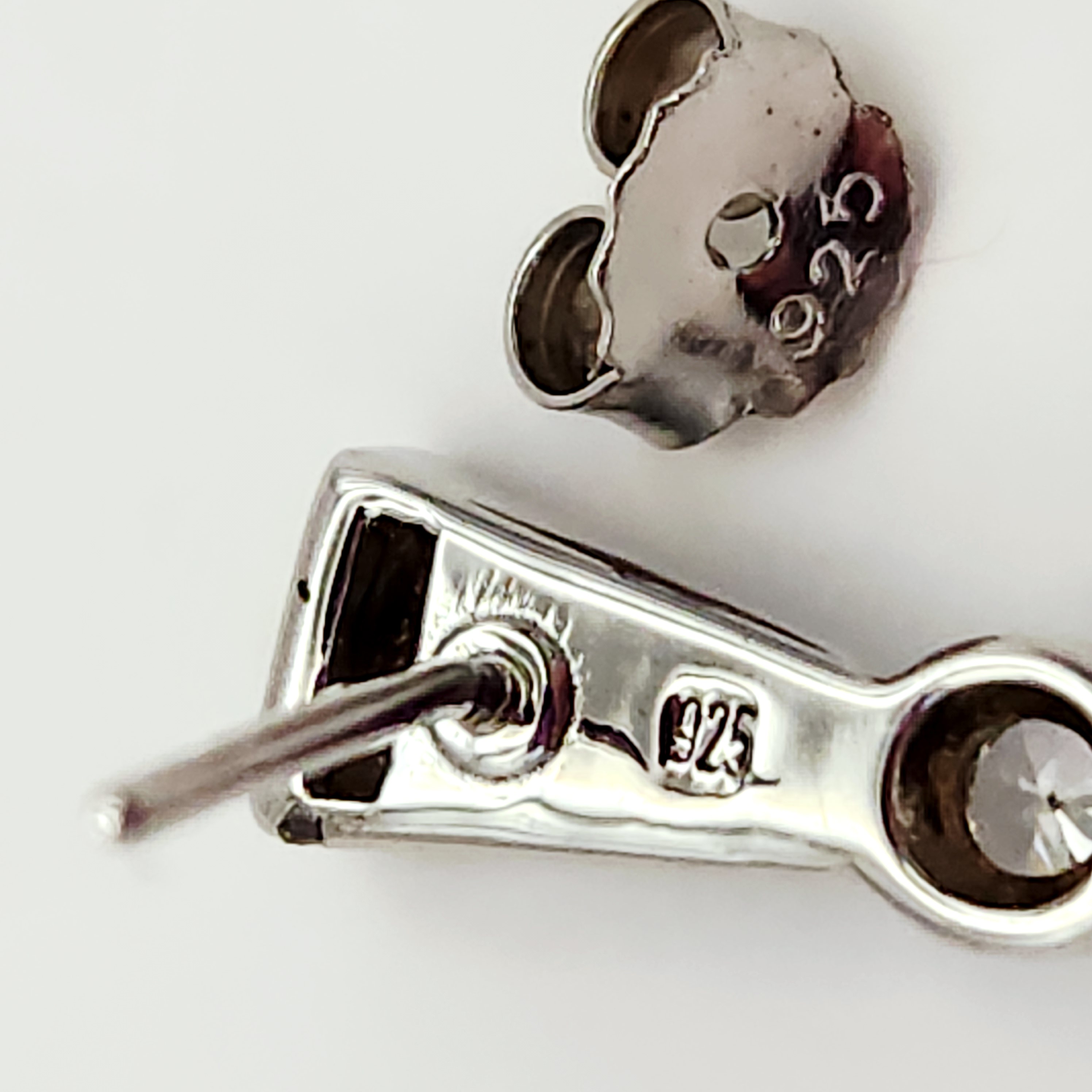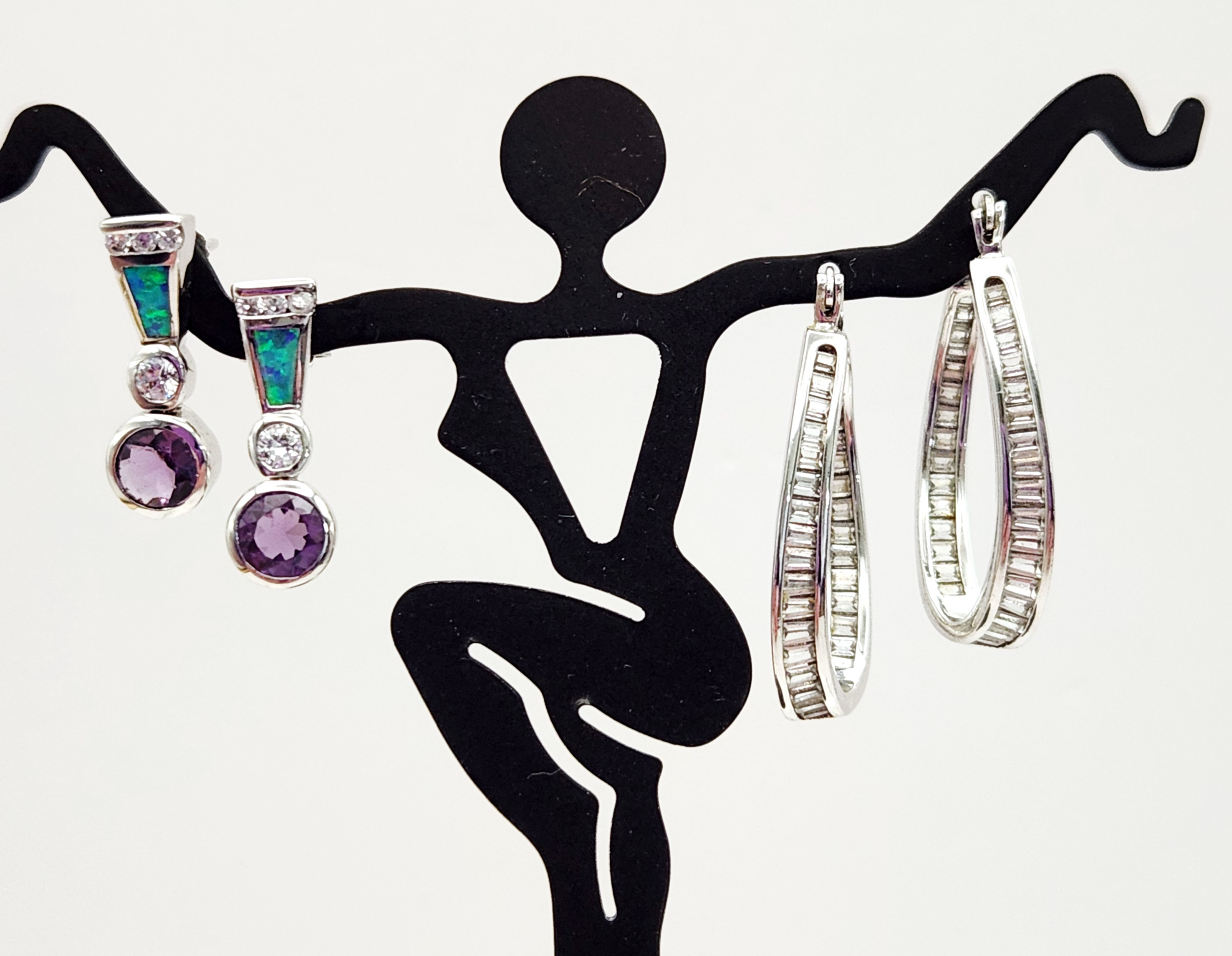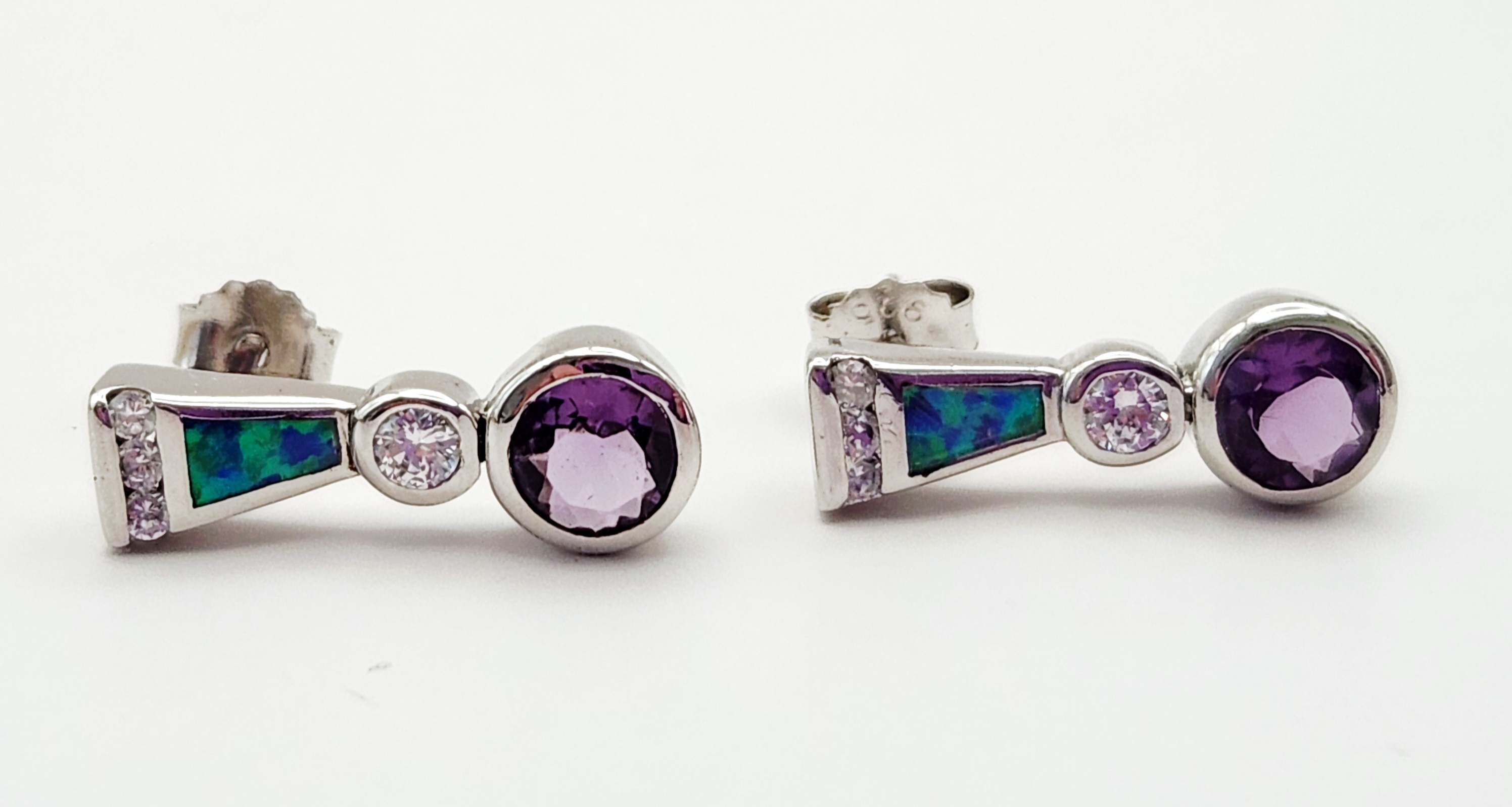 This lot features two matched pairs of sterling silver earrings. The first pair consists of drop earrings, each set with a round faceted purple stone, likely amethyst, at the base. The design includes a small round clear faceted stone in the center and a trapezoidal inlay of blue-green opal, likely synthetic or triplet. The top edge is accented with three small round clear faceted stones. These earrings are equipped with post and friction butterfly backings and are stamped 925 on the earring post assembly and backings. The second pair consists of teardrop-shaped hinged hoop earrings designed in an inside-out style. They are channel-set with cz baguette-cut stones along the outer front and inner back surfaces. These earrings feature a hinged latch back closure and are stamped 925 on the ear wire, with the interior of the hoop marked FZN 925 CHINA. Drop earrings length: 1 inch Hoop earrings height: 1.25 inches Total weight: 9.8 grams. Both pairs are in excellent condition. All stones are present and secure in their settings. Hinges and backings are in proper working order.
