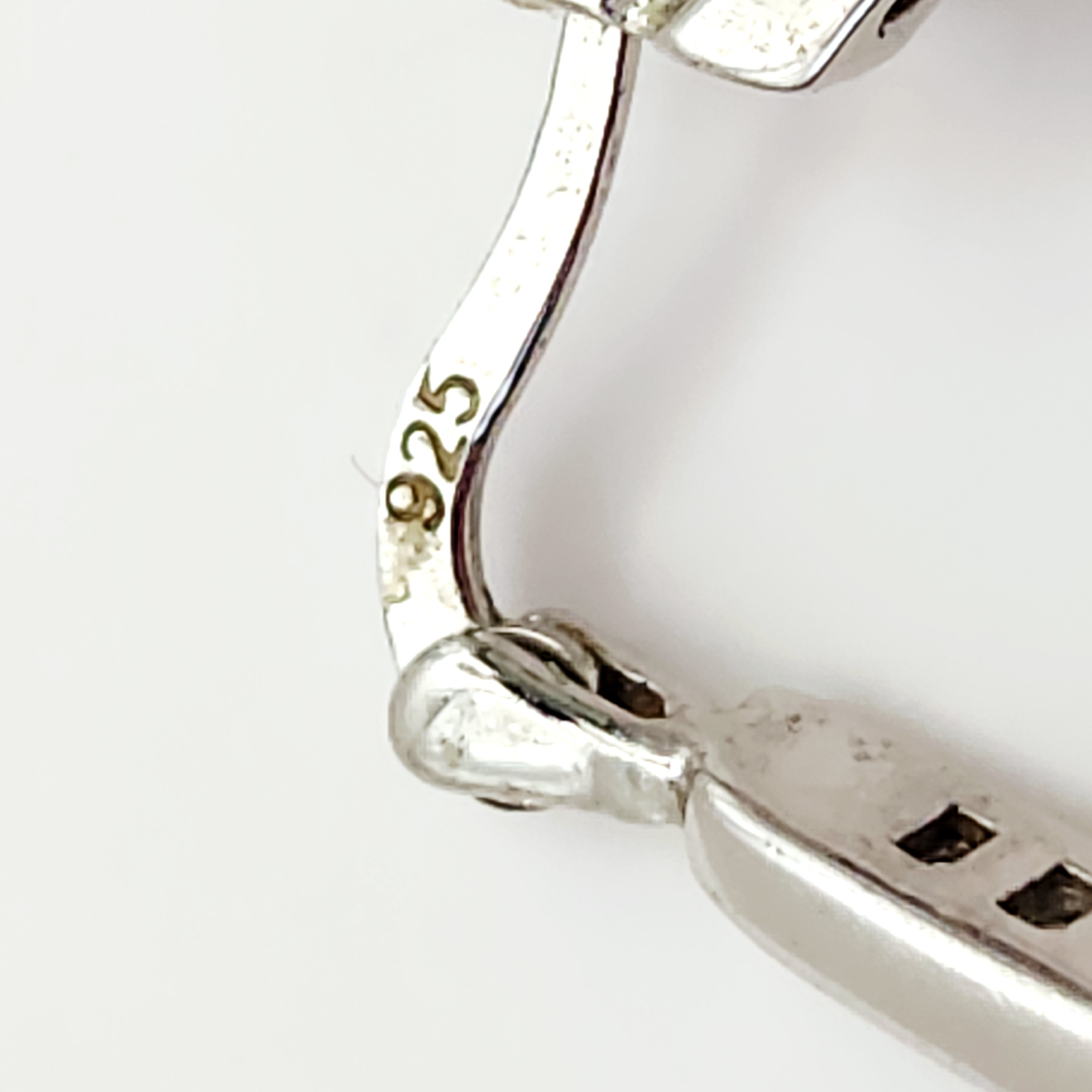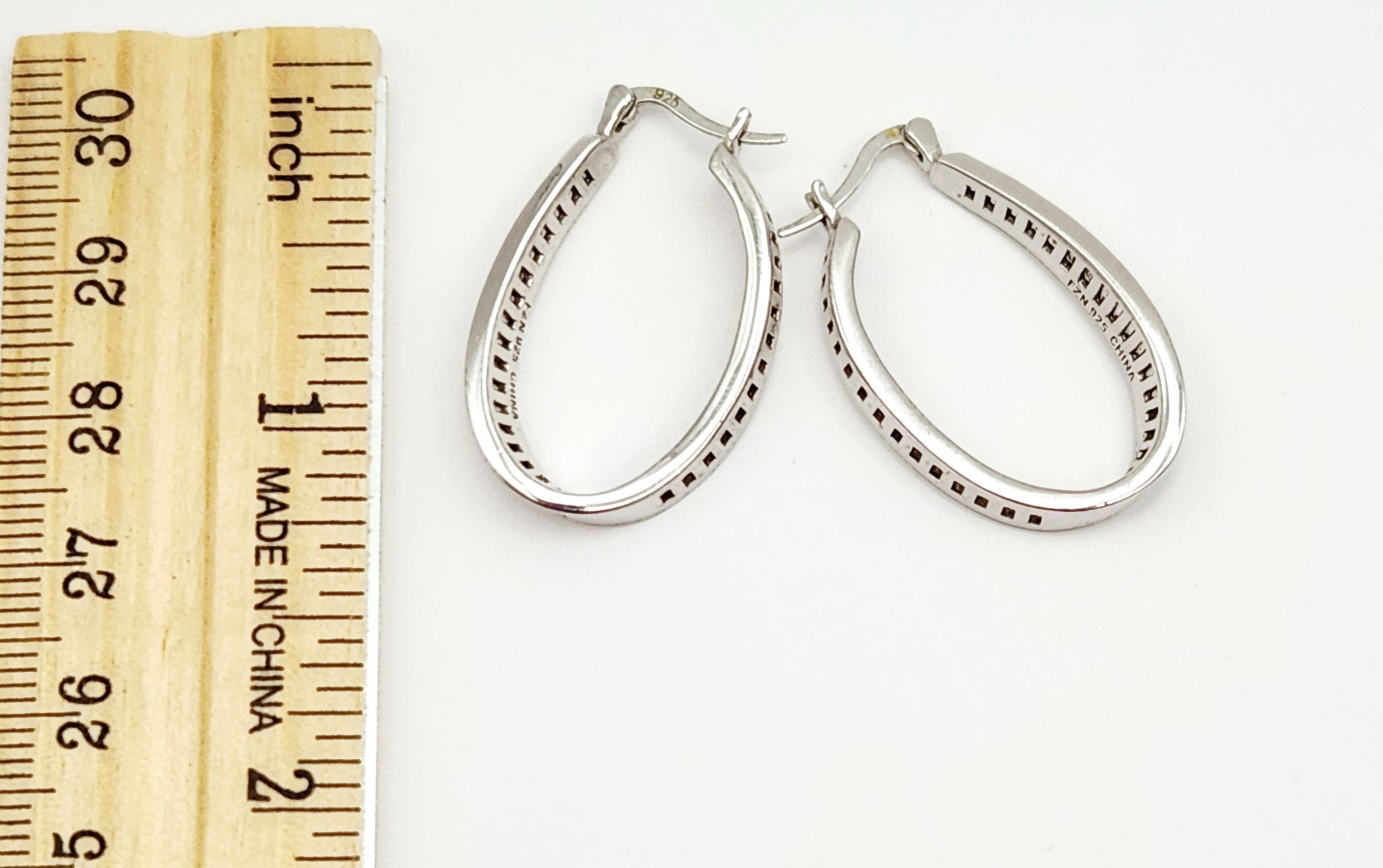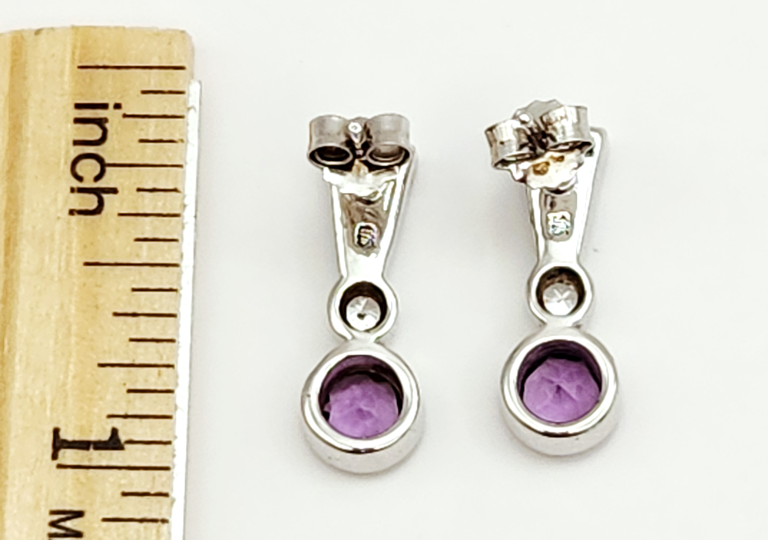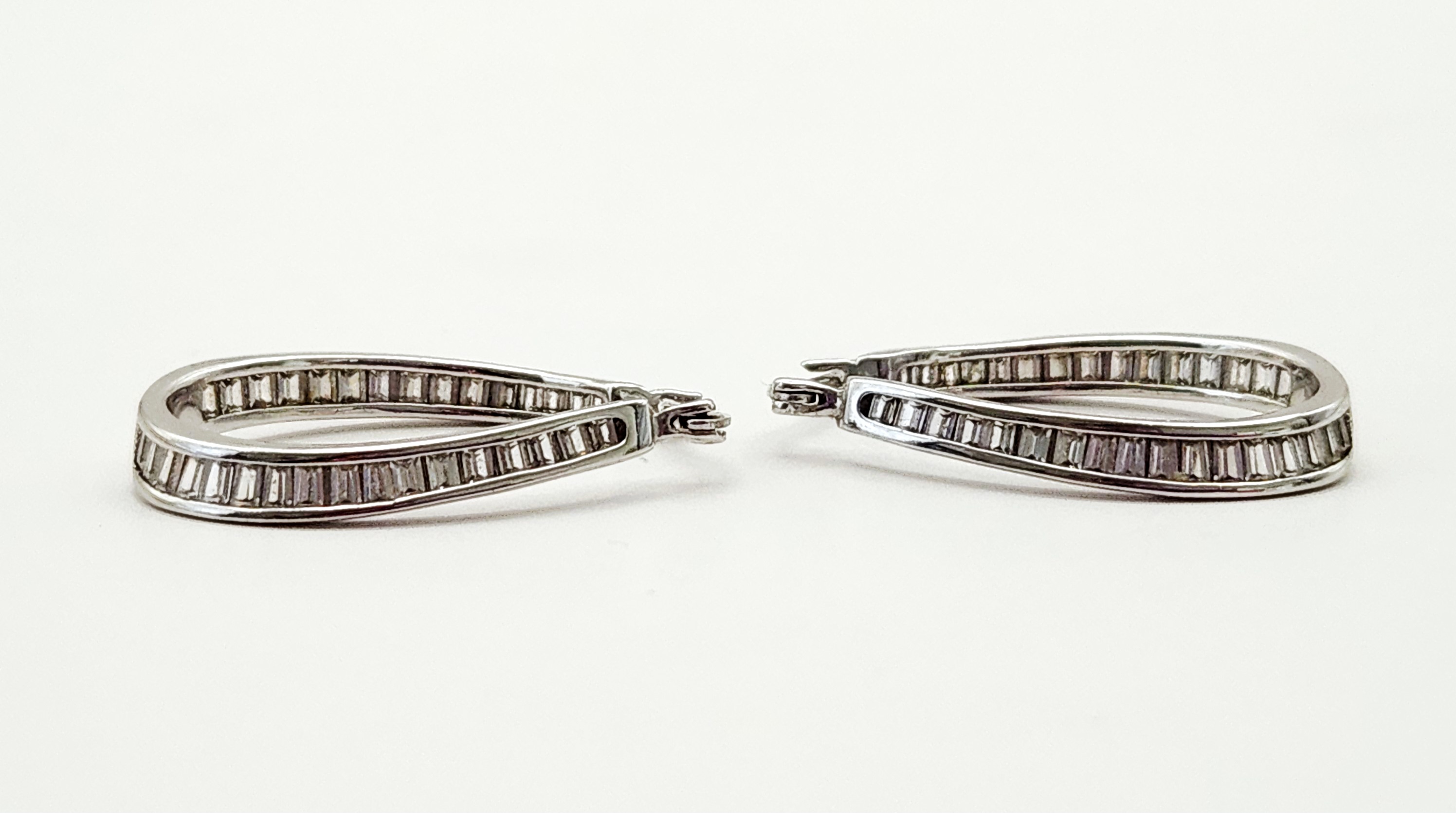 This lot features two matched pairs of sterling silver earrings. The first pair consists of drop earrings, each set with a round faceted purple stone, likely amethyst, at the base. The design includes a small round clear faceted stone in the center and a trapezoidal inlay of blue-green opal, likely synthetic or triplet. The top edge is accented with three small round clear faceted stones. These earrings are equipped with post and friction butterfly backings and are stamped 925 on the earring post assembly and backings. The second pair consists of teardrop-shaped hinged hoop earrings designed in an inside-out style. They are channel-set with cz baguette-cut stones along the outer front and inner back surfaces. These earrings feature a hinged latch back closure and are stamped 925 on the ear wire, with the interior of the hoop marked FZN 925 CHINA. Drop earrings length: 1 inch Hoop earrings height: 1.25 inches Total weight: 9.8 grams. Both pairs are in excellent condition. All stones are present and secure in their settings. Hinges and backings are in proper working order.