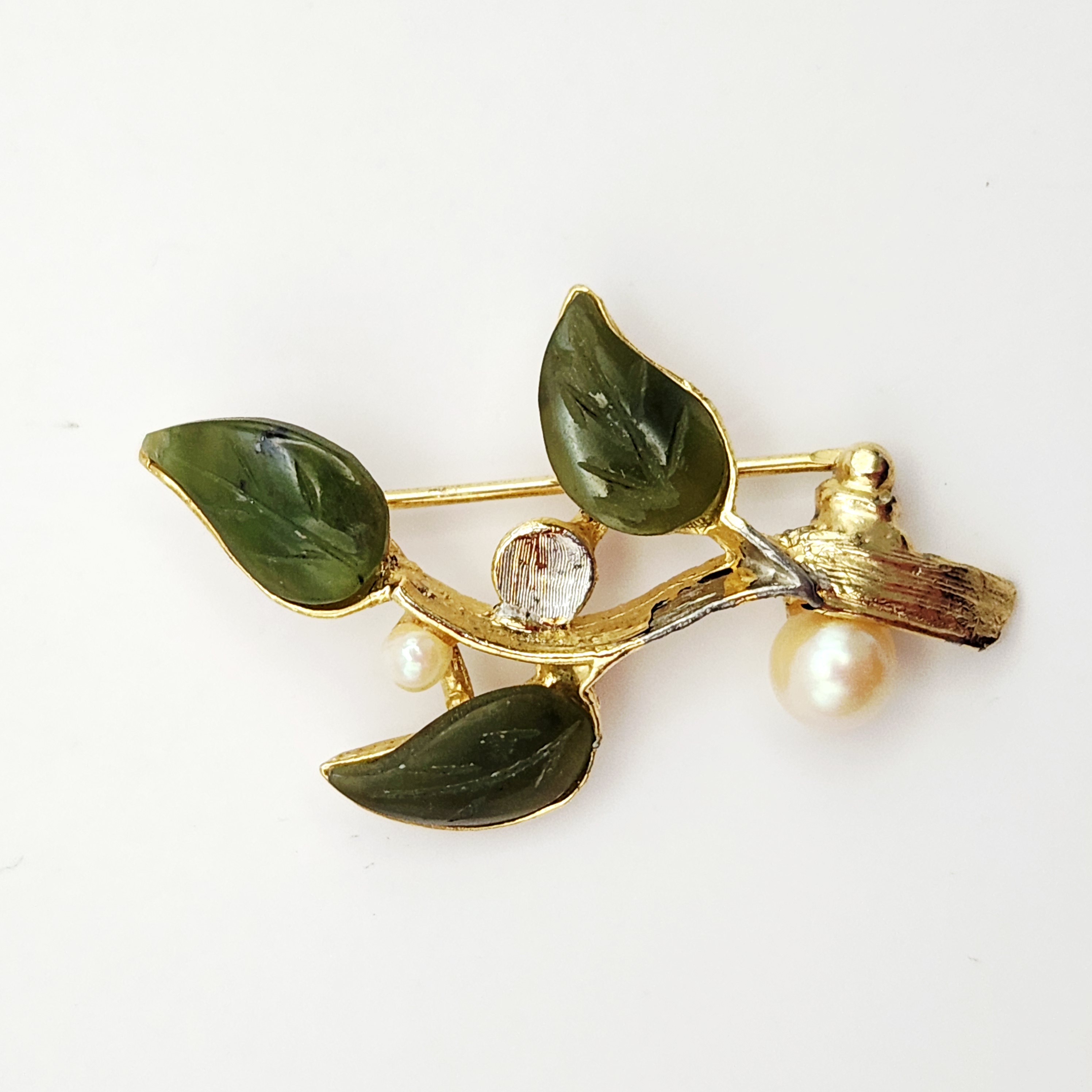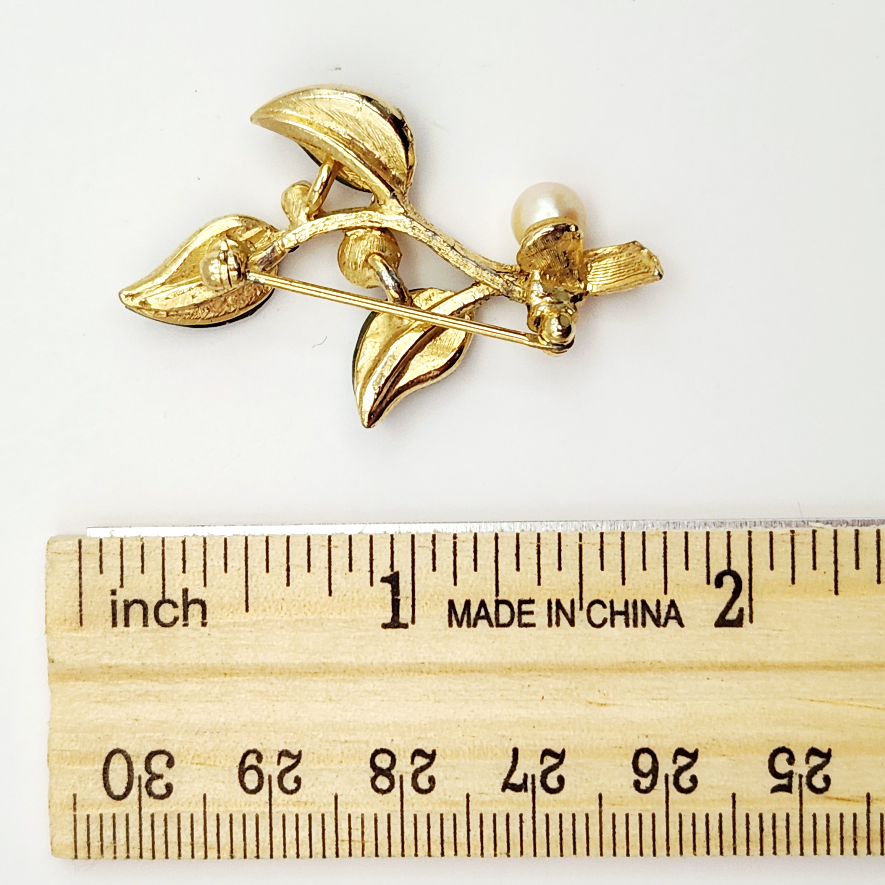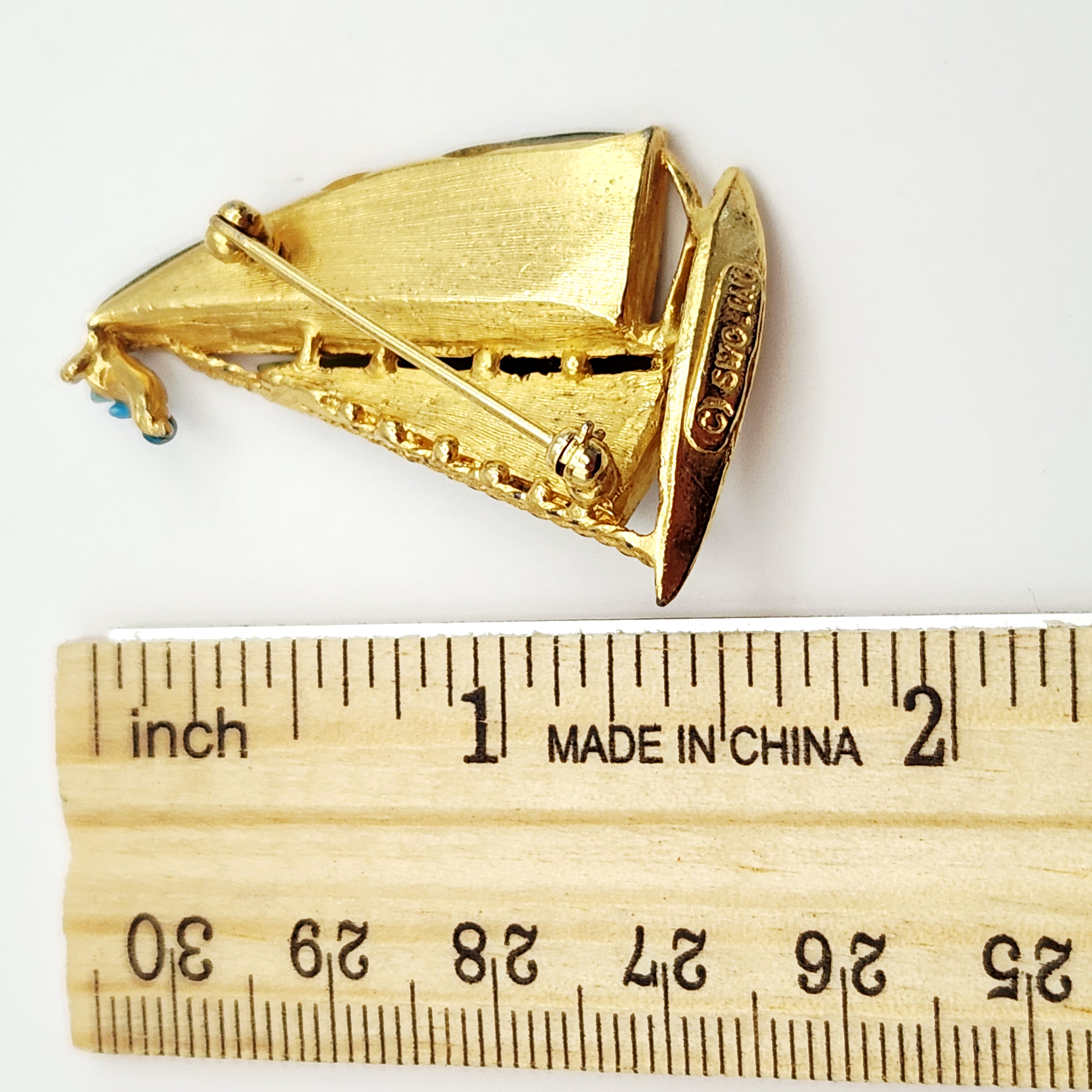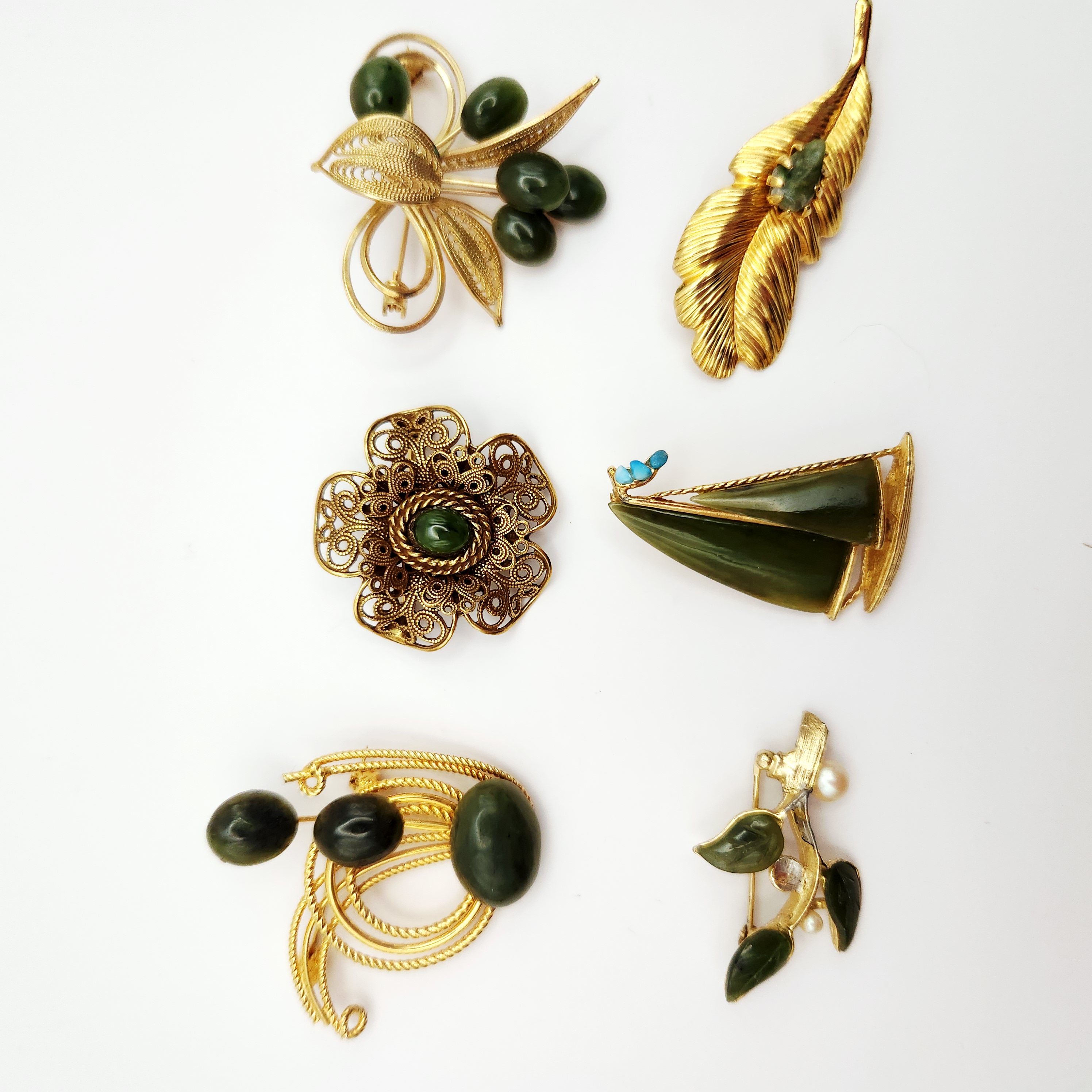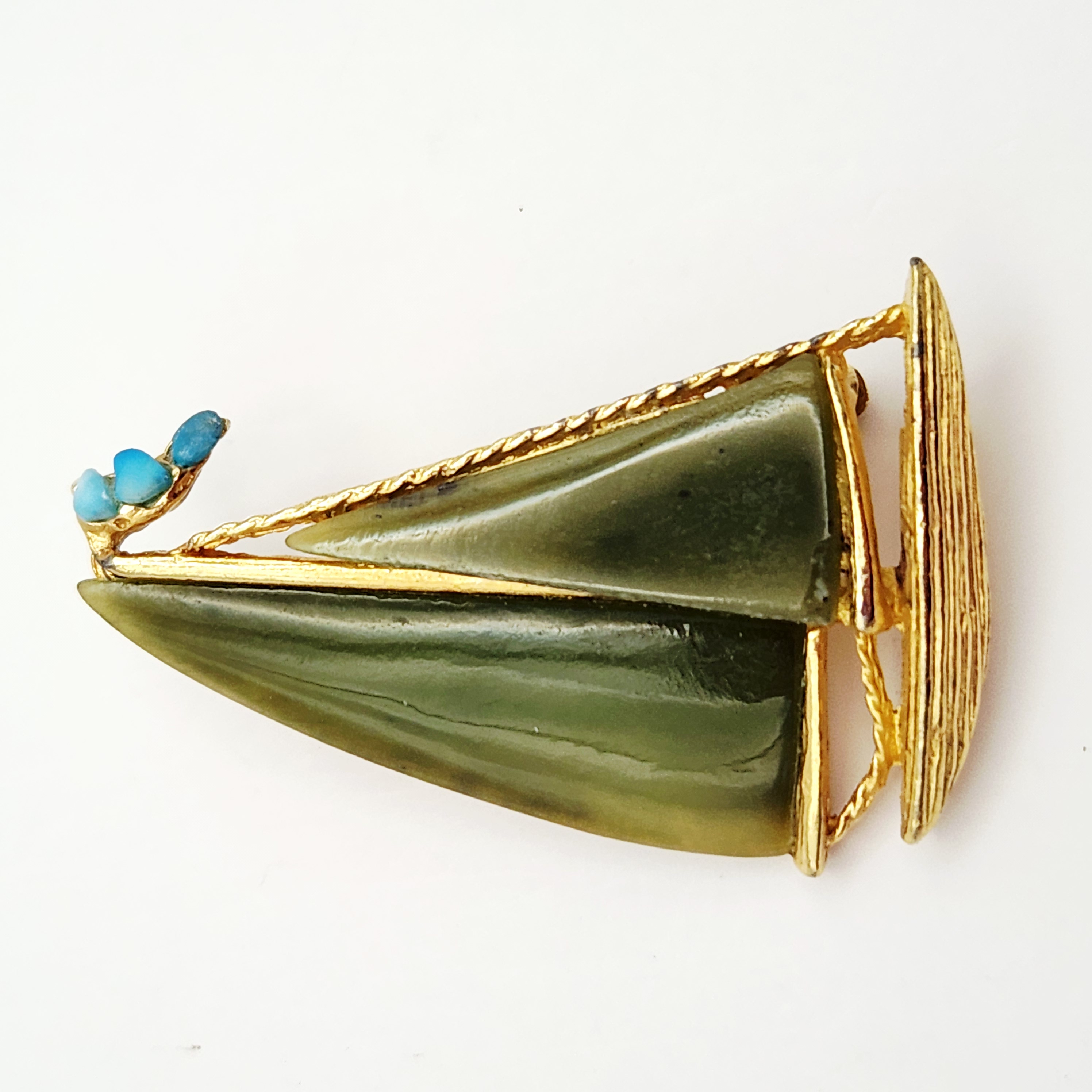 Several gold-toned brooches featuring green stones and faux pearls, including a sailboat marked Swoboda Inc, with sizes ranging from 1.5 to 2.25 inches. Good vintage condition.