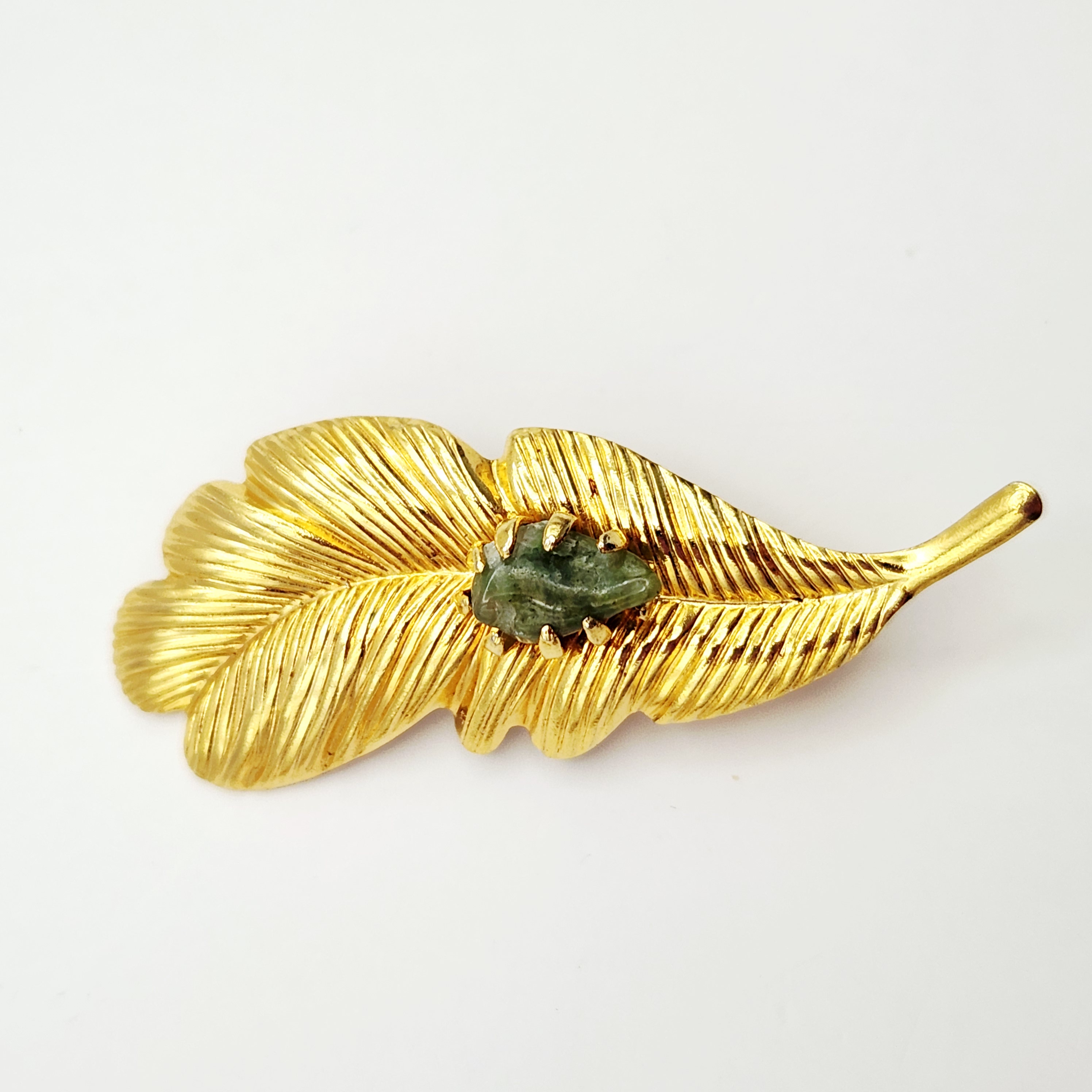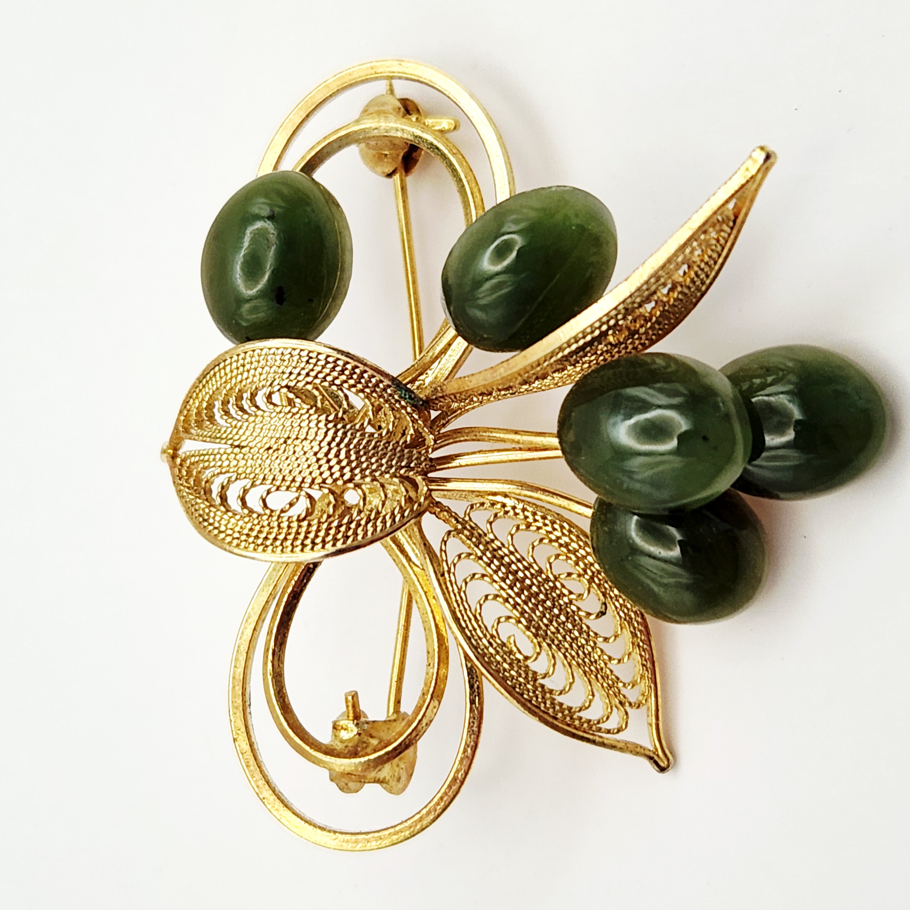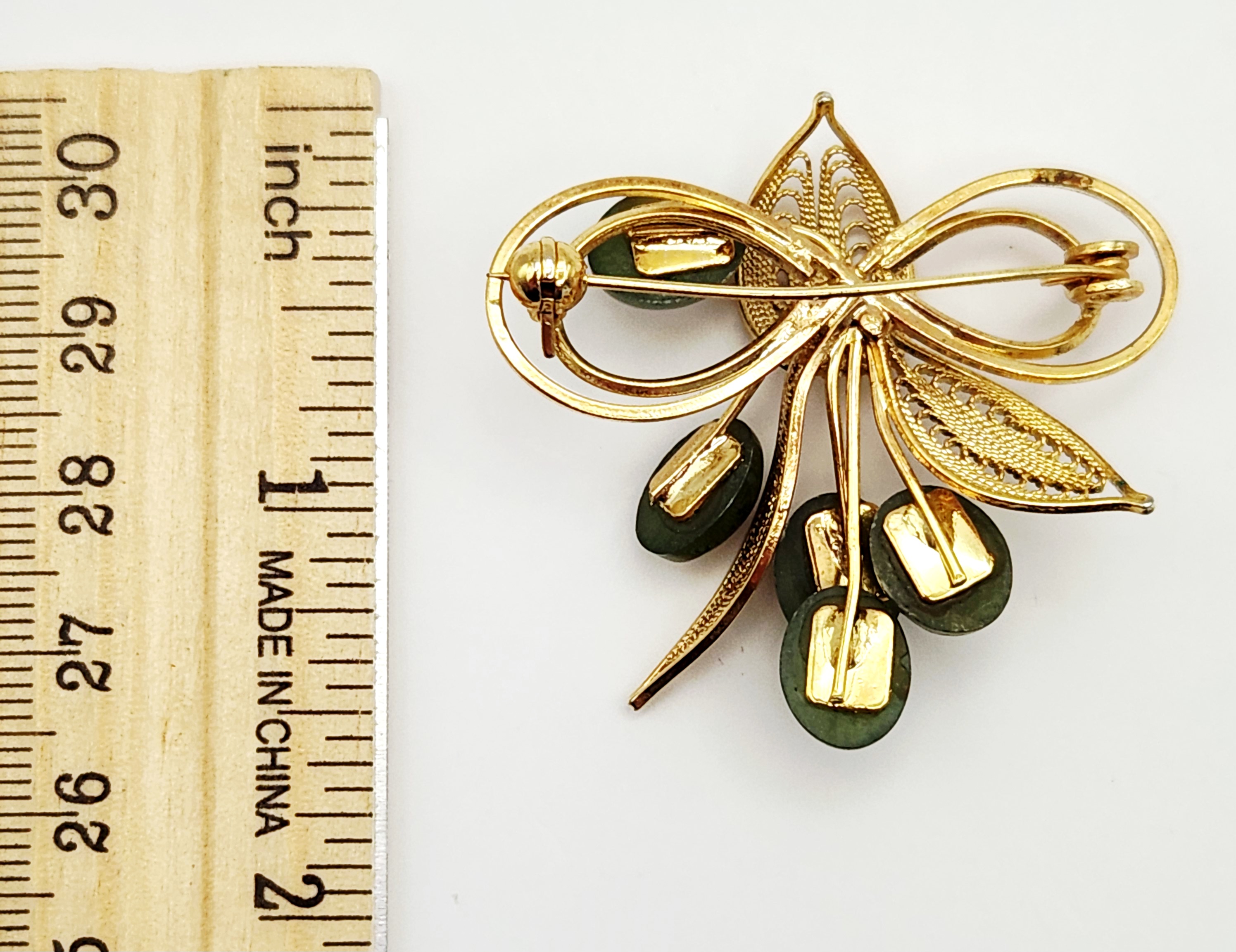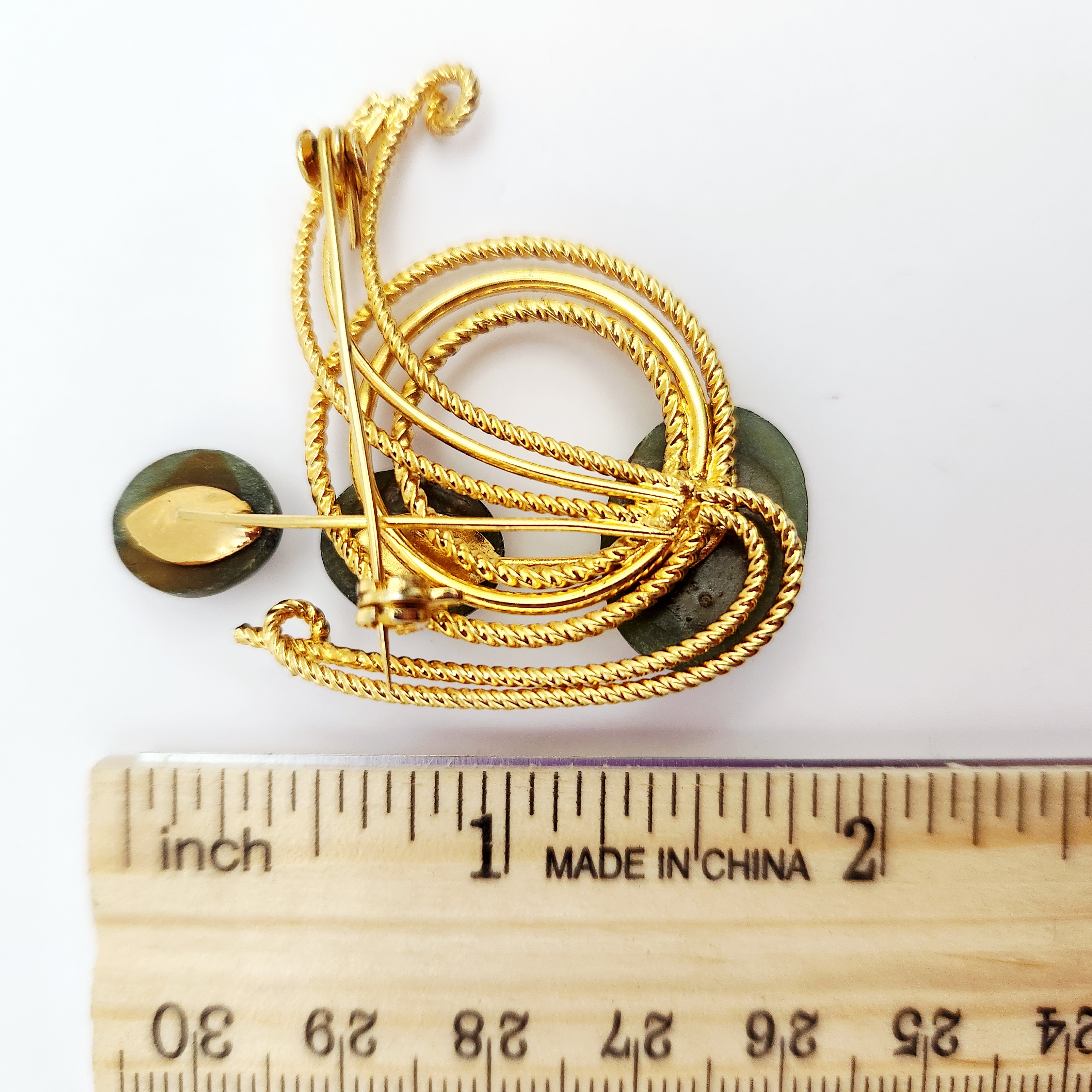 Several gold-toned brooches featuring green stones and faux pearls, including a sailboat marked Swoboda Inc, with sizes ranging from 1.5 to 2.25 inches. Good vintage condition.