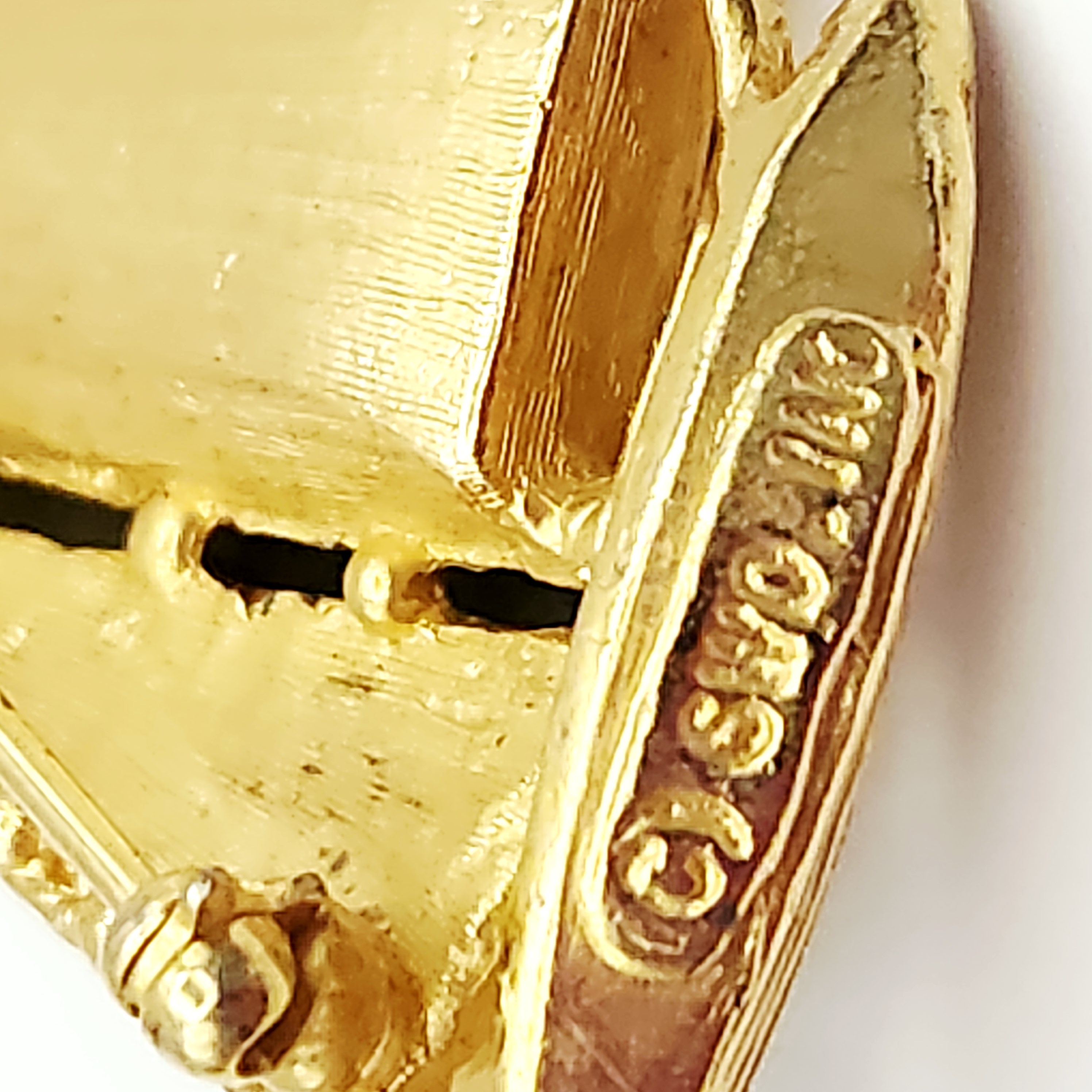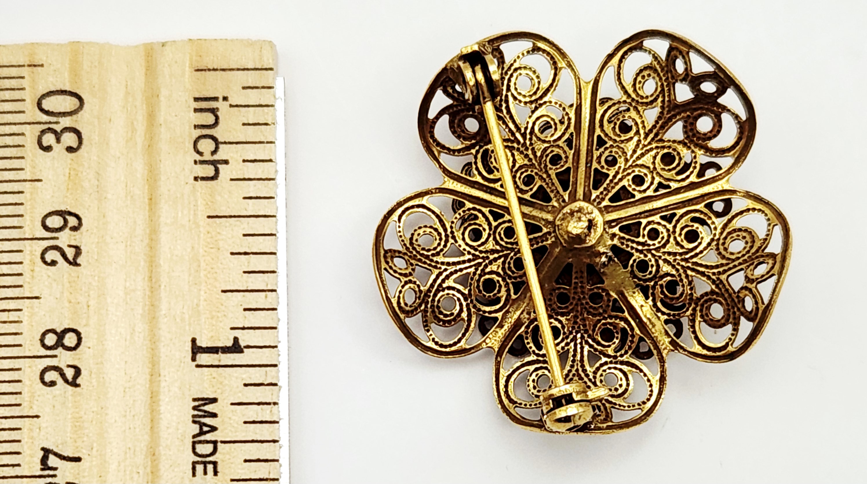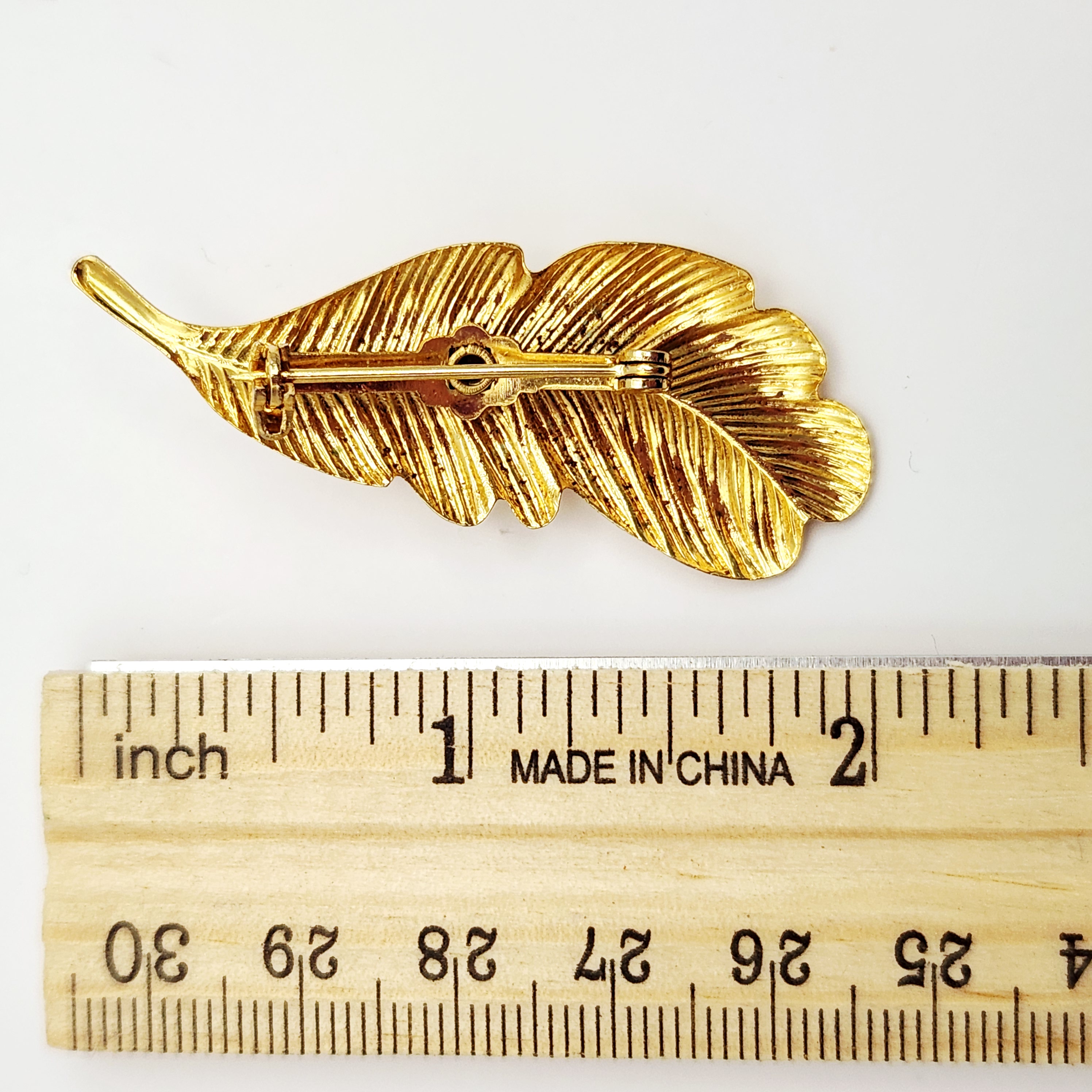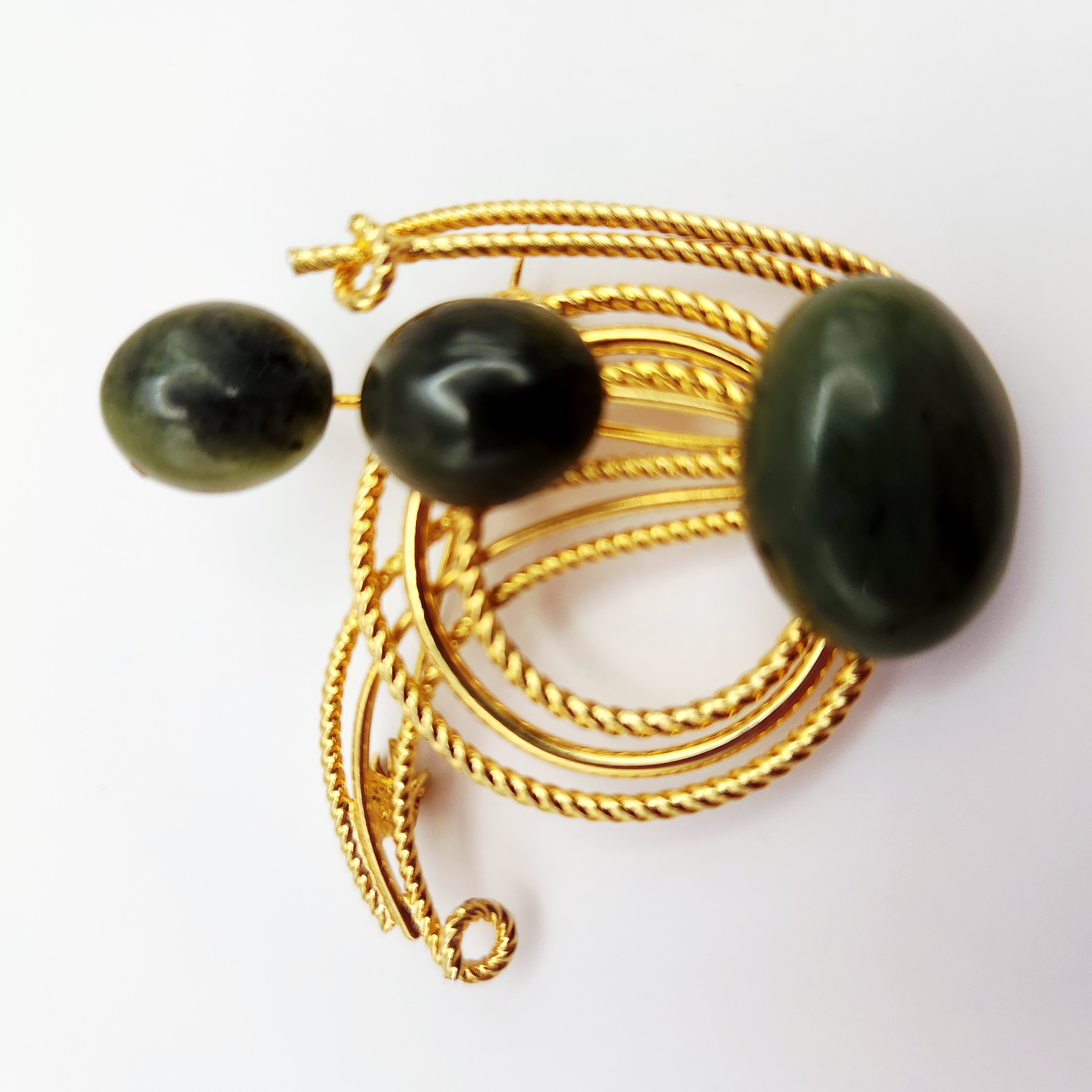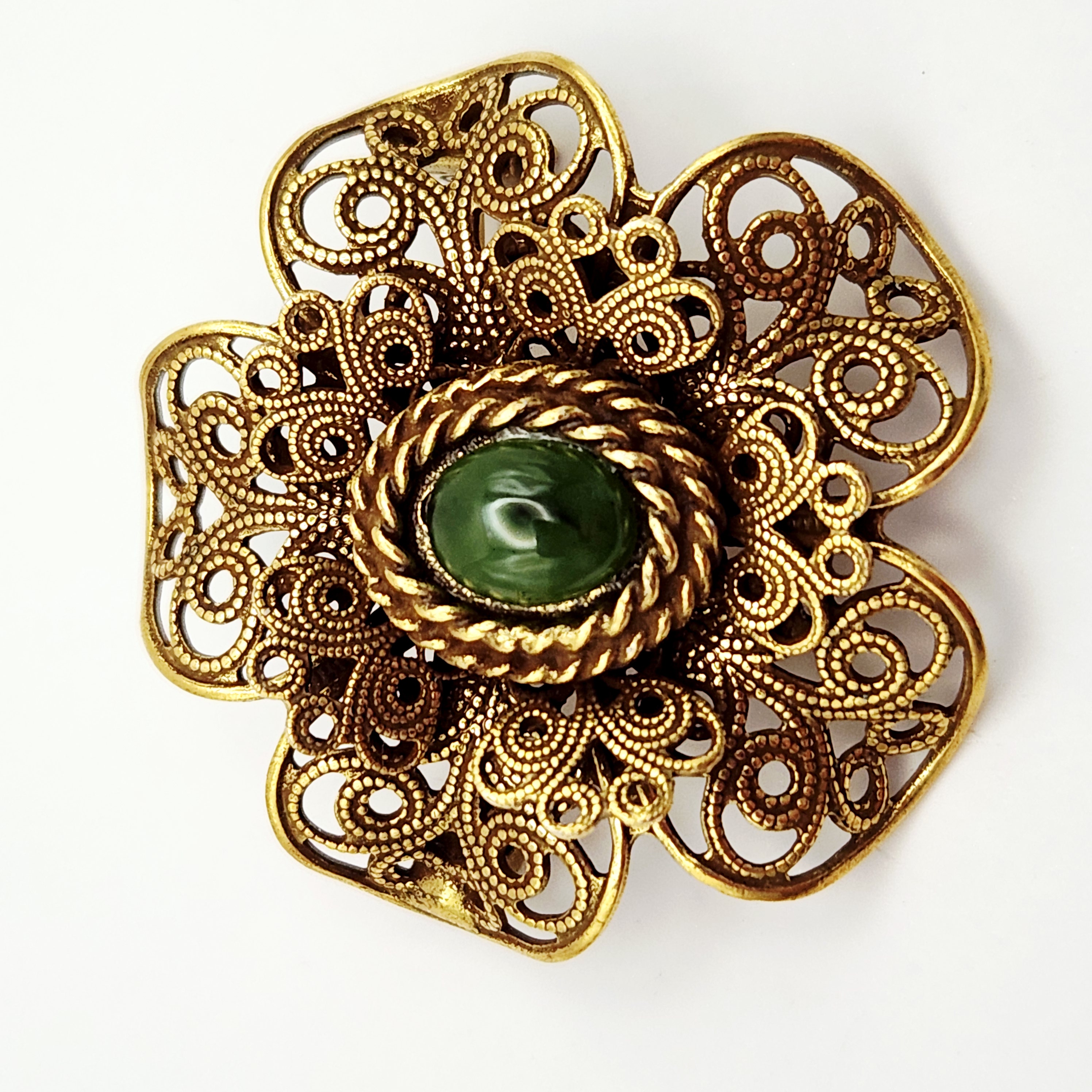Several gold-toned brooches featuring green stones and faux pearls, including a sailboat marked Swoboda Inc, with sizes ranging from 1.5 to 2.25 inches. Good vintage condition.