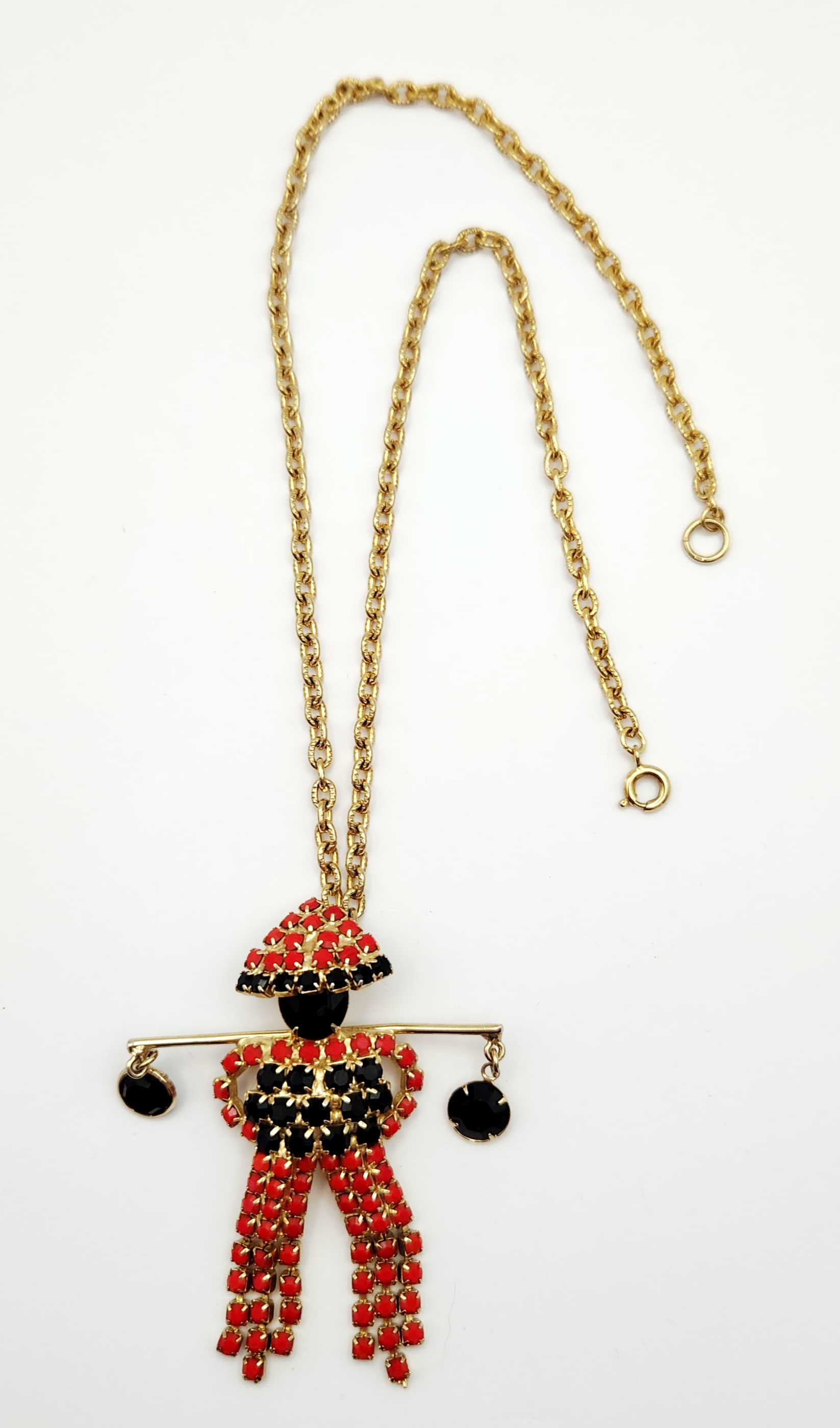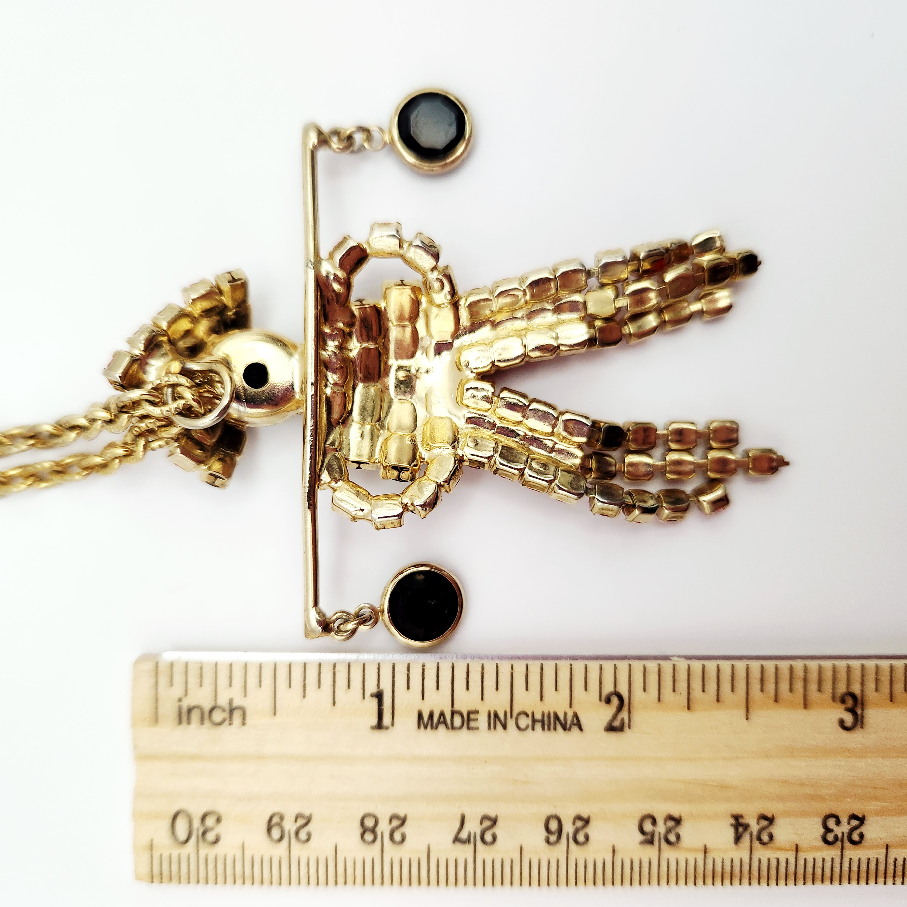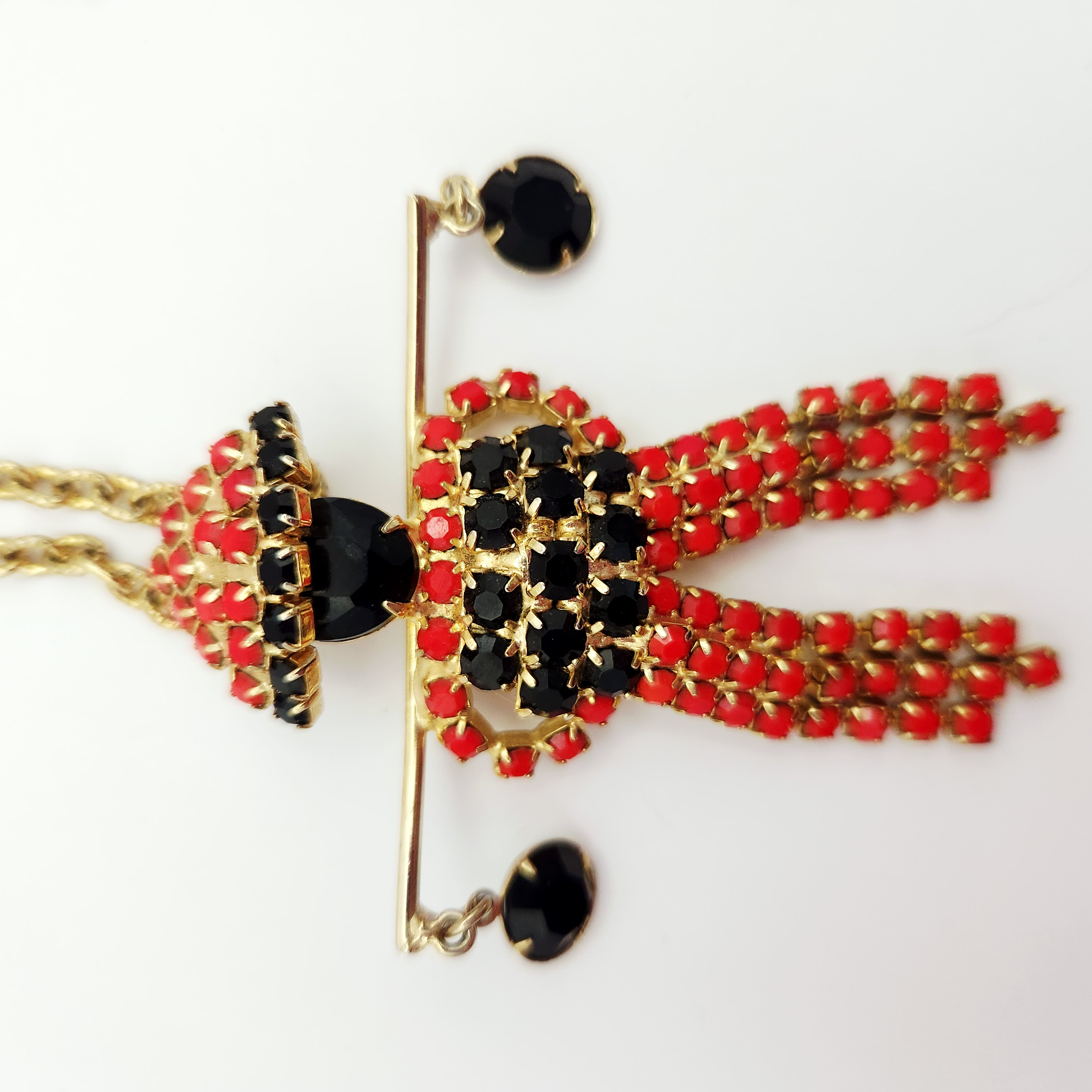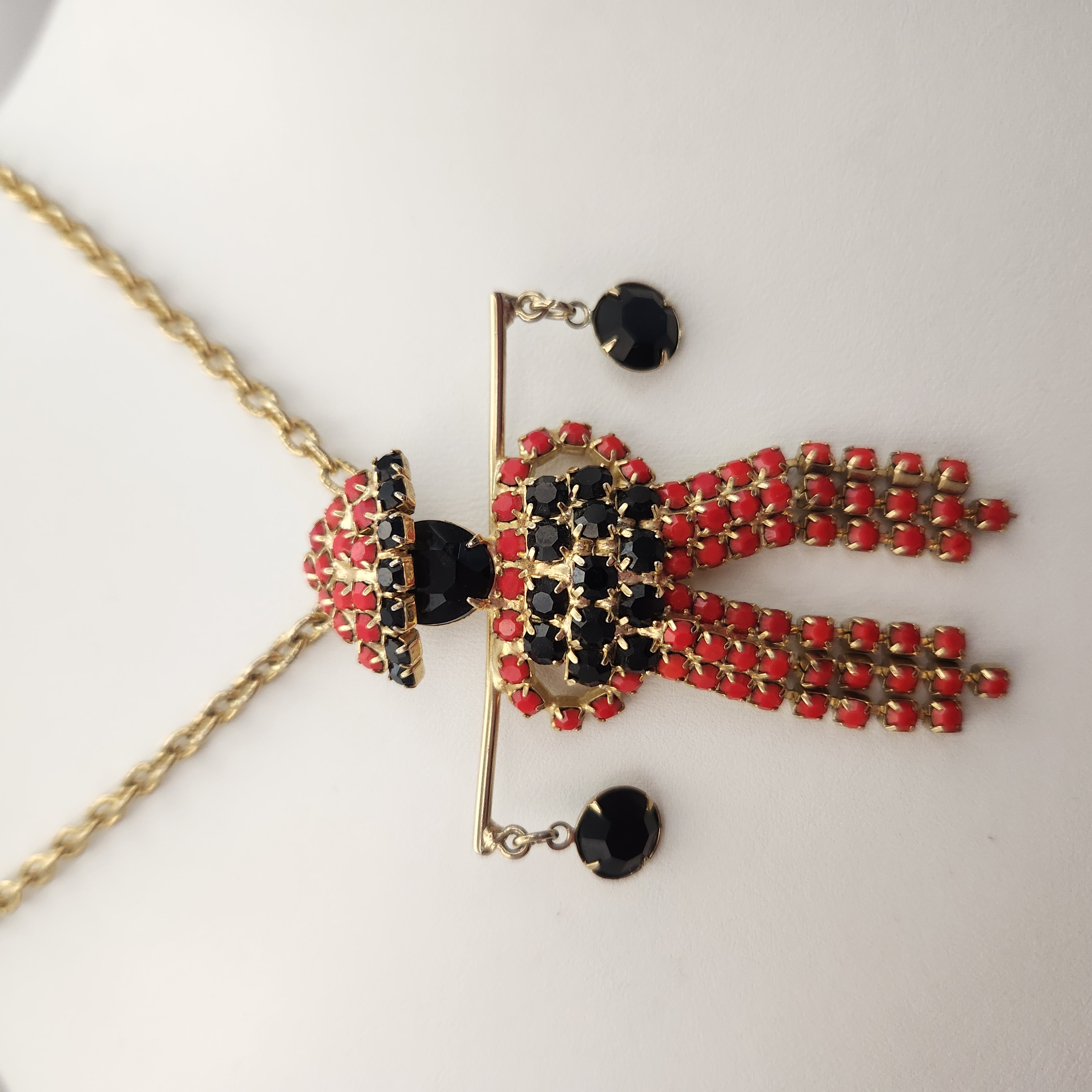 A gold-tone 18-inch necklace featuring a figural pendant set with red and black rhinestones and two dangling black faceted stones, measuring approximately 2 inches wide. Good vintage condition.