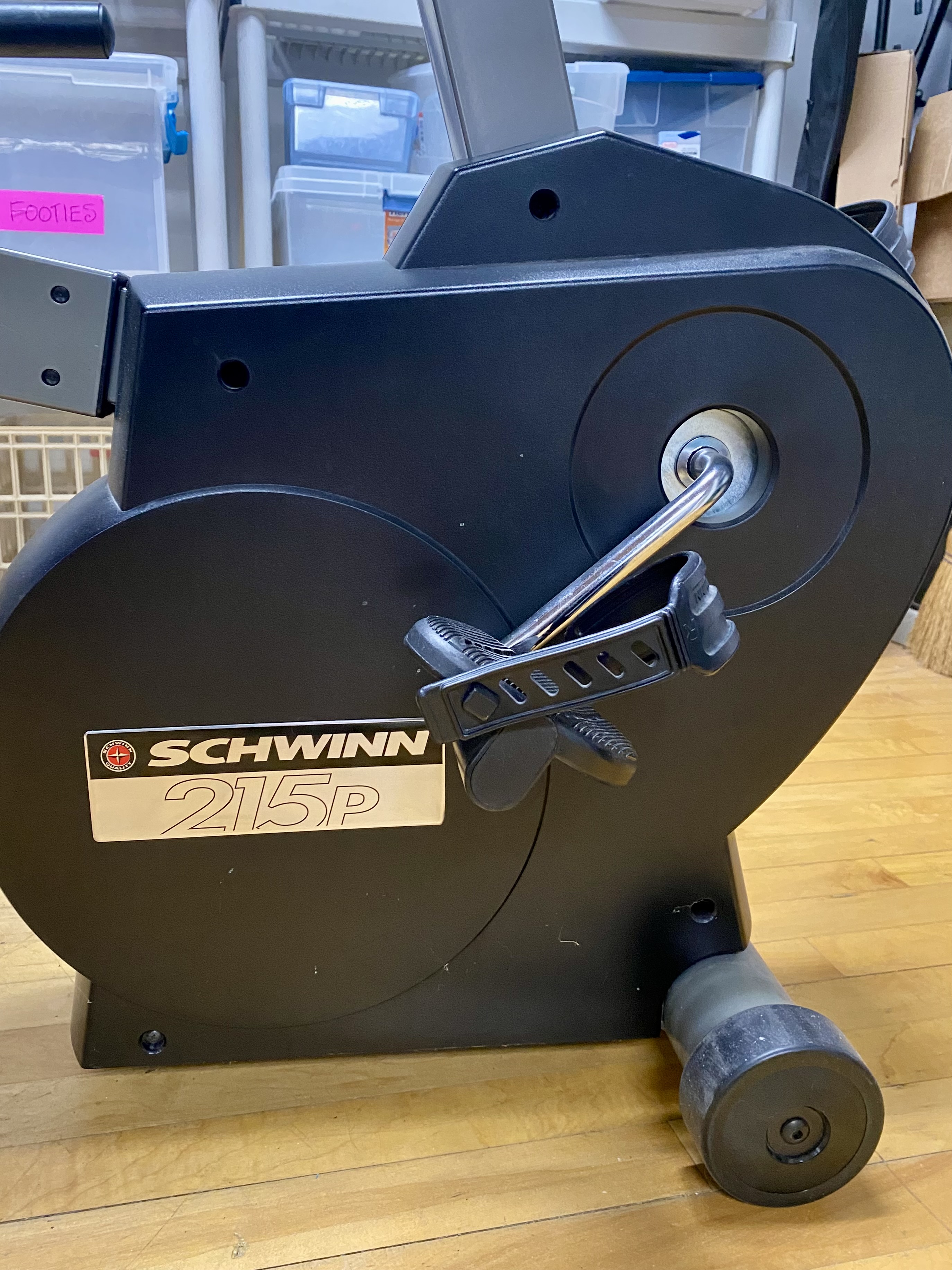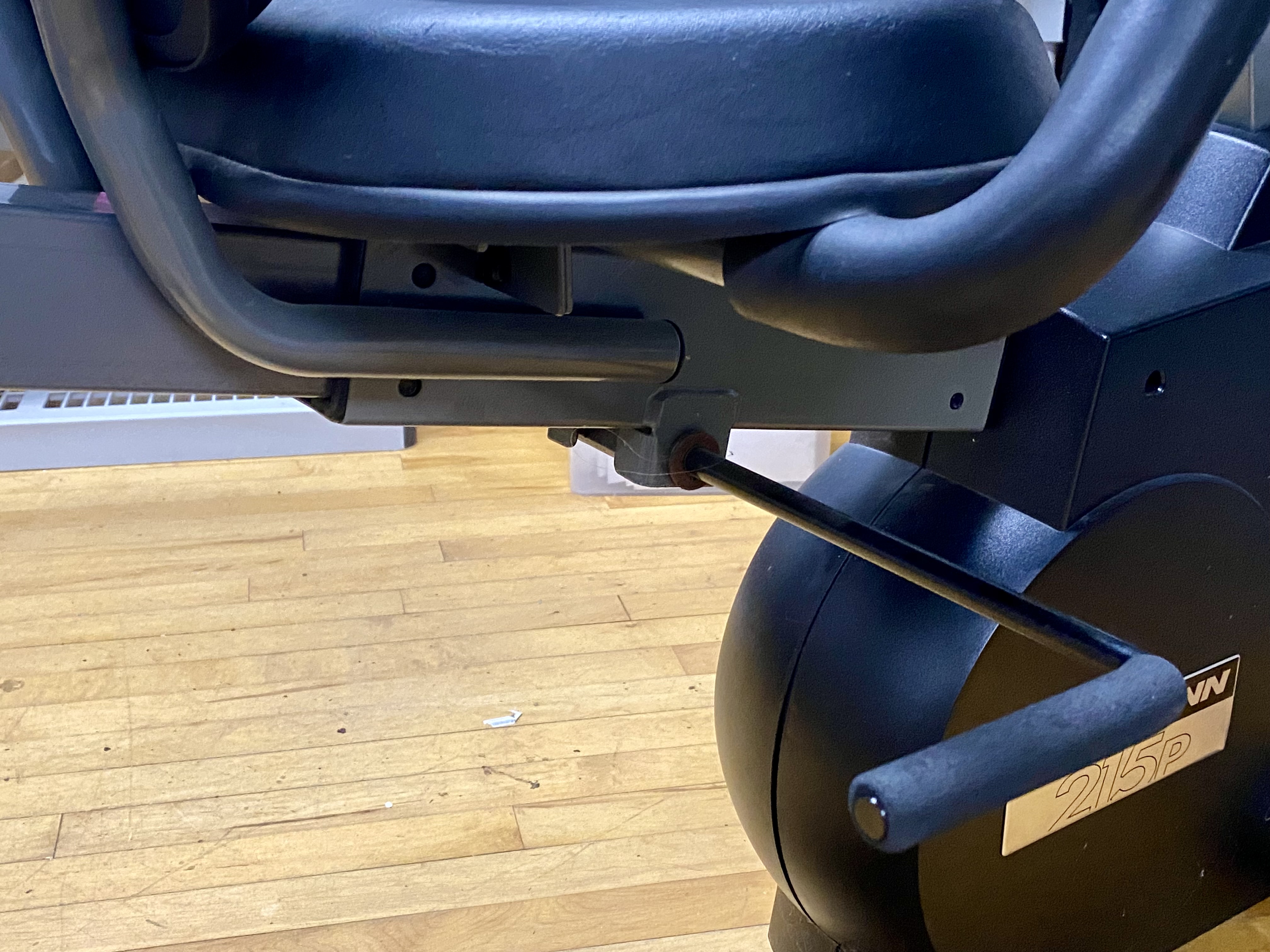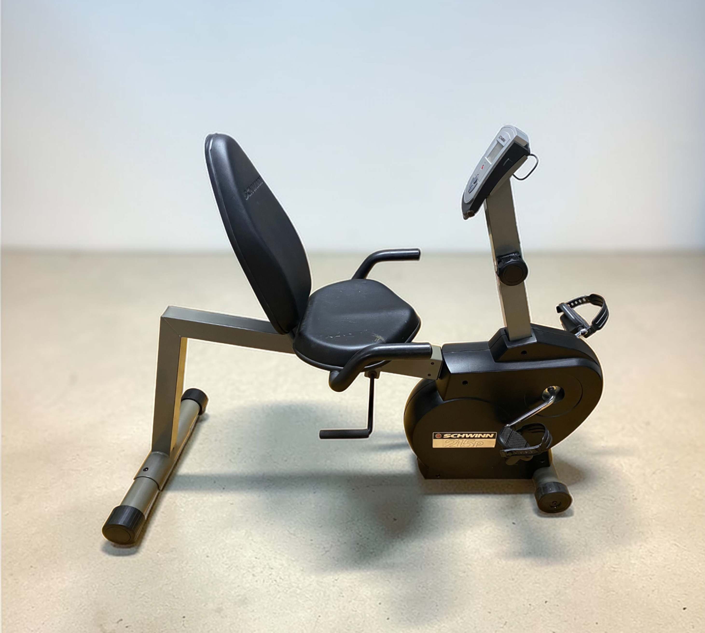 This lot consists of a Schwinn 215P recumbent exercise bike. The unit is constructed with a grey metal frame and a black plastic drive housing. It features a padded black vinyl seat and backrest, with the manufacturer name embossed on the upper portion of the backrest. The bike is equipped with a digital console that includes a display screen for tracking pulse, time, speed, distance, and calories, operated by tactile buttons. A manual tension adjustment knob is mounted on the center post to control resistance. The pedals are fitted with adjustable rubber straps, and the seat assembly includes side-mounted handlebars. Identification is confirmed by a metallic-style sticker on the side of the main housing featuring the manufacturer name and model 215P. Measurement: Base width: approximately 25 inches Seat width: approximately 18 inches. Used. The unit shows visible surface scuffs and scratches on the vinyl seat cushion. Minor oxidation is present on the metal seat adjustment lever. The item is offered loose without original packaging. Digital display may need new batteries.