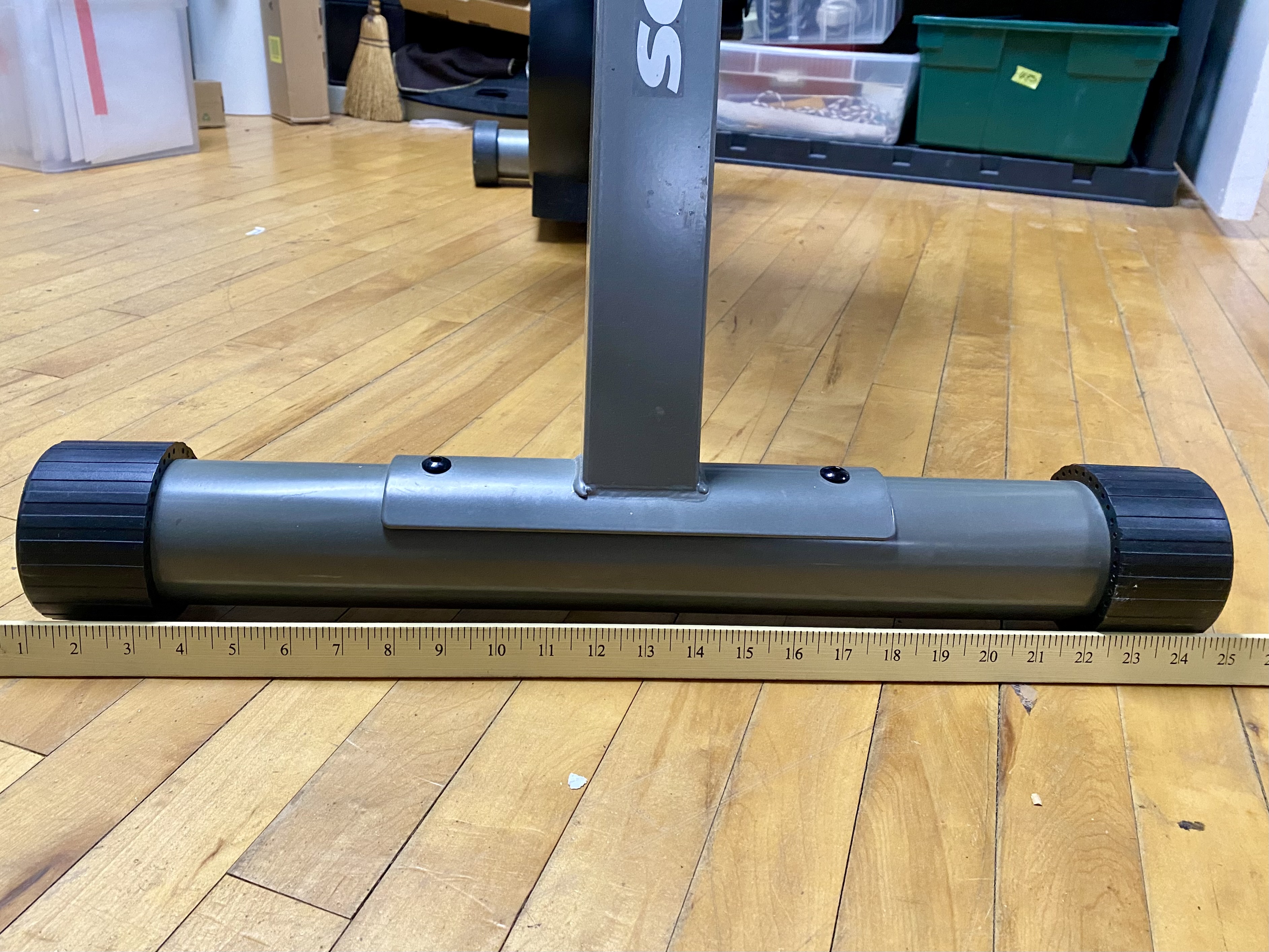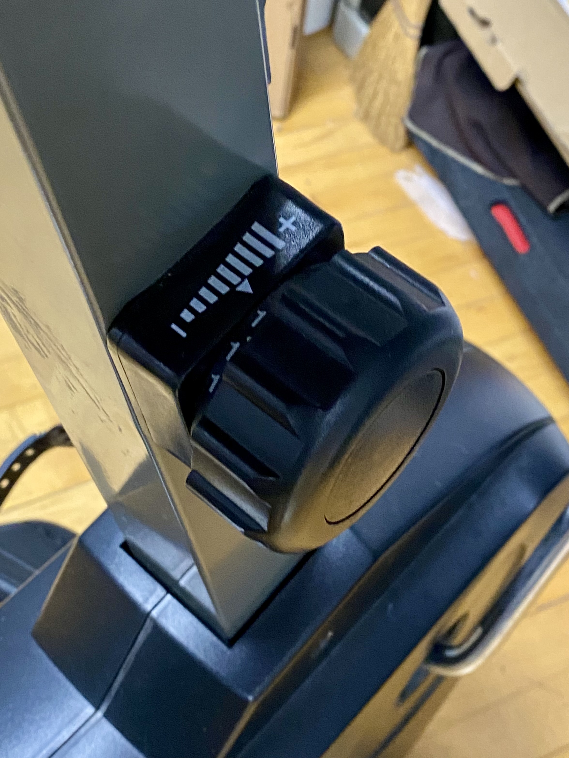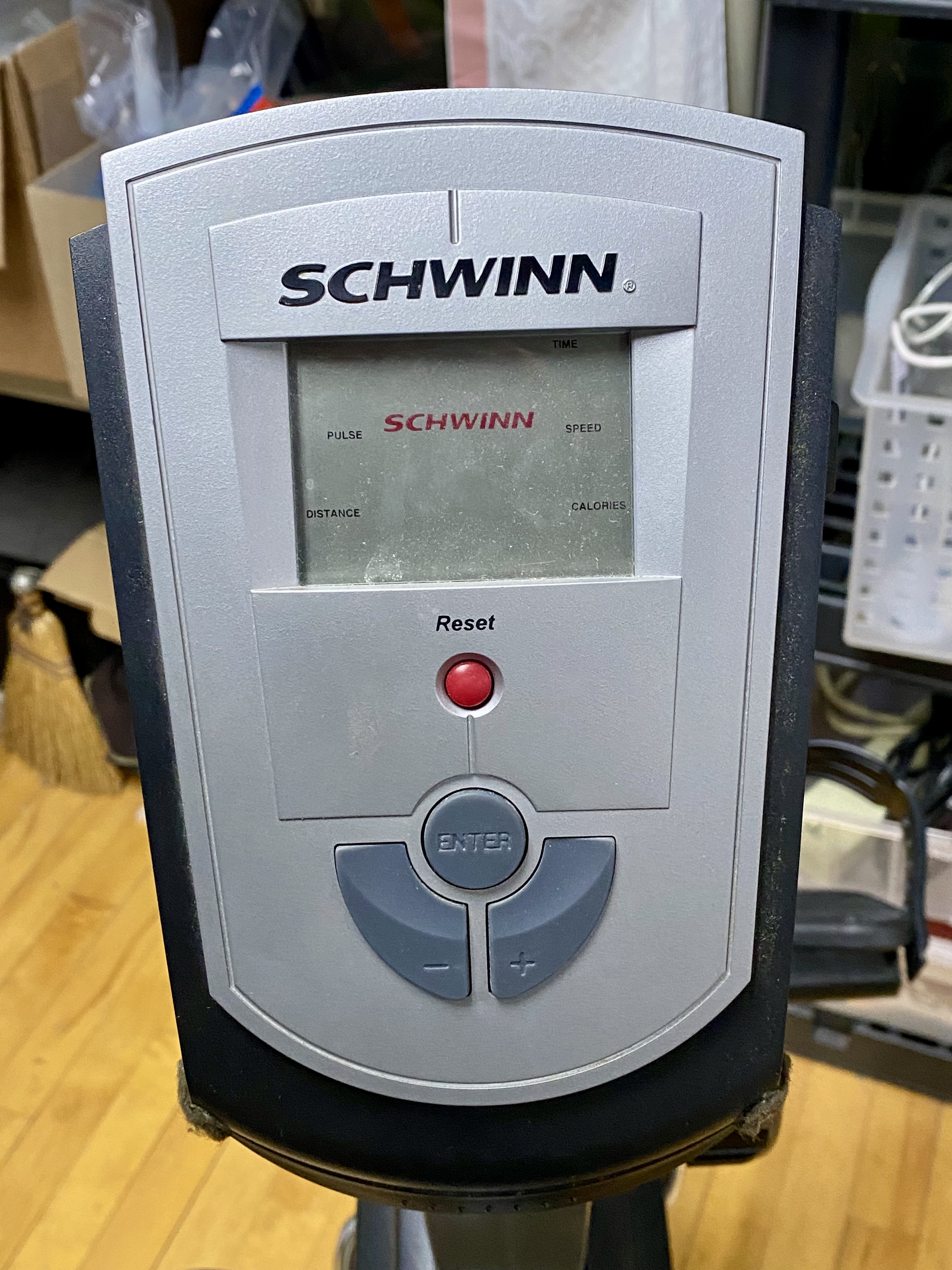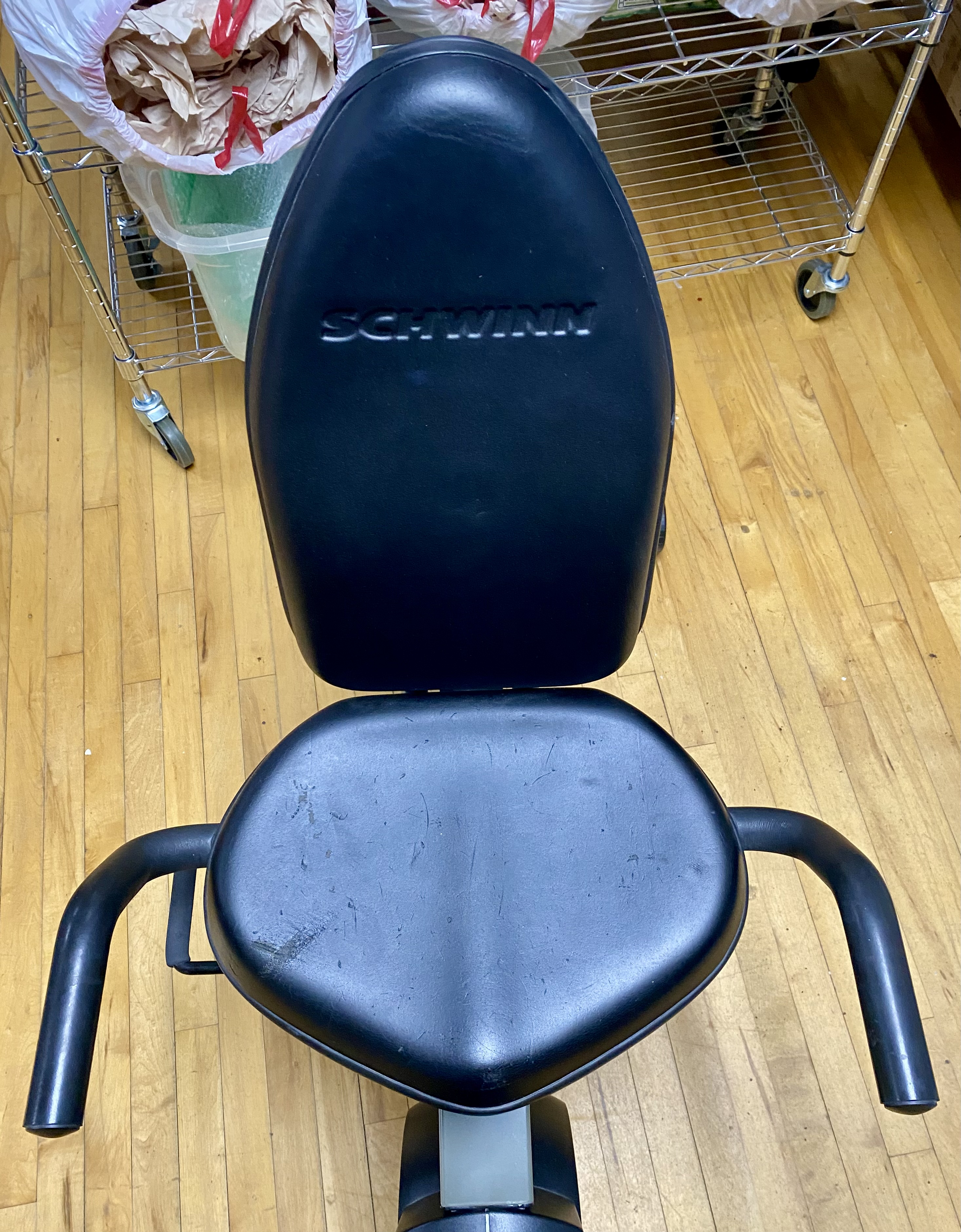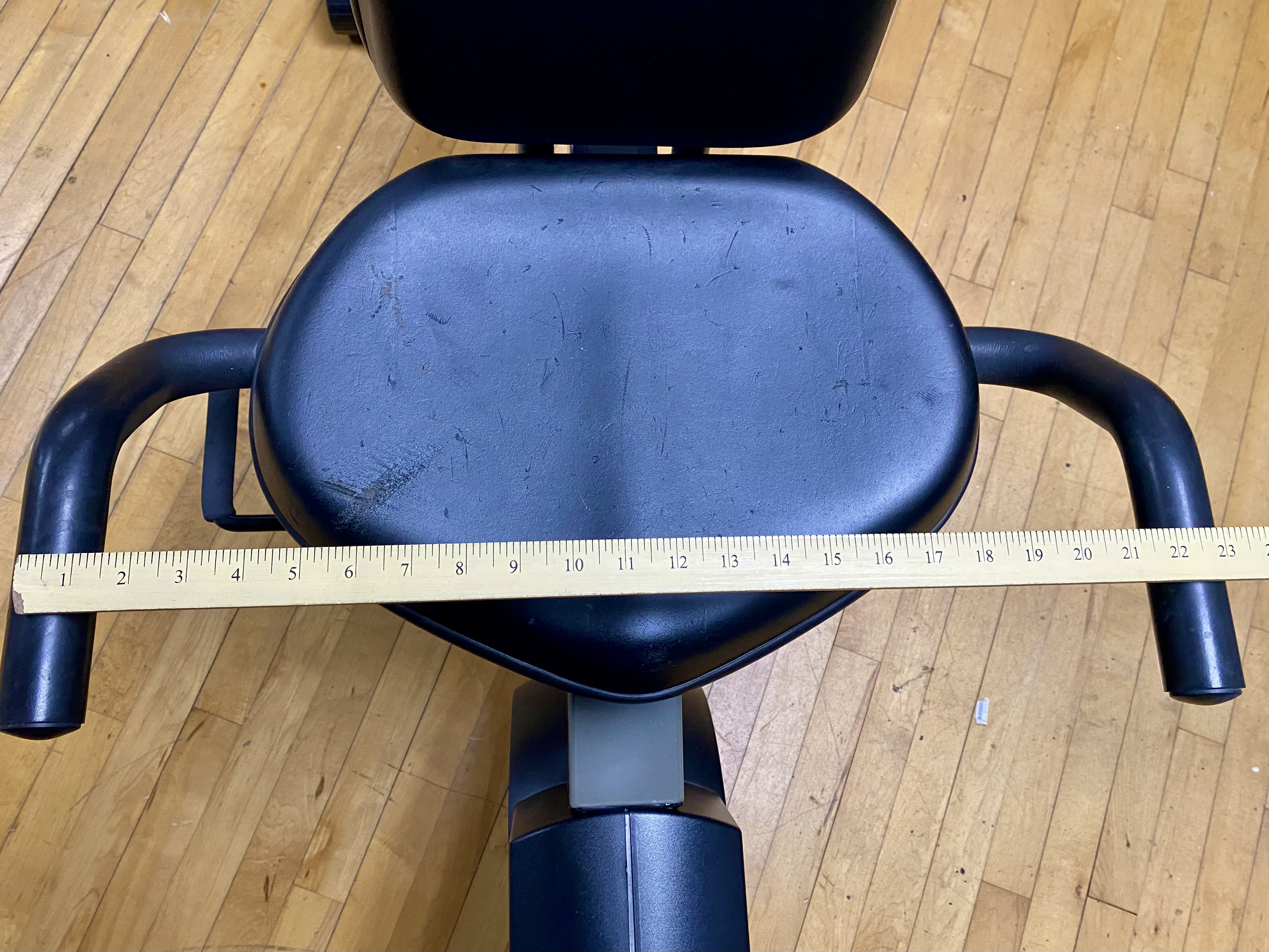 Used. The unit shows visible surface scuffs and scratches on the vinyl seat cushion. Minor oxidation is present on the metal seat adjustment lever. The item is offered loose without original packaging. Digital display may need new batteries.