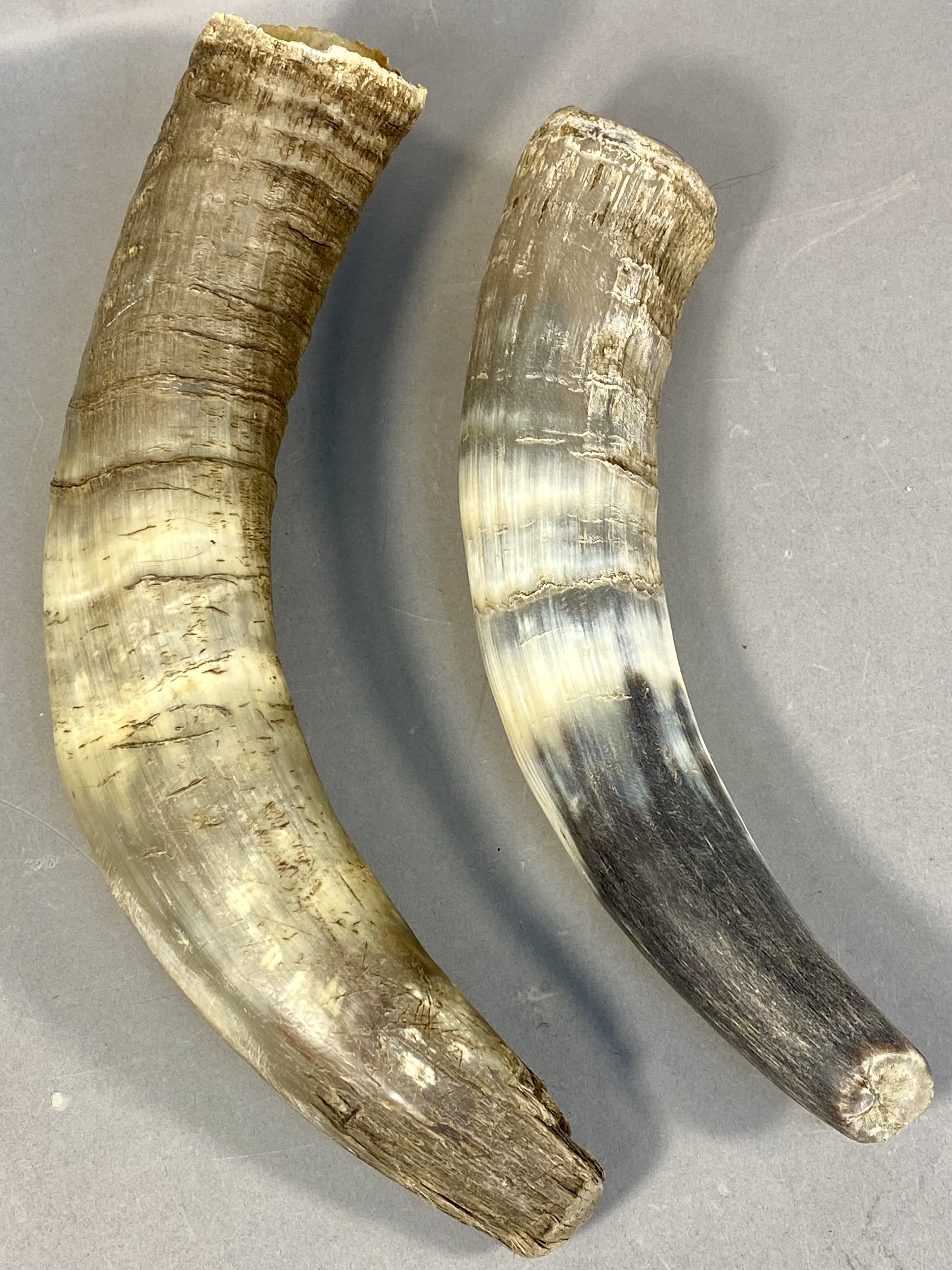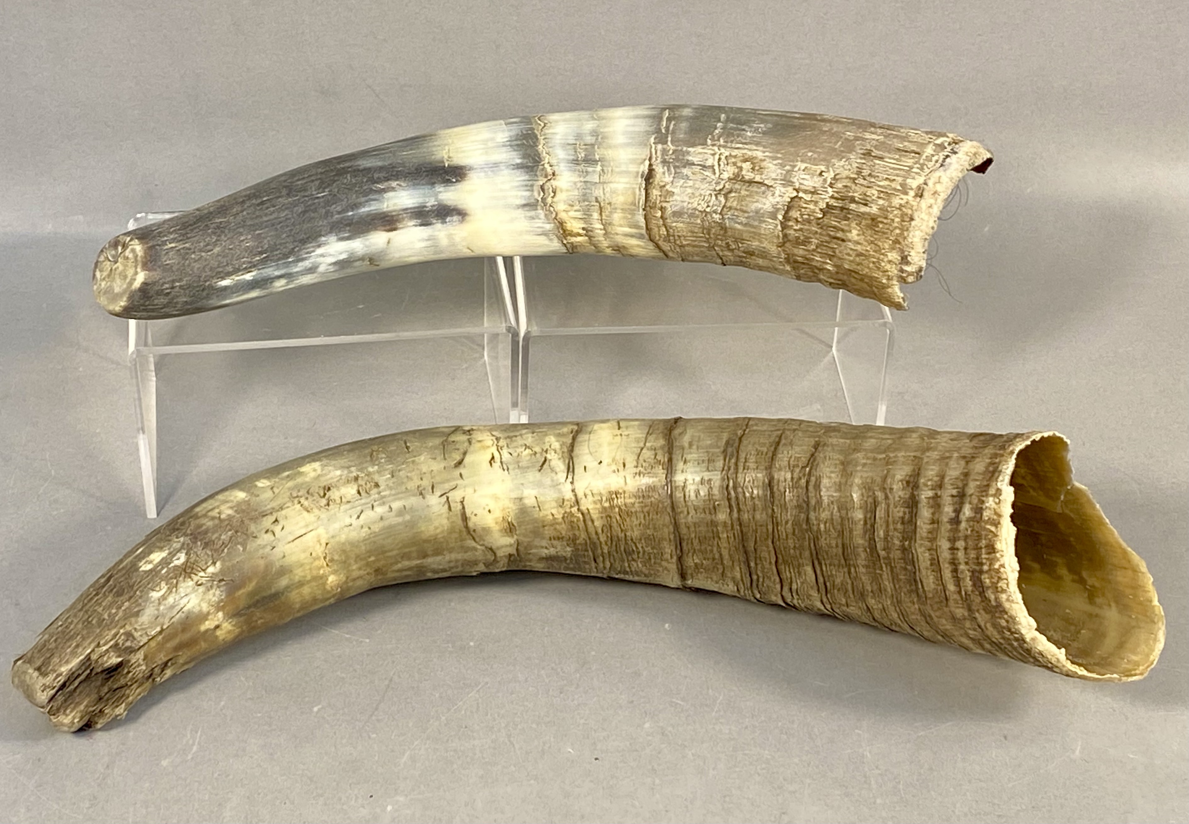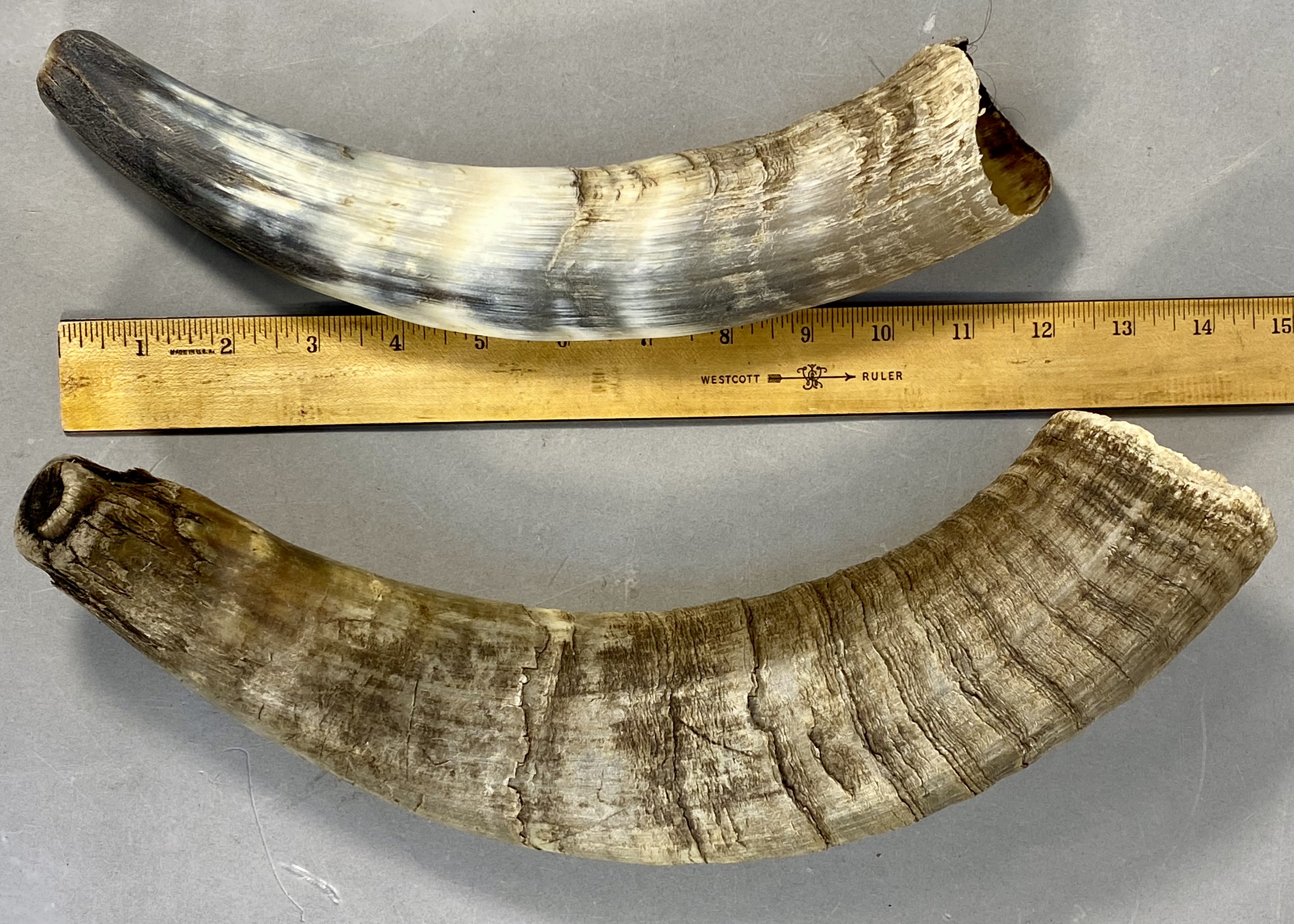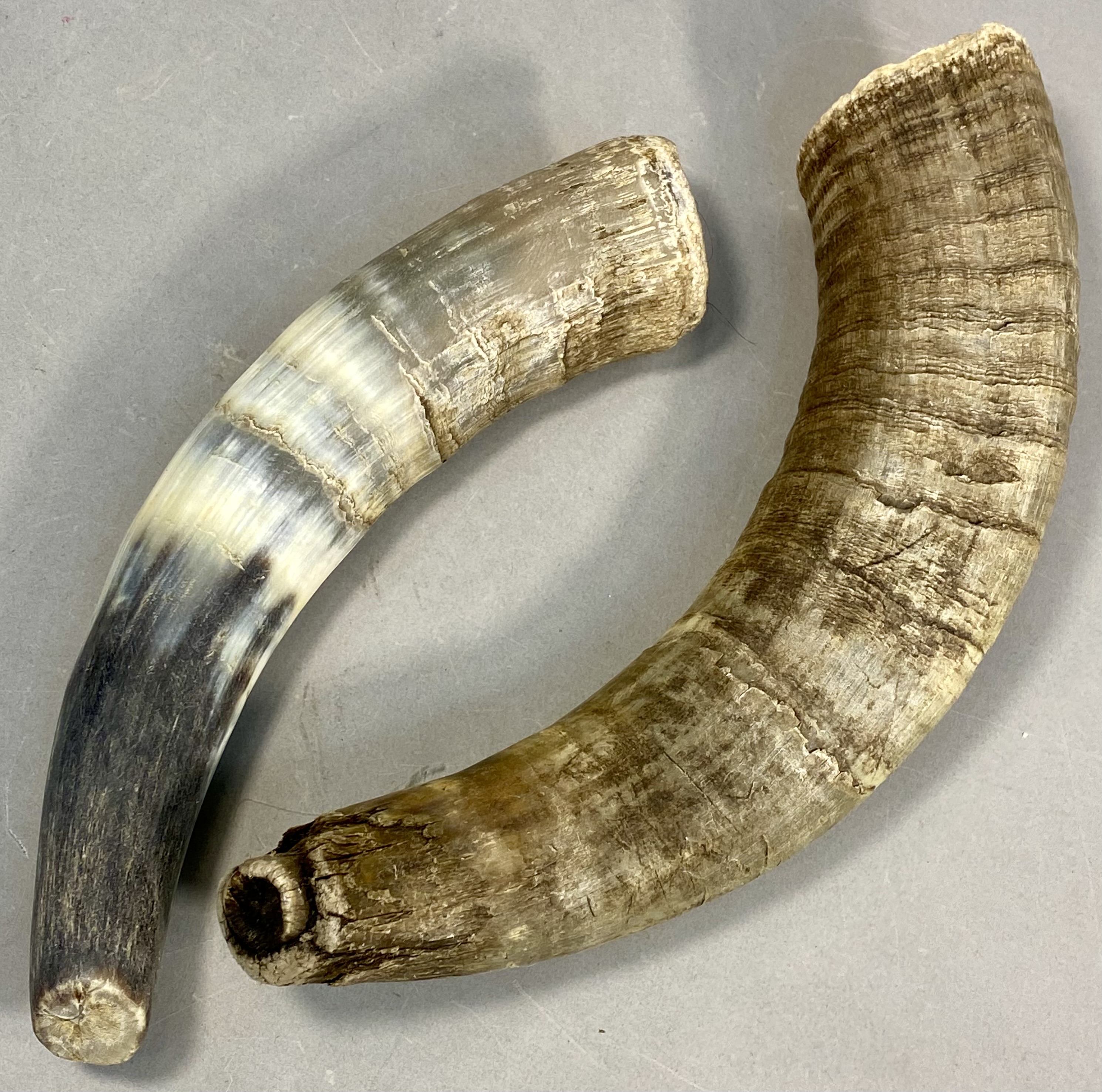 The items are in good condition, showing characteristics consistent with natural aging. The larger horn exhibits longitudinal cracking and splintering, particularly at the tip and along the ridges. The bases of both horns show rough, unfinished edges where they were removed from the animal.