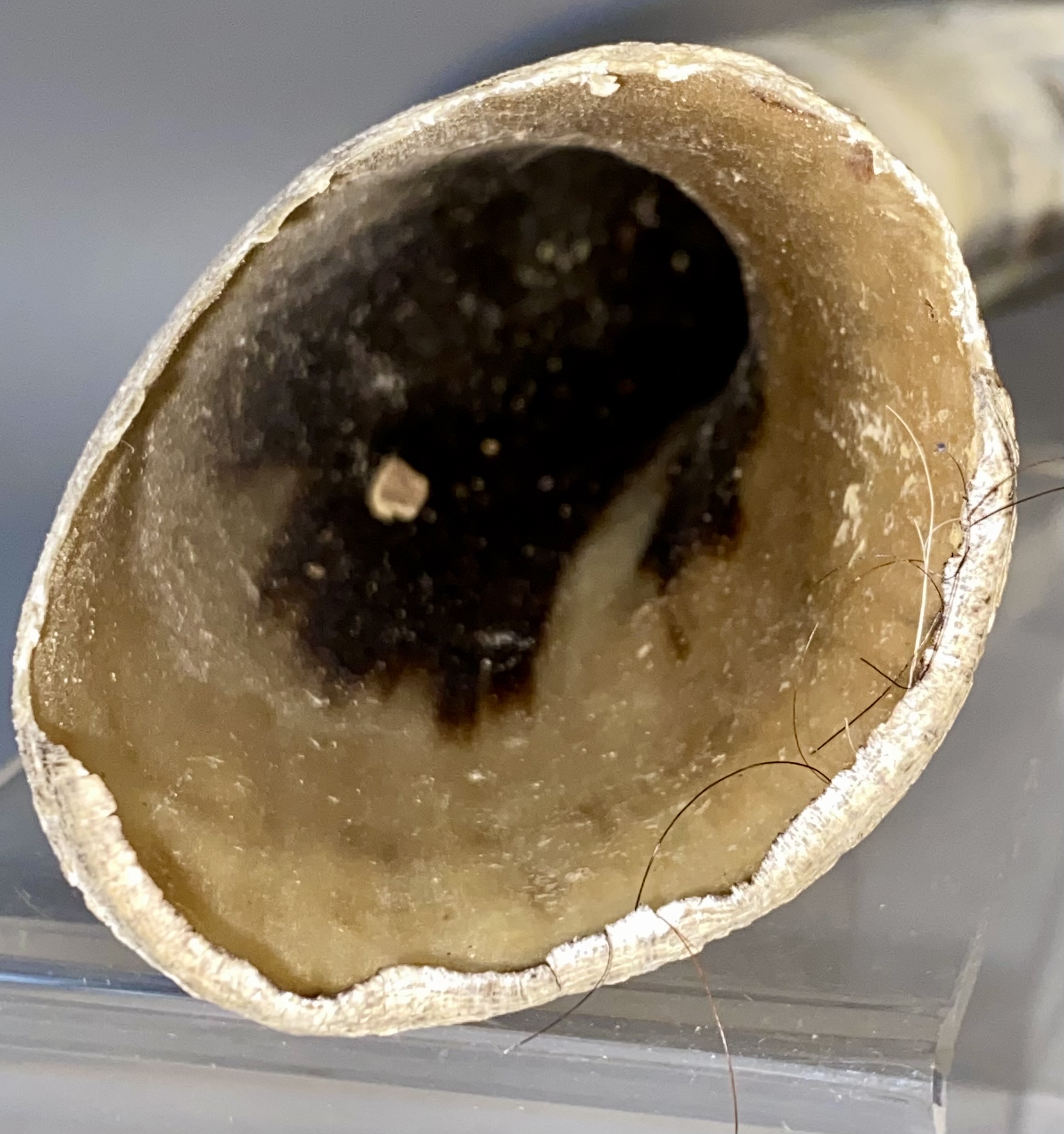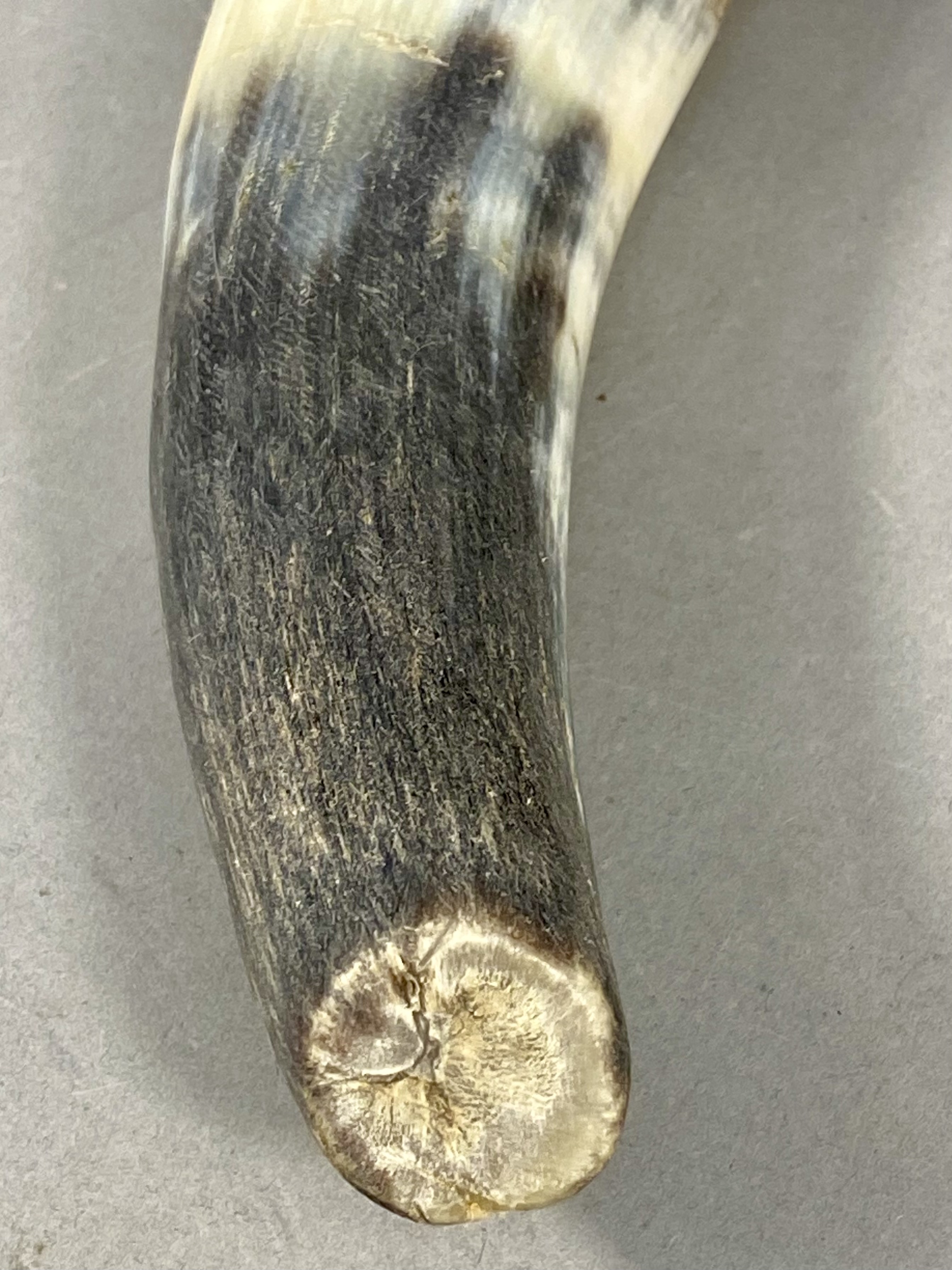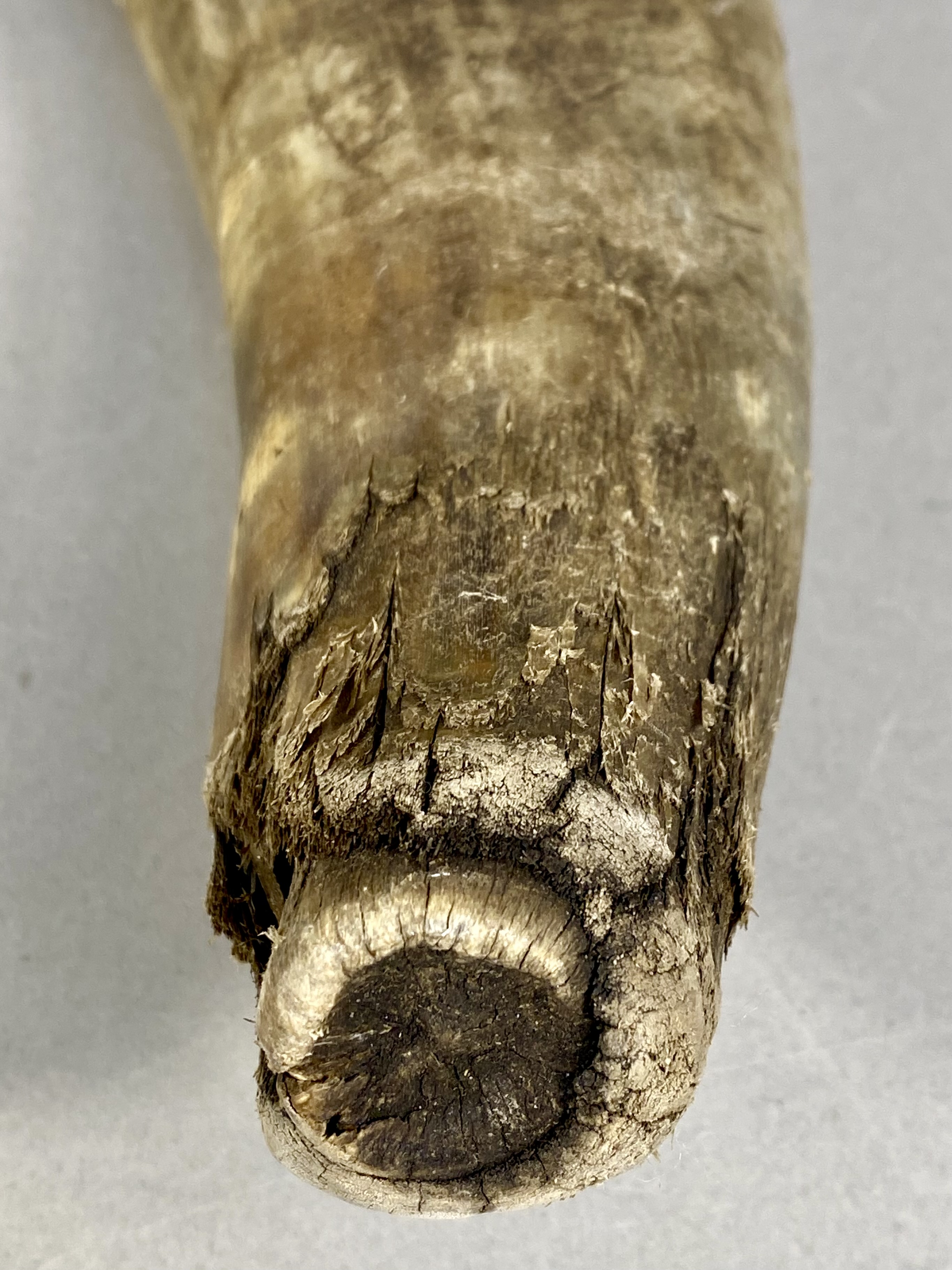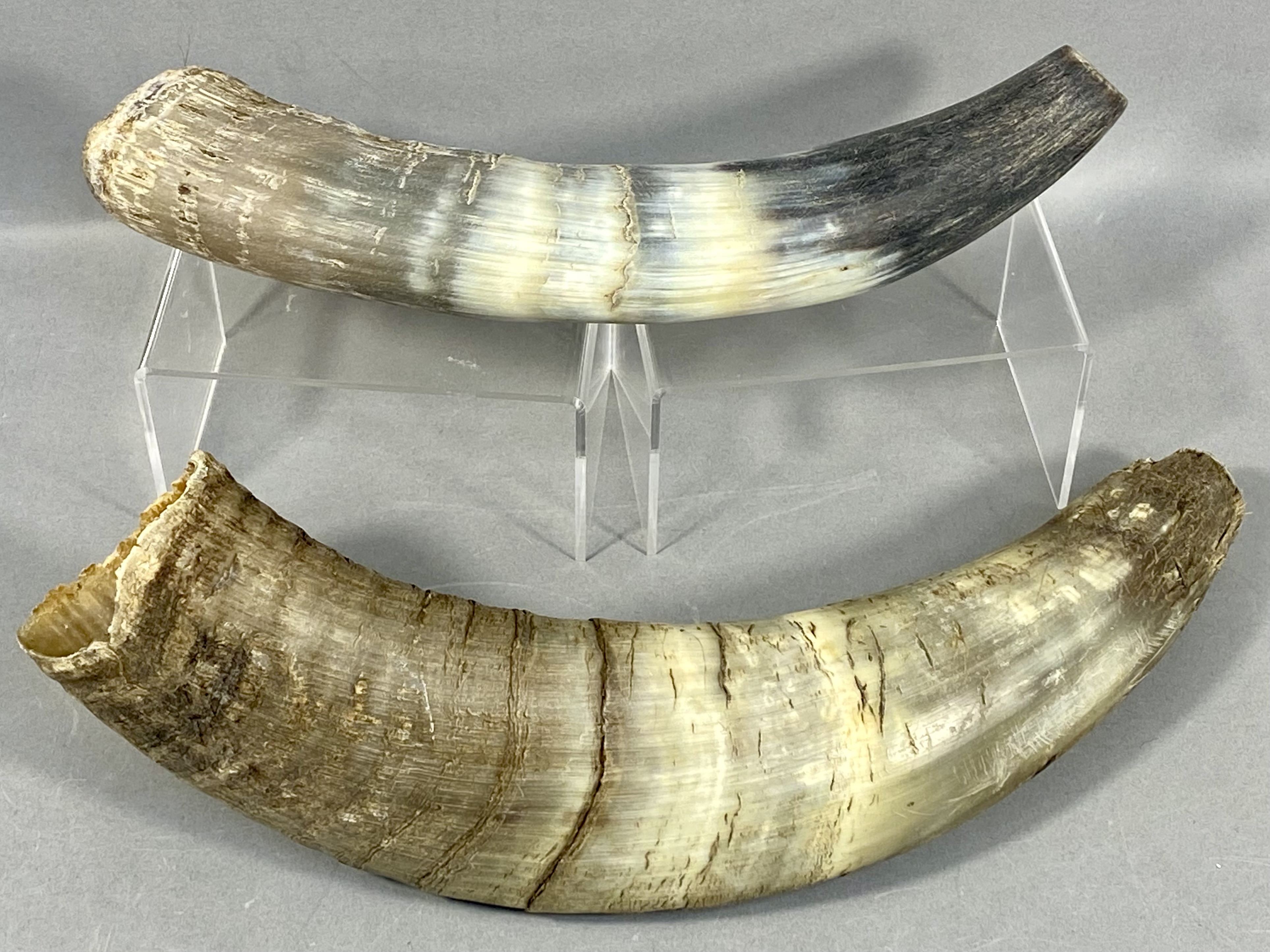 The items are in good condition, showing characteristics consistent with natural aging. The larger horn exhibits longitudinal cracking and splintering, particularly at the tip and along the ridges. The bases of both horns show rough, unfinished edges where they were removed from the animal.