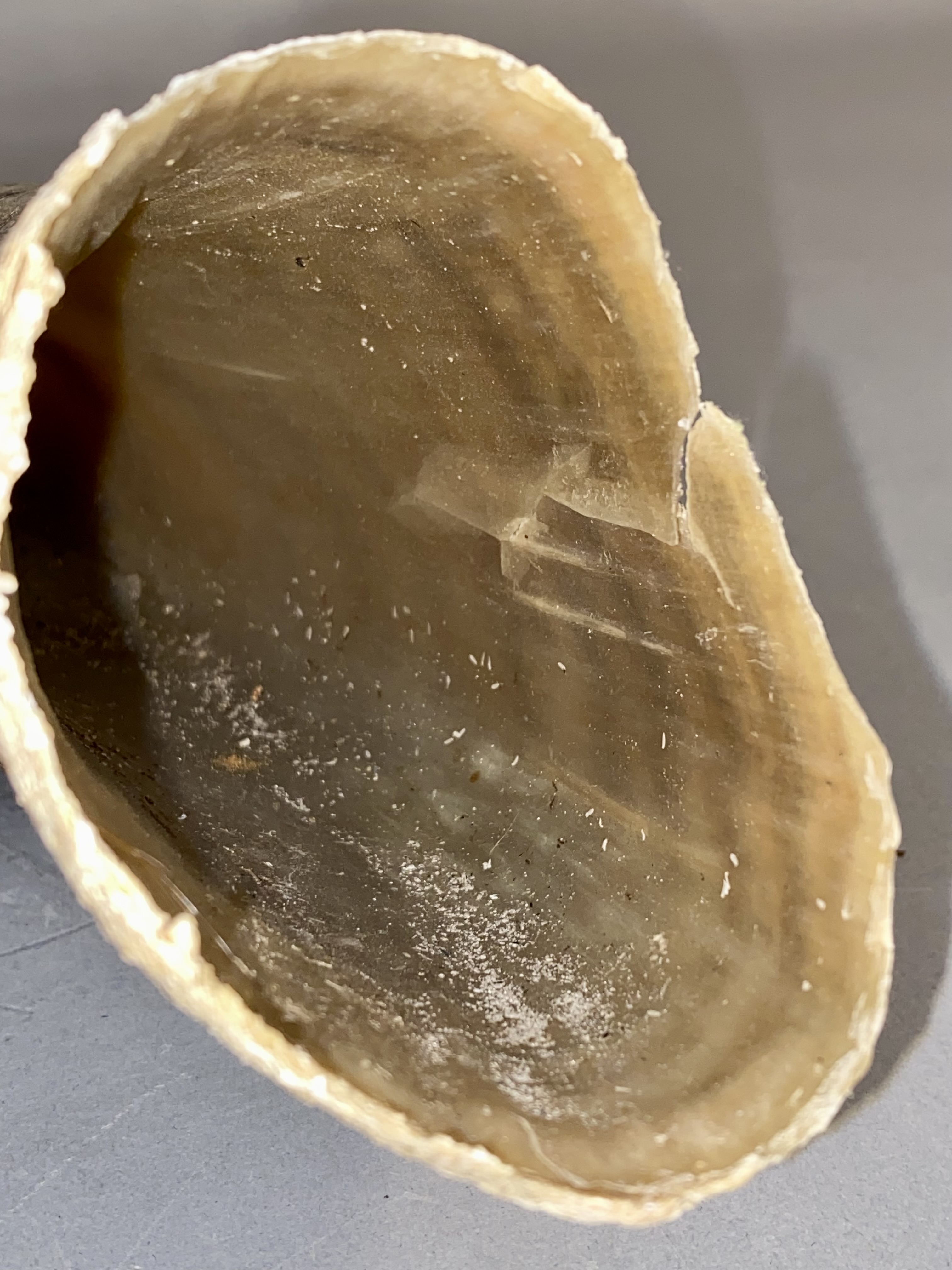 A pair of natural bovine horns, likely from a bull or steer. The smaller horn features a smooth surface with a dark tip transitioning into cream and tan banding toward the base. This specimen retains a small amount of organic hair at the open, hollow base. The larger horn is more robust and exhibits a heavily textured, ridged exterior with a uniform weathered tan and beige coloration. Both specimens are hollowed at the wide ends and show no visible maker marks or inscriptions. Measurements: Larger Horn: Approximately 13 to 14 inches in length along the outer curve Smaller Horn: Approximately 11 to 12 inches in length along the outer curve. The items are in good condition, showing characteristics consistent with natural aging. The larger horn exhibits longitudinal cracking and splintering, particularly at the tip and along the ridges. The bases of both horns show rough, unfinished edges where they were removed from the animal.