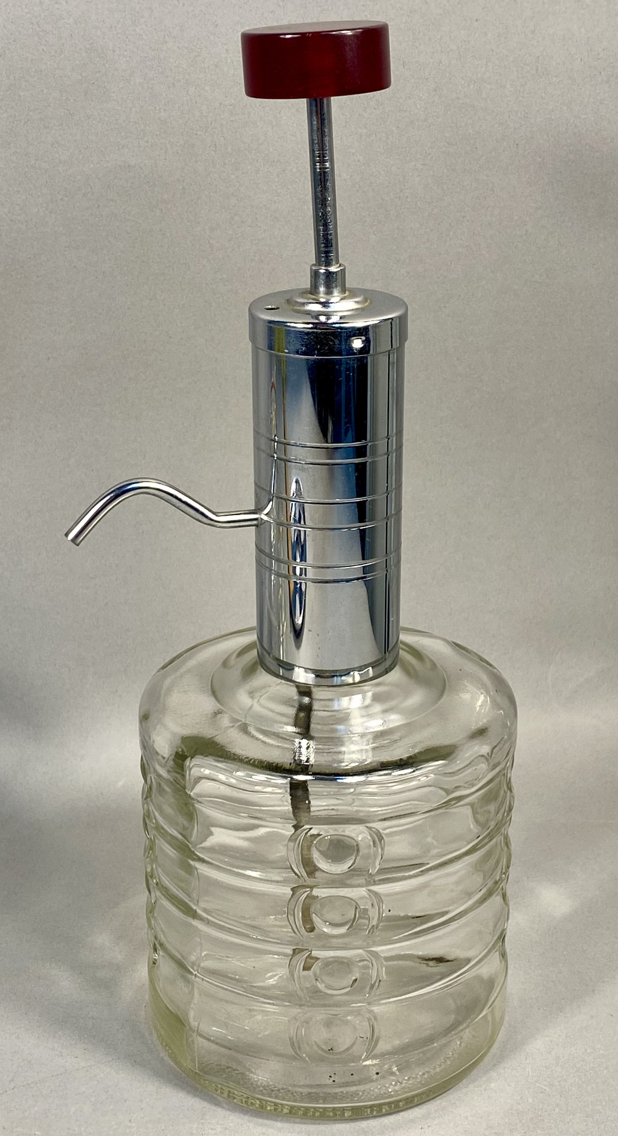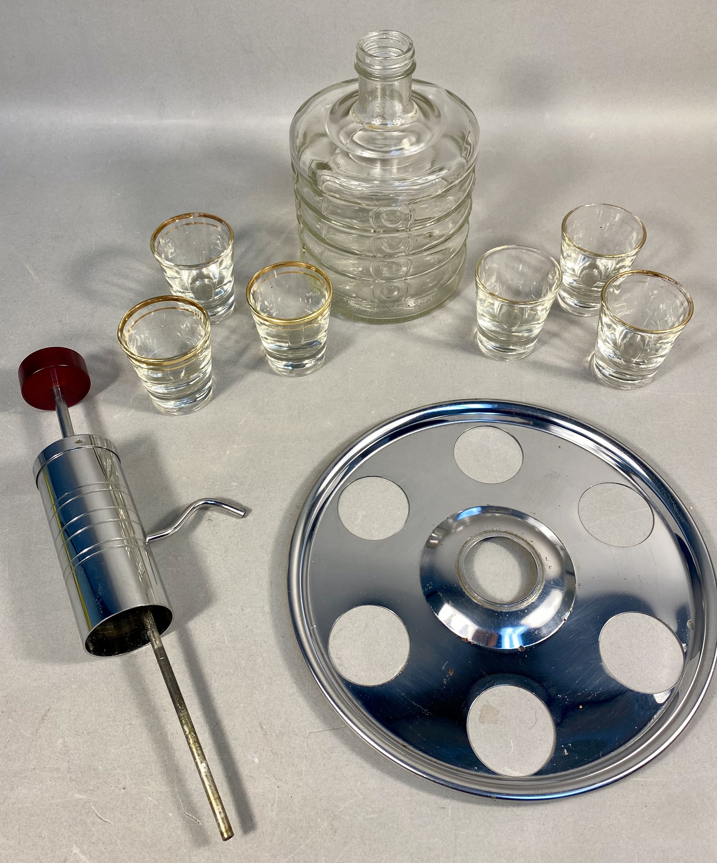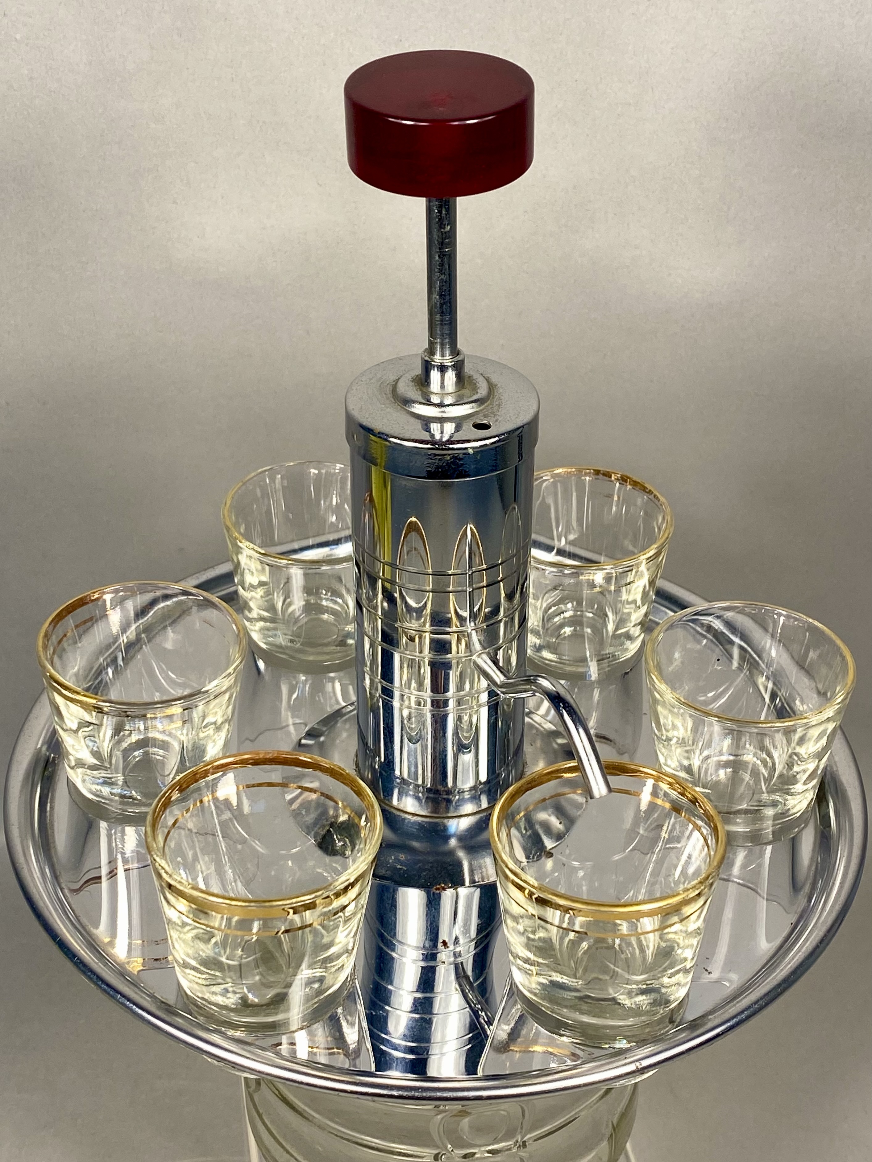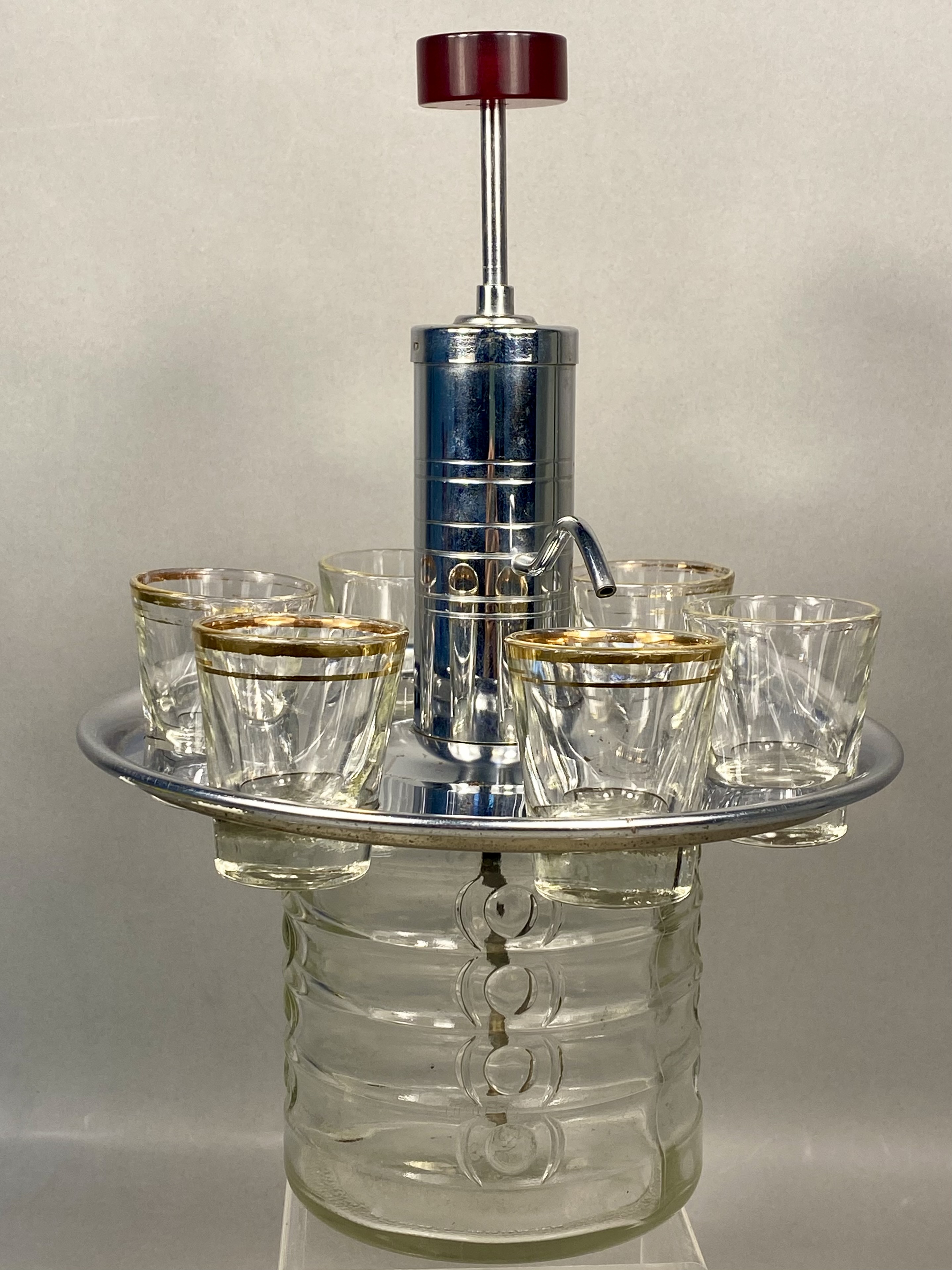This barware set, attributed to Park Sherman, features a clear molded glass decanter produced by the Maryland Glass Corporation. The decanter body is decorated with molded horizontal ribbing and a vertical column of circular motifs. The base of the glass is embossed with the Maryland Glass Corporation mark, consisting of the letter M inside a circle above the numeral 2. The set includes a chrome-plated metal pump-action dispenser mechanism topped with a circular red resin handle. A matching circular chrome-plated metal tray serves as a carousel, featuring a central opening for the decanter and circular cutouts for the accompanying glassware. The set is completed by several clear glass shot glasses, some of which feature gold-toned bands at the rims. Measurements: Decanter height: 6 inches (excluding pump mechanism) Tray diameter: 8.5 inches. The set is in good vintage condition. The metal components show minor surface wear and light oxidation consistent with age. The glass elements are free of visible chips or cracks. There is noticeable wear and thinning to the gold-toned rim decoration on several of the shot glasses.