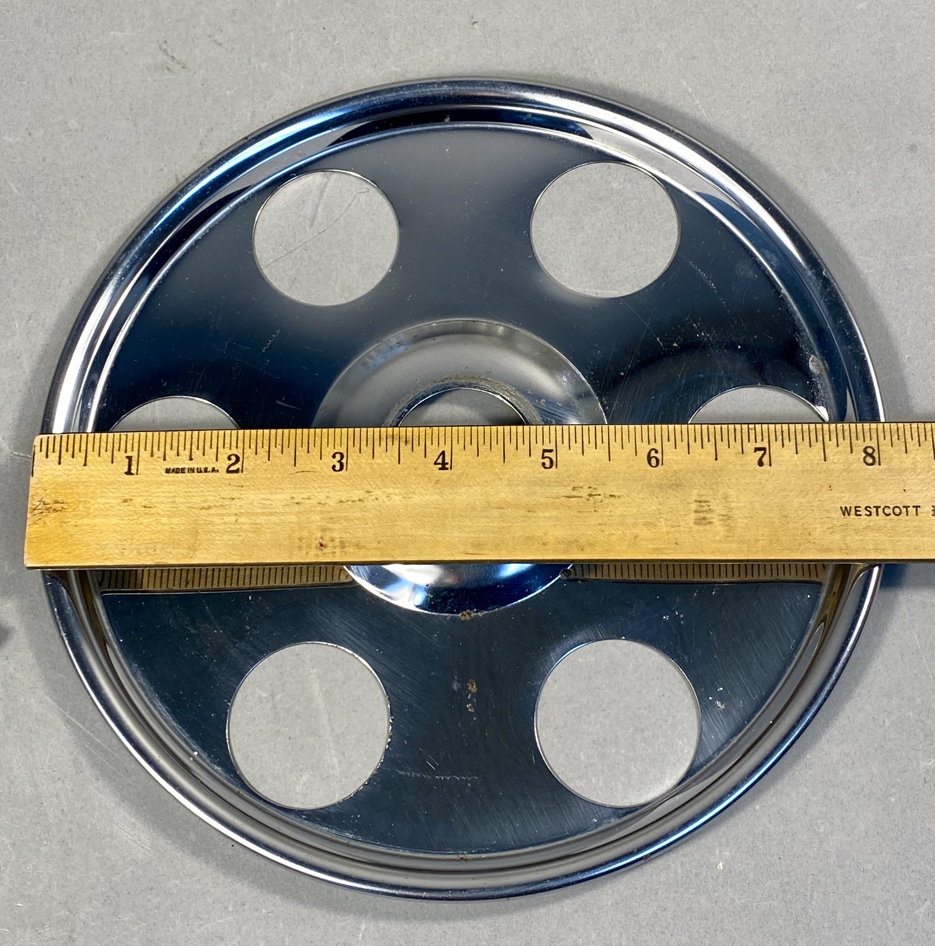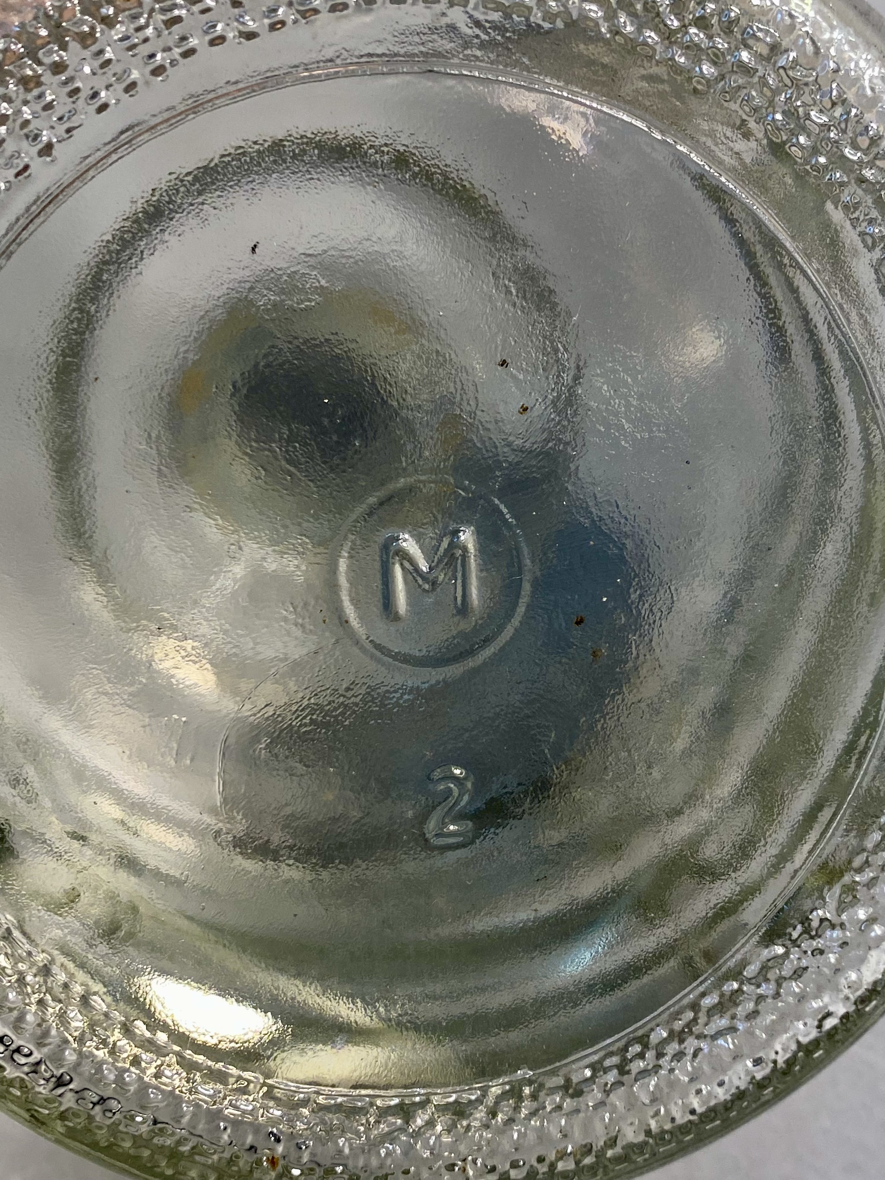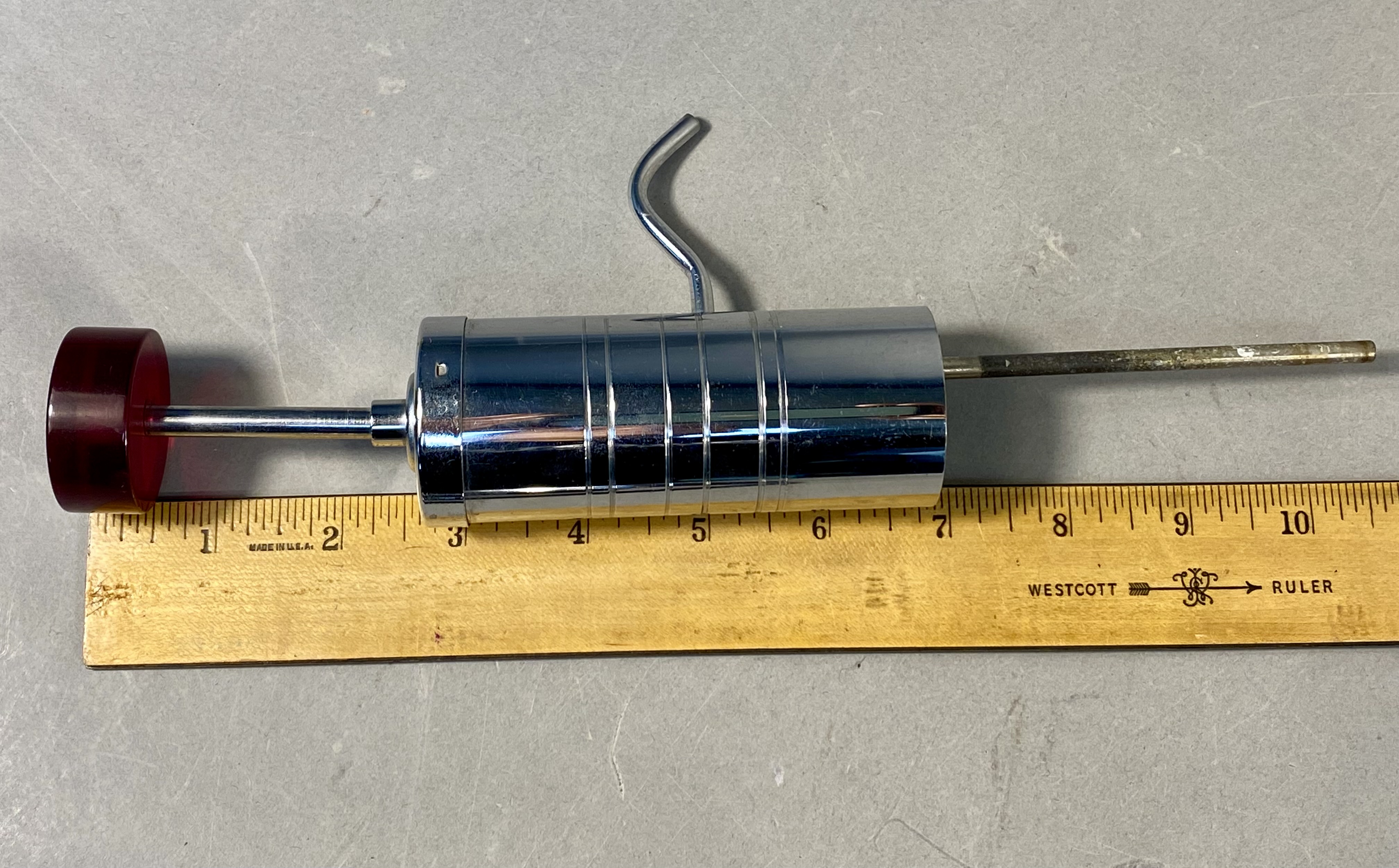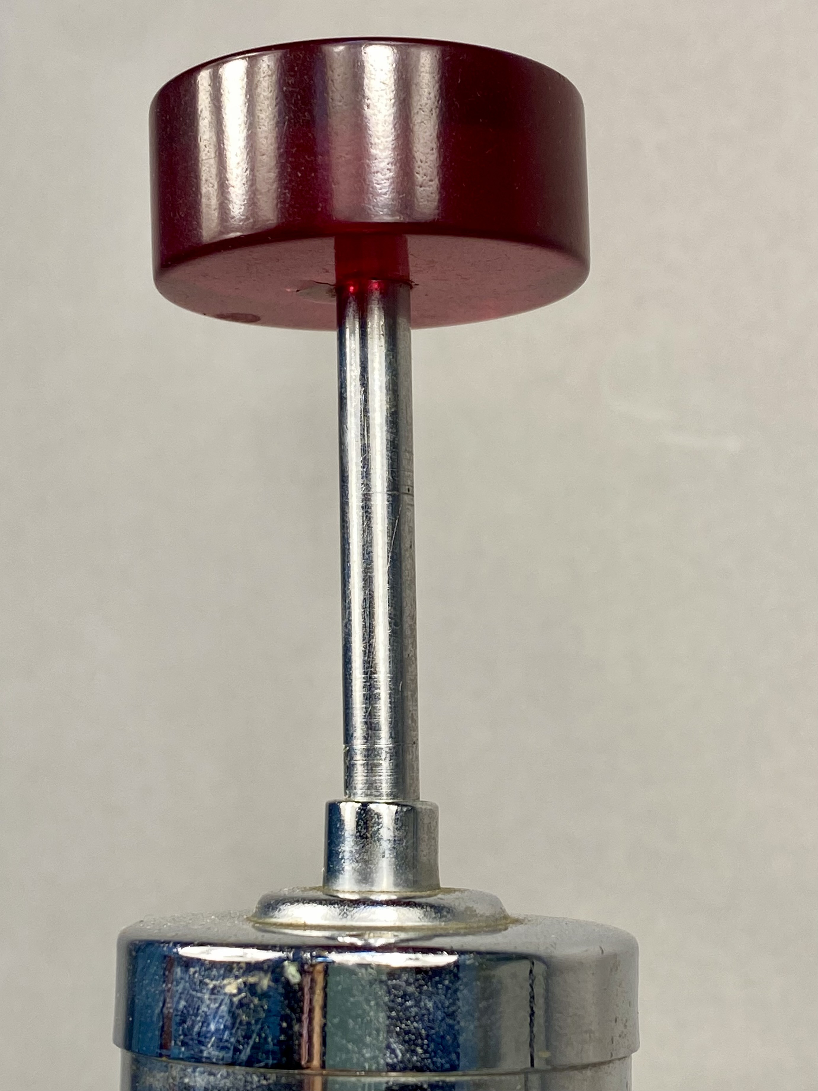 This barware set, attributed to Park Sherman, features a clear molded glass decanter produced by the Maryland Glass Corporation. The decanter body is decorated with molded horizontal ribbing and a vertical column of circular motifs. The base of the glass is embossed with the Maryland Glass Corporation mark, consisting of the letter M inside a circle above the numeral 2. The set includes a chrome-plated metal pump-action dispenser mechanism topped with a circular red resin handle. A matching circular chrome-plated metal tray serves as a carousel, featuring a central opening for the decanter and circular cutouts for the accompanying glassware. The set is completed by several clear glass shot glasses, some of which feature gold-toned bands at the rims. Measurements: Decanter height: 6 inches (excluding pump mechanism) Tray diameter: 8.5 inches. The set is in good vintage condition. The metal components show minor surface wear and light oxidation consistent with age. The glass elements are free of visible chips or cracks. There is noticeable wear and thinning to the gold-toned rim decoration on several of the shot glasses.
