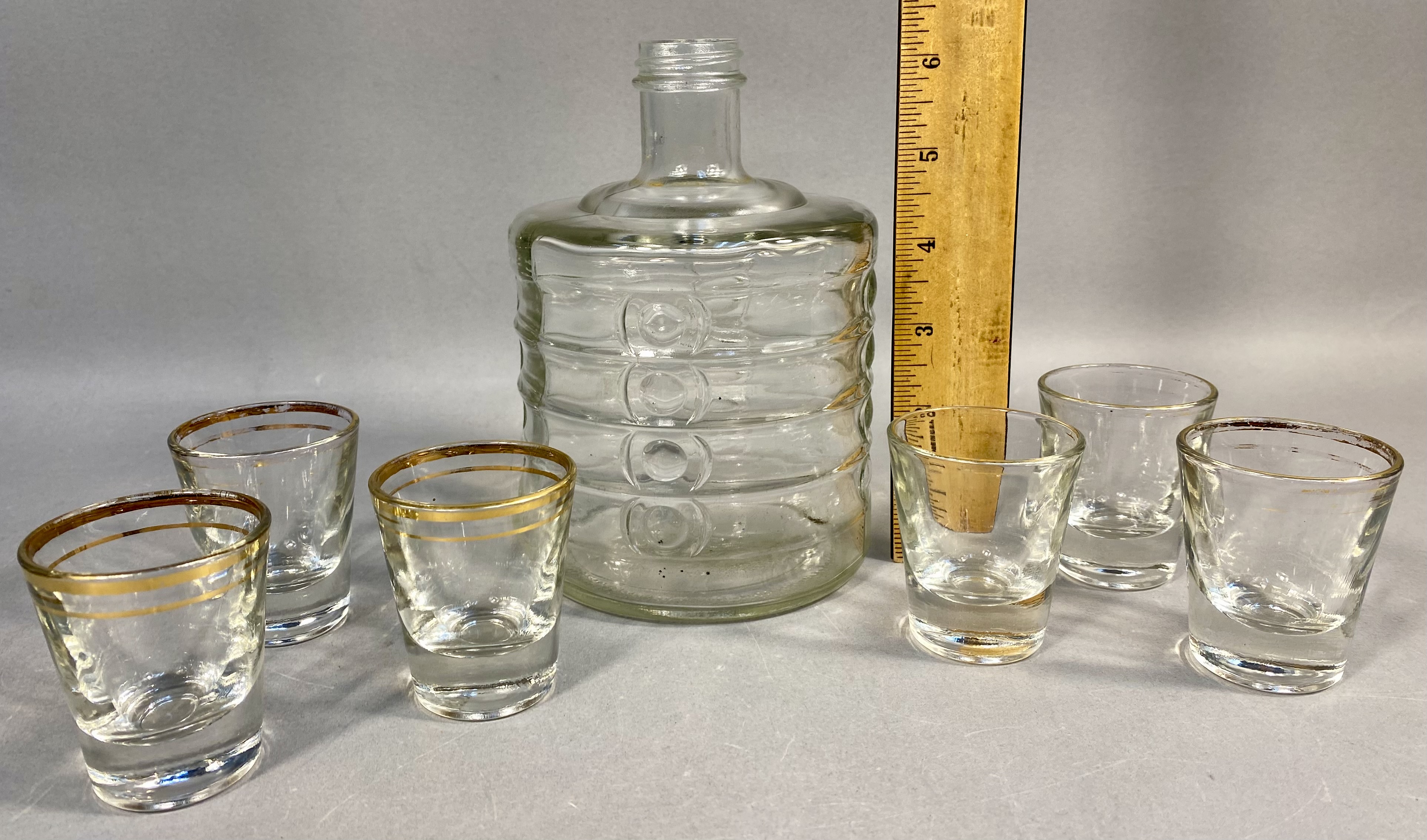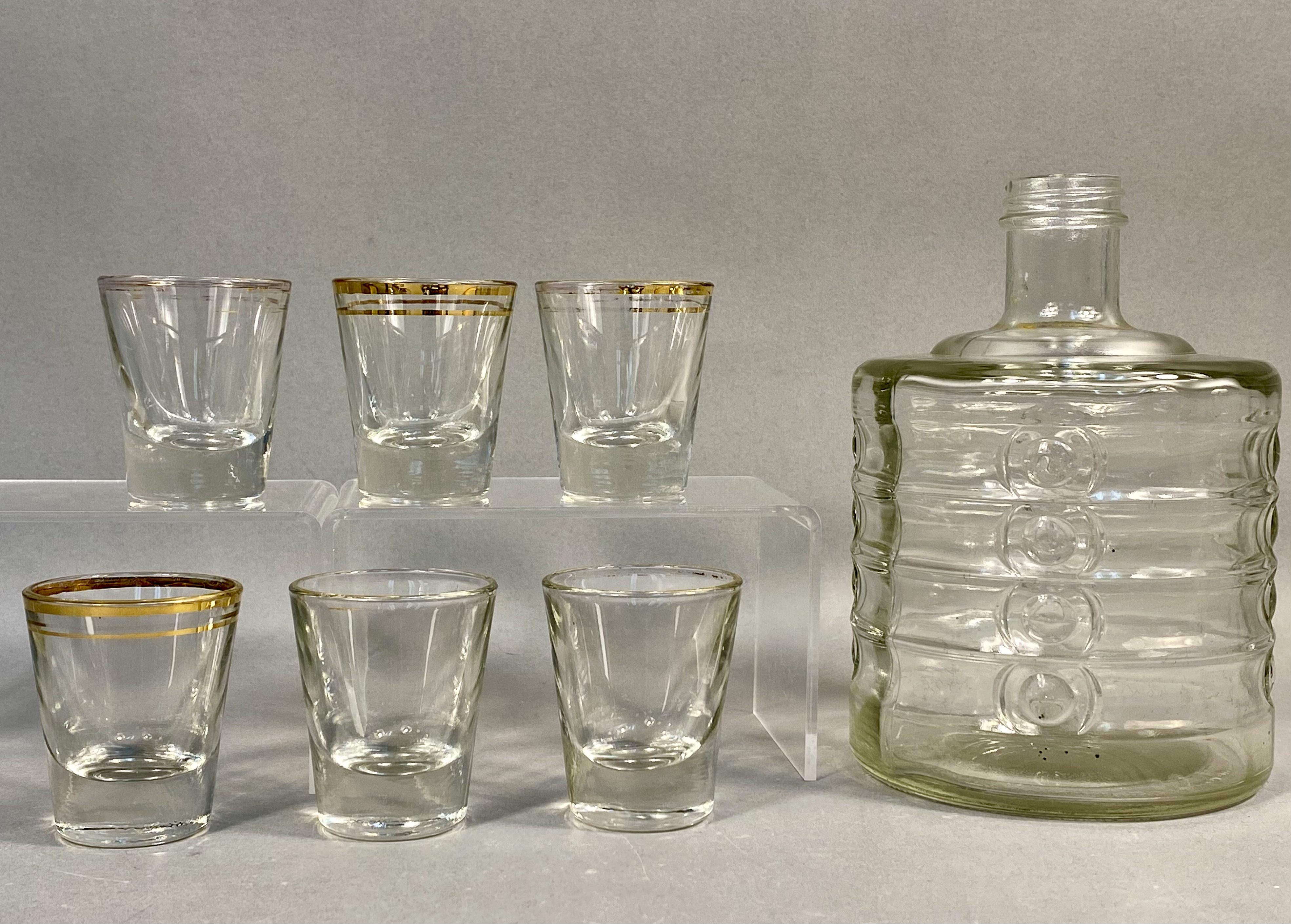 The set is in good vintage condition. The metal components show minor surface wear and light oxidation consistent with age. The glass elements are free of visible chips or cracks. There is noticeable wear and thinning to the gold-toned rim decoration on several of the shot glasses.