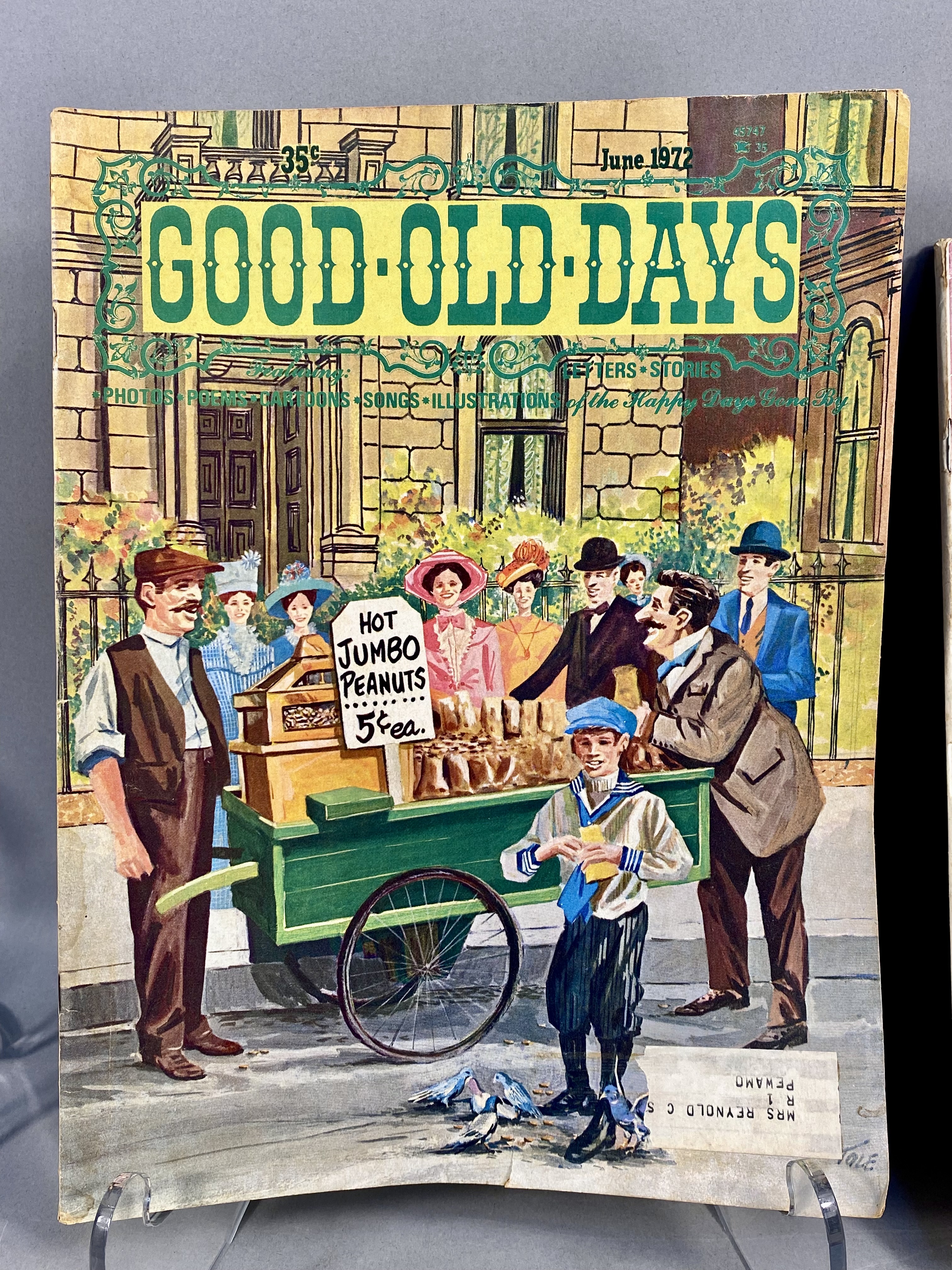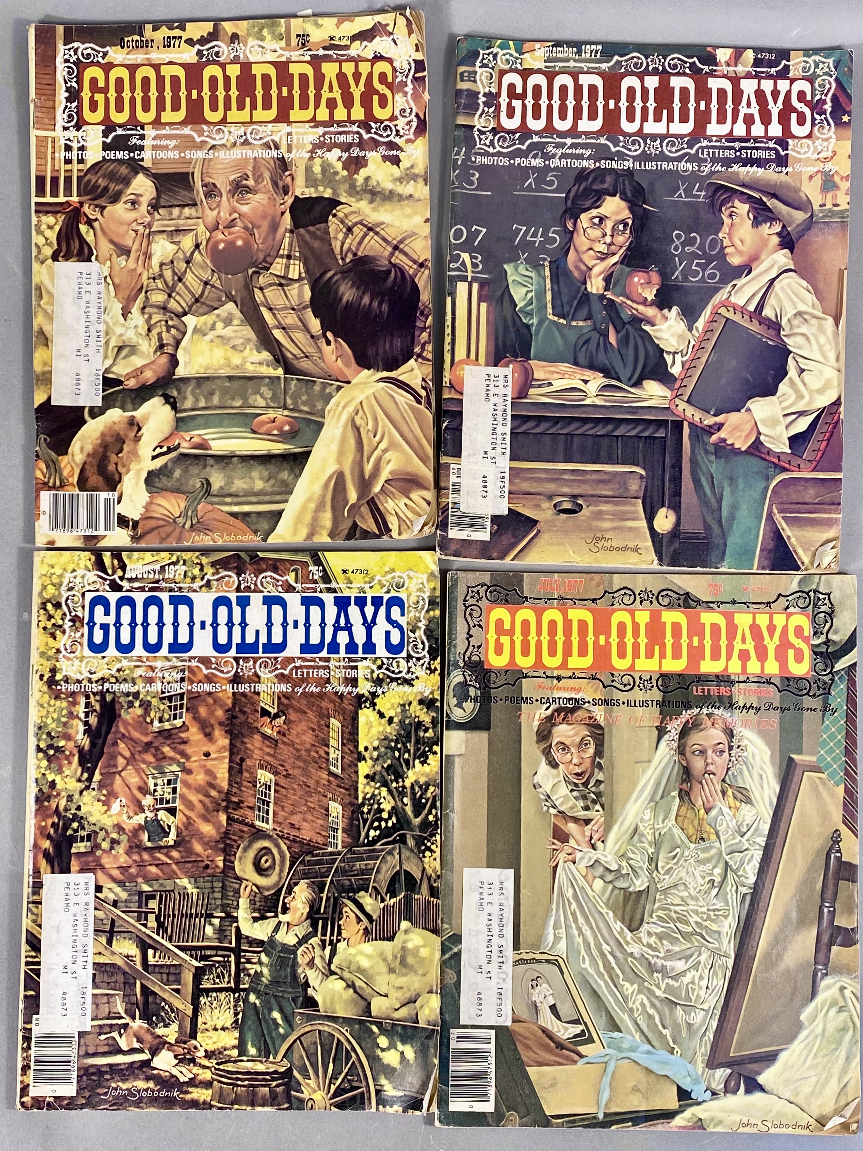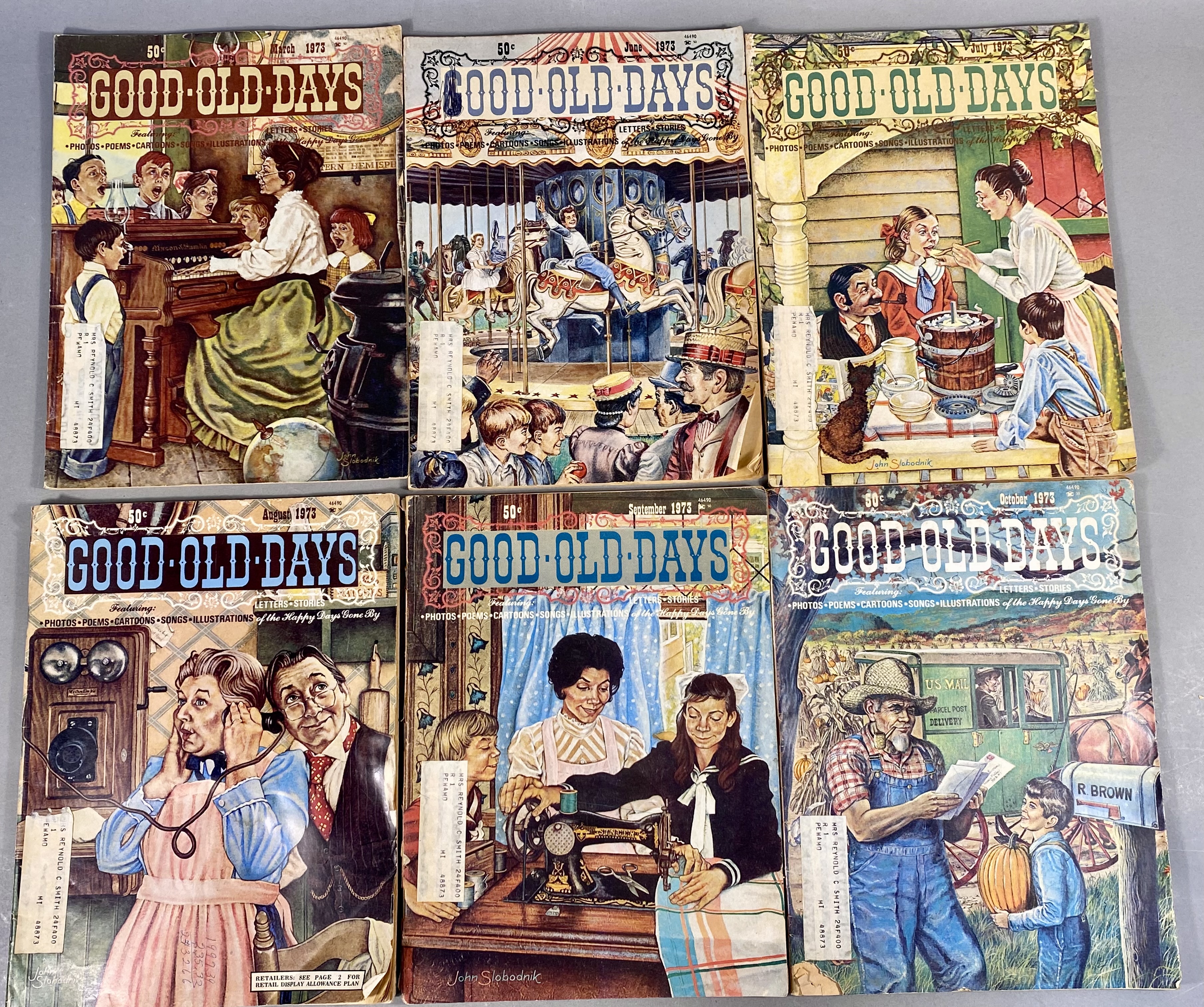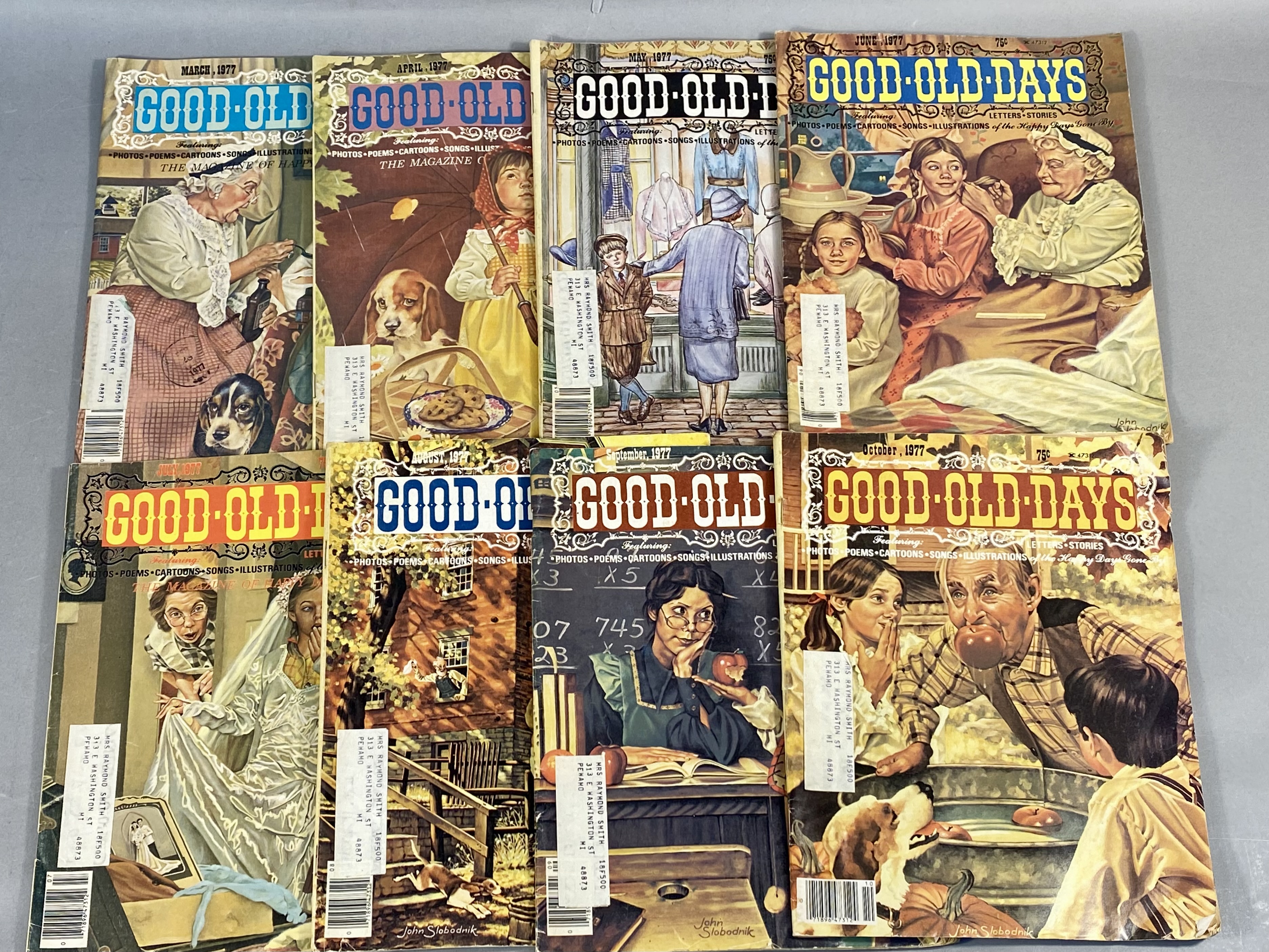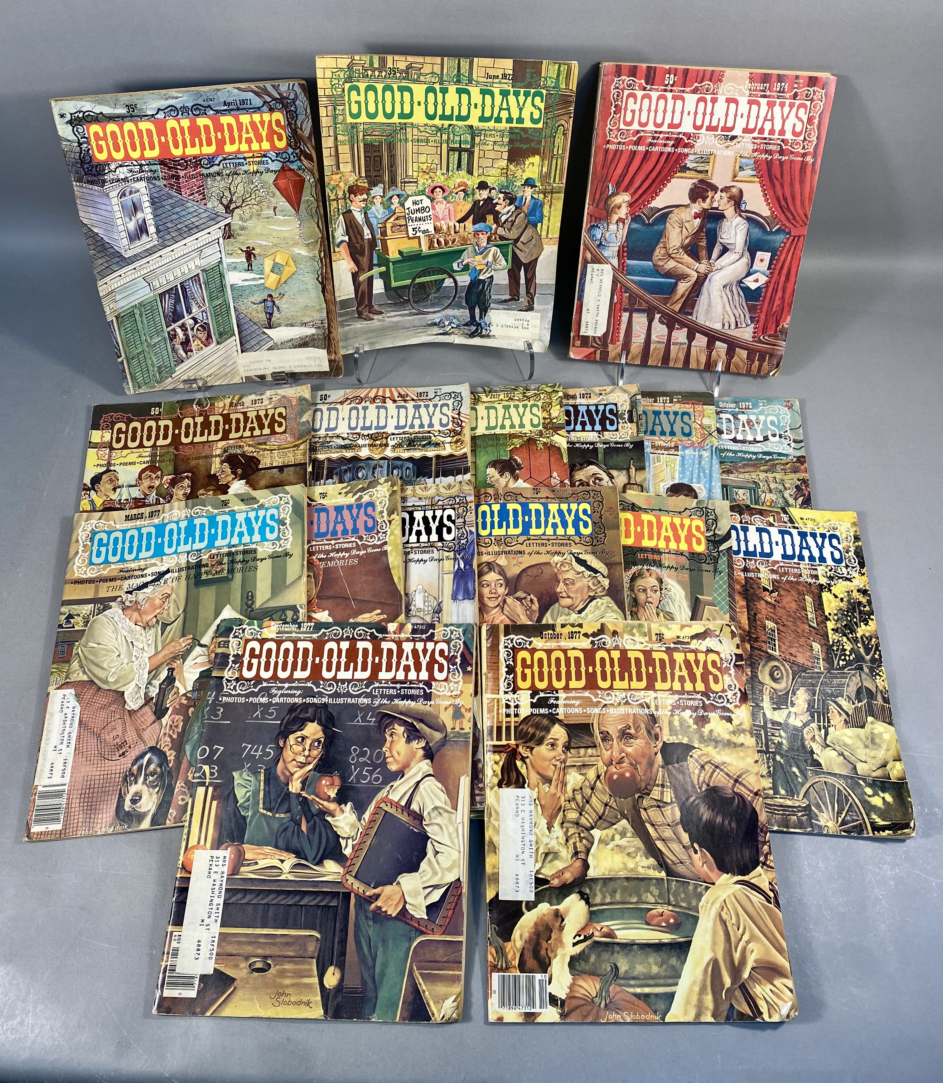 This lot consists of 17 issues of Good Old Days magazine, published by Tower Press, Inc. in Seabrook, New Hampshire. The collection spans a date range from 1971 to 1977 and focuses on early 20th-century Americana and nostalgia. The magazines feature full-color illustrated covers by artists including John Slobodnik, Charles Berger, and Dale. Interior content includes historical articles, retrospective features on classic Hollywood actors such as Jimmy Cagney, Mary Martin, Ethel Merman, and Boris Karloff, and various reader-submitted stories and poems. The issues also contain period-appropriate classified advertisements and vintage illustrations. The specific issues included are April 1971; June 1972; March, June, July, August, September, and October 1973; February 1974; and March, April, May, June, July, August, September, and October 1977. Measurement: 8 inches X 11 inches The collection is in fair to good condition, showing wear consistent with age and handling. Most issues retain original subscriber mailing labels on the front covers. Physical defects include corner bumping, edge fraying, and creasing to the softcover wrappers. Interior pages exhibit significant paper toning and yellowing typical of newsprint from this era. Some issues have light pencil notations on the covers.