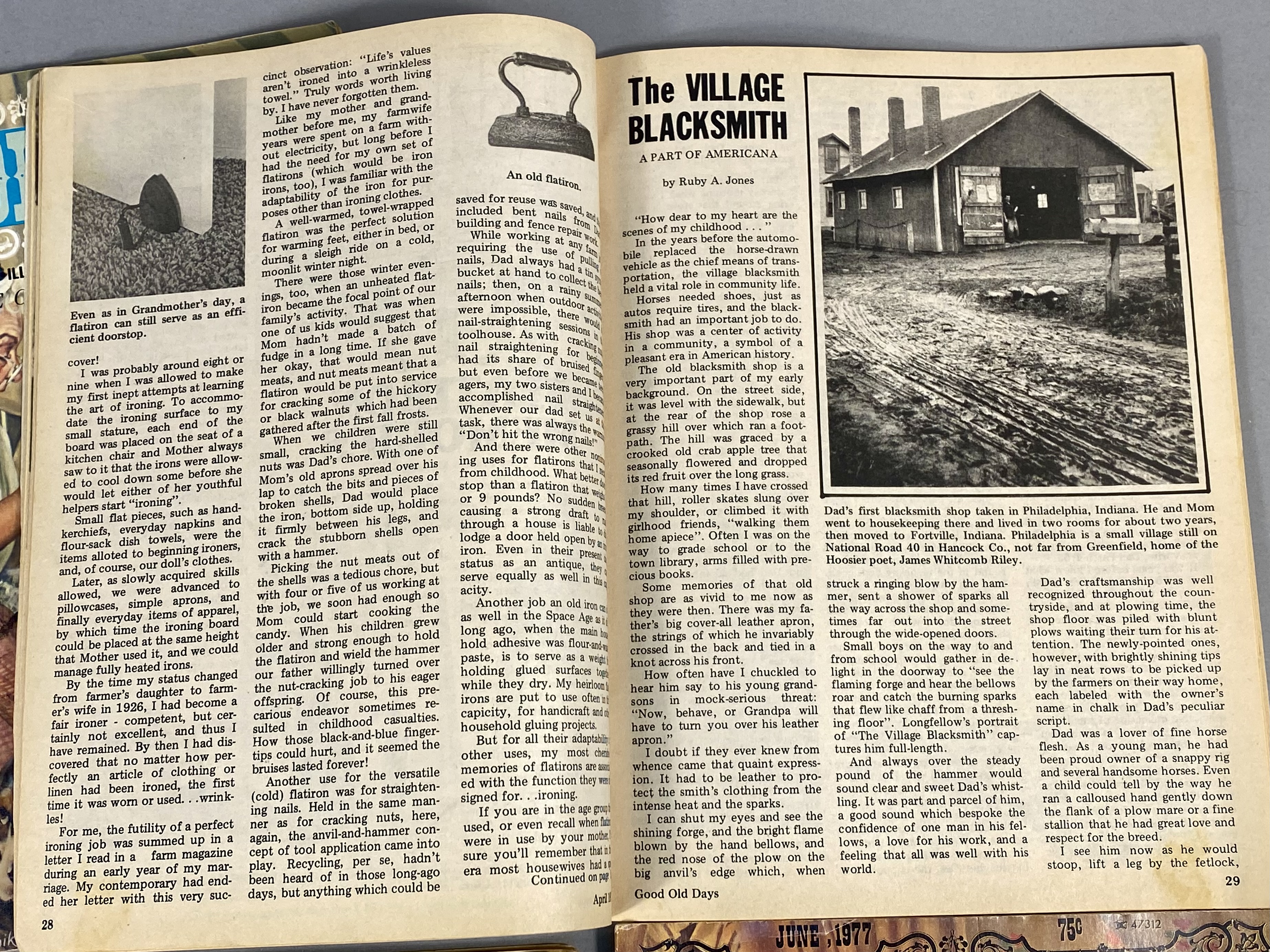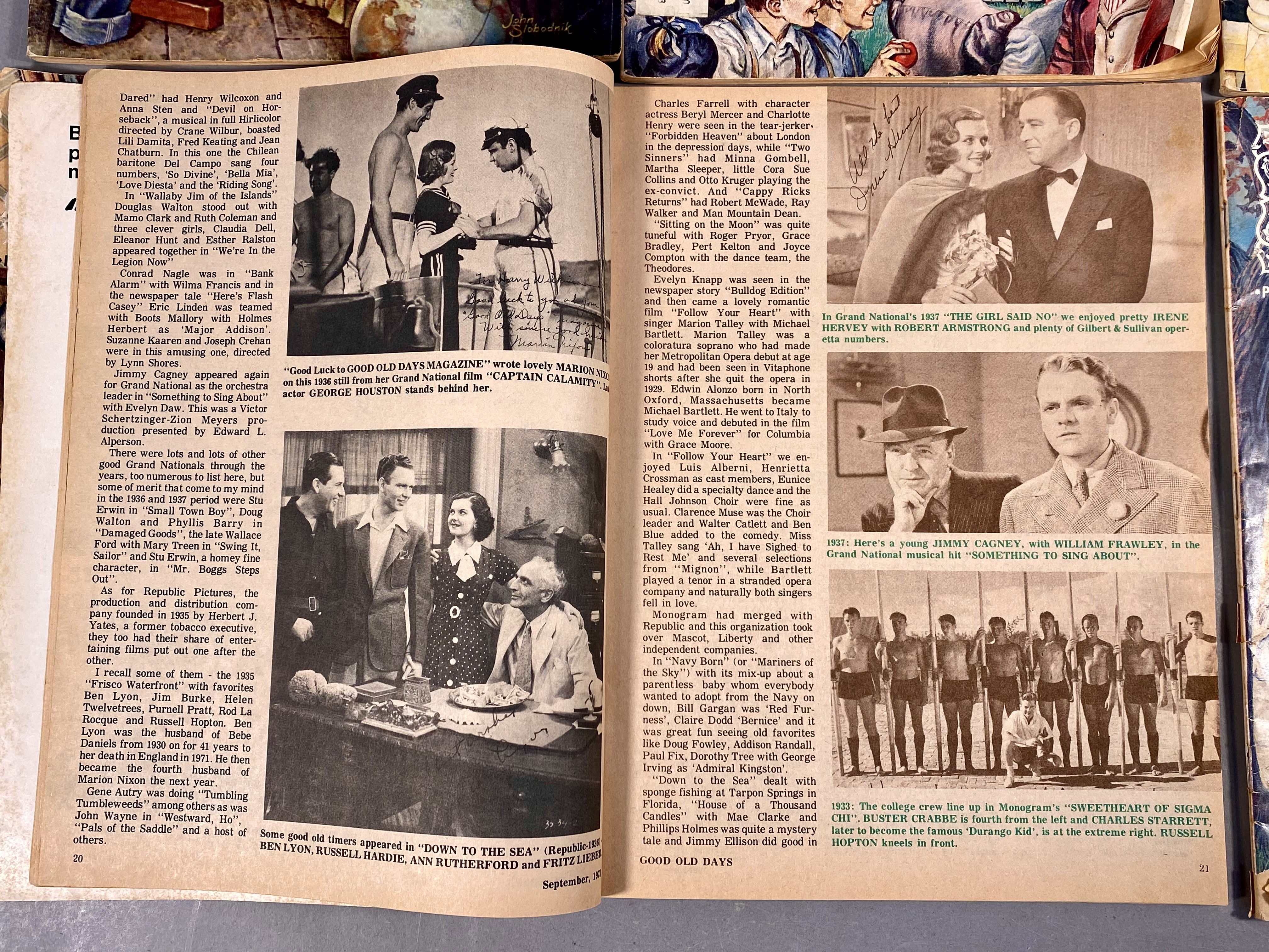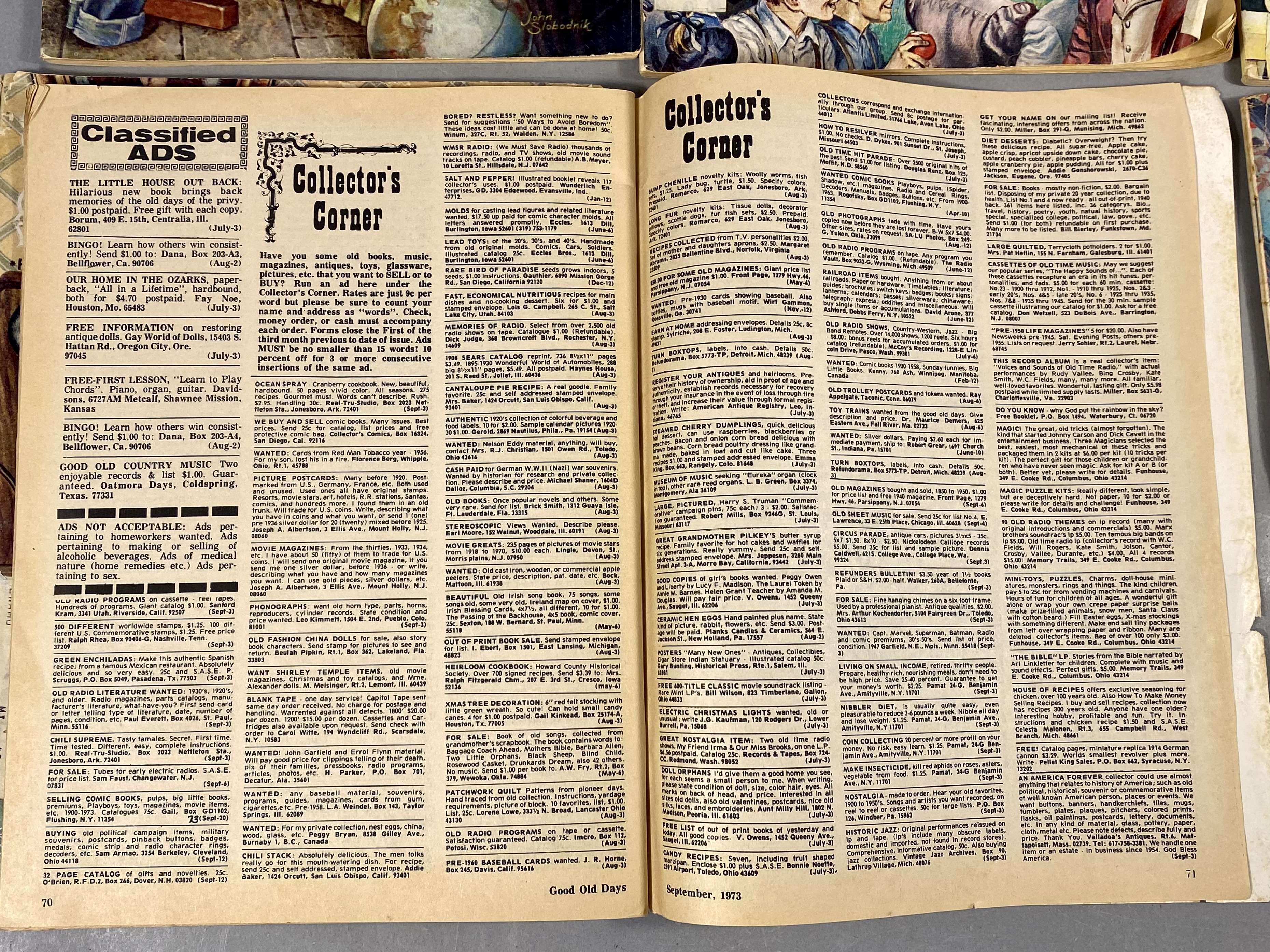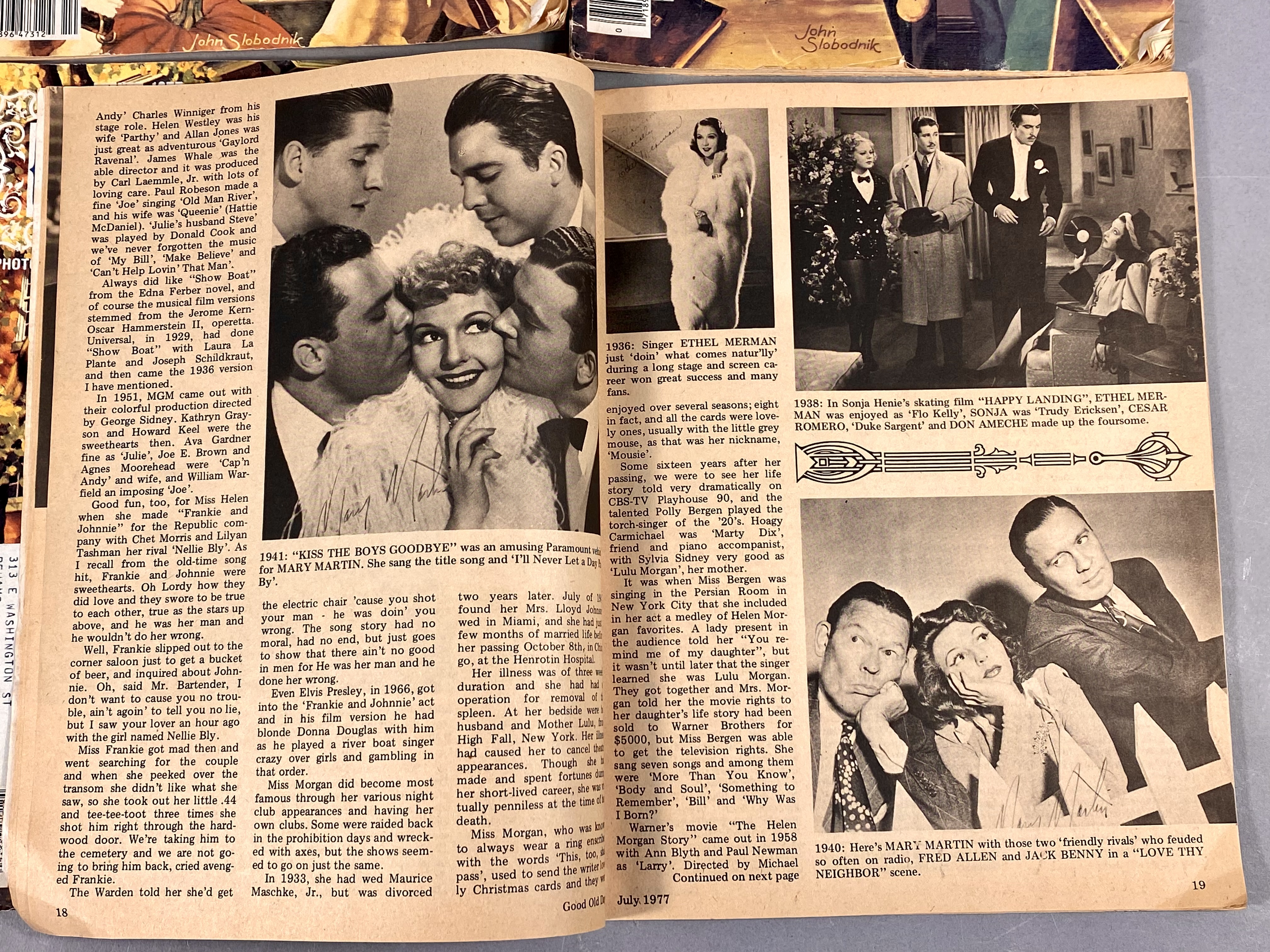 This lot consists of 17 issues of Good Old Days magazine, published by Tower Press, Inc. in Seabrook, New Hampshire. The collection spans a date range from 1971 to 1977 and focuses on early 20th-century Americana and nostalgia. The magazines feature full-color illustrated covers by artists including John Slobodnik, Charles Berger, and Dale. Interior content includes historical articles, retrospective features on classic Hollywood actors such as Jimmy Cagney, Mary Martin, Ethel Merman, and Boris Karloff, and various reader-submitted stories and poems. The issues also contain period-appropriate classified advertisements and vintage illustrations. The specific issues included are April 1971; June 1972; March, June, July, August, September, and October 1973; February 1974; and March, April, May, June, July, August, September, and October 1977. Measurement: 8 inches X 11 inches The collection is in fair to good condition, showing wear consistent with age and handling. Most issues retain original subscriber mailing labels on the front covers. Physical defects include corner bumping, edge fraying, and creasing to the softcover wrappers. Interior pages exhibit significant paper toning and yellowing typical of newsprint from this era. Some issues have light pencil notations on the covers.