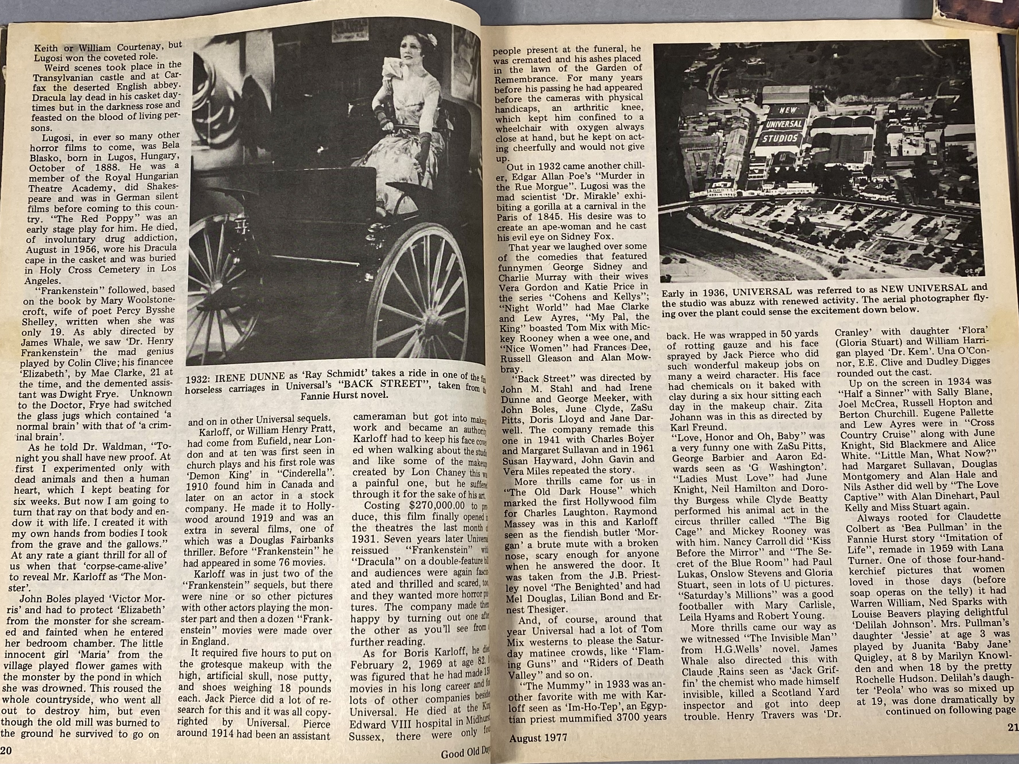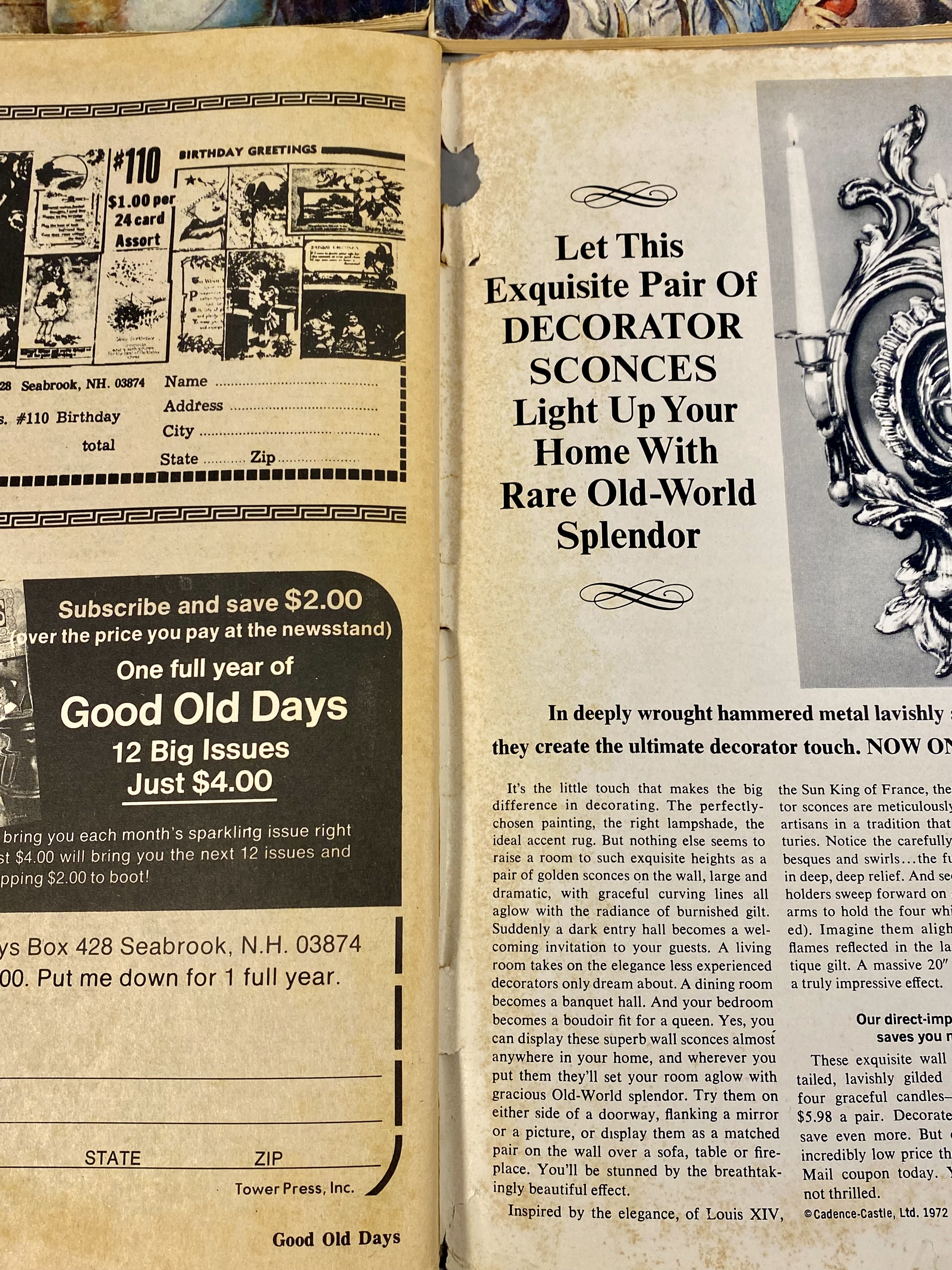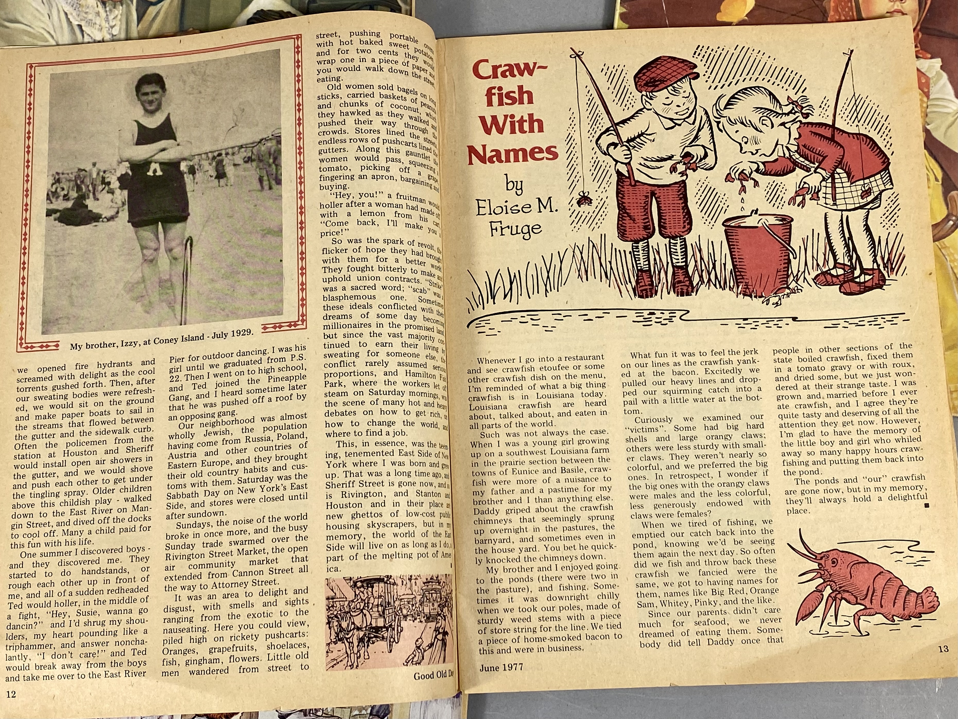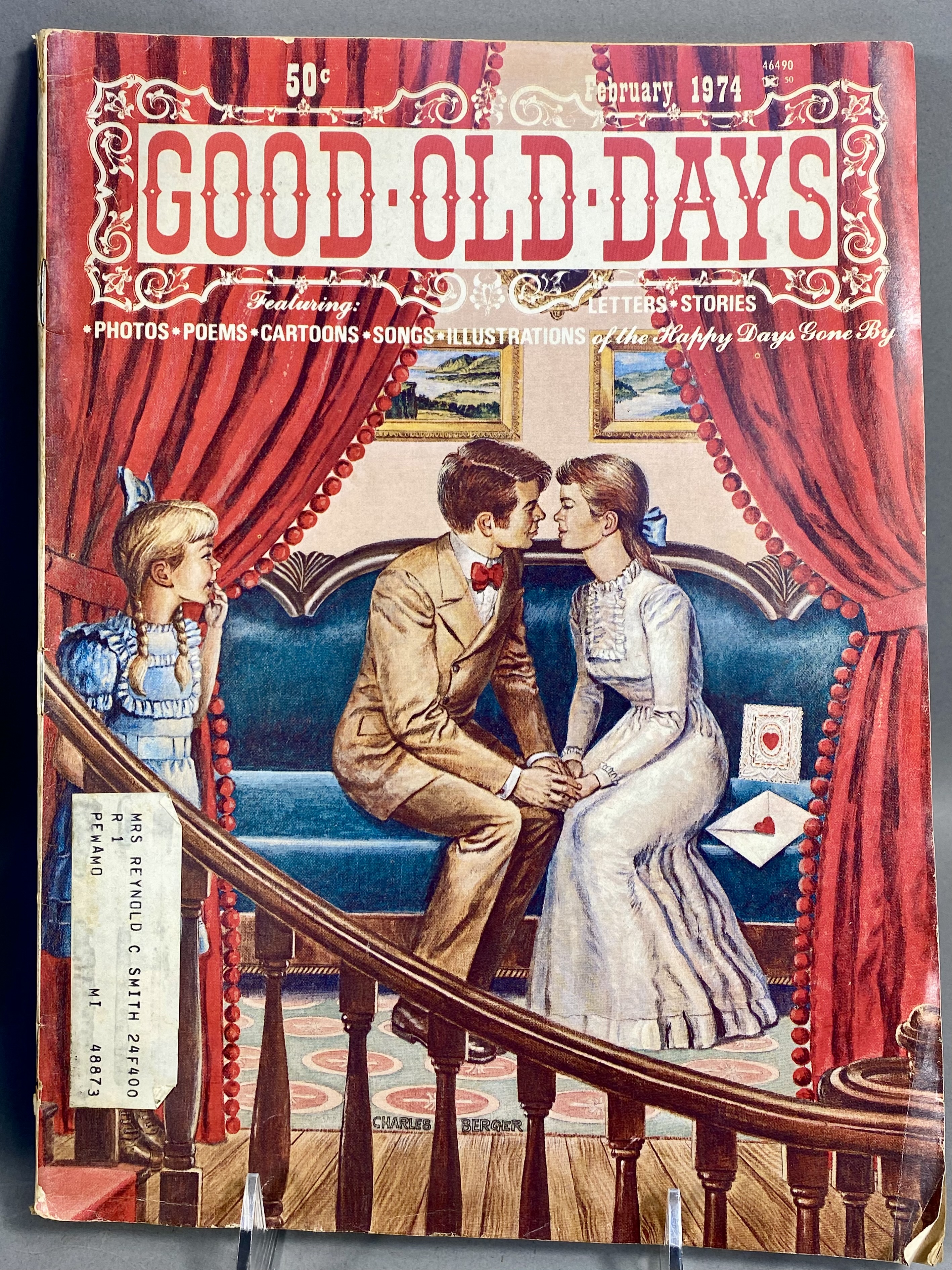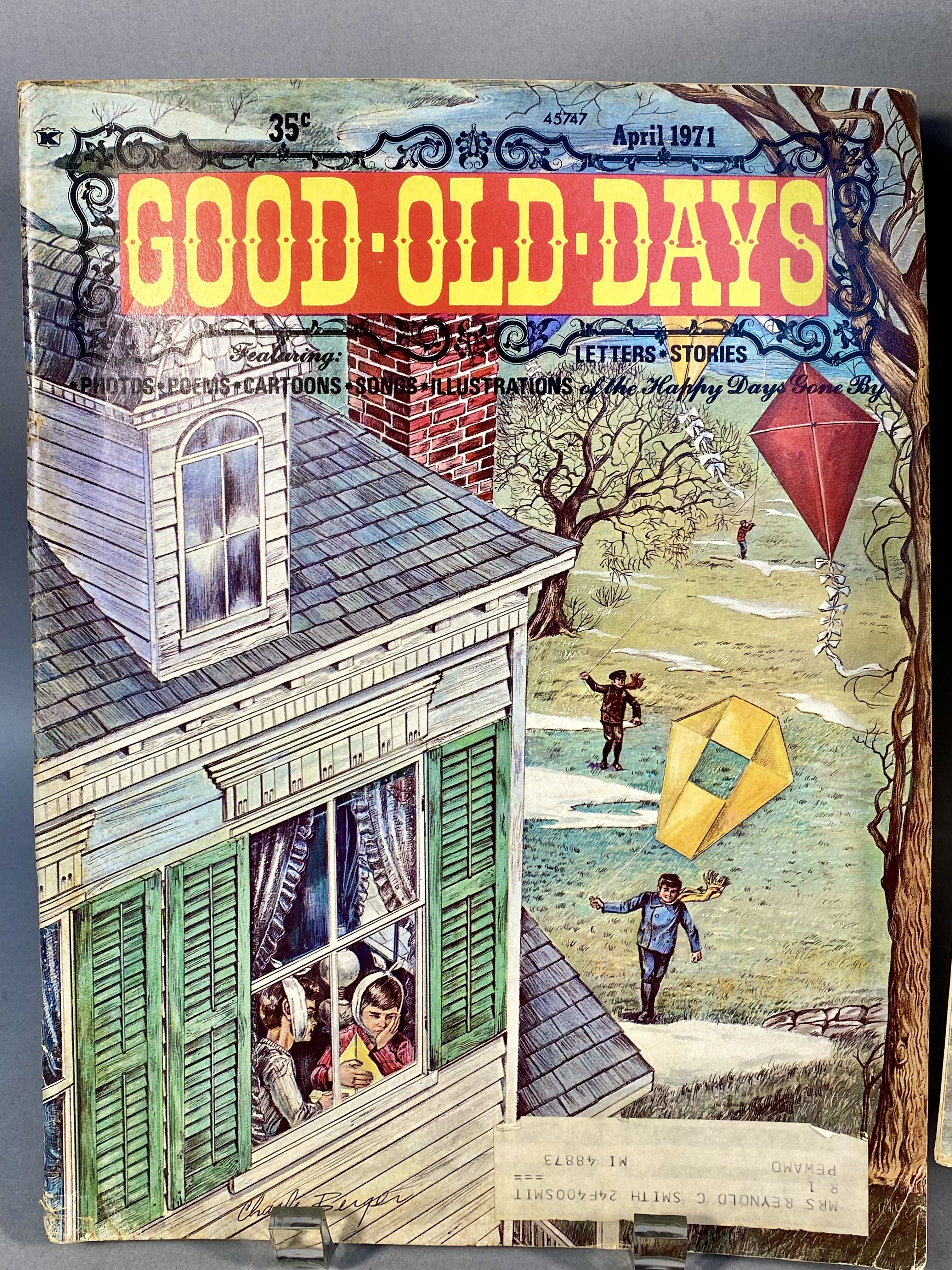 This lot consists of 17 issues of Good Old Days magazine, published by Tower Press, Inc. in Seabrook, New Hampshire. The collection spans a date range from 1971 to 1977 and focuses on early 20th-century Americana and nostalgia. The magazines feature full-color illustrated covers by artists including John Slobodnik, Charles Berger, and Dale. Interior content includes historical articles, retrospective features on classic Hollywood actors such as Jimmy Cagney, Mary Martin, Ethel Merman, and Boris Karloff, and various reader-submitted stories and poems. The issues also contain period-appropriate classified advertisements and vintage illustrations. The specific issues included are April 1971; June 1972; March, June, July, August, September, and October 1973; February 1974; and March, April, May, June, July, August, September, and October 1977. Measurement: 8 inches X 11 inches The collection is in fair to good condition, showing wear consistent with age and handling. Most issues retain original subscriber mailing labels on the front covers. Physical defects include corner bumping, edge fraying, and creasing to the softcover wrappers. Interior pages exhibit significant paper toning and yellowing typical of newsprint from this era. Some issues have light pencil notations on the covers.