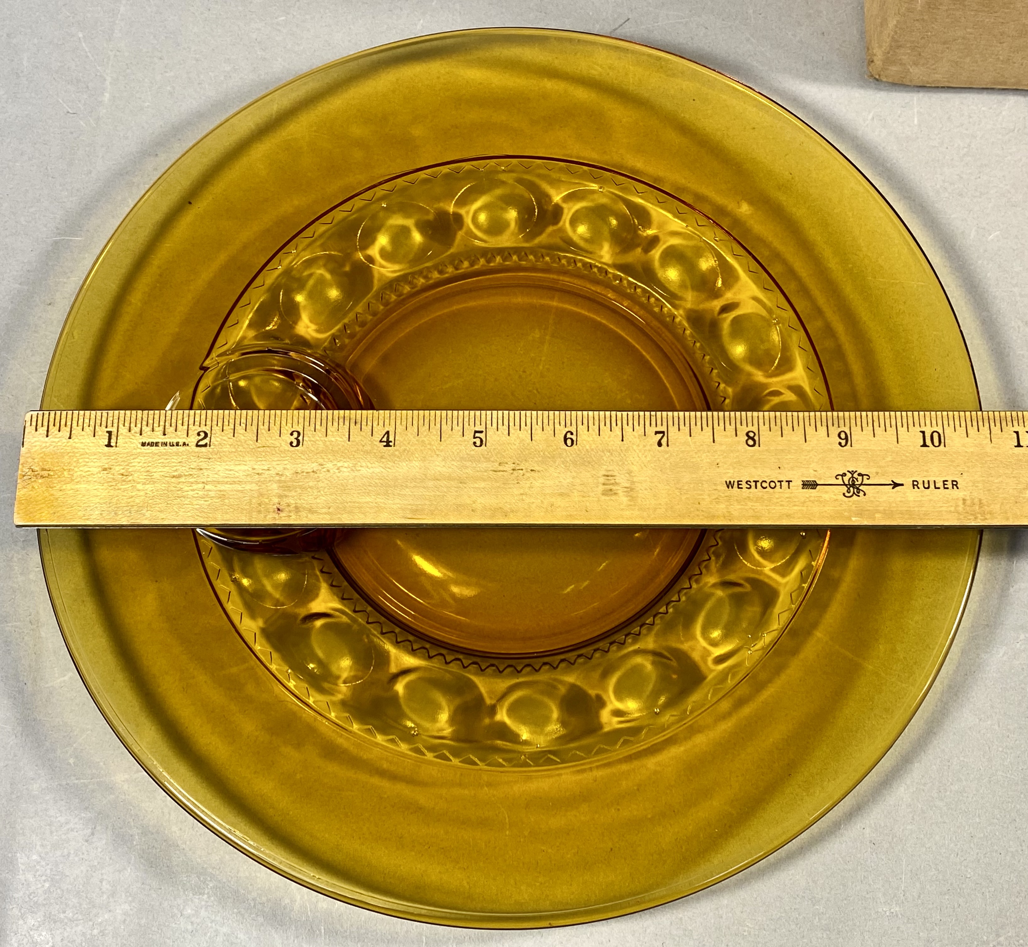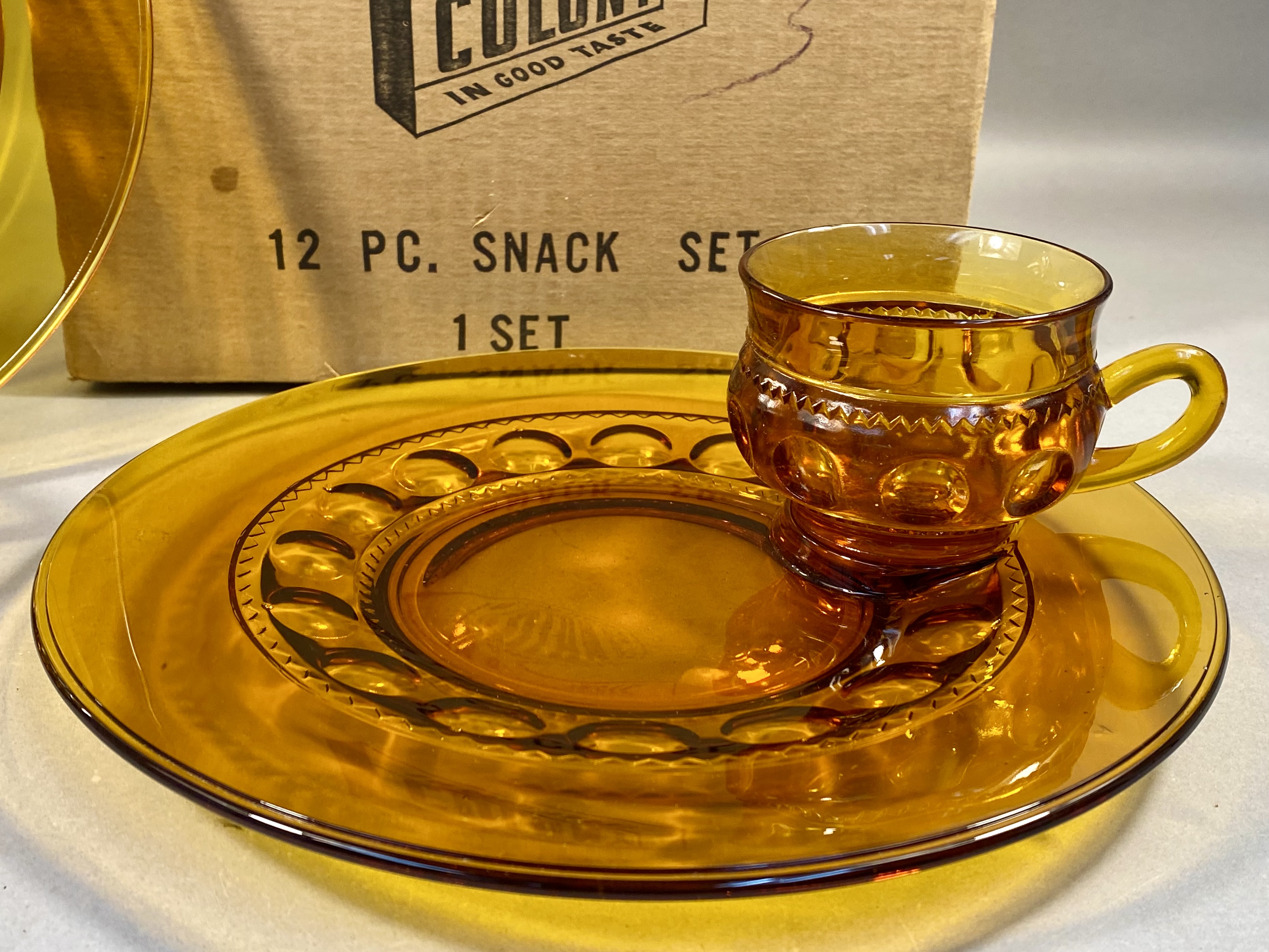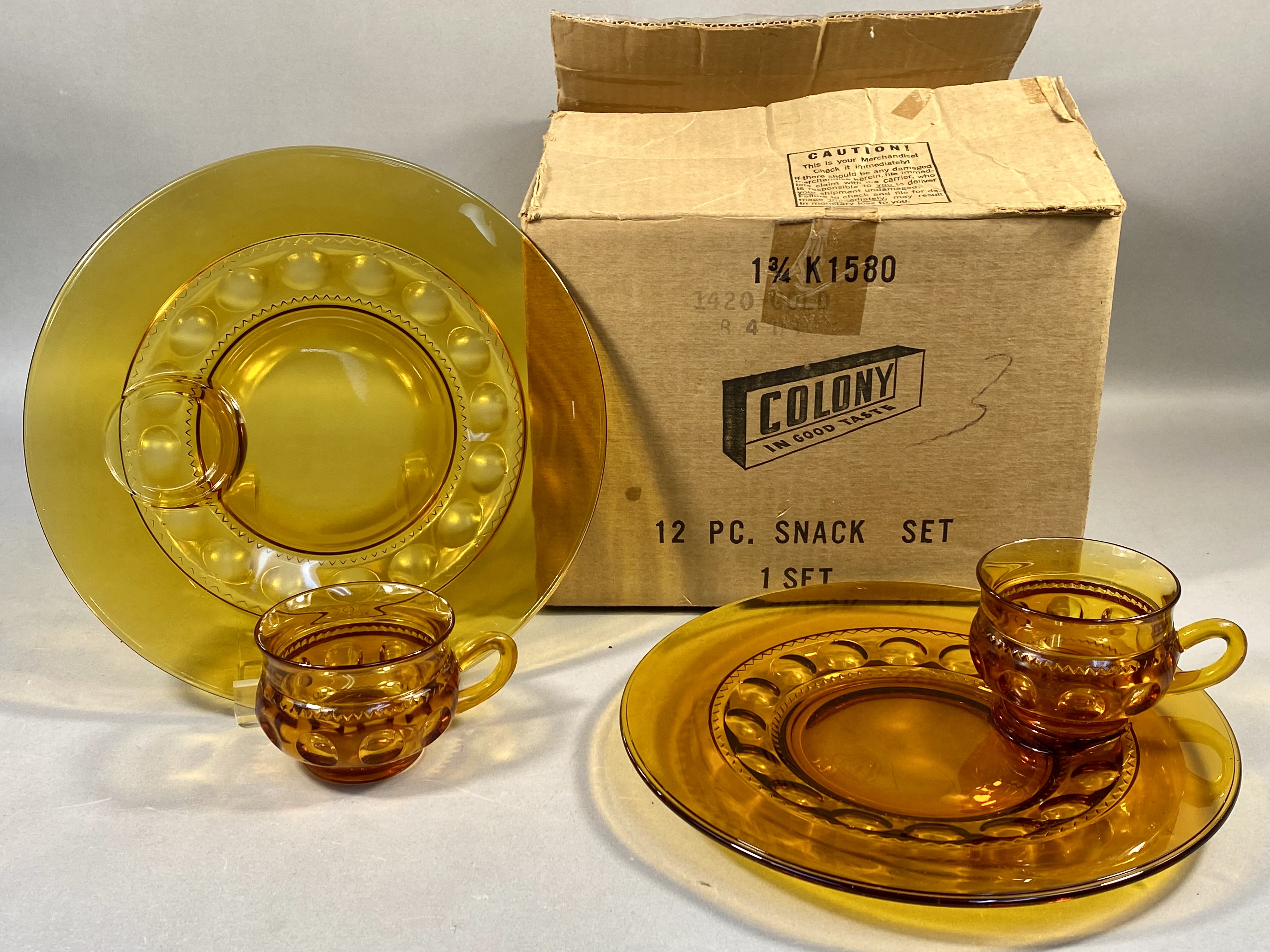 A set of amber glass snack plates and cups in the King’s Crown pattern, manufactured by Colony. The glassware is constructed of pressed amber glass. The handled cups feature a series of circular thumbprint indentations around the lower body, topped by a repeating geometric zigzag band. The circular plates are designed with a wide rim and a central well featuring matching thumbprint decorations and a specific recessed ring to accommodate a cup. Set includes six plates and six cups. The items are presented in the original cardboard shipping container, which is printed with the Colony In Good Taste trademark, 12 PC. SNACK SET, and various inventory codes including 1 3/4 K1580 and 1420 GOLD.