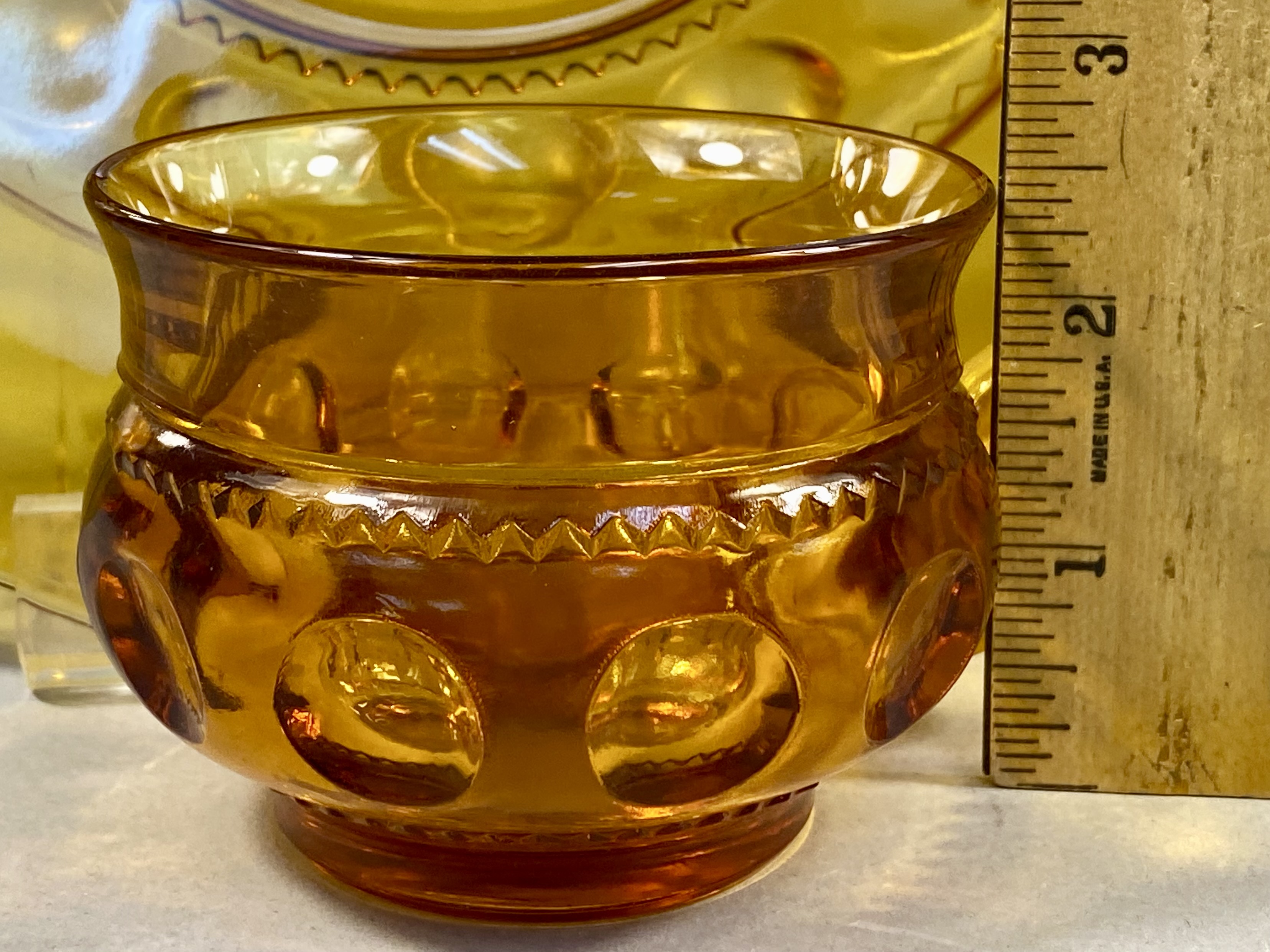 A vintage twelve-piece snack set in amber-colored pressed glass, marketed by Colony and likely manufactured by the Indiana Glass Company. The set features the King’s Crown pattern, characterized by a molded thumbprint design and a distinctive sawtooth or zig-zag border. The set consists of six circular plates with integrated cup wells and six matching handled cups. This collection is a quintessential example of Mid-Century Modern American glassware, dating to approximately the 1960s or 1970s. The set is presented in its original cardboard shipping container, which identifies the color as Gold.