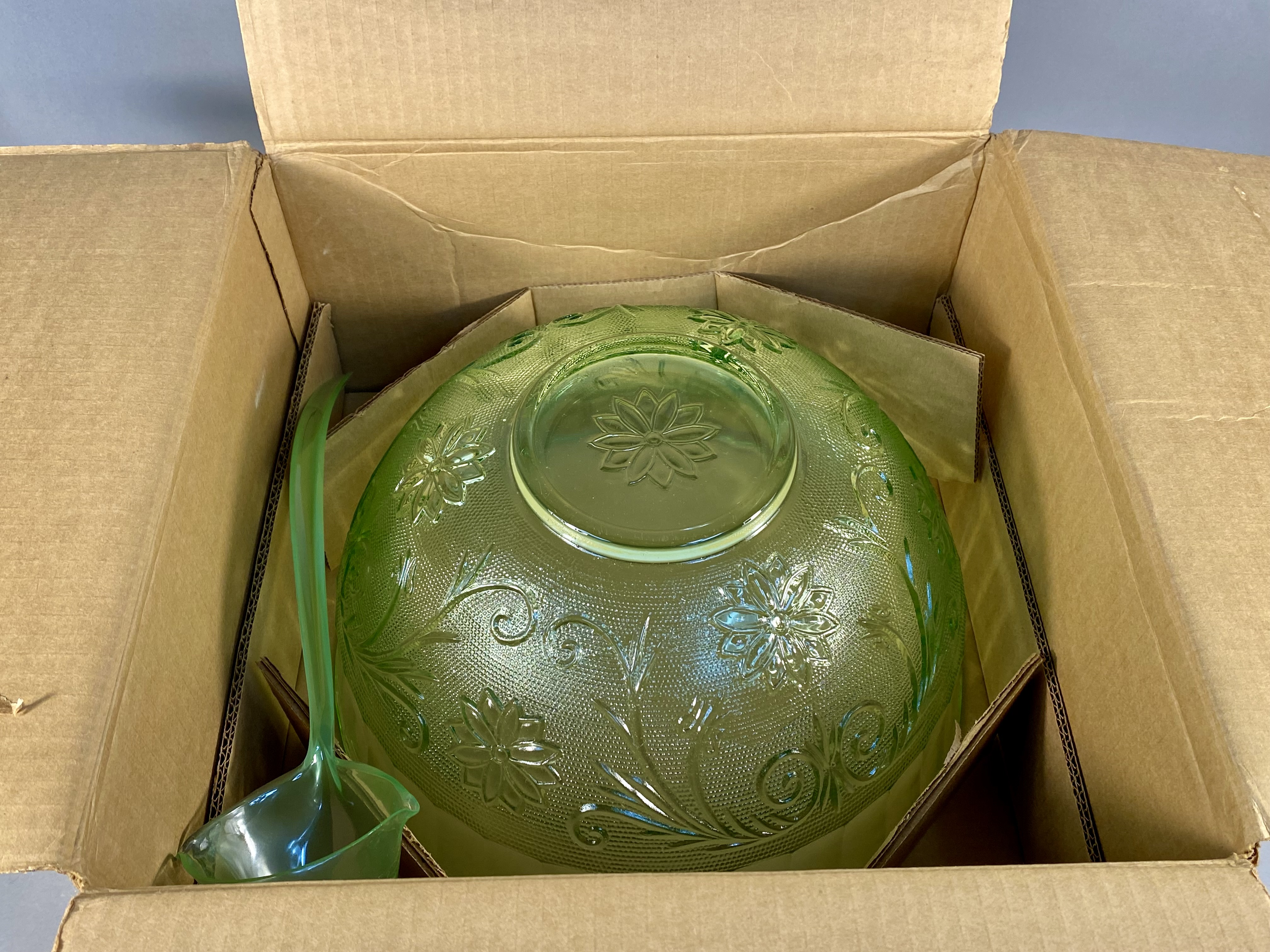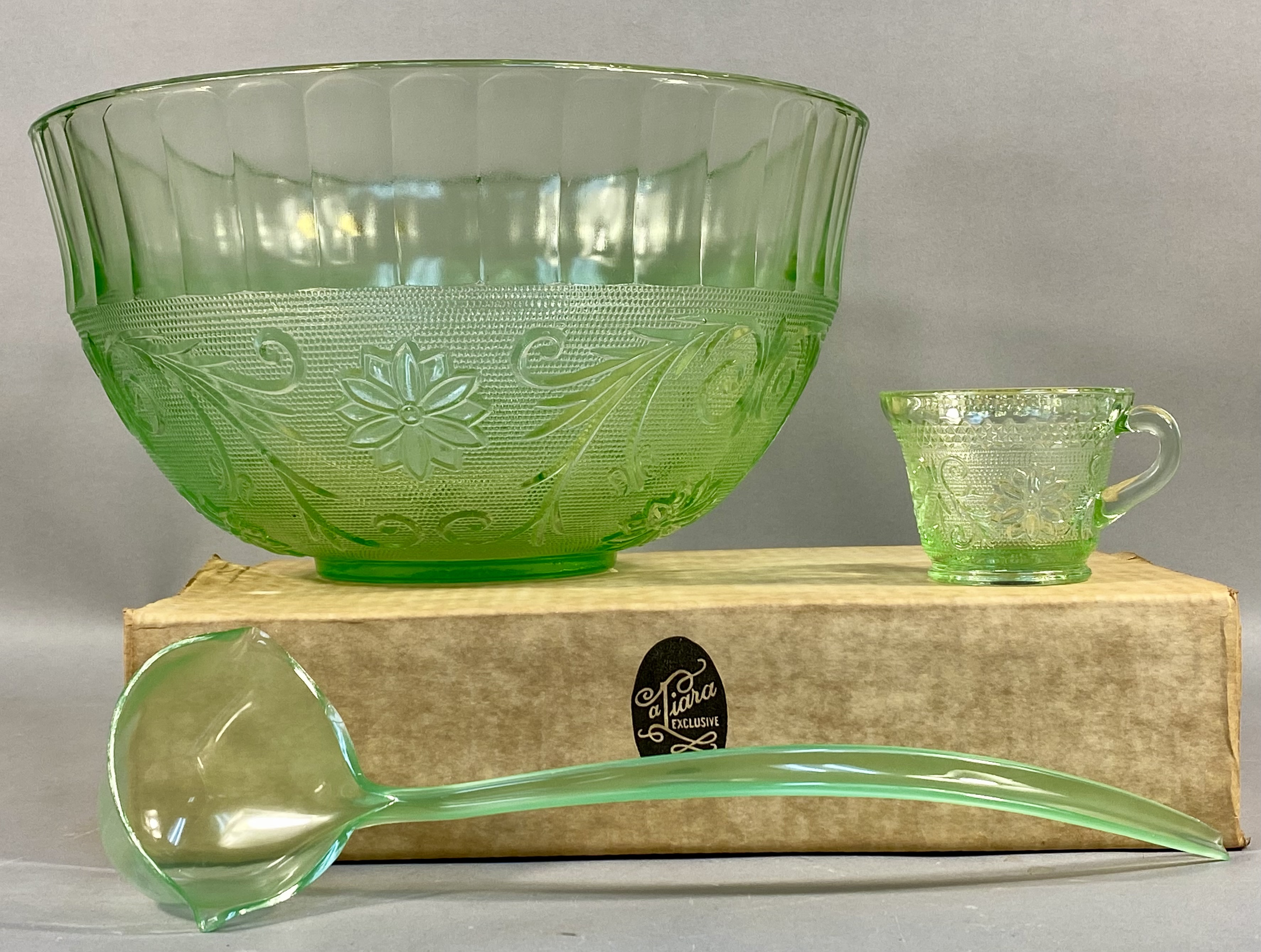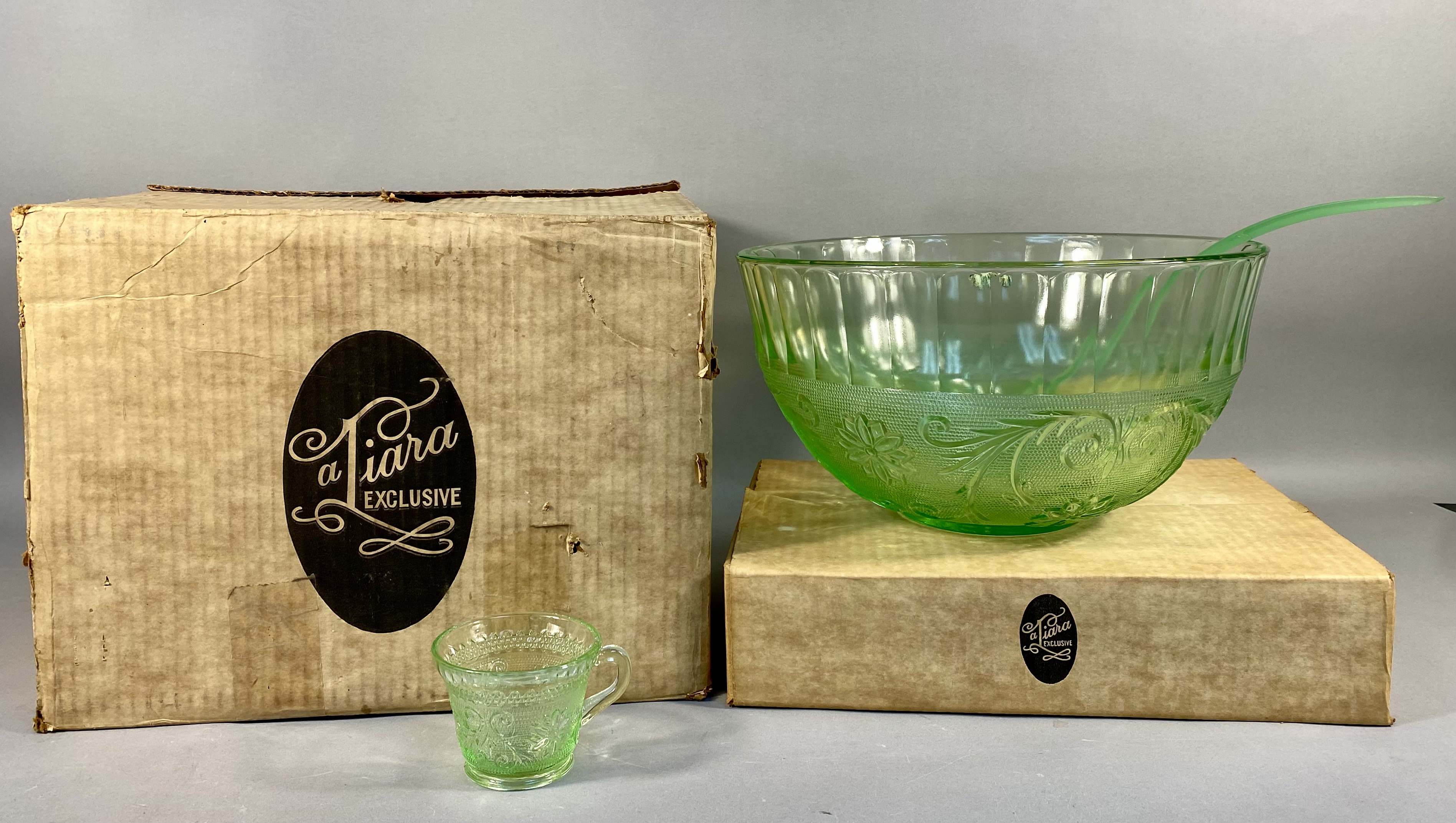 A set of Tiara Exclusive pressed glass punch service items in the Sandwich pattern and Chantilly Green colorway. The collection includes a large punch bowl, a matching long-handled plastic ladle, and several punch cups. The glassware features an embossed floral and scrollwork motif set against a textured ground, finished with a fluted upper rim. A gold foil Tiara Exclusive sticker is affixed to the interior rim of the bowl. The set is accompanied by its original cardboard packaging bearing the Tiara Exclusive logo. Bowl diameter: 12 inches Bowl height: 7 inches. Cup height: 2.5 inches The glassware is in good, unused condition. The original cardboard boxes show signs of age-related wear, including staining, scuffing, and structural degradation.
