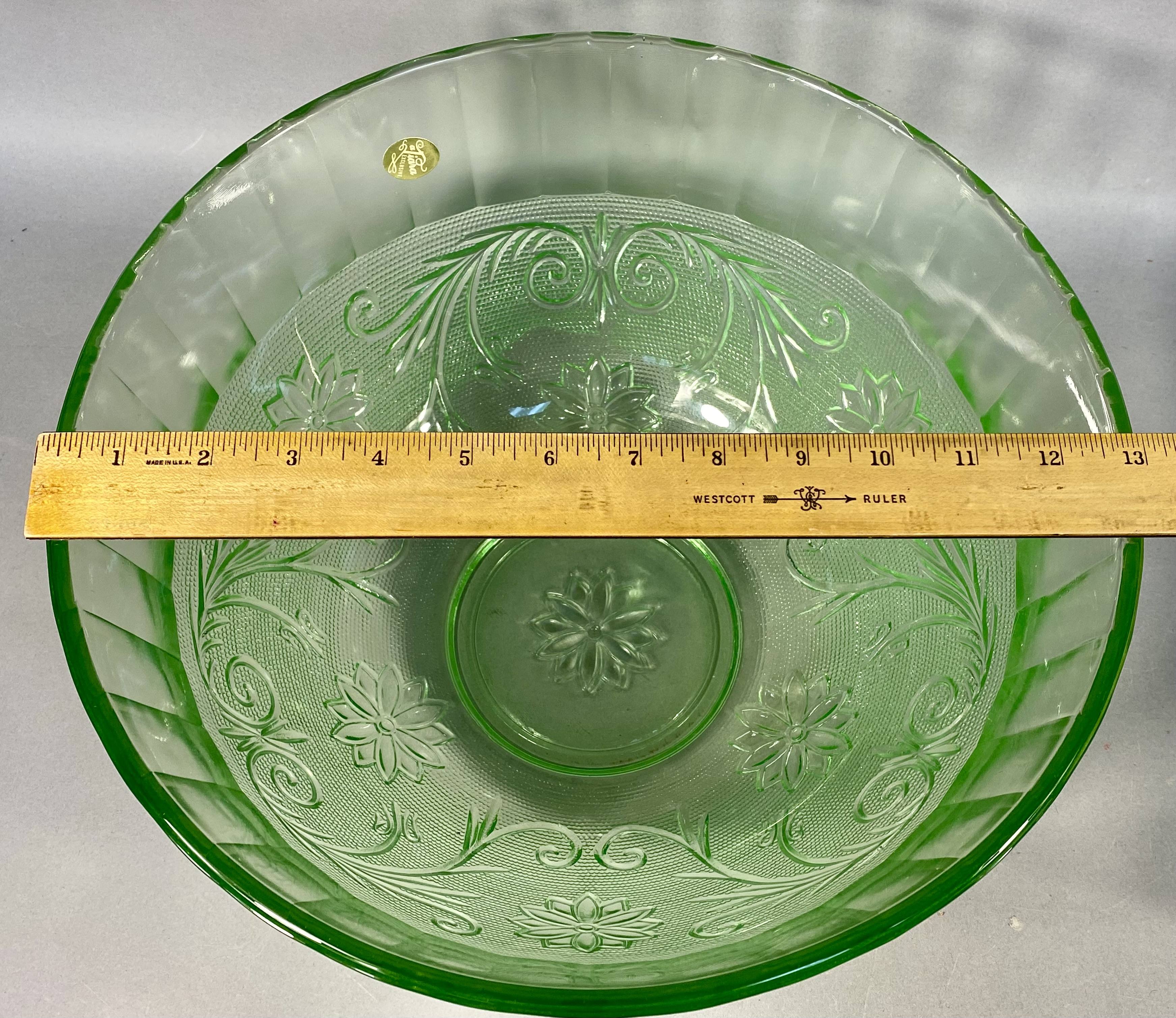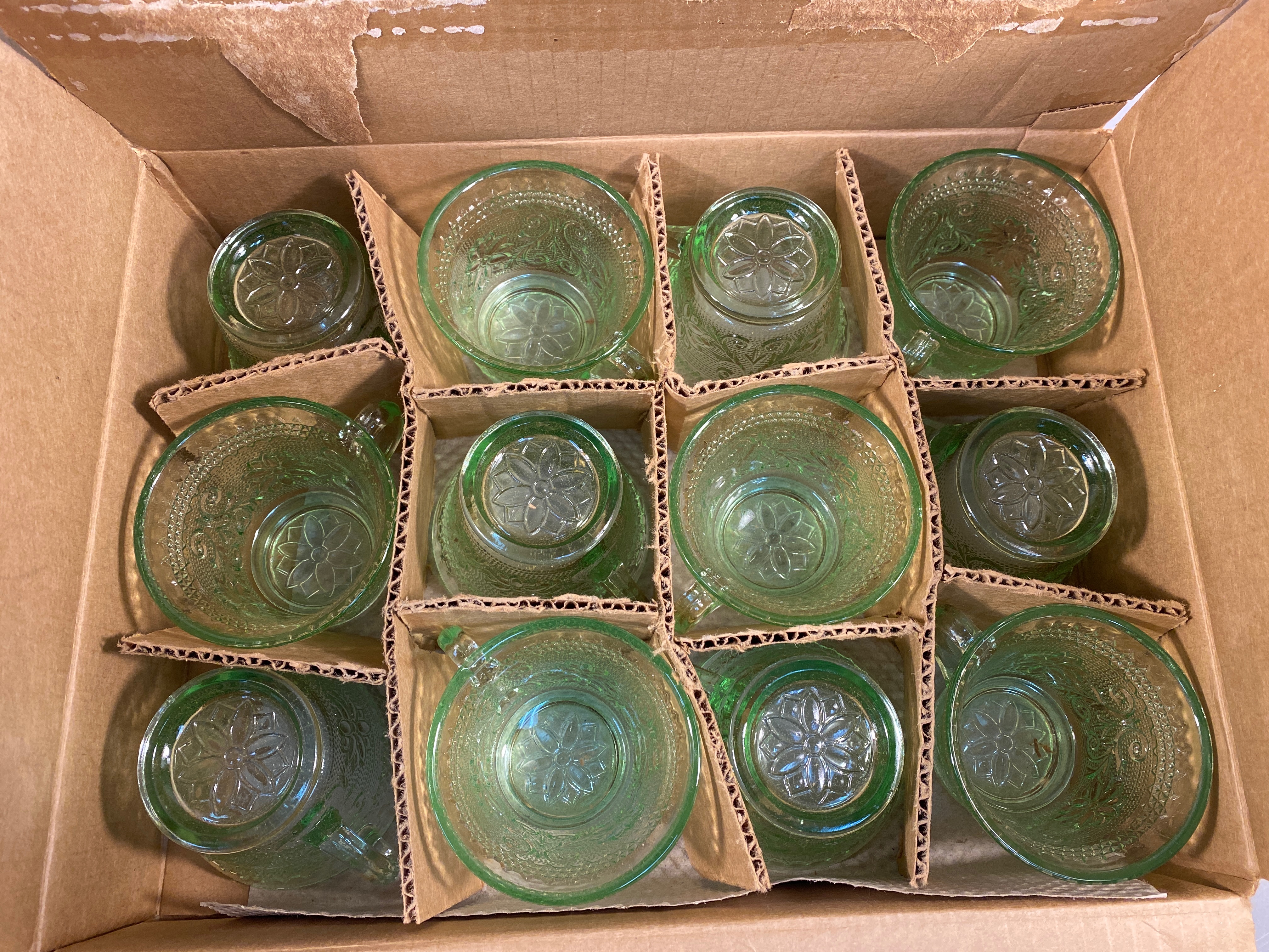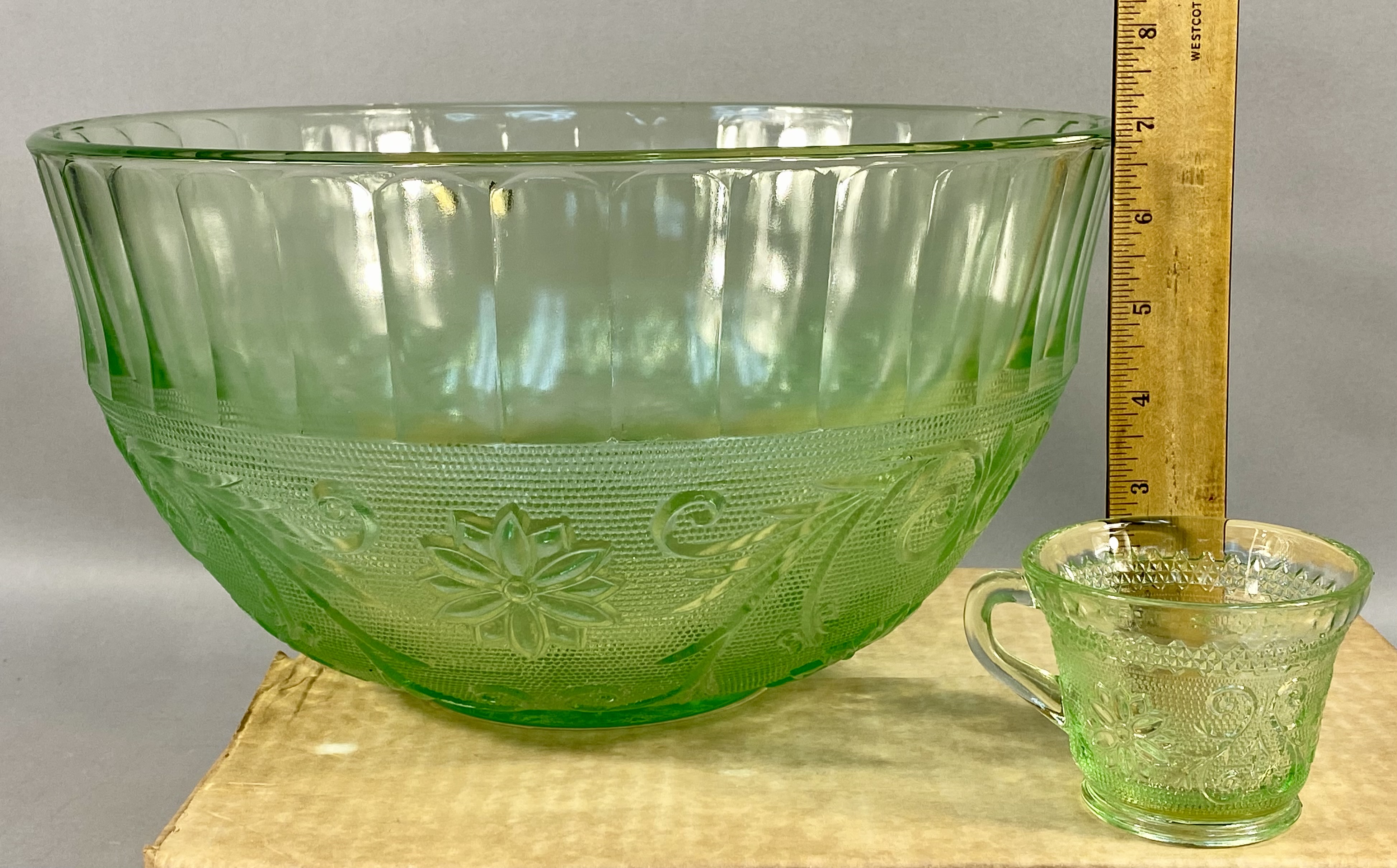 A set of Tiara Exclusive pressed glass punch service items in the Sandwich pattern and Chantilly Green colorway. The collection includes a large punch bowl, a matching long-handled plastic ladle, and several punch cups. The glassware features an embossed floral and scrollwork motif set against a textured ground, finished with a fluted upper rim. A gold foil Tiara Exclusive sticker is affixed to the interior rim of the bowl. The set is accompanied by its original cardboard packaging bearing the Tiara Exclusive logo. Bowl diameter: 12 inches Bowl height: 7 inches. Cup height: 2.5 inches The glassware is in good, unused condition. The original cardboard boxes show signs of age-related wear, including staining, scuffing, and structural degradation.