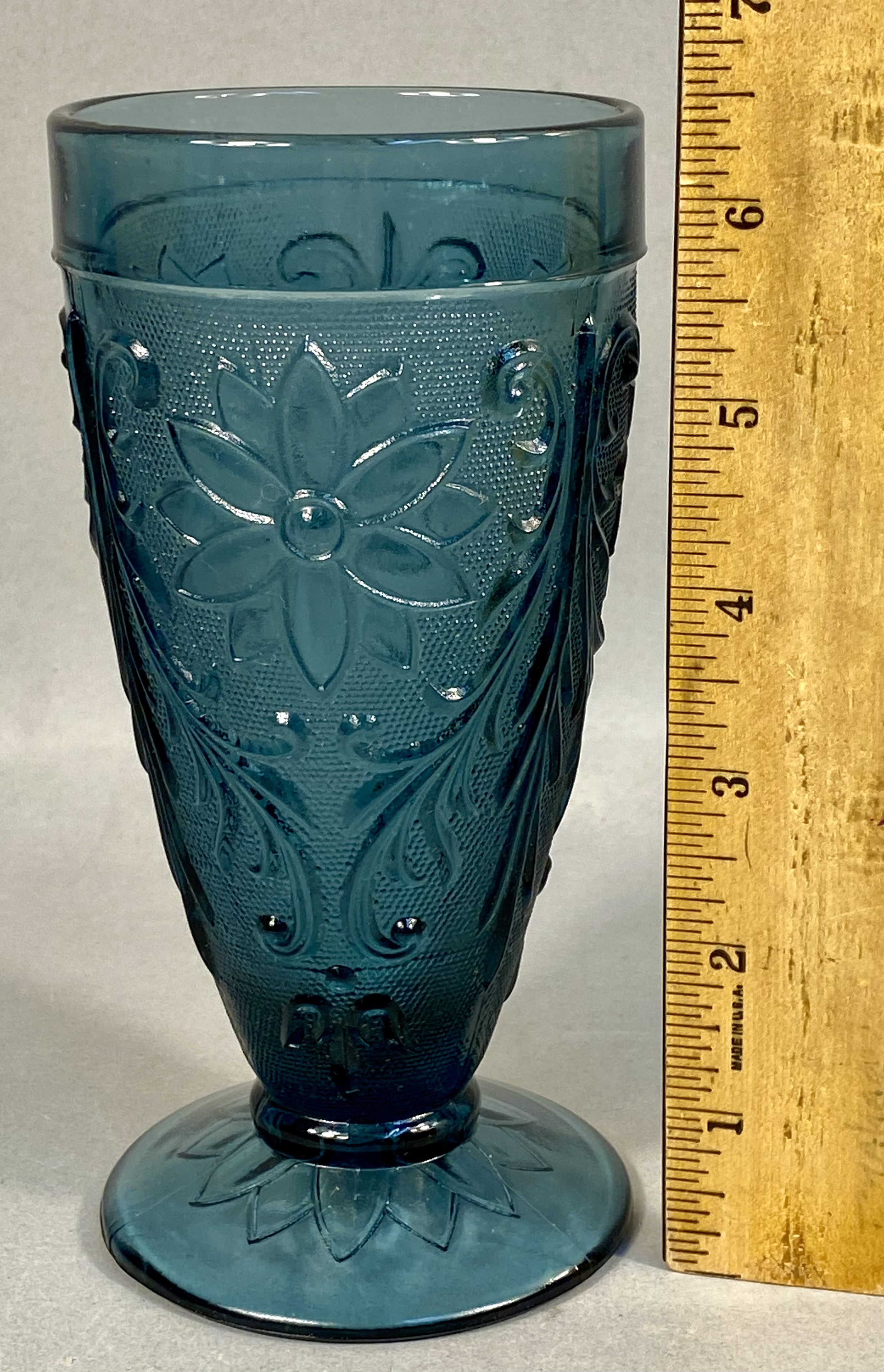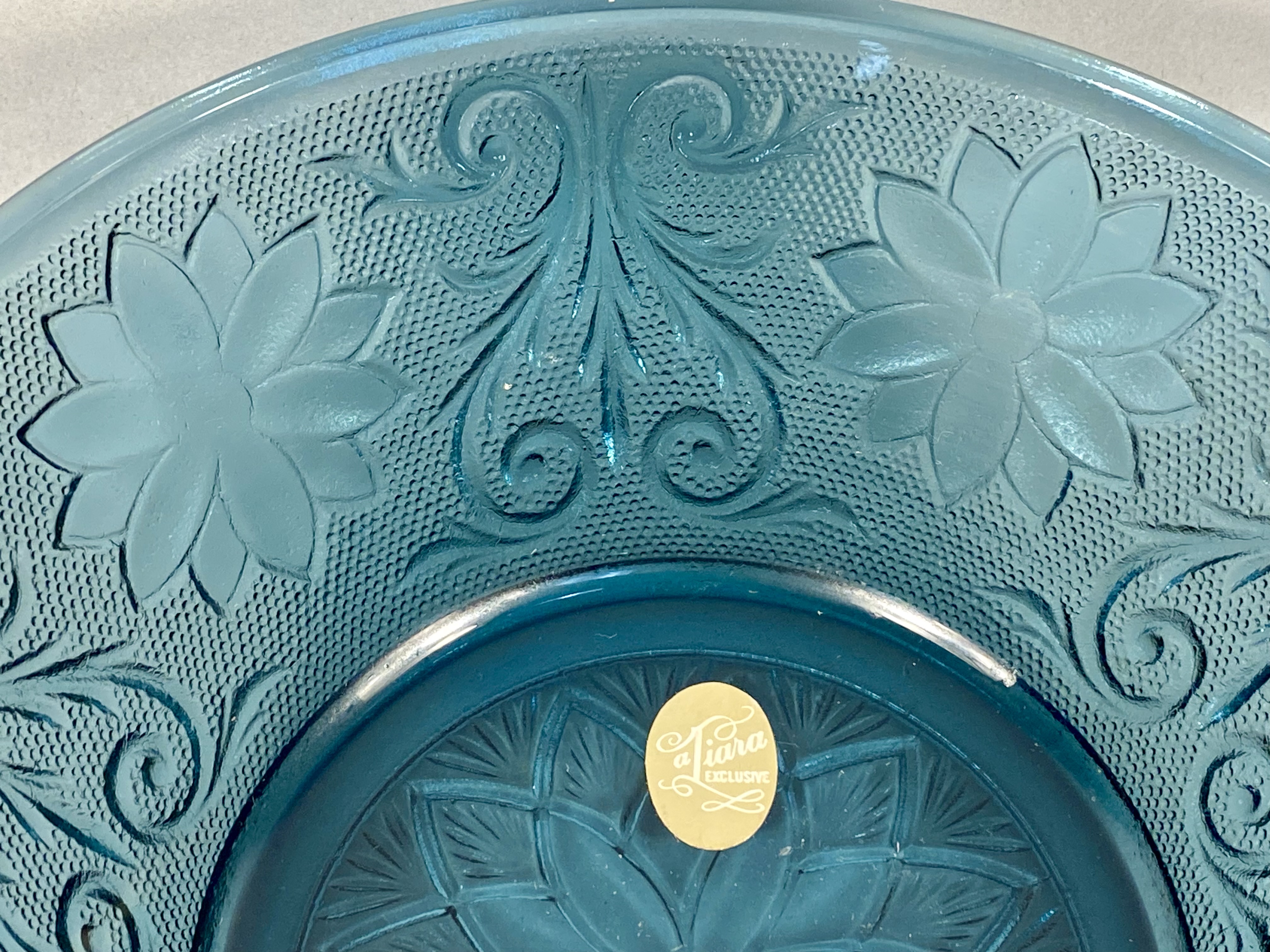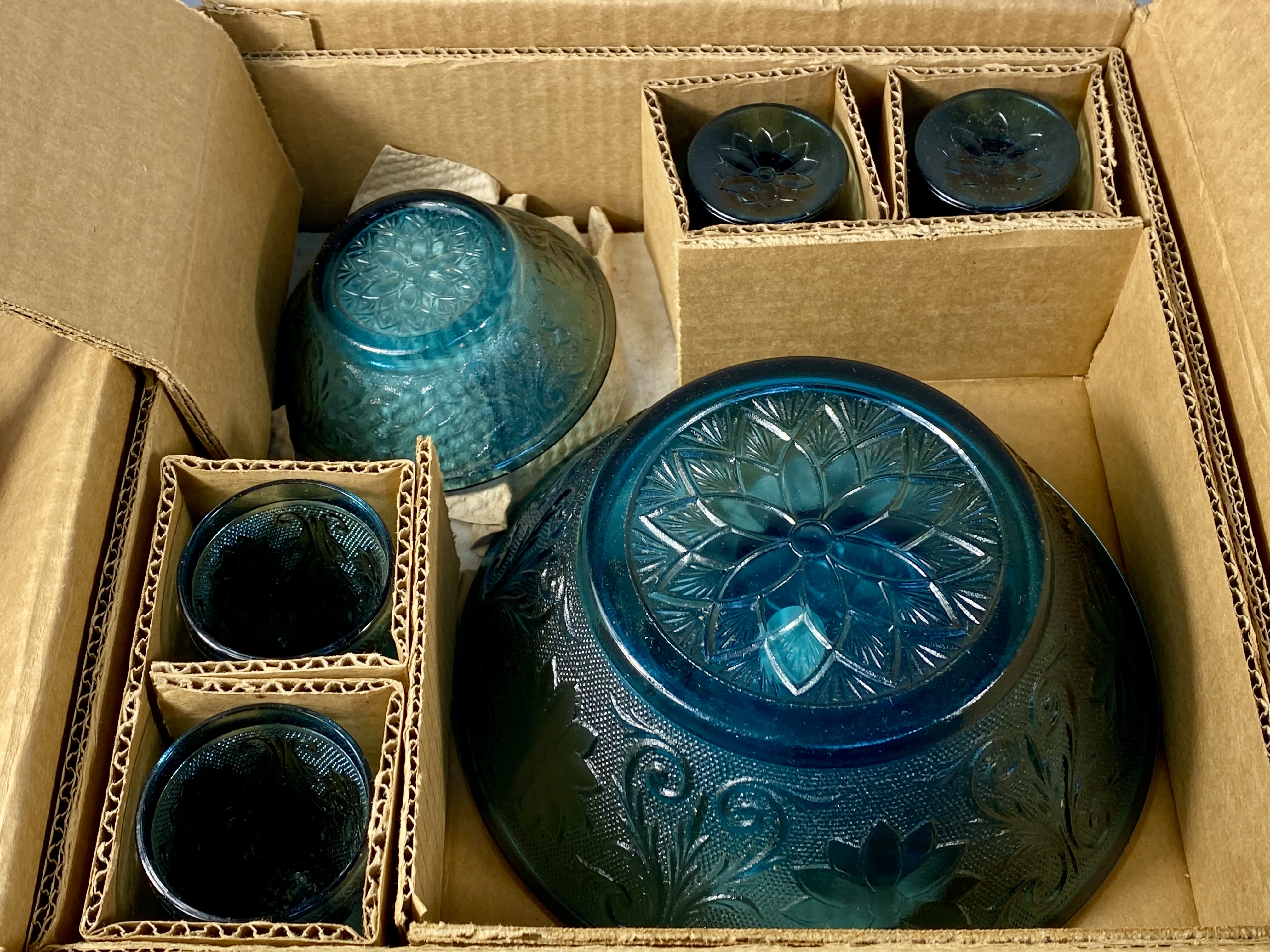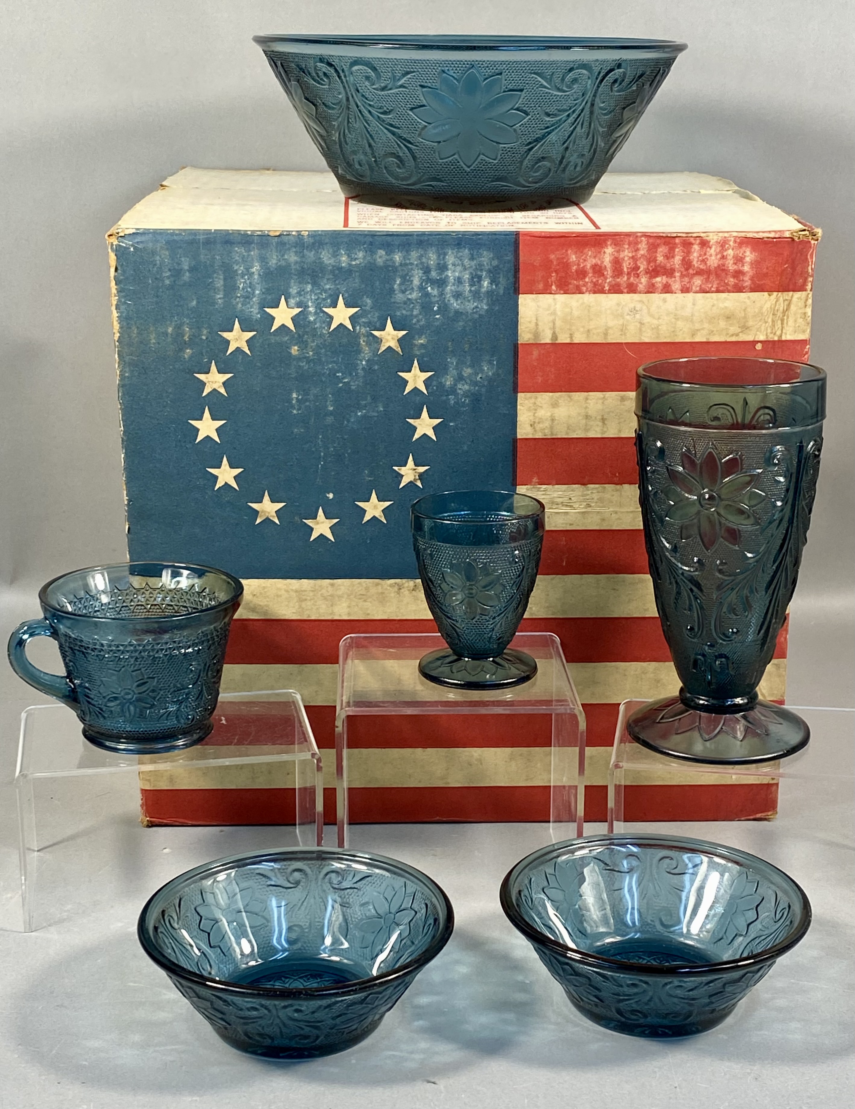 A collection of teal blue pressed glassware produced for Tiara Exclusives in the Park Lane pattern, manufactured by Indiana Glass. The assortment features embossed floral and scrollwork motifs set against a stippled ground. The group includes a large serving bowl, four smaller bowls, four footed tumblers, and four handled cups. One piece retains the original gold foil manufacturer sticker which reads a Tiara EXCLUSIVE. The set is housed in its original cardboard storage box decorated with a patriotic red, white, and blue thirteen-star flag design and stamped with 10246 / AM/SET / ASSORTMENT.