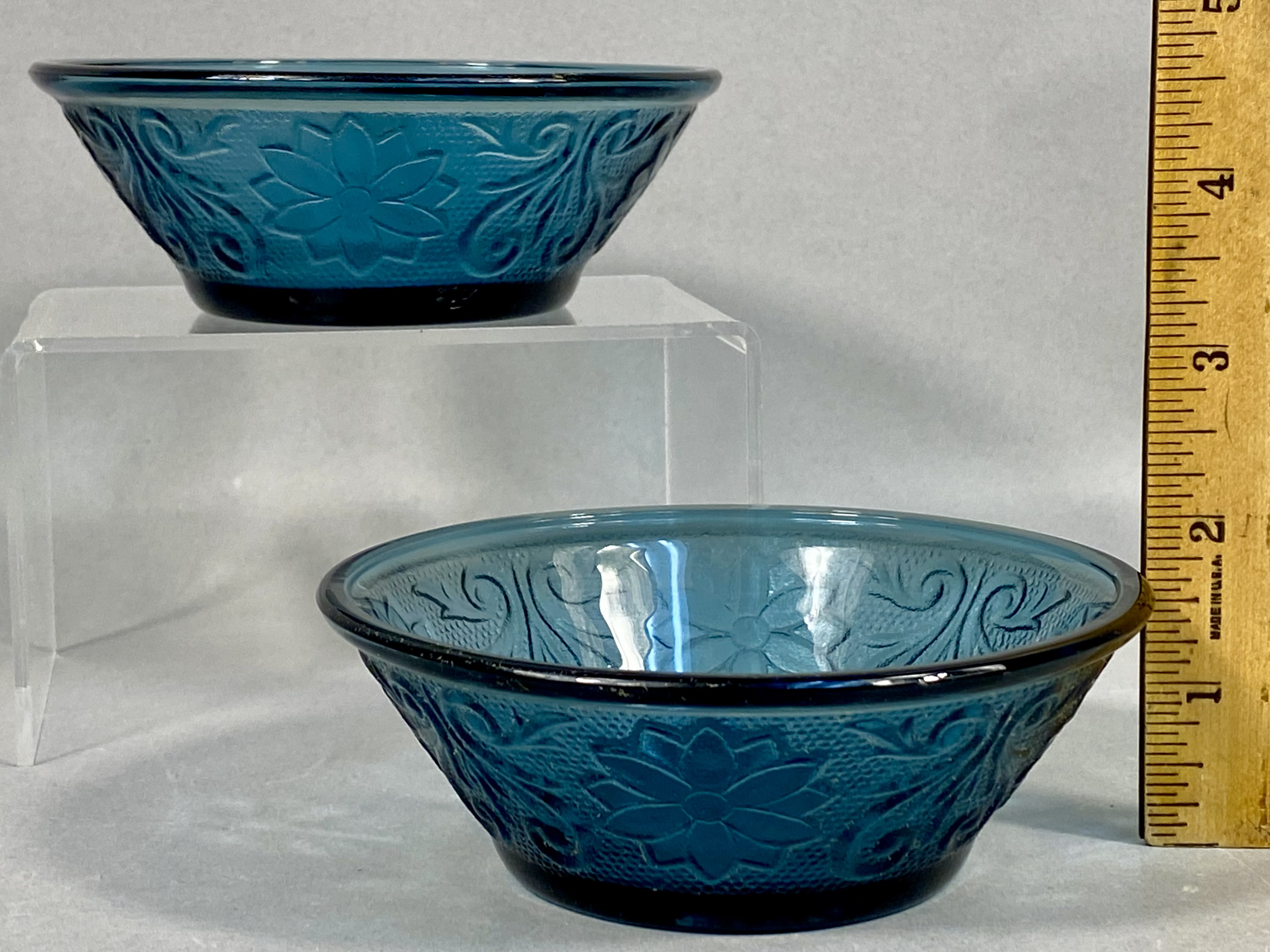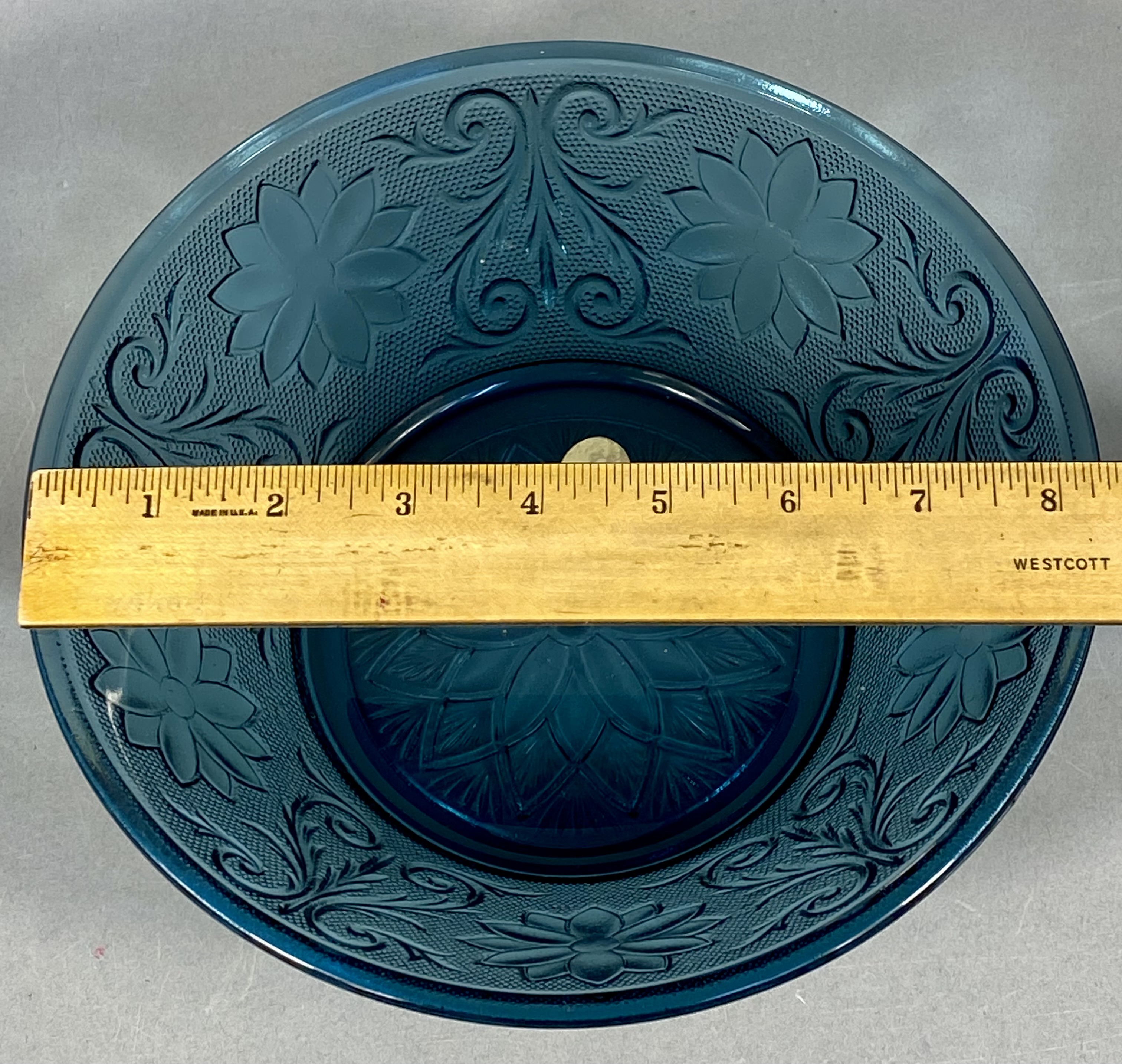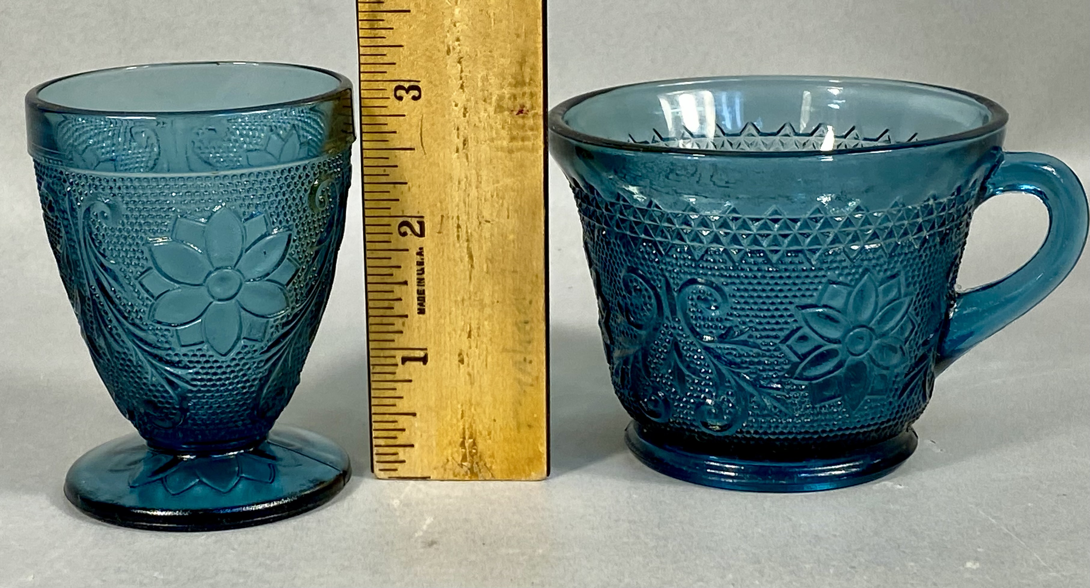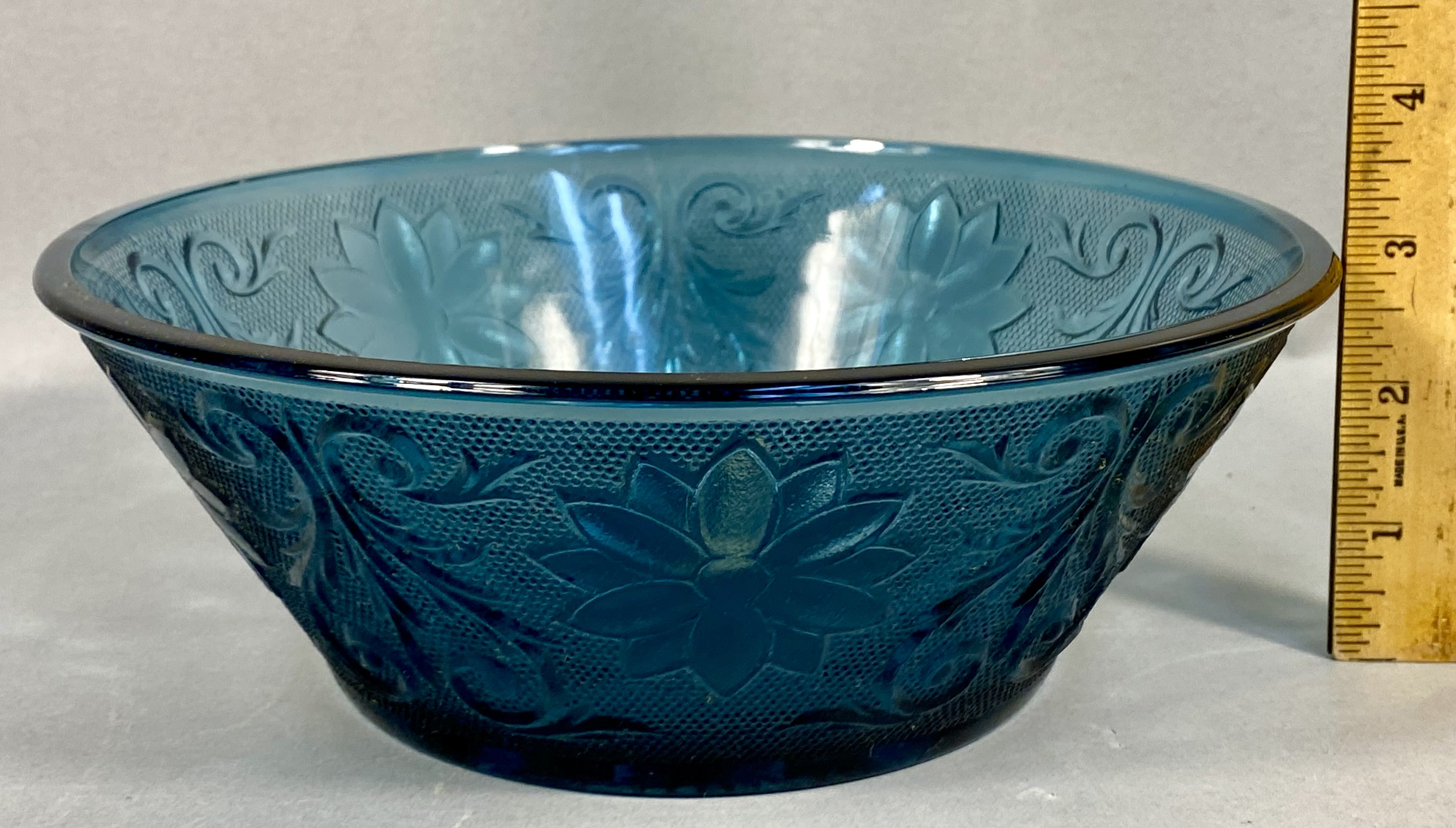 A collection of teal blue pressed glassware produced for Tiara Exclusives in the Park Lane pattern, manufactured by Indiana Glass. The assortment features embossed floral and scrollwork motifs set against a stippled ground. The group includes a large serving bowl, four smaller bowls, four footed tumblers, and four handled cups. One piece retains the original gold foil manufacturer sticker which reads a Tiara EXCLUSIVE. The set is housed in its original cardboard storage box decorated with a patriotic red, white, and blue thirteen-star flag design and stamped with 10246 / AM/SET / ASSORTMENT.