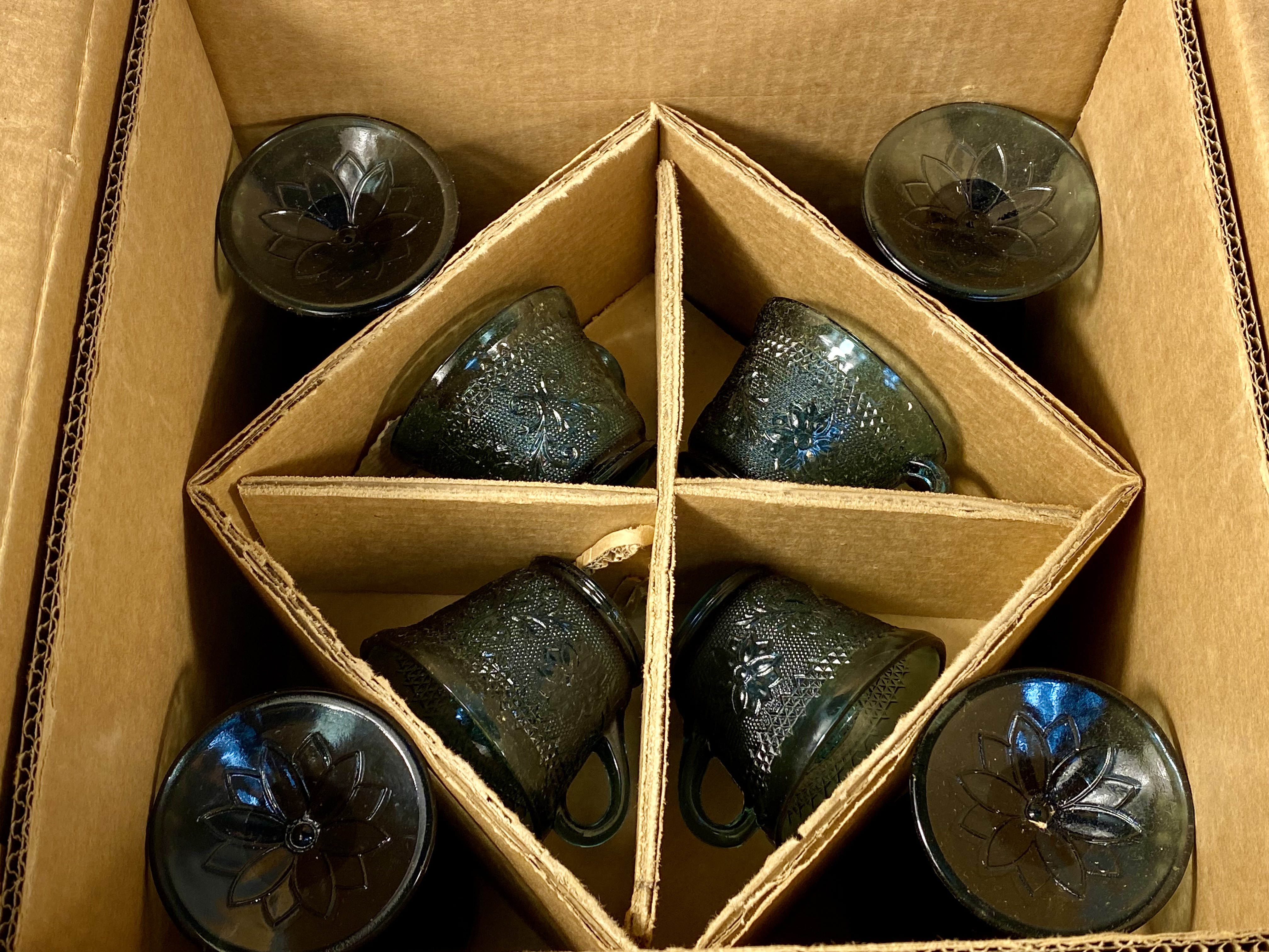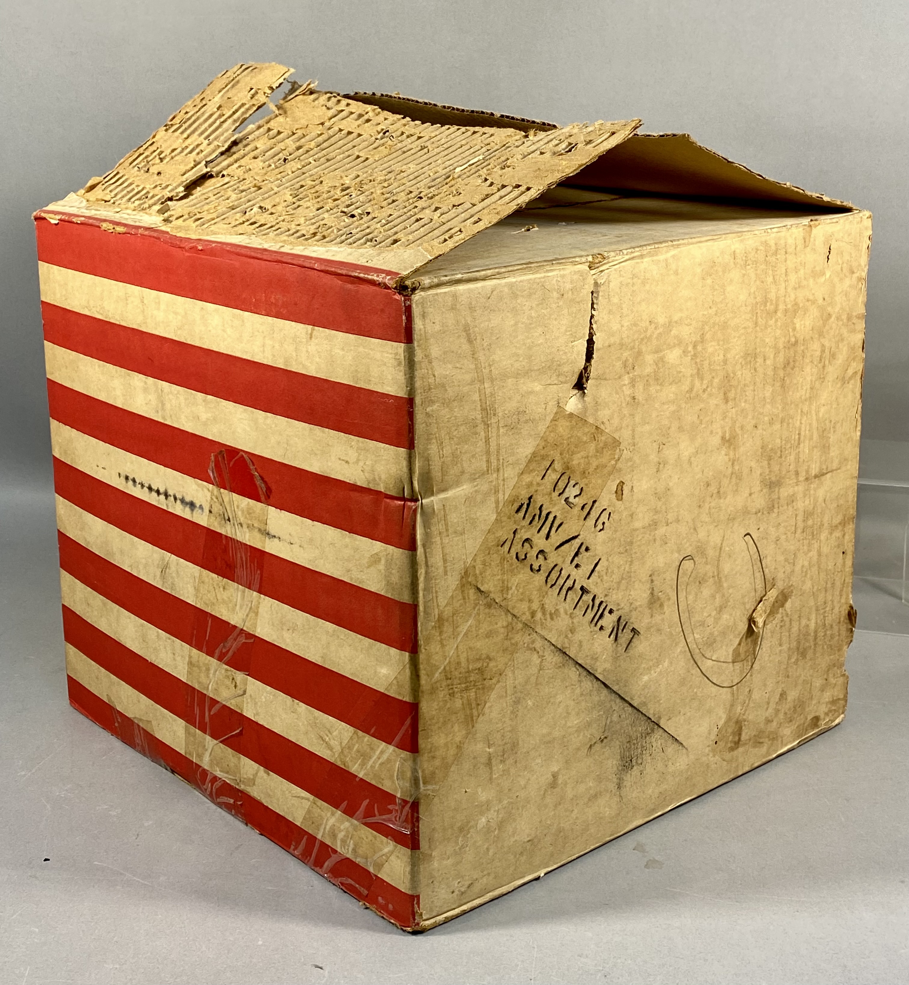 The glassware appears to be in excellent, unused condition with no visible chips or cracks. The original cardboard packaging shows significant wear, including tearing, moisture staining, and structural damage consistent with age and storage.