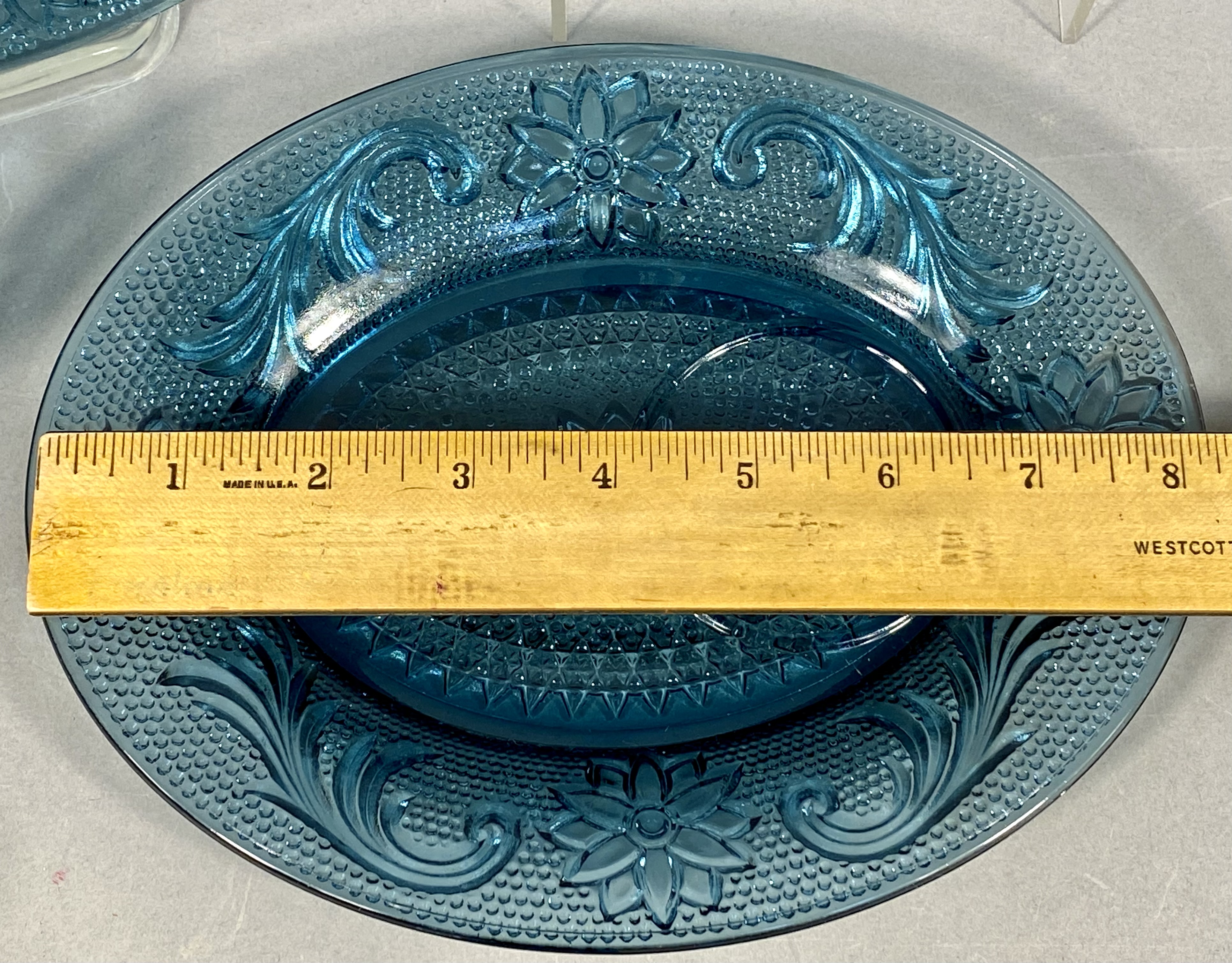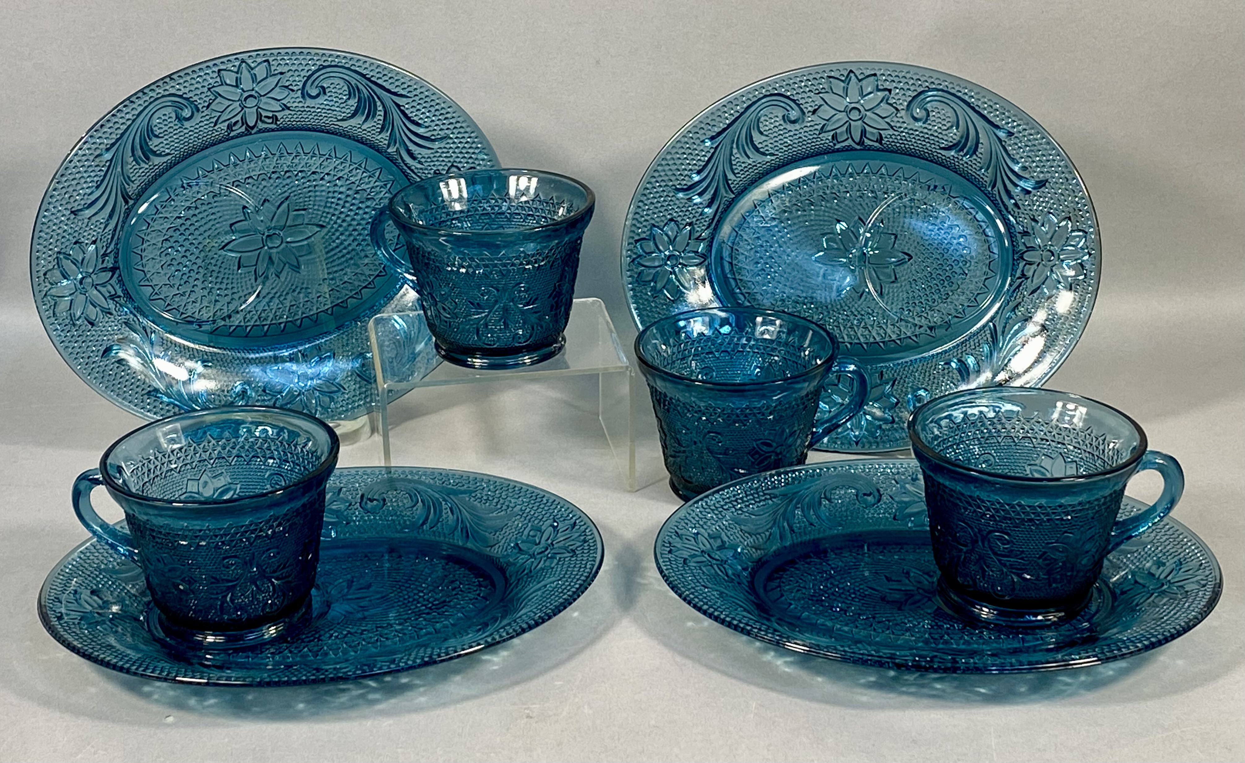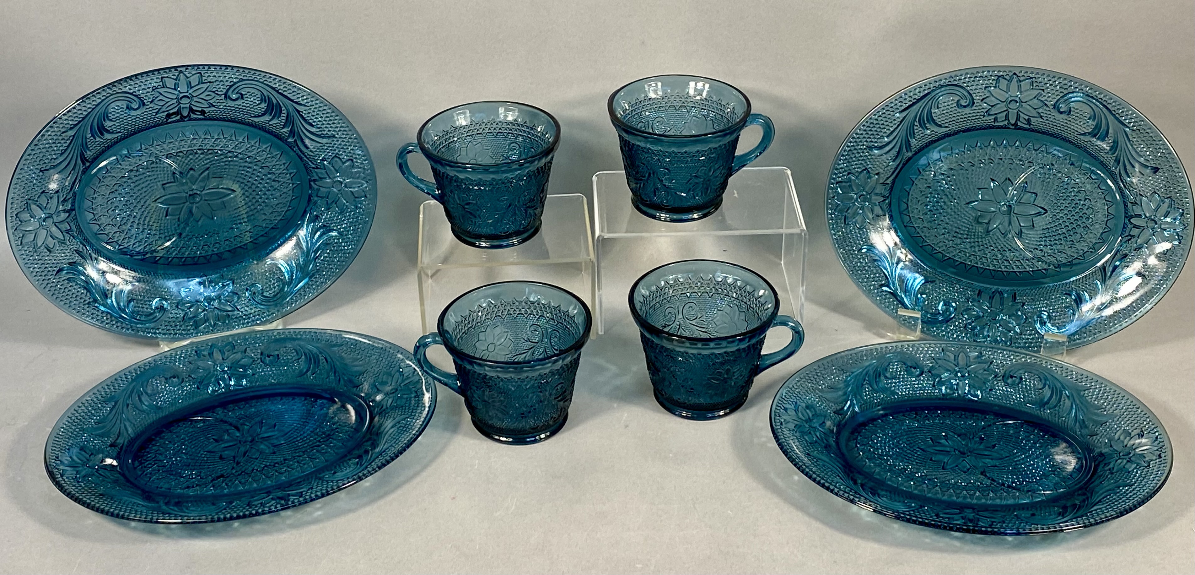 A vintage pressed glass snack set featuring the “Sandwich” pattern, attributed to Indiana Glass for Tiara Exclusives. This eight-piece collection is rendered in a deep teal blue, a color variation often identified as “Colonial Blue” in period catalogs. The design features embossed central floral motifs surrounded by scrolling acanthus-style leaves set against a stippled or “pebbled” background. The rims of the oval plates and the upper bodies of the cups are finished with a geometric diamond lattice border. This set was produced in the United States during the mid-to-late 20th century as part of a popular revival of early American pressed glass styles.