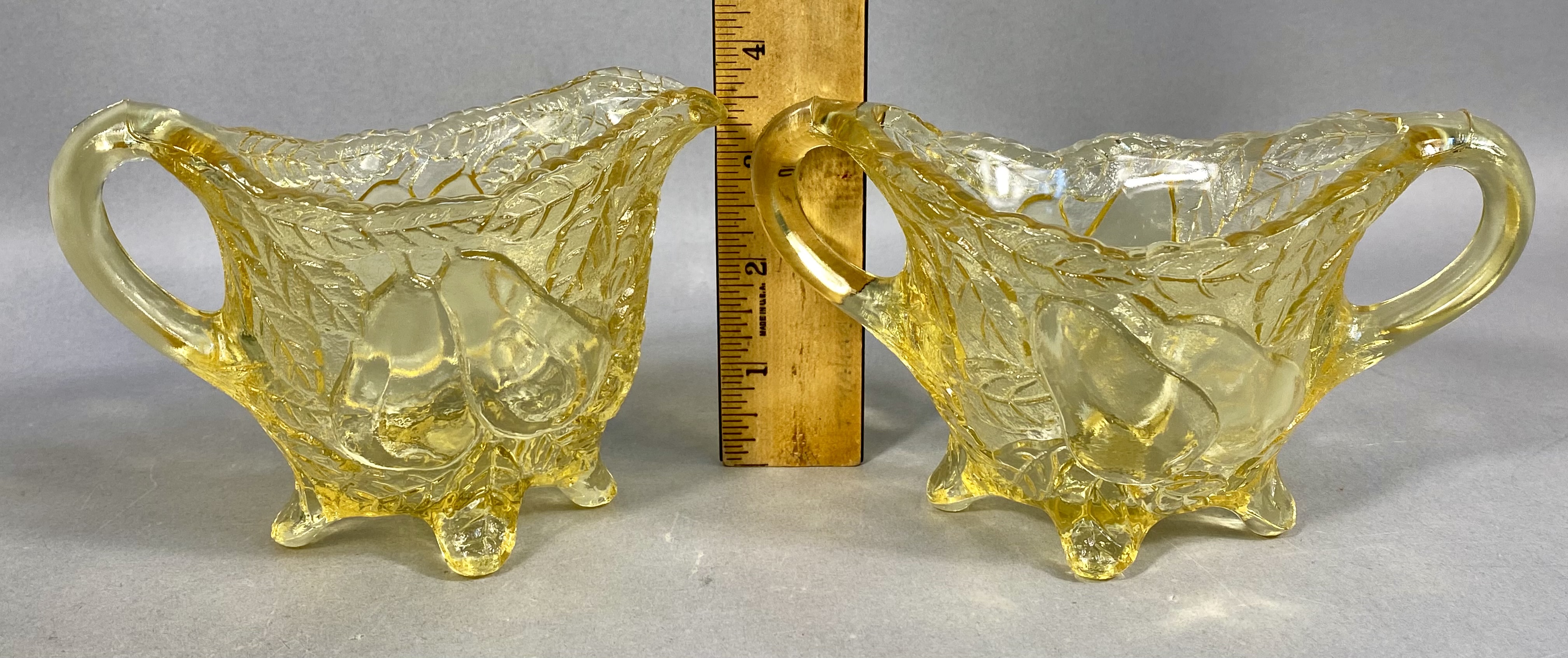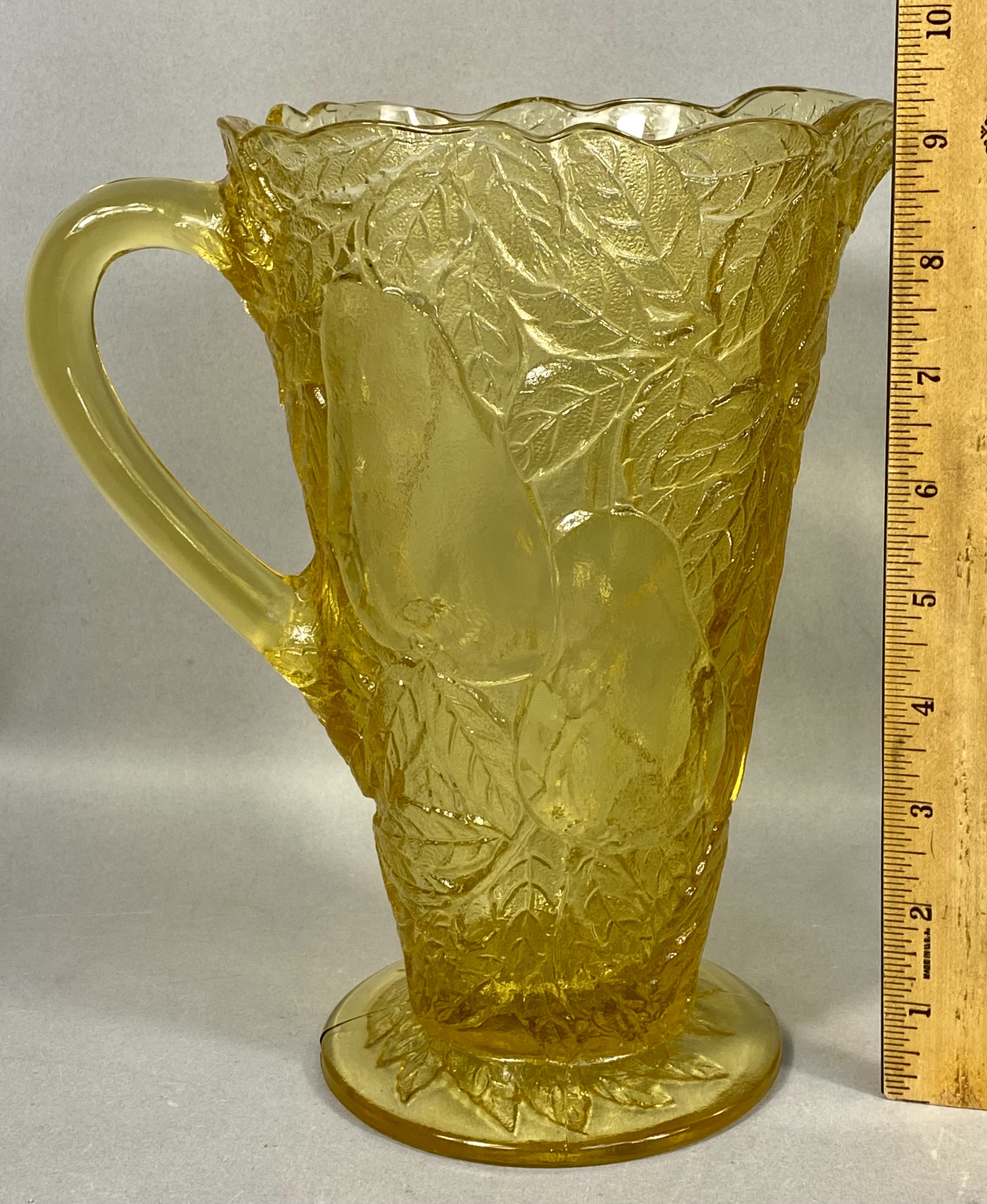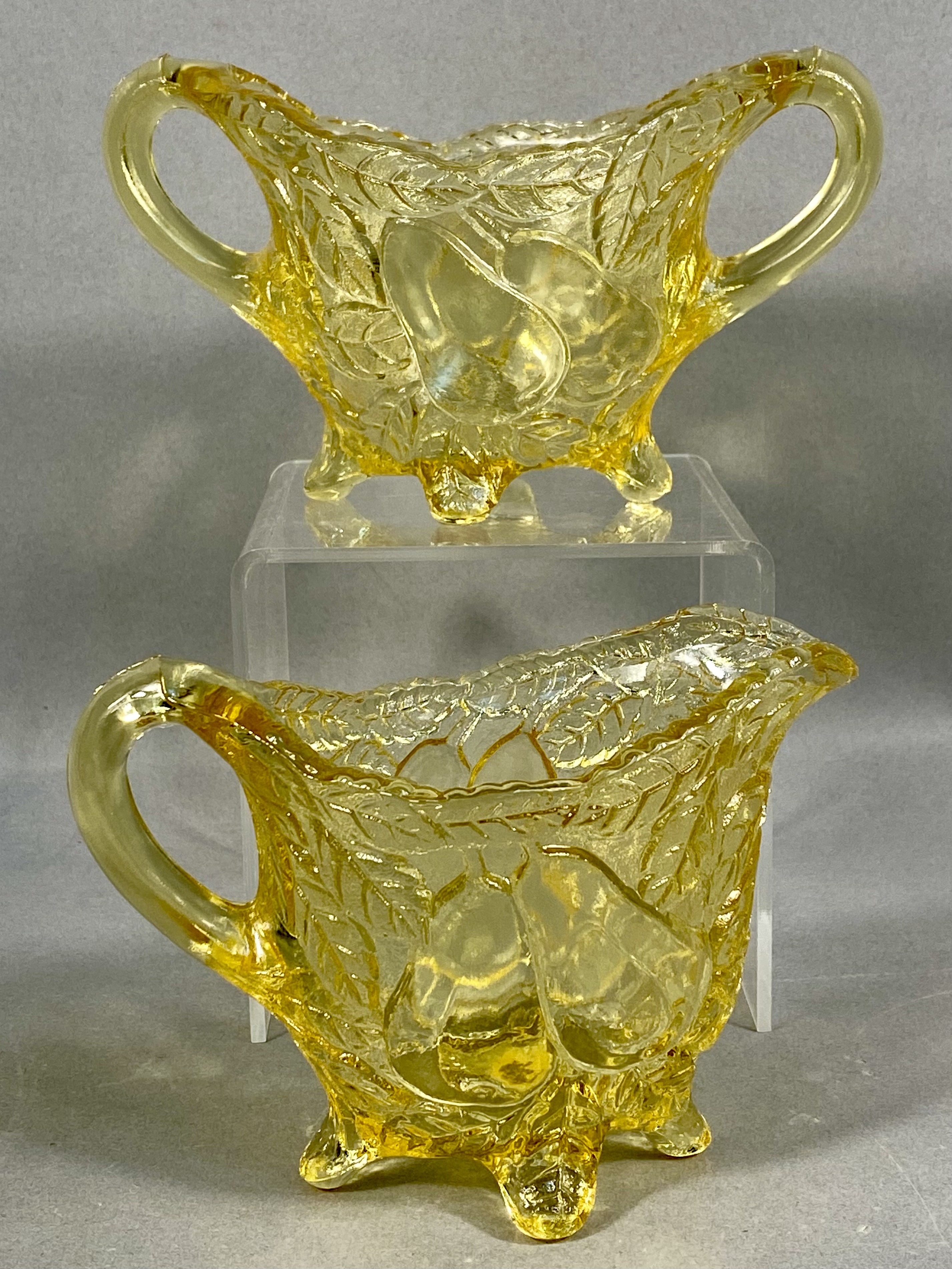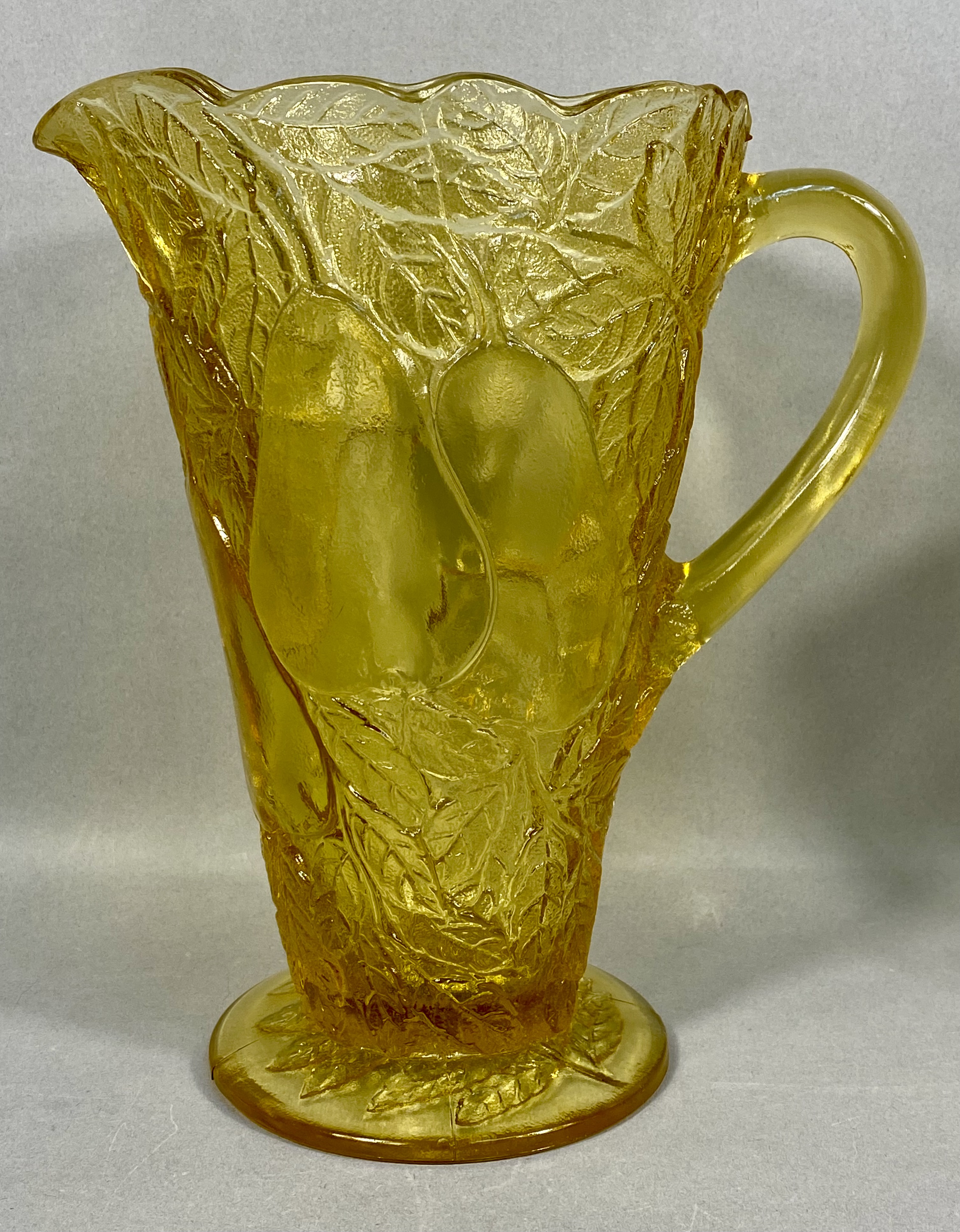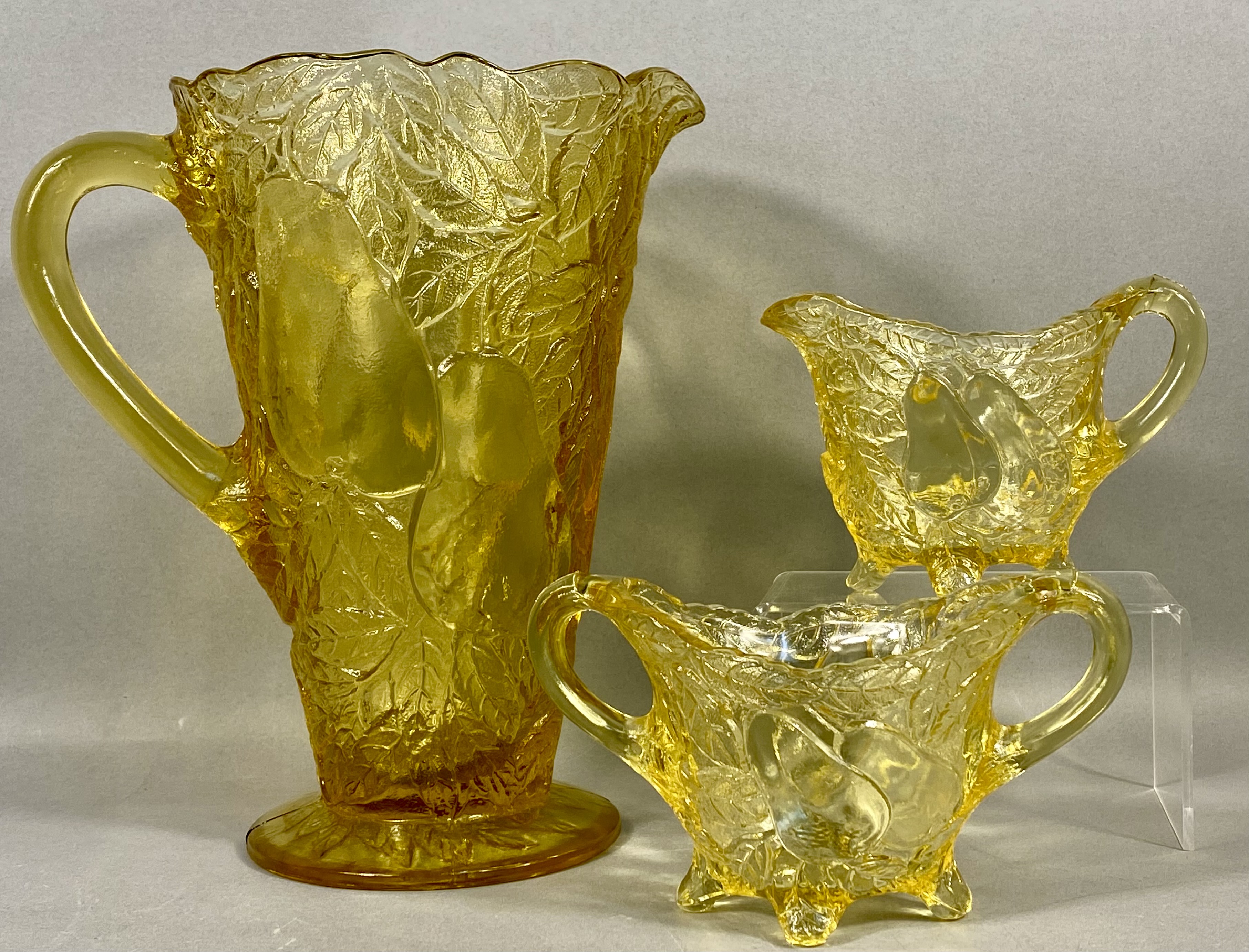 A three-piece collection of transparent yellow pressed glass tableware, comprising a tall pitcher, a creamer, and a double-handled open sugar bowl. Each vessel is decorated with a high-relief molded pattern of pears and leaves set against a stippled ground. The pitcher features a scalloped rim and a circular footed base, while the smaller service pieces are supported by four molded feet. This set is characteristic of mid-20th century American pressed glass, resembling patterns produced by the Indiana Glass Company. No maker marks are present.