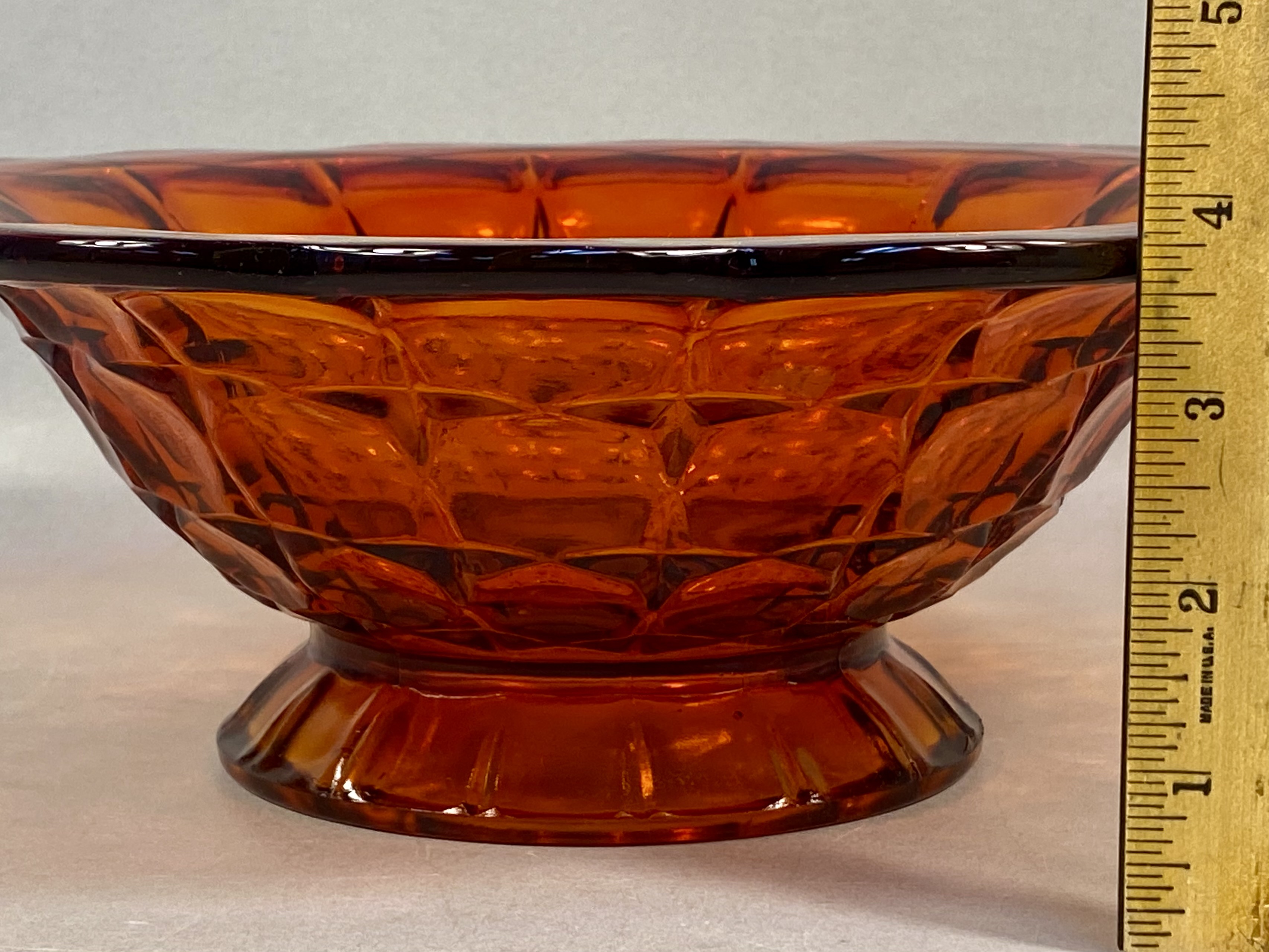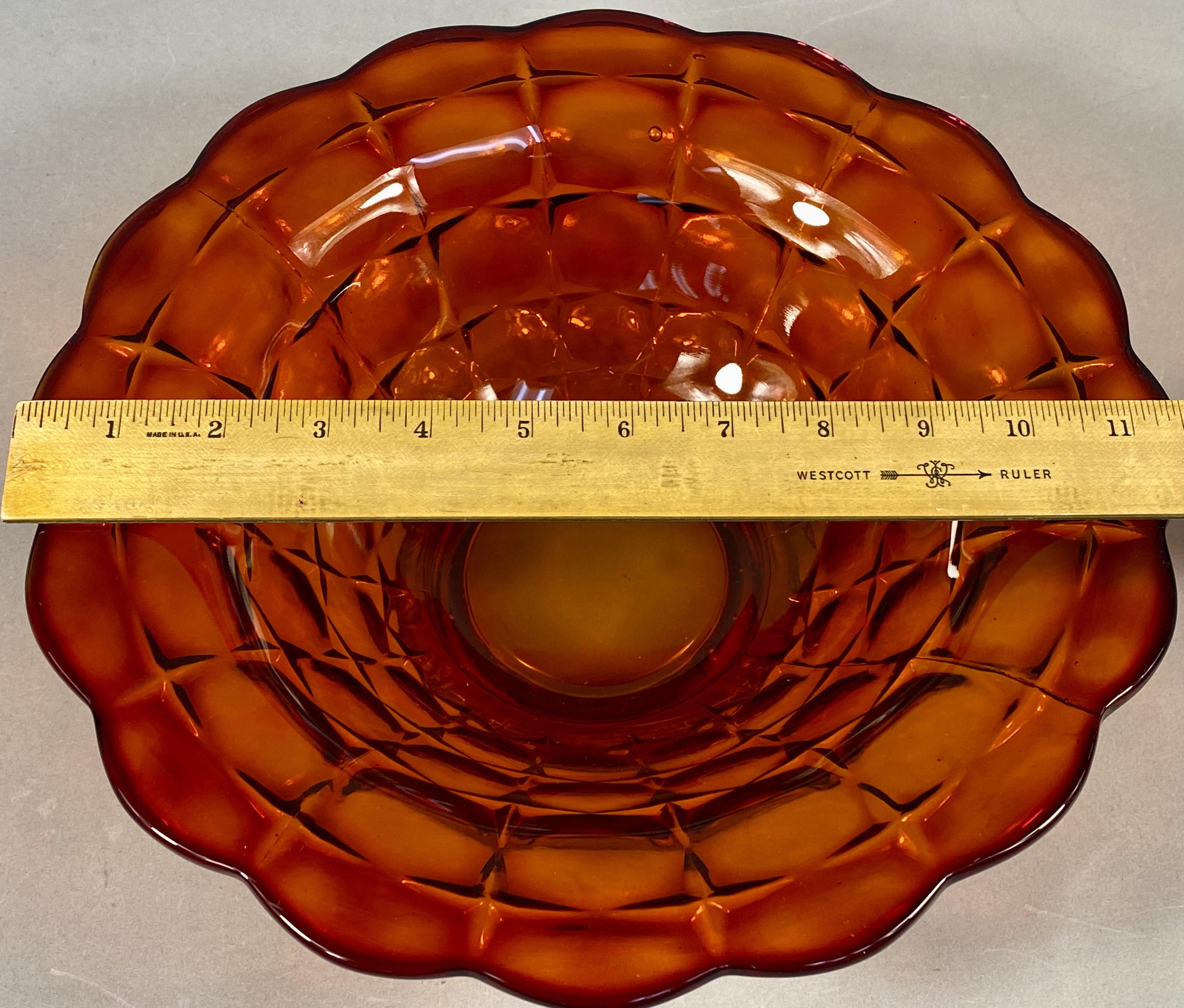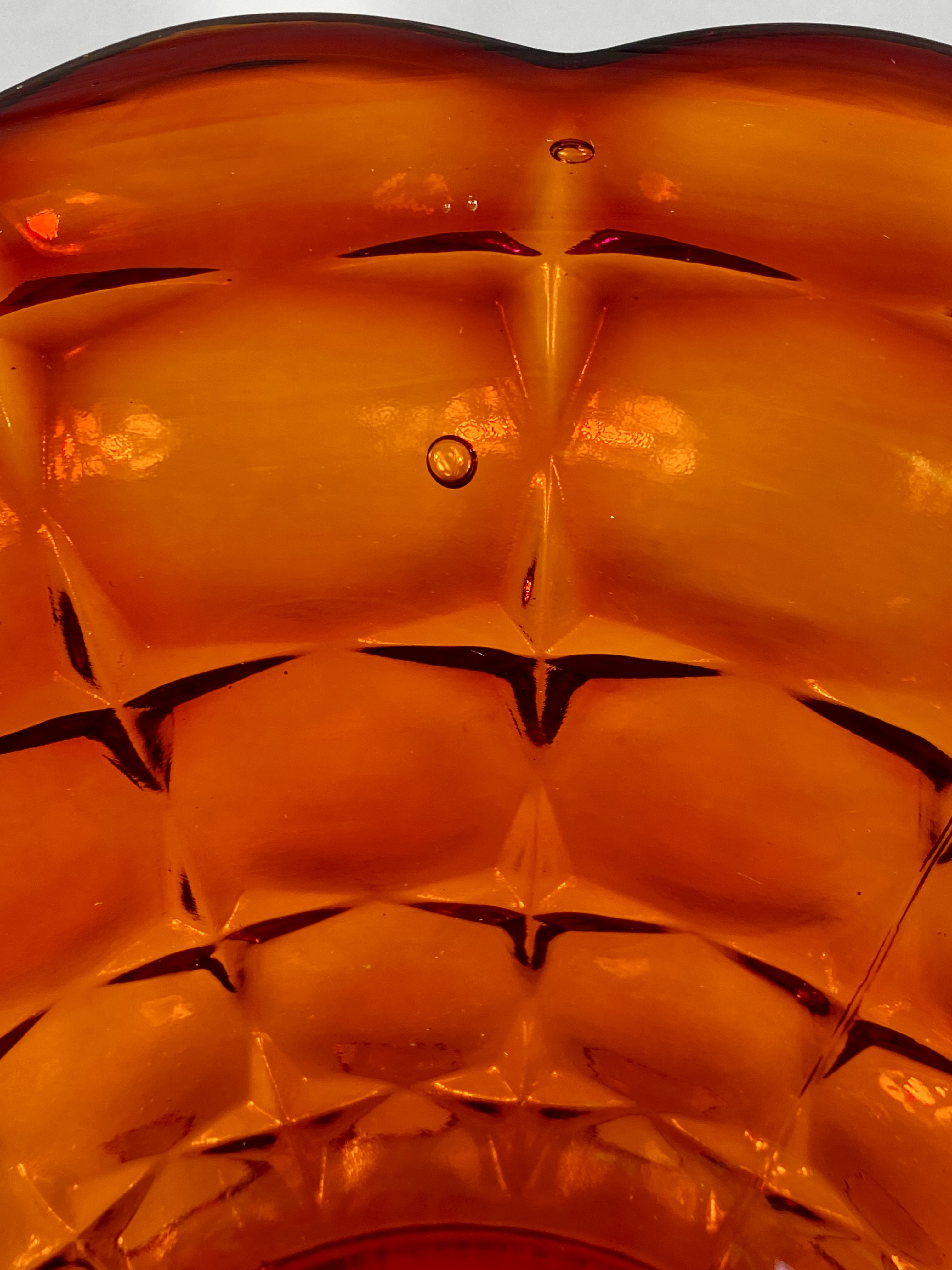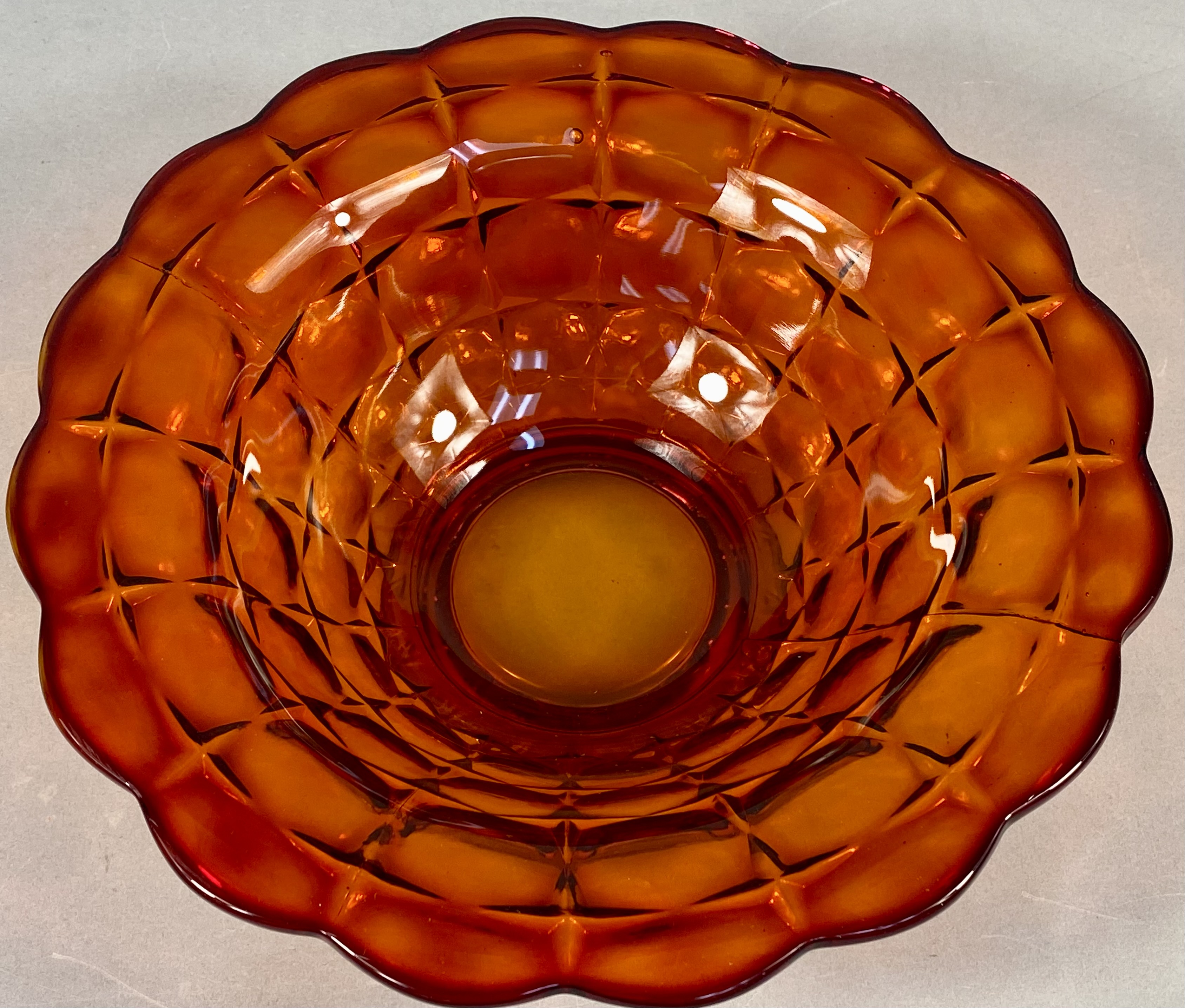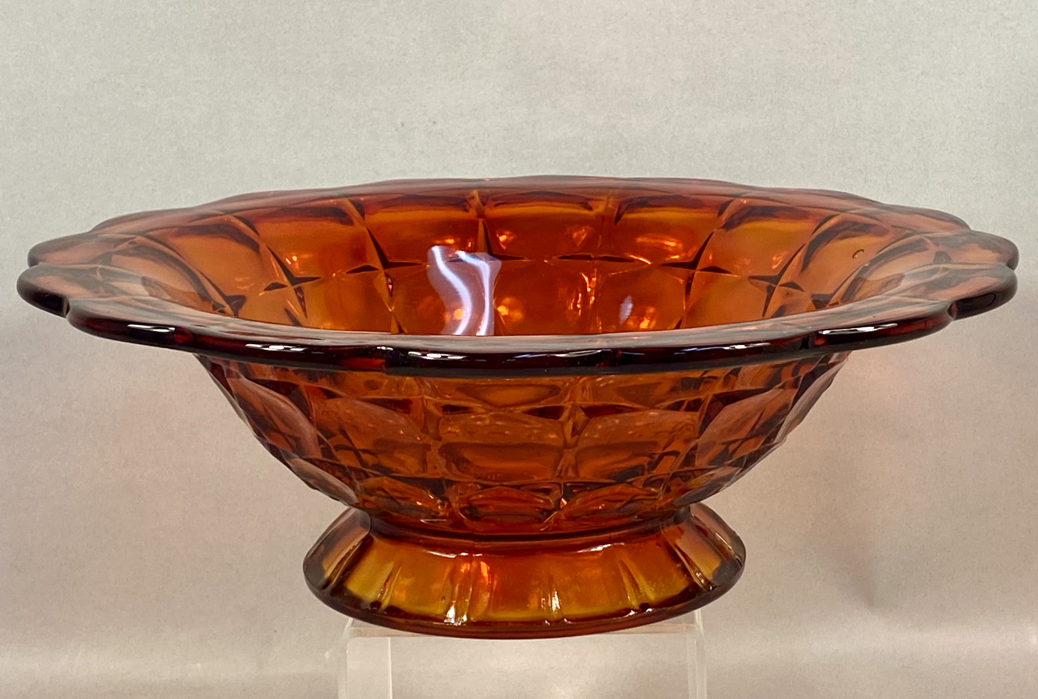 This vintage footed bowl is crafted from transparent amber-toned pressed glass featuring the Moon and Stars pattern, a design characterized by circular depressions and starburst motifs. The piece is styled with a broad scalloped rim and a fluted pedestal base. While no maker marks are present, this pattern is widely attributed to American manufacturers such as L.E. Smith and Tiara Glassware, typically dating to the 1960s. The glass exhibits characteristic manufacturing seeds, which are small internal air bubbles common in pressed glass from this period.