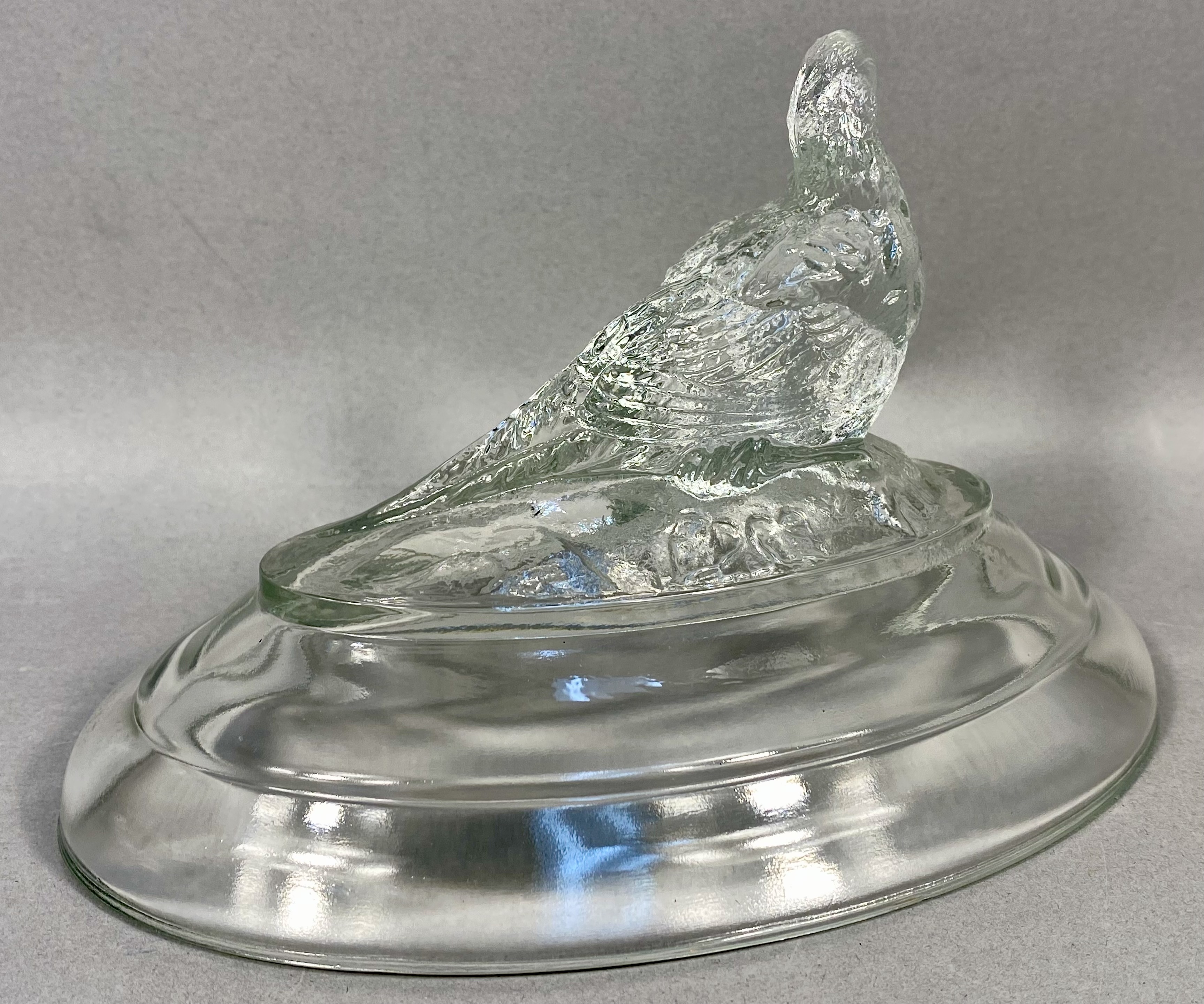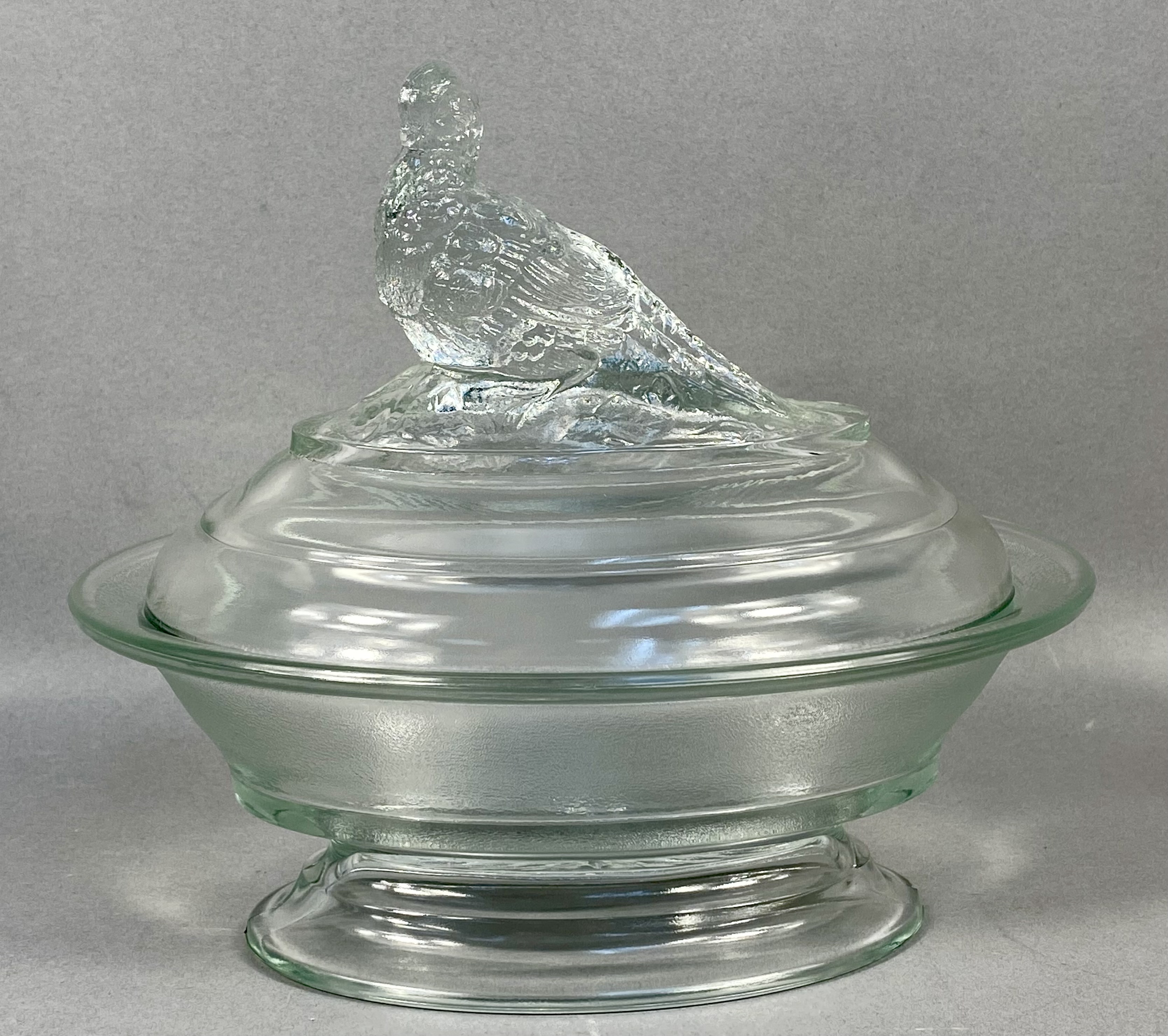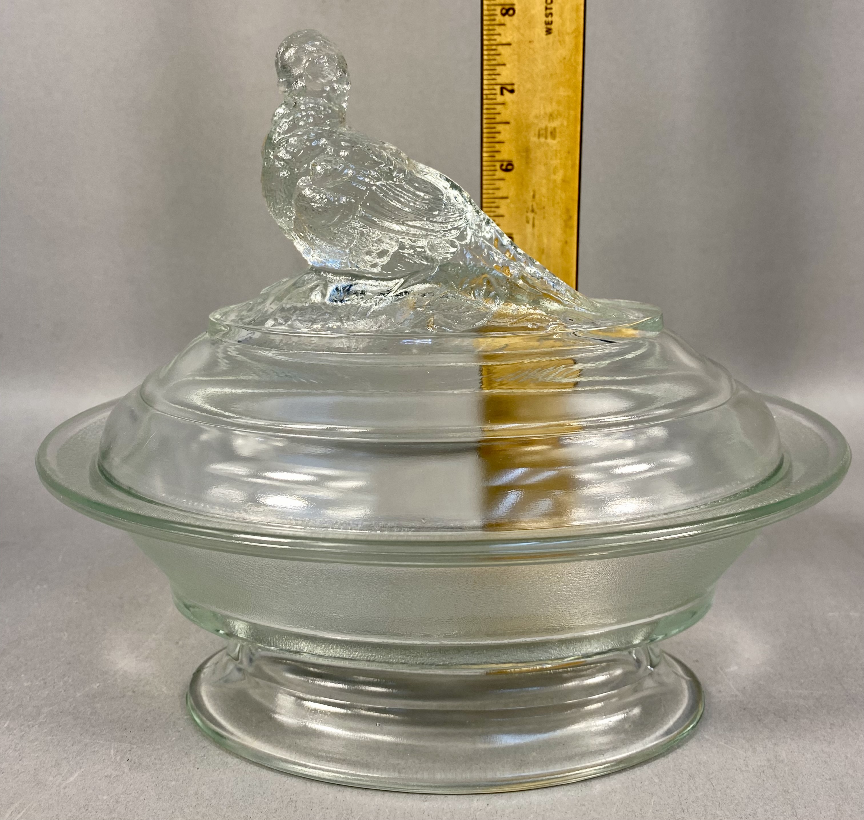 This two-piece clear pressed glass covered compote is a product of the Imperial Glass Corporation. The decorative lid is designed with concentric molded rings and is surmounted by a textured figural finial depicting a bird, likely a quail or partridge. The flared, footed base features a stippled or frosted-texture exterior surface, while the interior remains smooth. On the underside of the base, the piece bears the embossed Imperial Glass Corporation mark, featuring a capital letter I superimposed over a capital letter G. This mark was used by the company beginning in the mid-20th century. The item reflects the mid-century American tradition of figural “animal on nest” glassware.