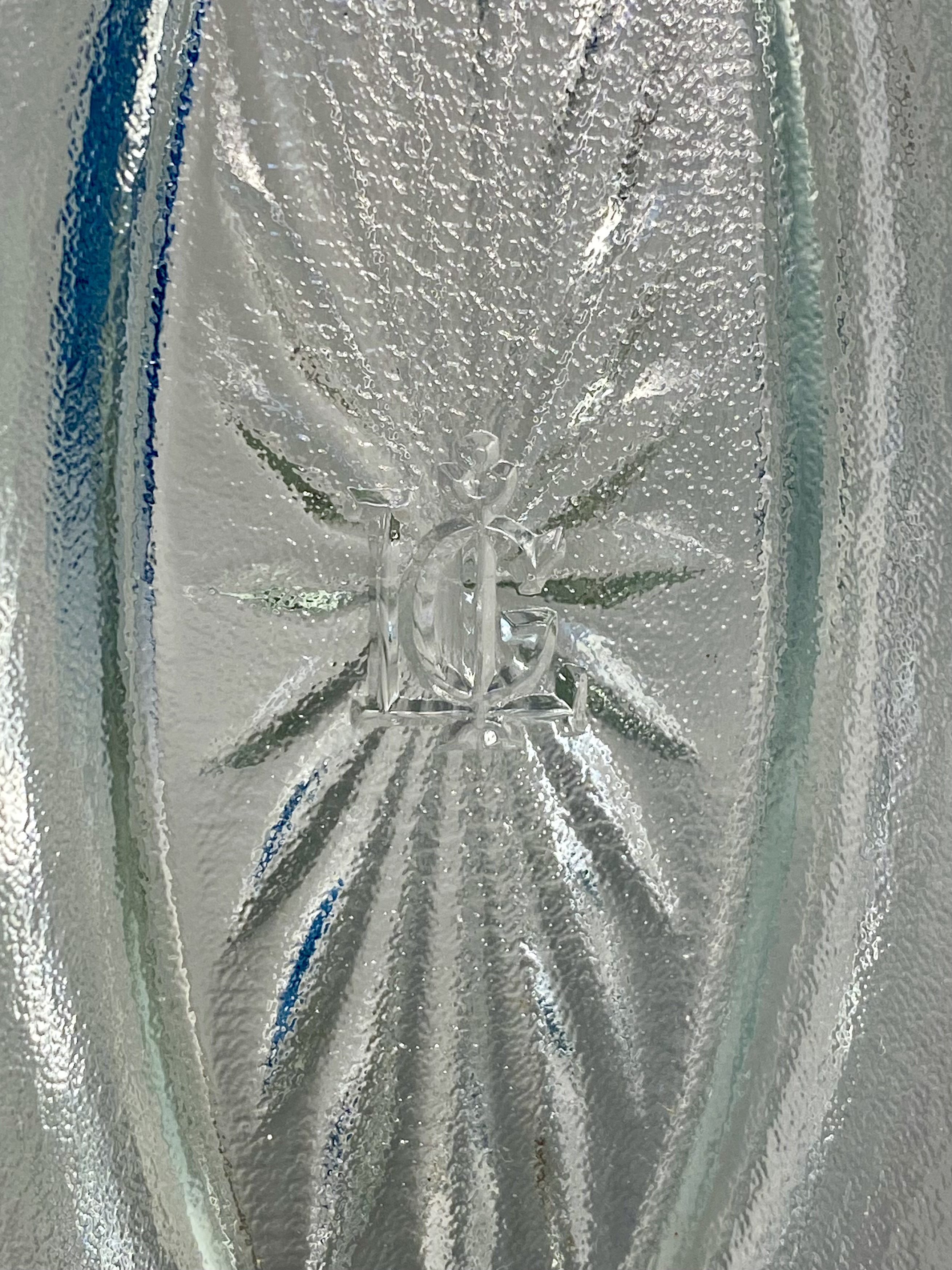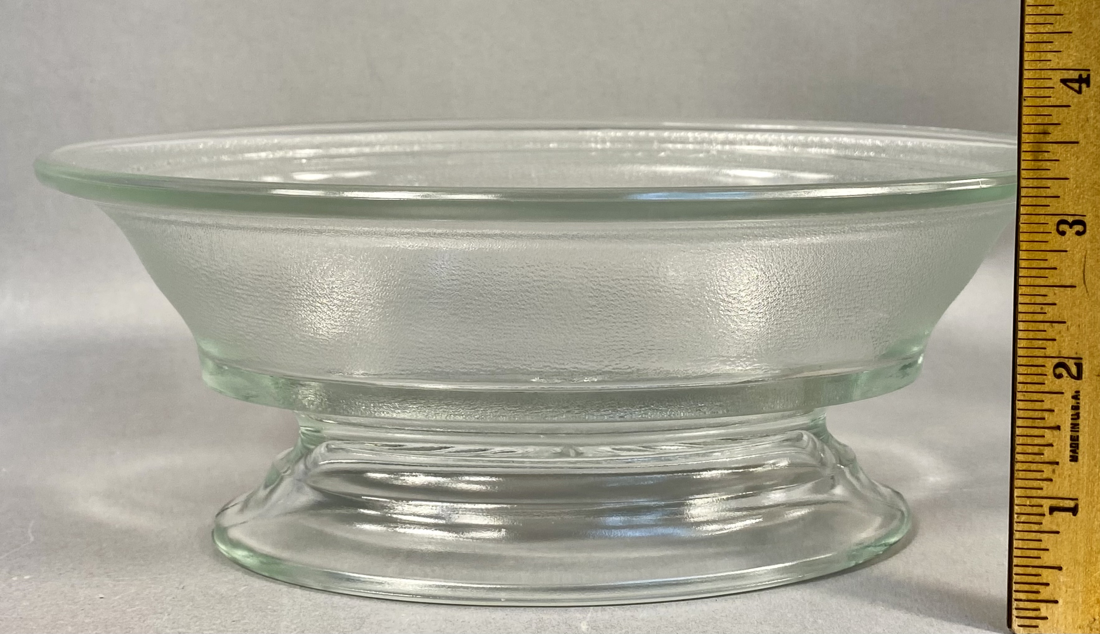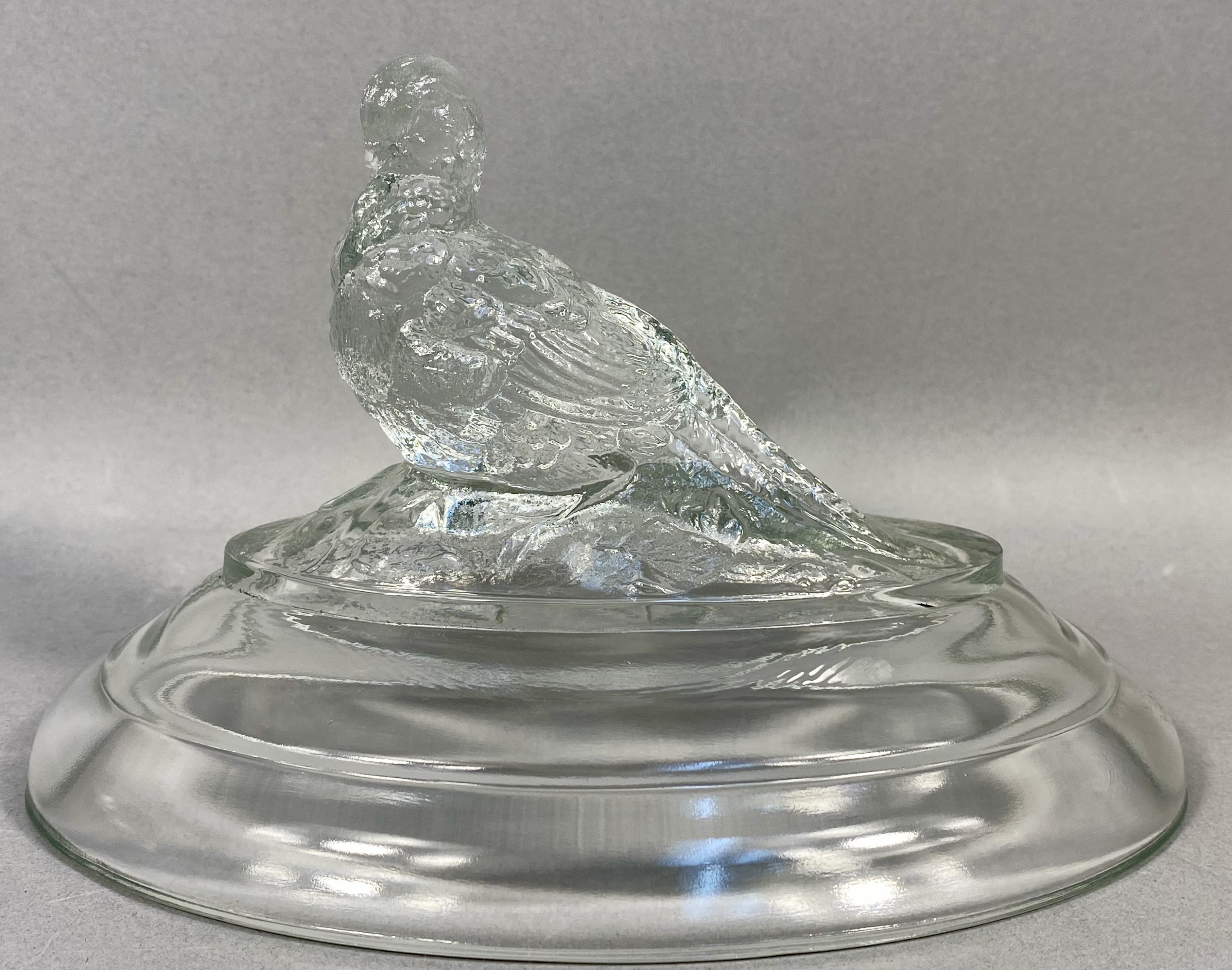 This two-piece clear pressed glass covered compote is a product of the Imperial Glass Corporation. The decorative lid is designed with concentric molded rings and is surmounted by a textured figural finial depicting a bird, likely a quail or partridge. The flared, footed base features a stippled or frosted-texture exterior surface, while the interior remains smooth. On the underside of the base, the piece bears the embossed Imperial Glass Corporation mark, featuring a capital letter I superimposed over a capital letter G. This mark was used by the company beginning in the mid-20th century. The item reflects the mid-century American tradition of figural “animal on nest” glassware.