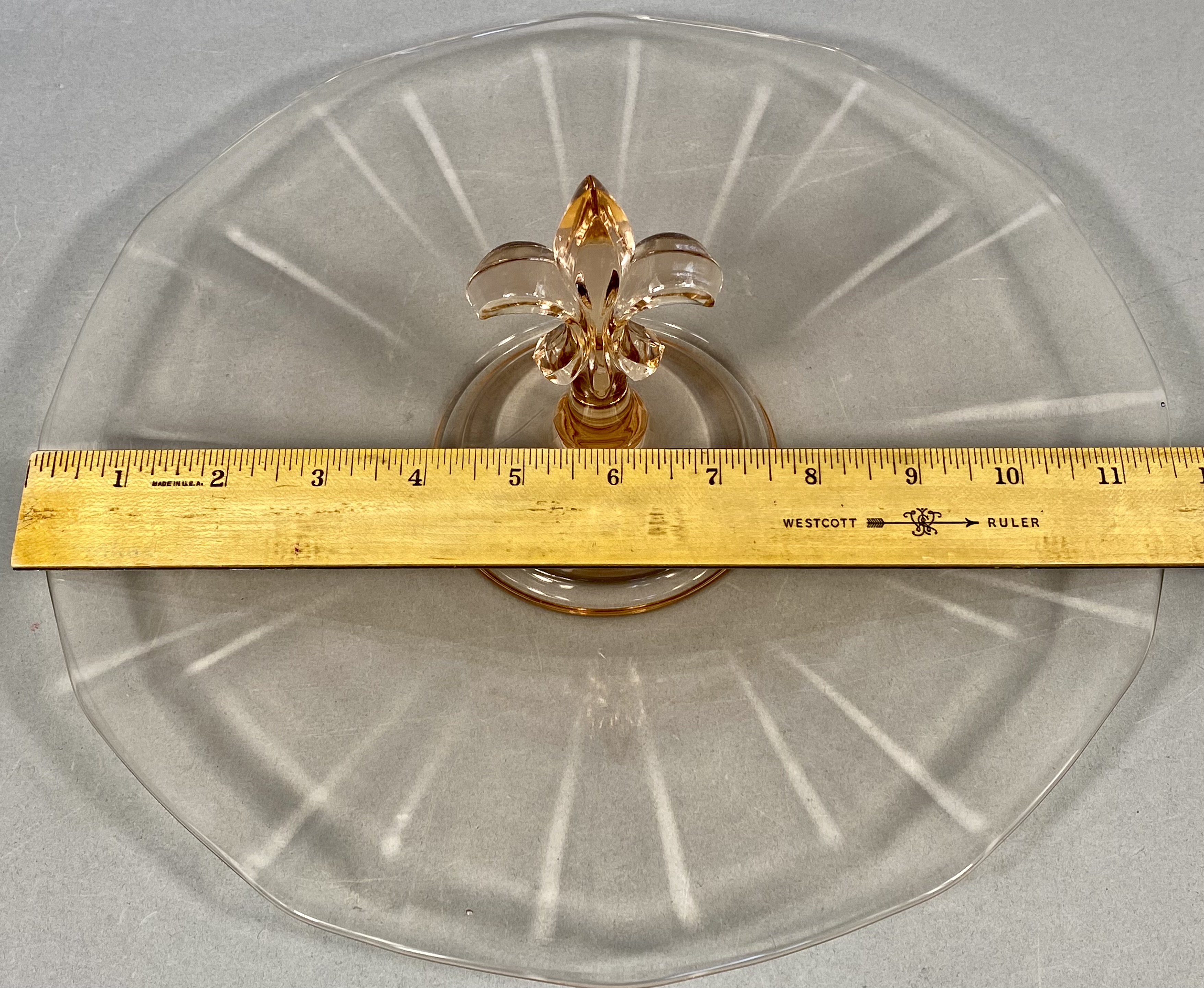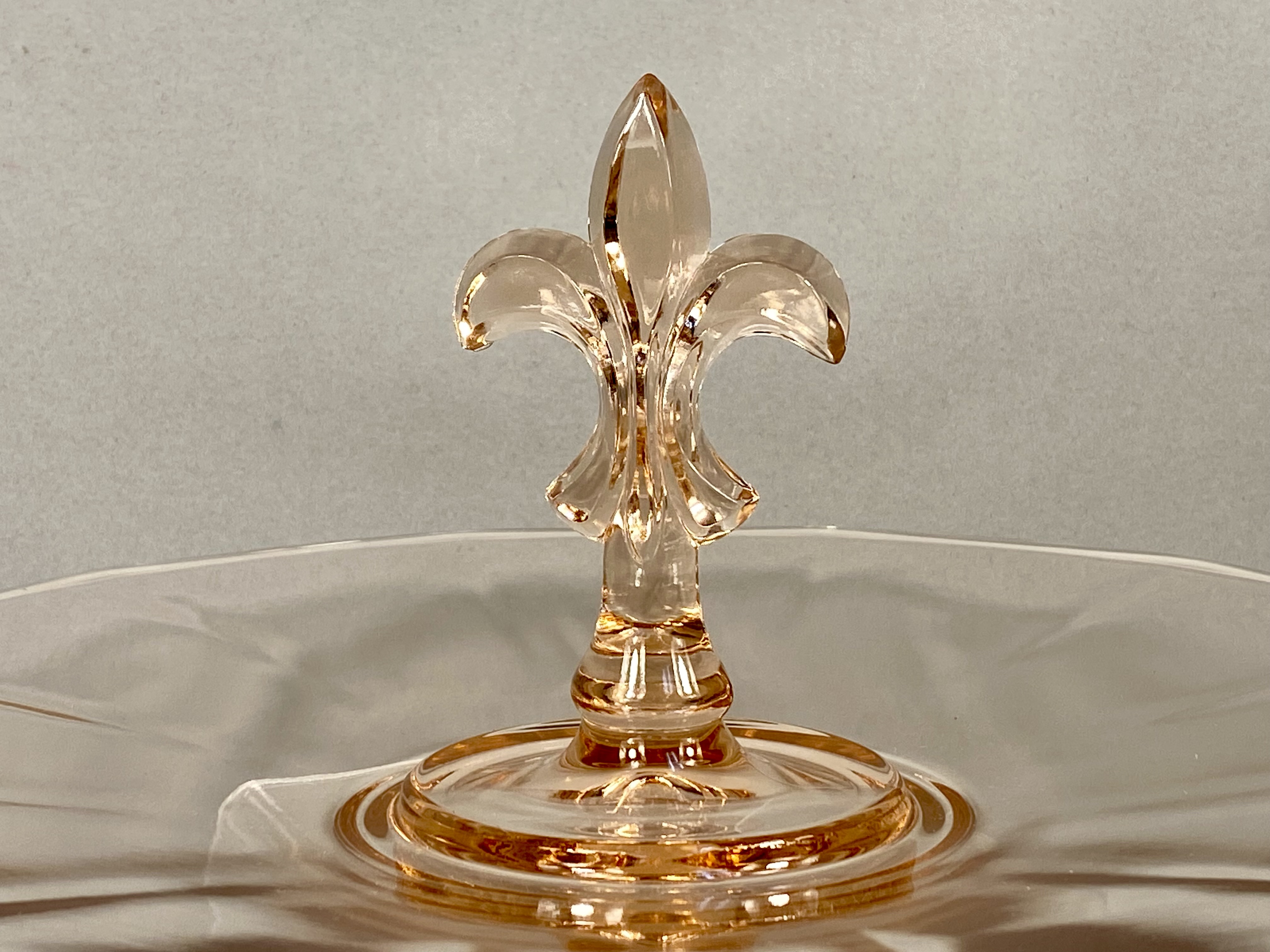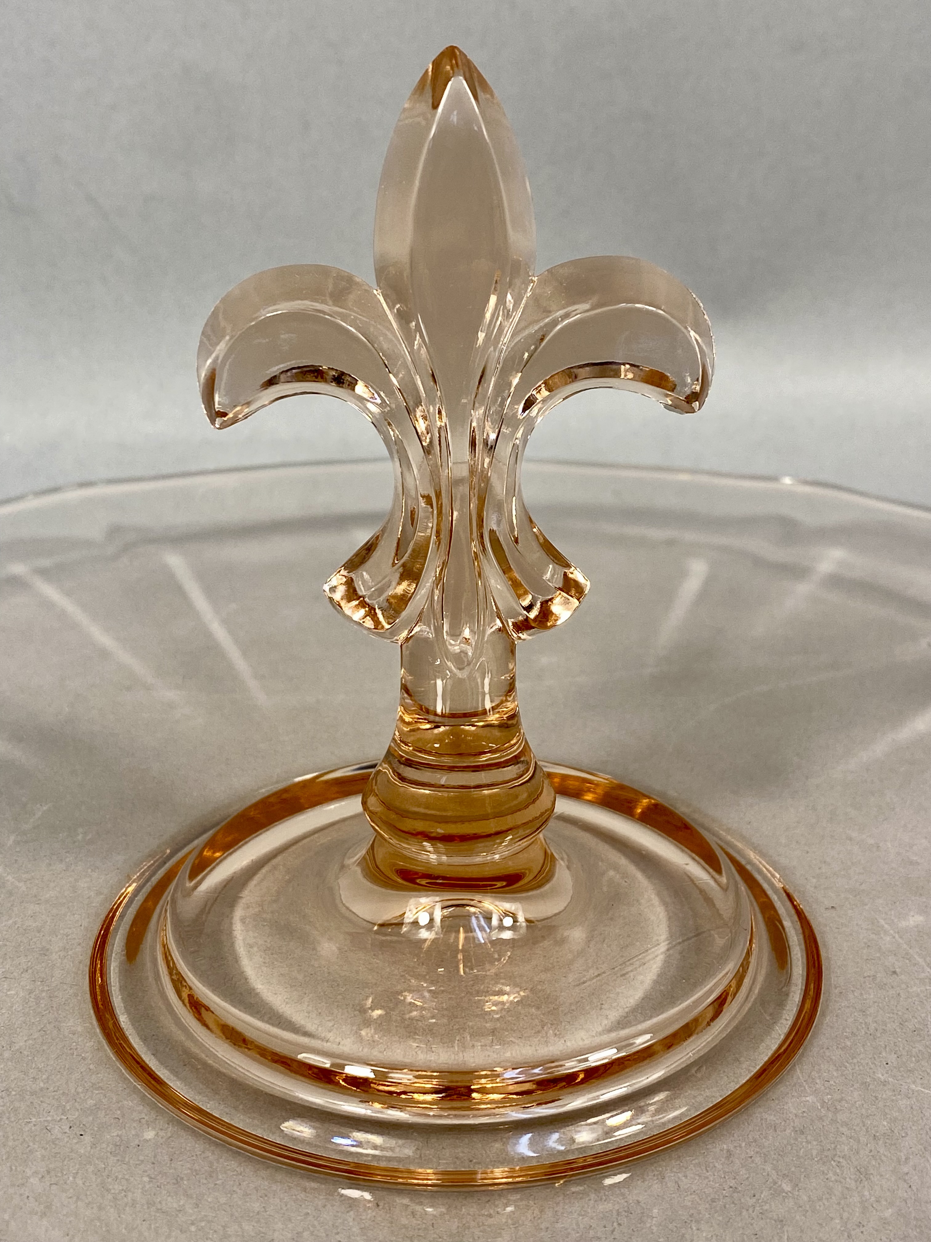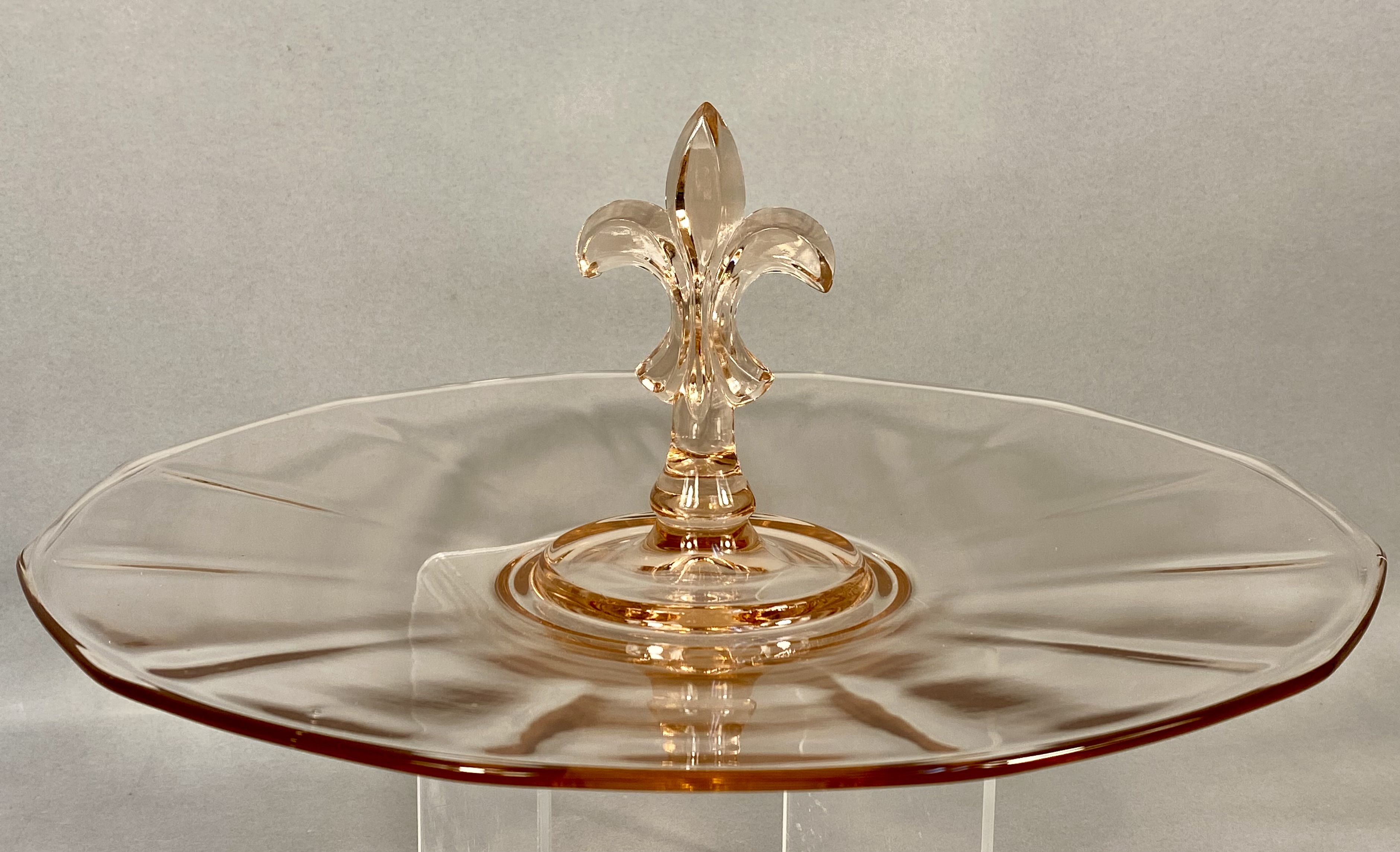 An American Depression-era pressed glass sandwich tray attributed to the Fostoria Glass Company. This circular tray is rendered in a translucent light pink hue and features a prominent central handle molded in the form of a fleur-de-lis. The tray exhibits a shallow profile with a subtly scalloped rim and radial optic paneling extending from the center to the edge. While the piece bears no maker marks or signatures, the specific handle form and optic design are characteristic of Fostoria production from the 1930s, often associated with the Versailles pattern. The piece reflects the Art Deco influence prevalent in American decorative glass during the mid-20th century.