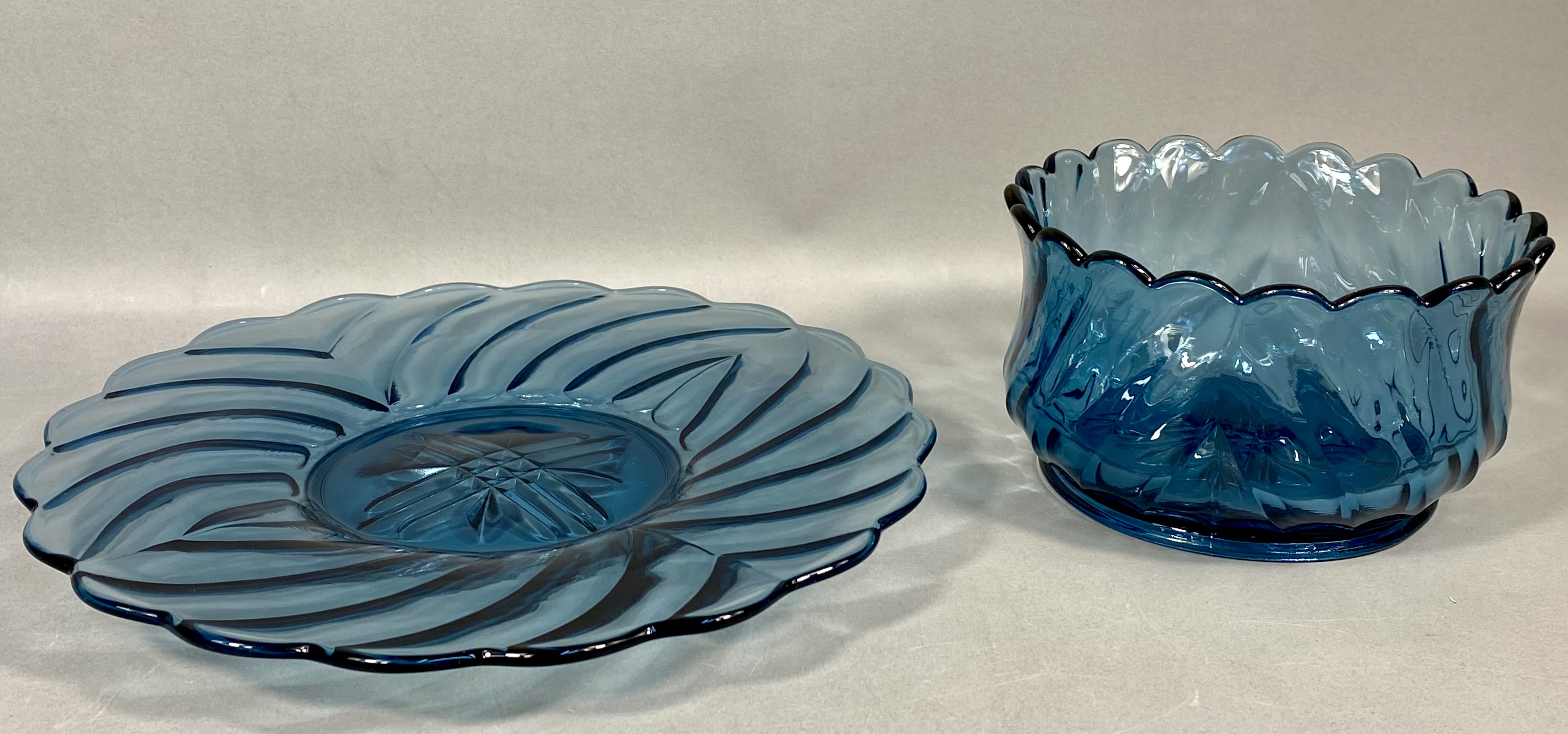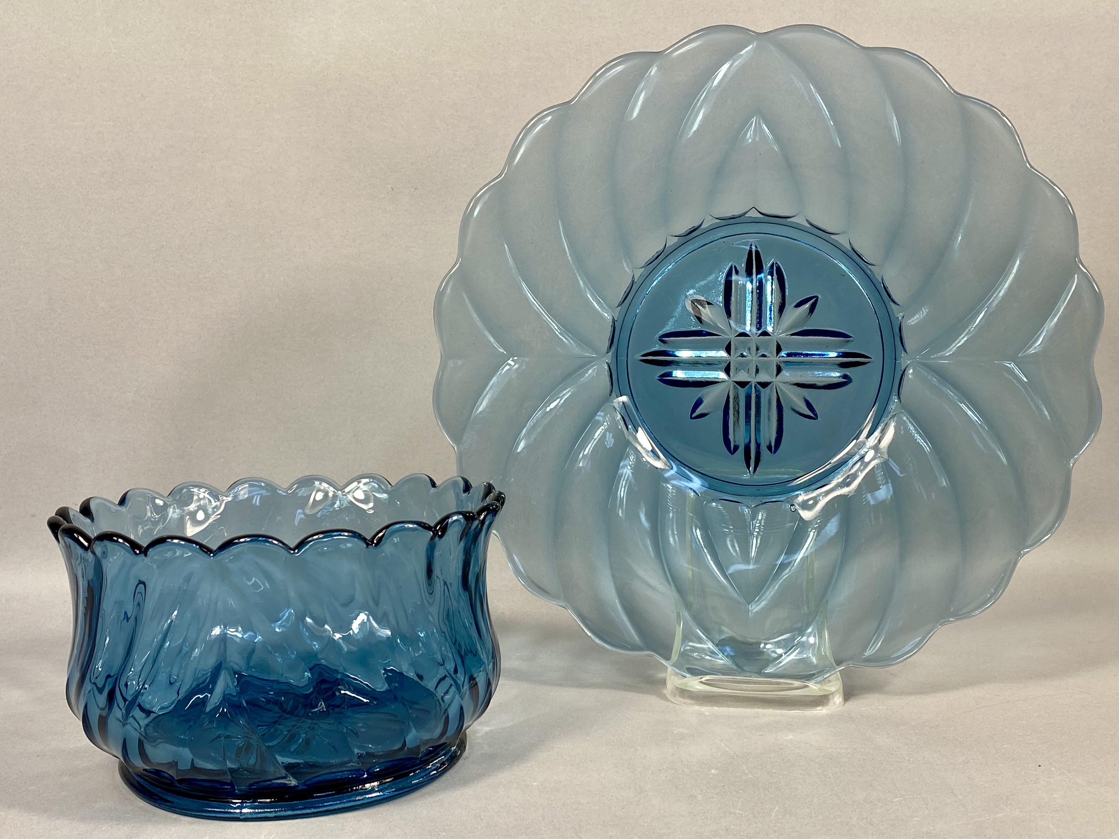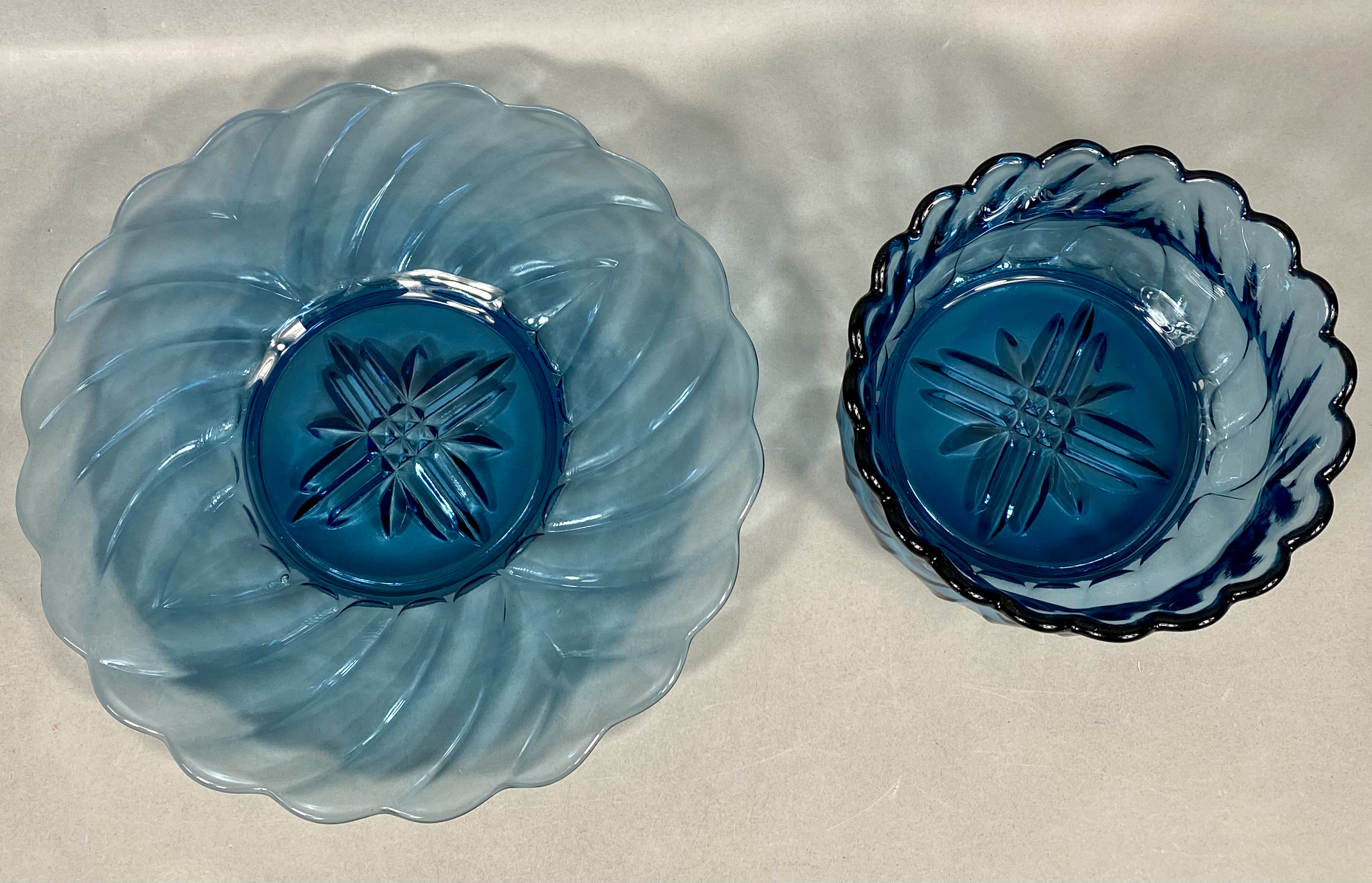 A two-piece collection of vibrant blue pressed glass comprising a large serving plate and a coordinating bowl. Each piece is executed in a transparent blue glass featuring a prominent central molded starburst motif. The plate displays a wide, swirled optic rim with a scalloped edge, while the matching bowl features a deep, swirled optic body and a similarly scalloped rim. This design is attributed to the Fairfield pattern produced by Anchor Hocking, dating to the mid-20th century. No maker’s marks or signatures are present.