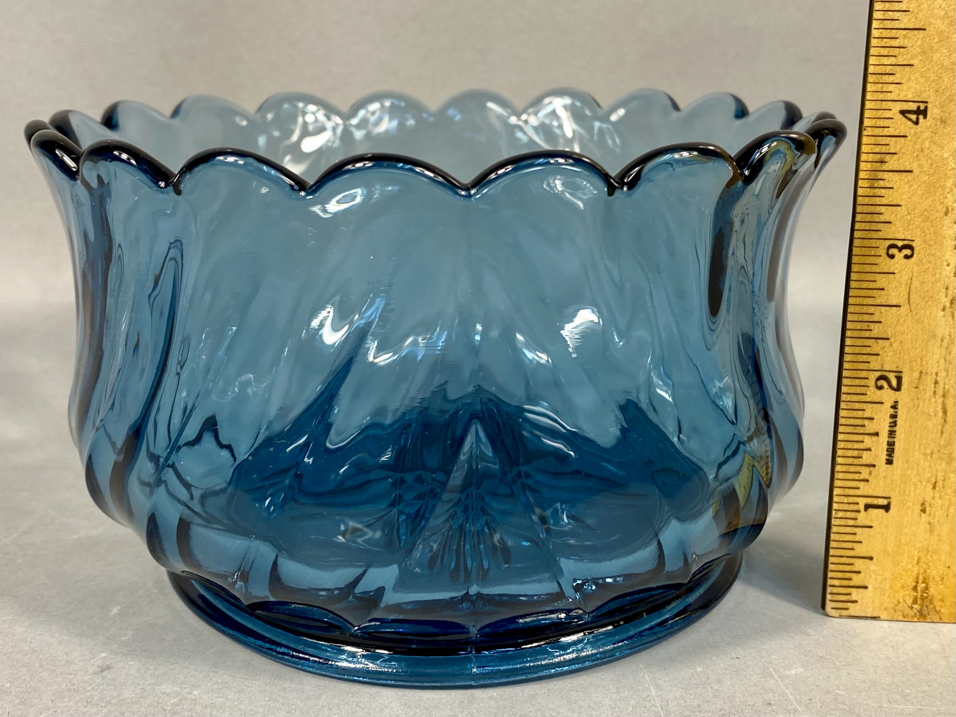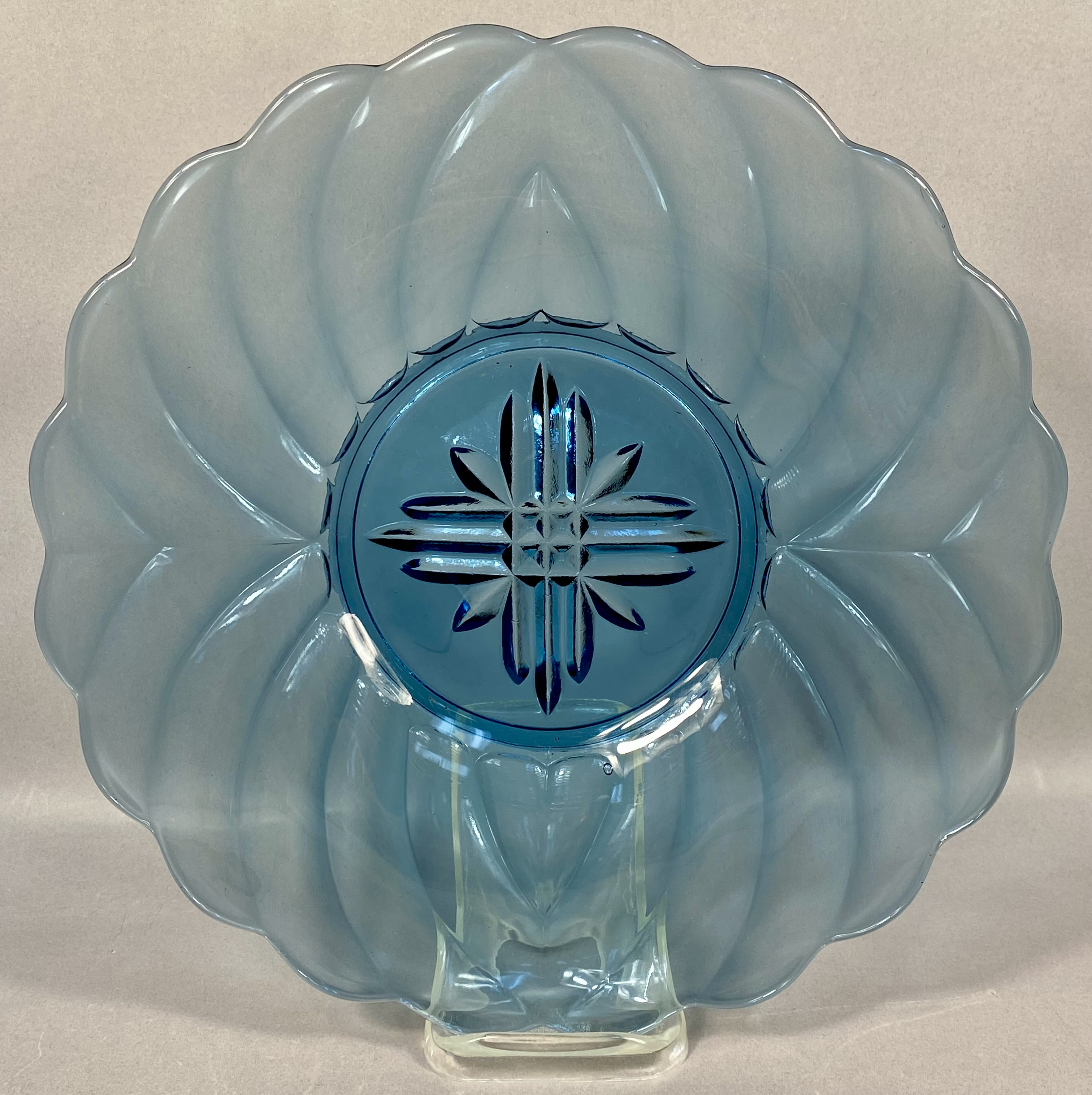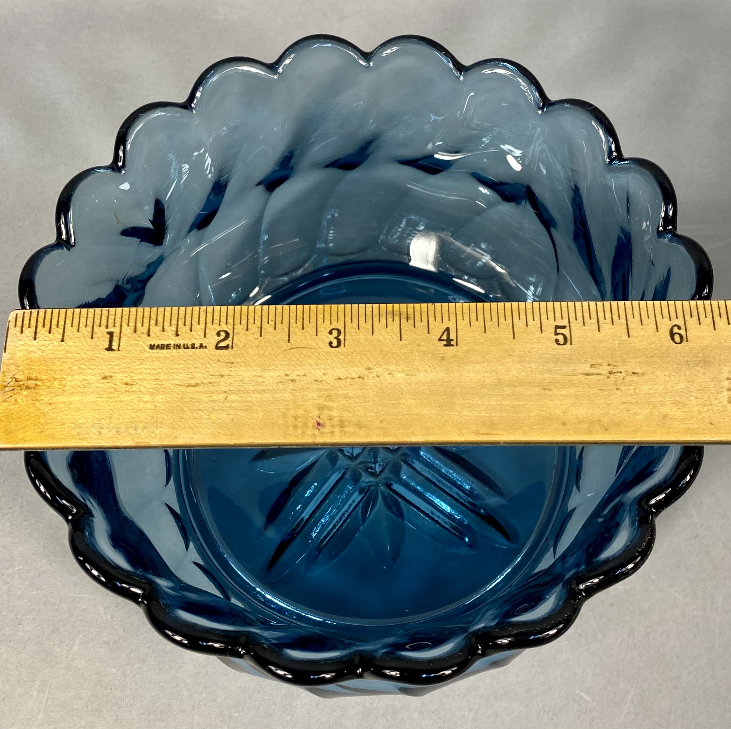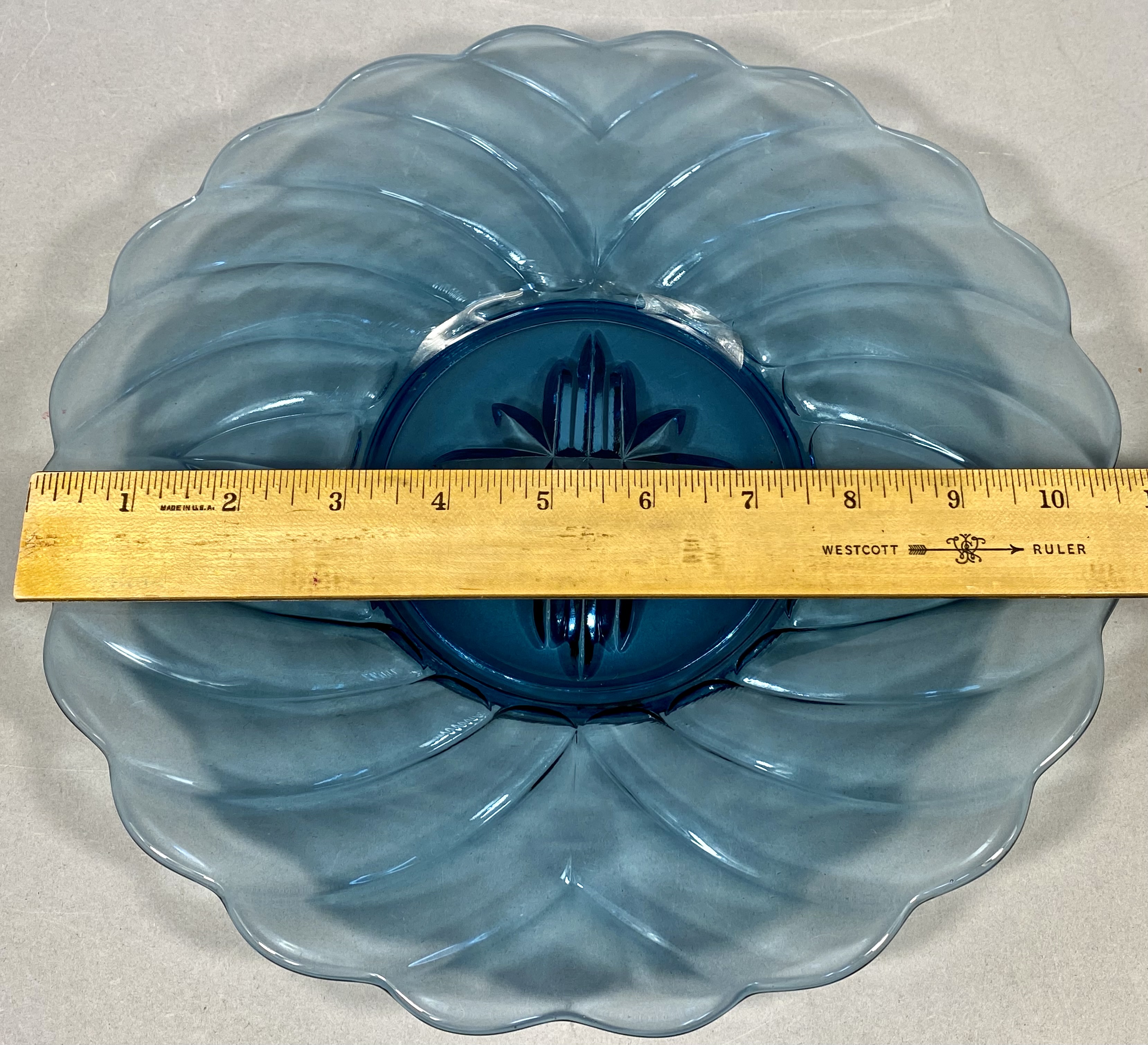 A two-piece collection of vibrant blue pressed glass comprising a large serving plate and a coordinating bowl. Each piece is executed in a transparent blue glass featuring a prominent central molded starburst motif. The plate displays a wide, swirled optic rim with a scalloped edge, while the matching bowl features a deep, swirled optic body and a similarly scalloped rim. This design is attributed to the Fairfield pattern produced by Anchor Hocking, dating to the mid-20th century. No maker’s marks or signatures are present.