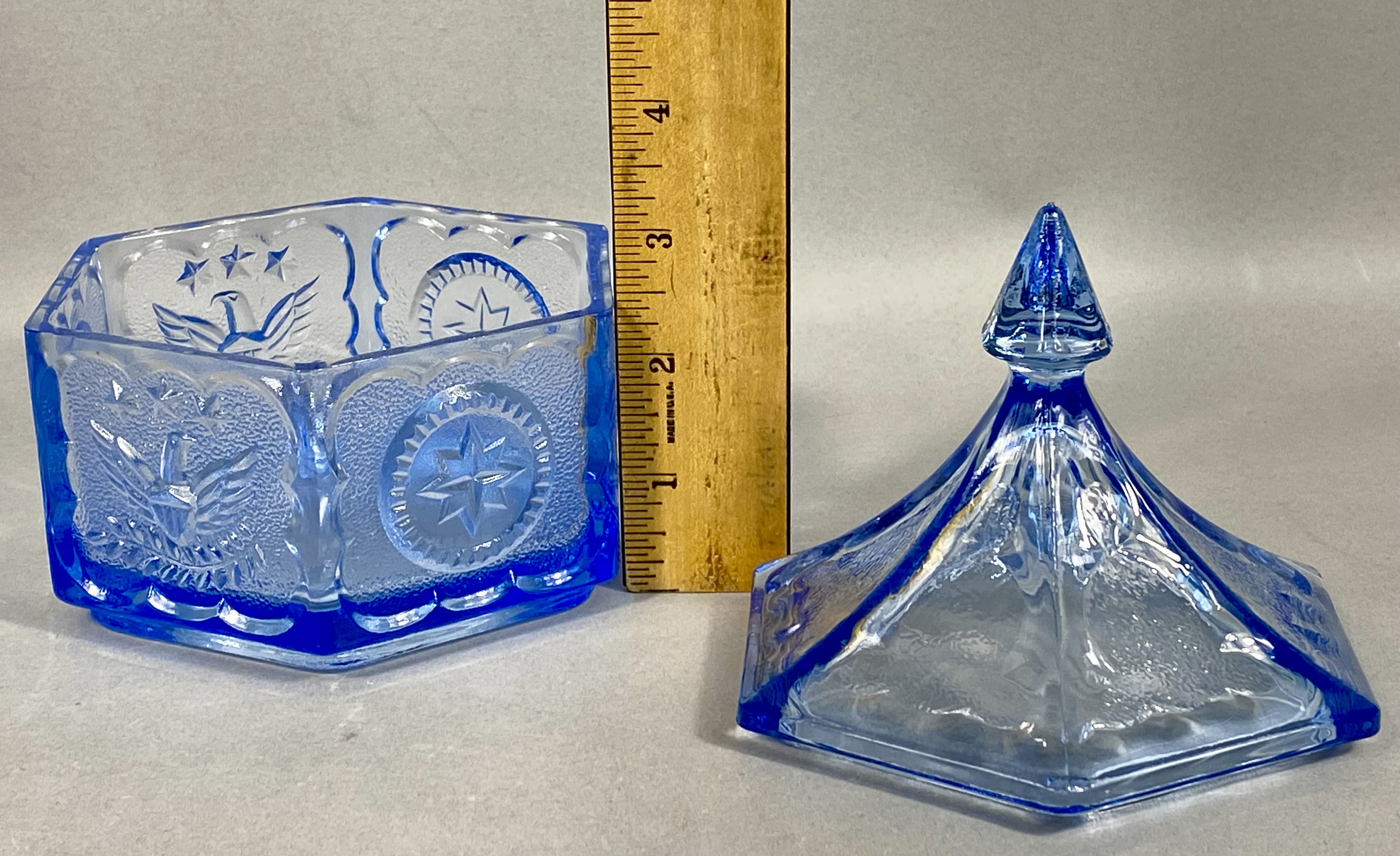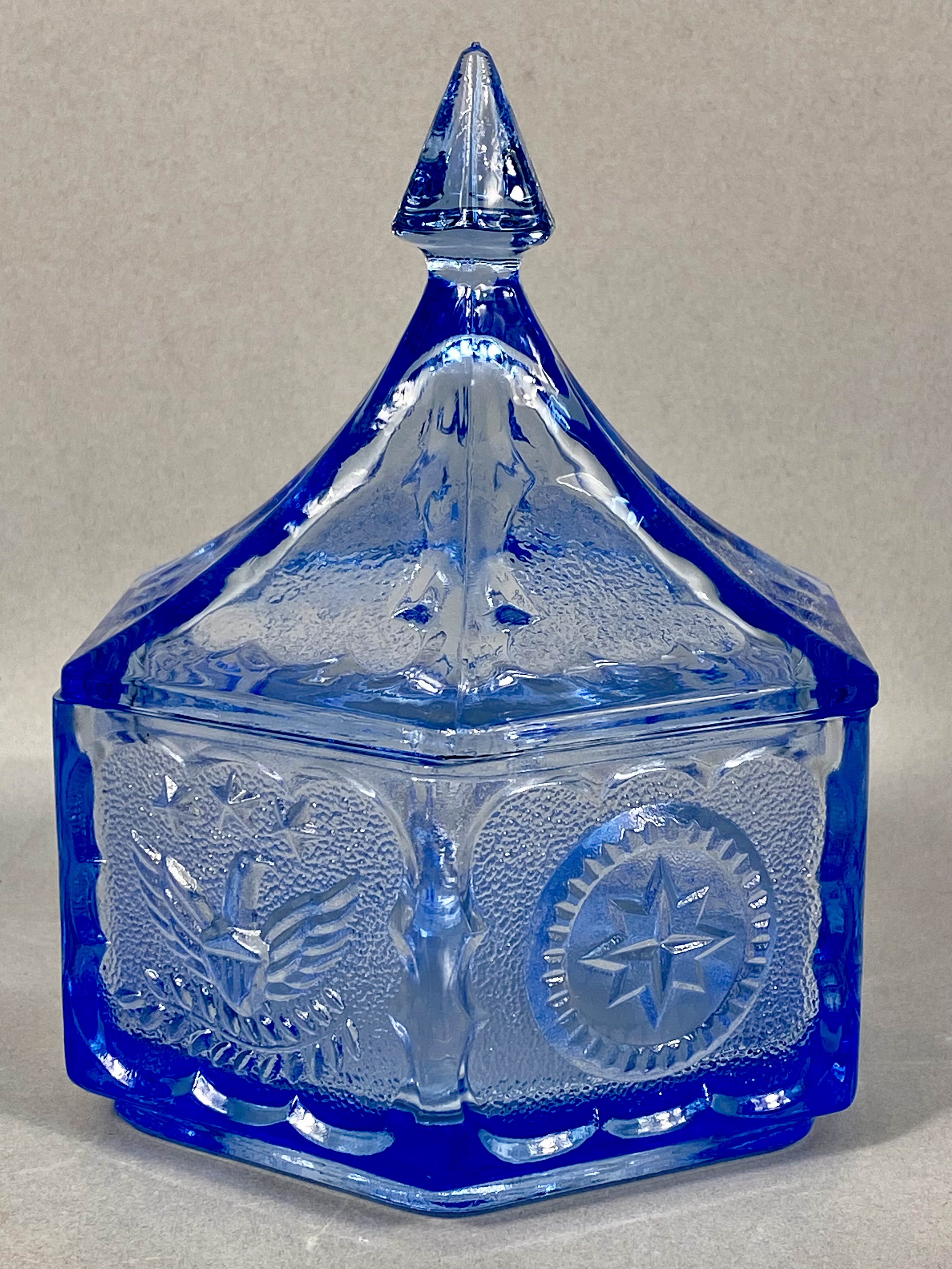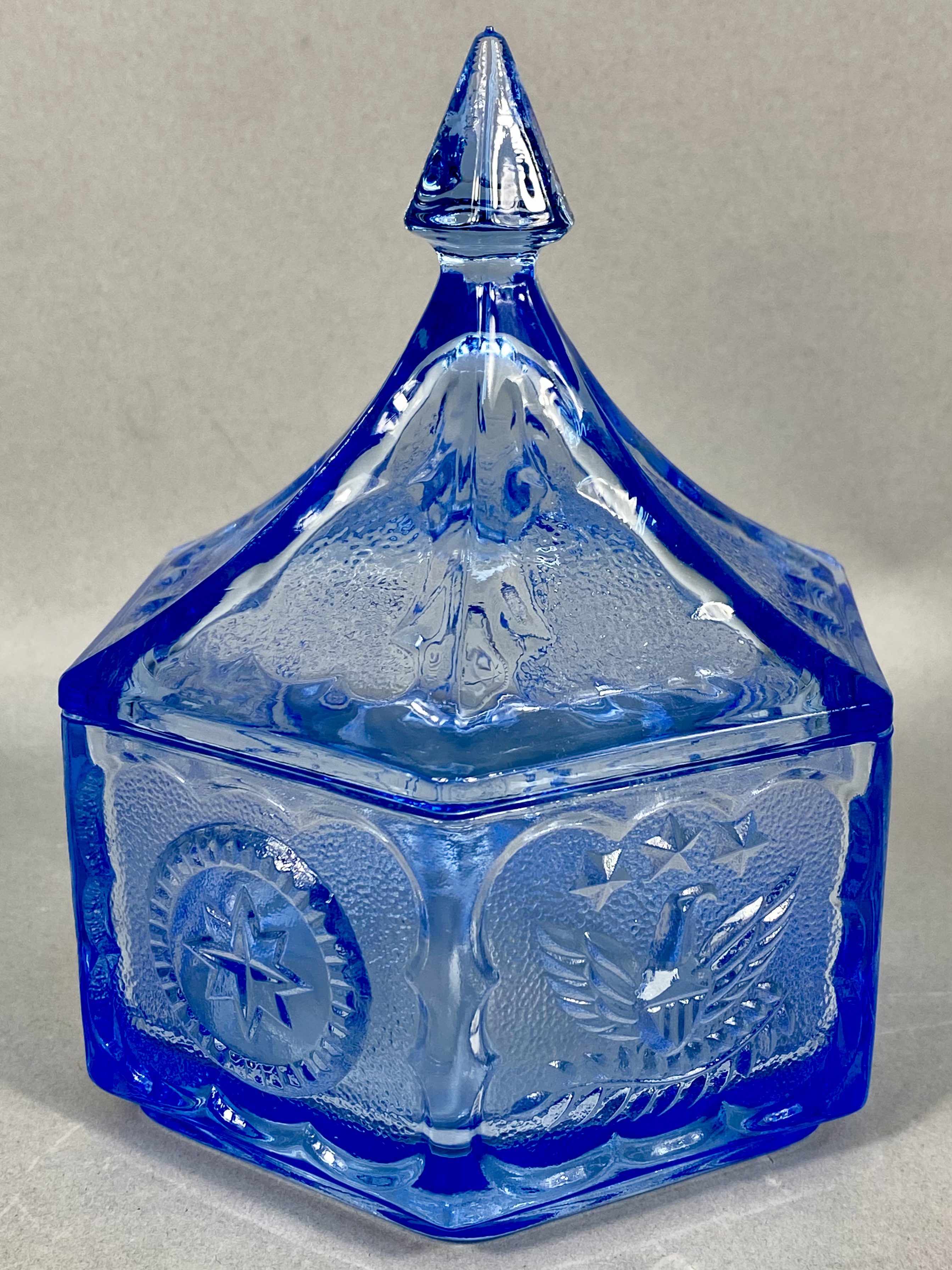A hexagonal pressed blue glass lidded candy dish, attributed to the Indiana Glass Company for the Tiara Exclusives line, circa 1970s. The vessel features a series of alternating molded panels: one depicting a heraldic eagle with outspread wings beneath three stars, and the other a central eight-pointed star within a circular border. Both decorative elements are set against a finely stippled ground. The matching hexagonal lid tapers to a sharp, faceted finial. This piece reflects the patriotic motifs popular during the American Bicentennial era. No maker’s marks or signatures are present.