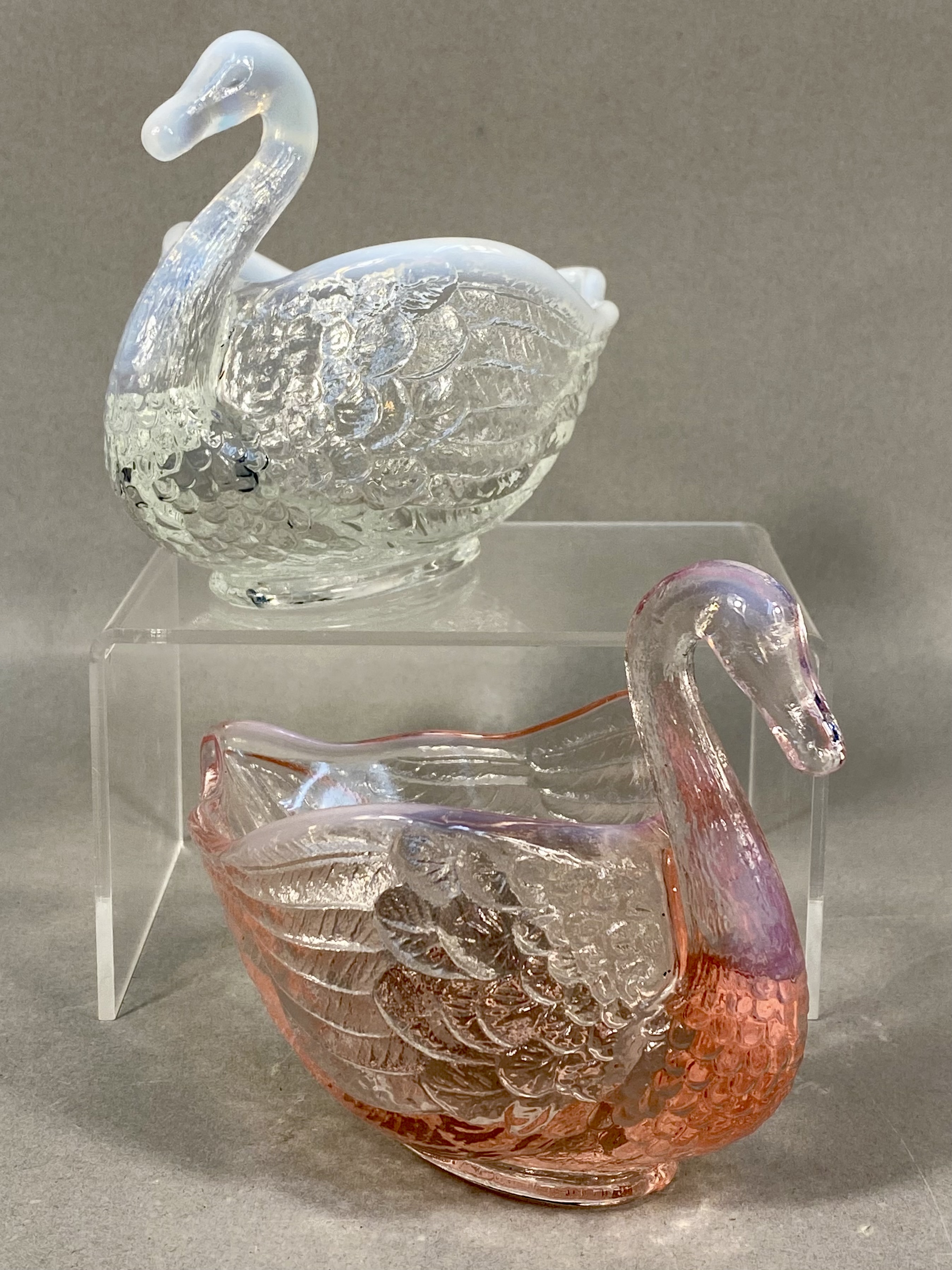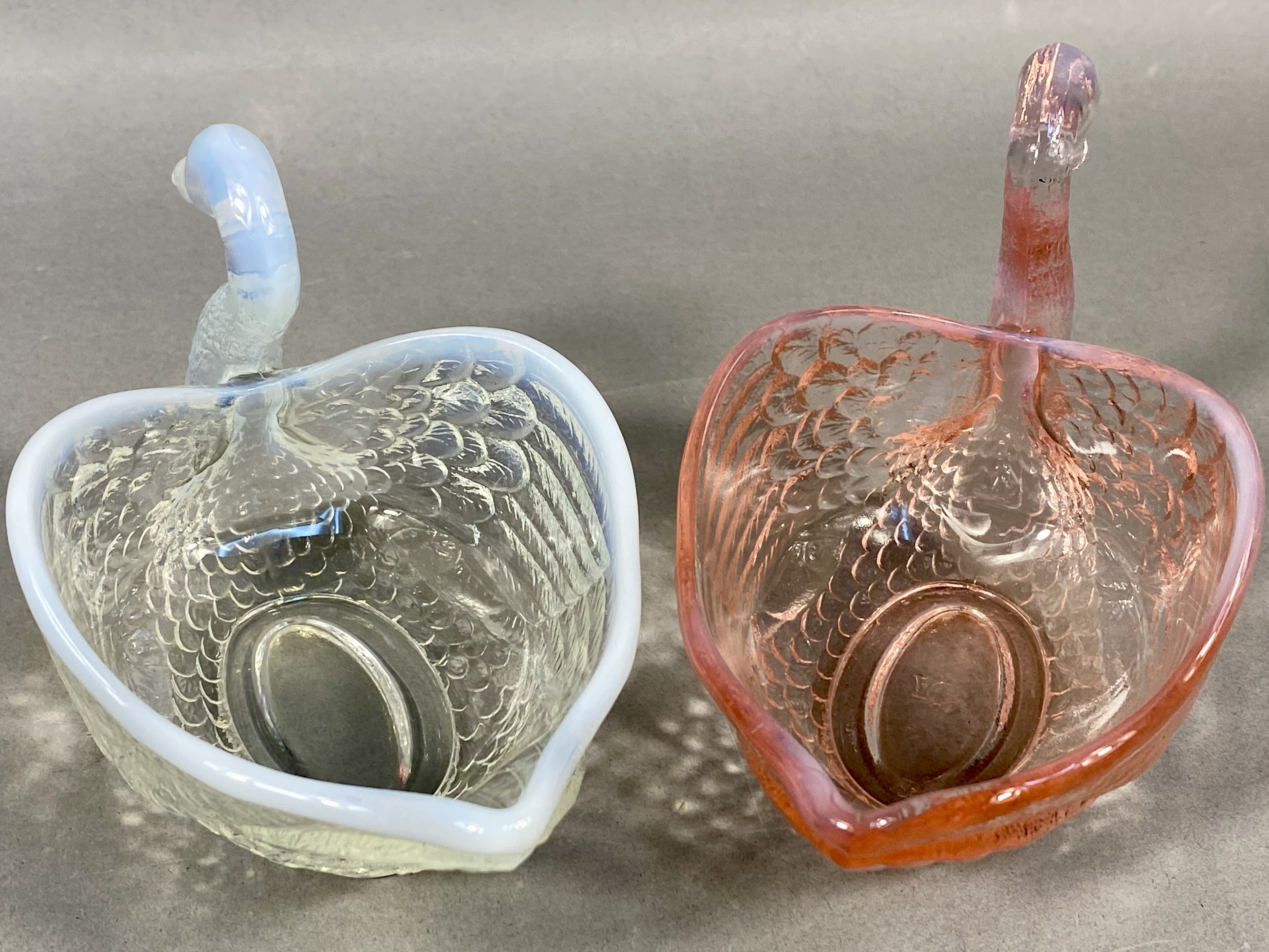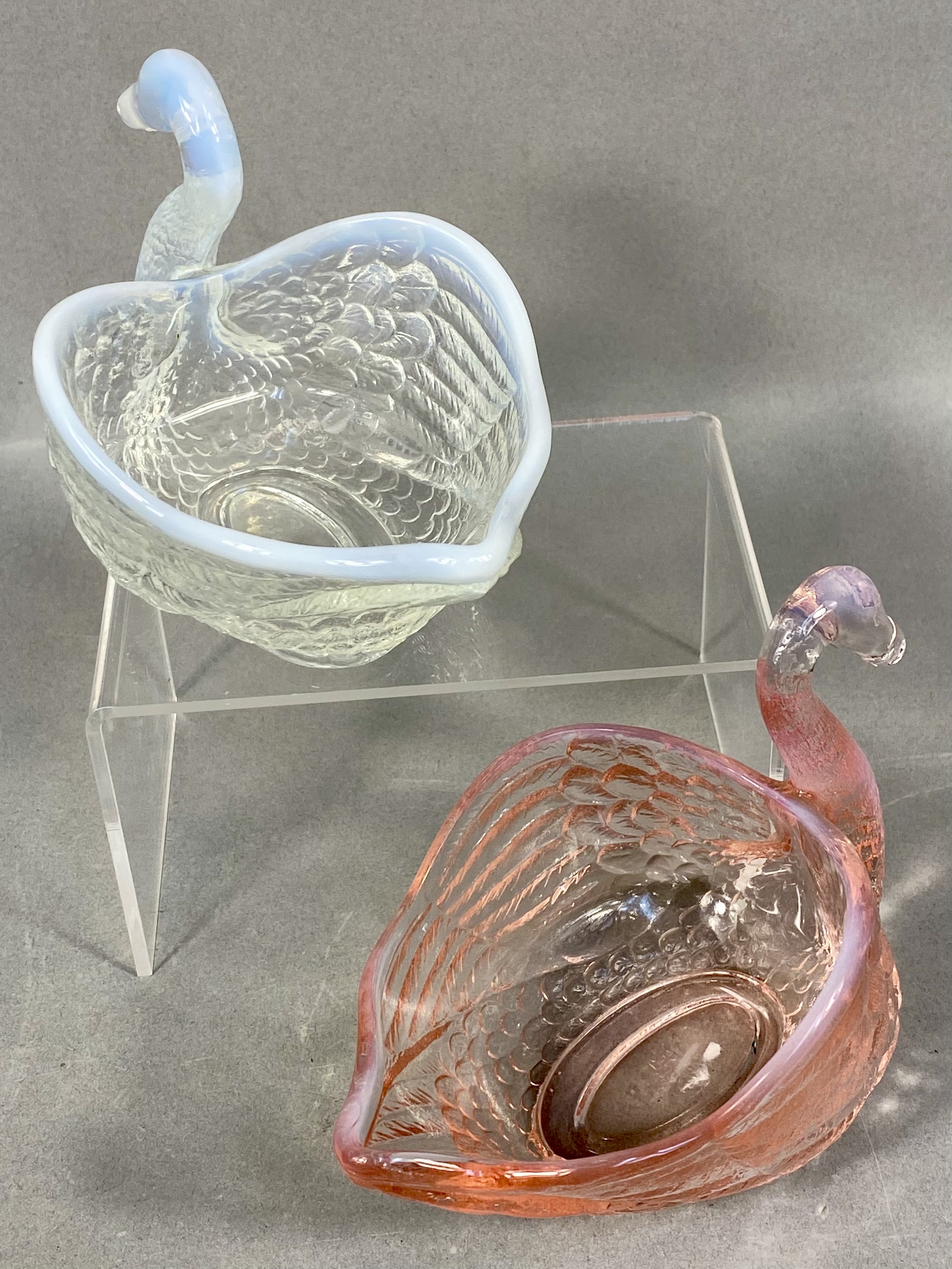 A pair of mid-20th century pressed glass open salts or decorative trinket bowls in the form of swans. The set includes one colorless glass example and one in a soft rose pink hue. Both pieces exhibit a characteristic opalescent finish concentrated along the rims and the gracefully arched necks. The exterior of each swan is molded with a detailed feather pattern, and both are set upon integral oval bases. The pink swan features an embossed overlapping monogram of the letters A and G on the underside of the base, the official mark of the Akro Agate Company. These figurines are representative of American glass production from the 1930s to the 1940s.