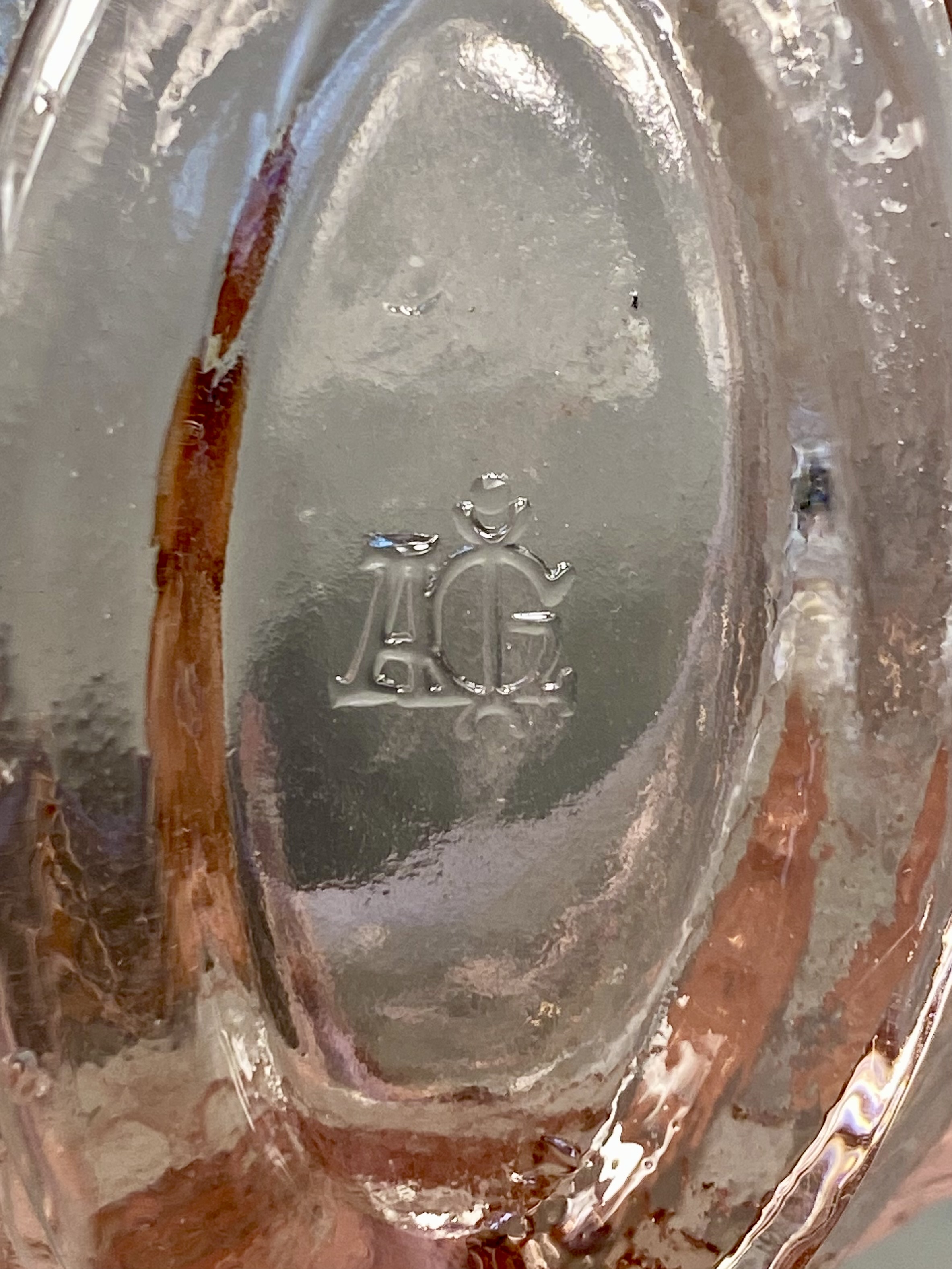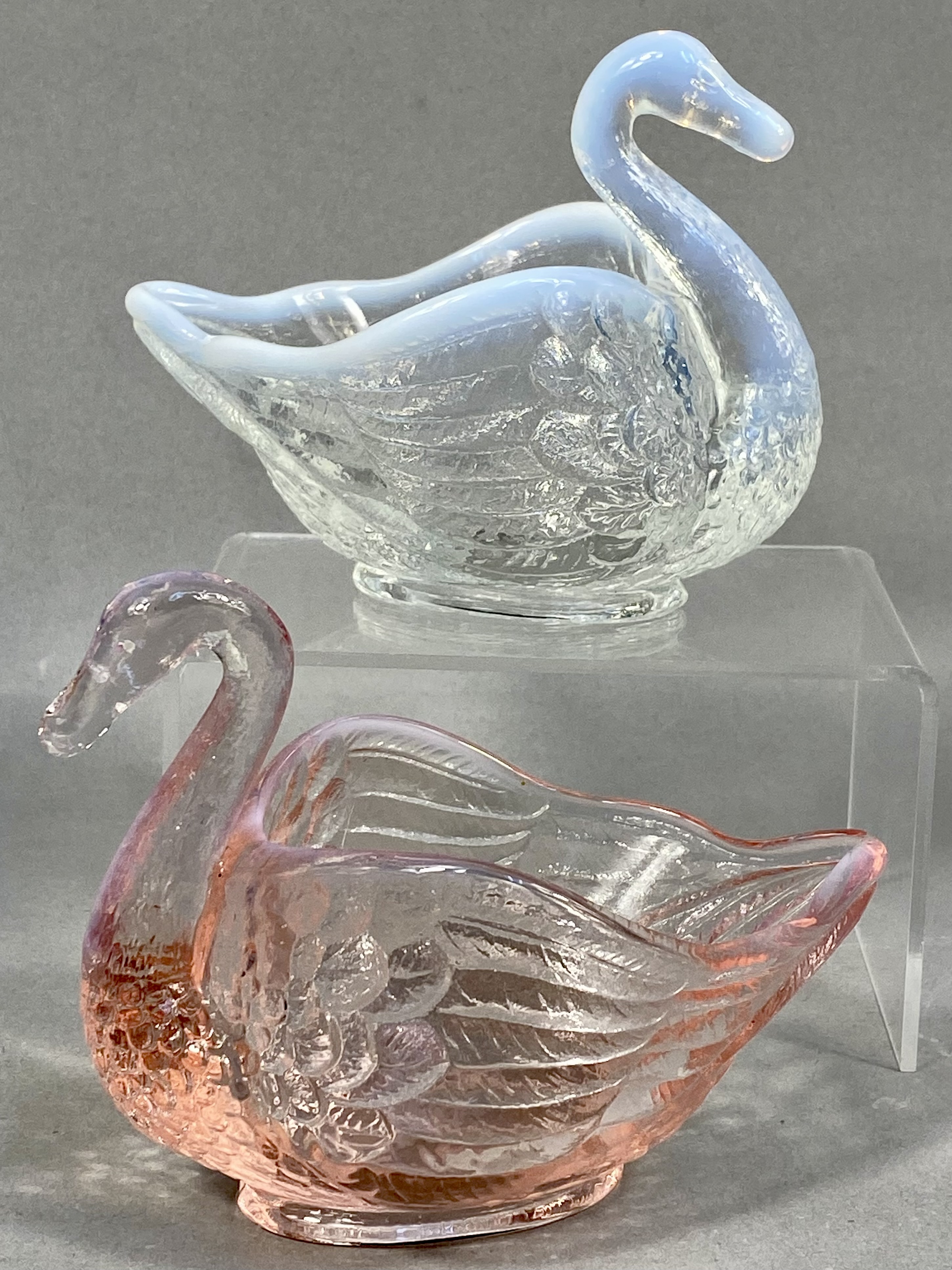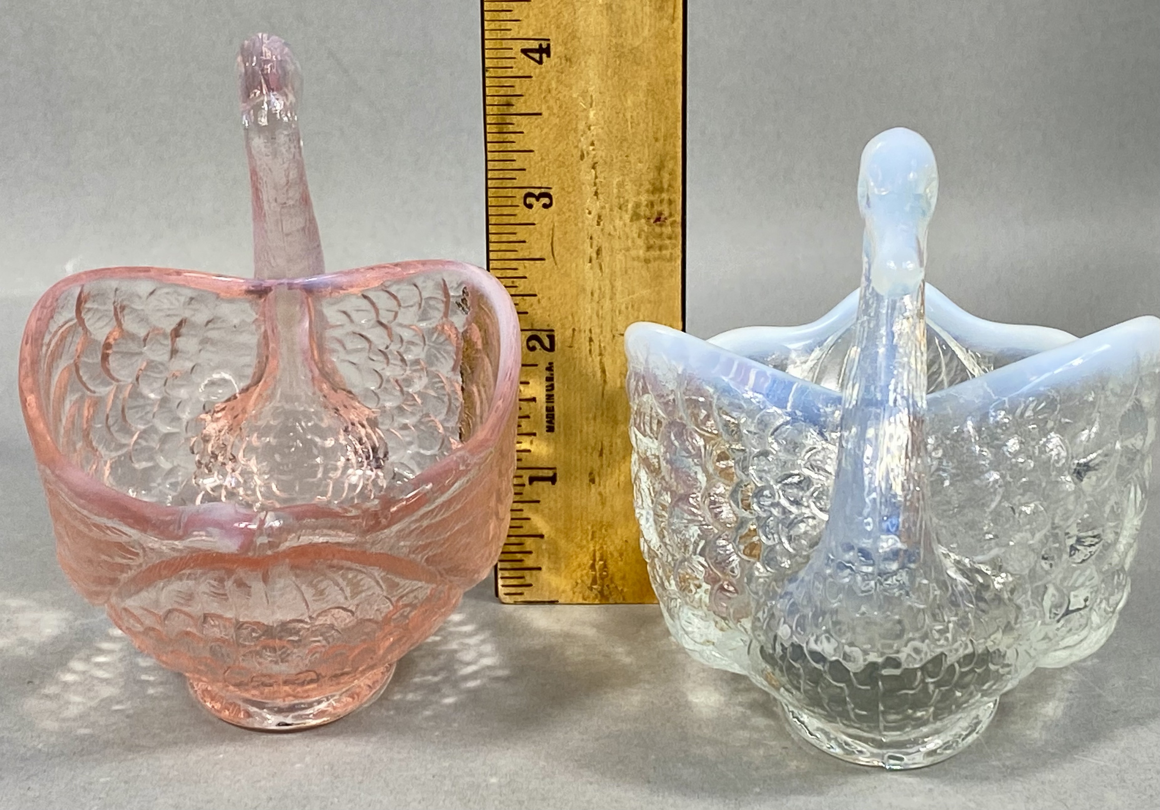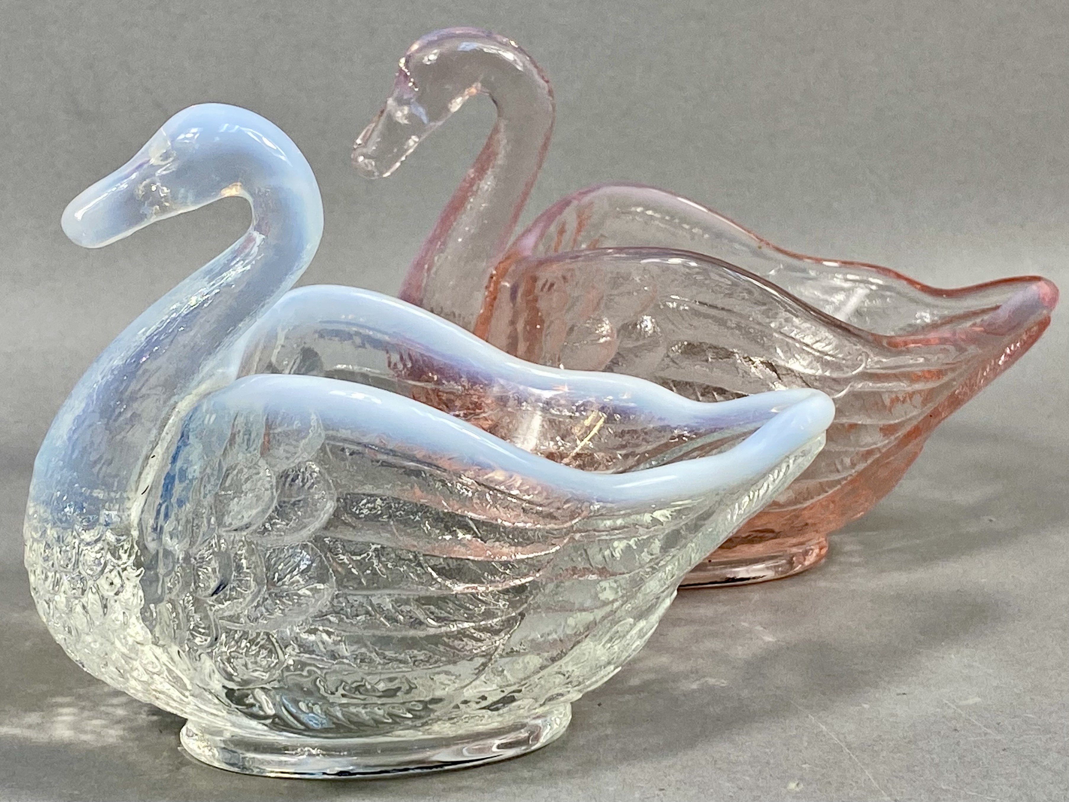 A pair of mid-20th century pressed glass open salts or decorative trinket bowls in the form of swans. The set includes one colorless glass example and one in a soft rose pink hue. Both pieces exhibit a characteristic opalescent finish concentrated along the rims and the gracefully arched necks. The exterior of each swan is molded with a detailed feather pattern, and both are set upon integral oval bases. The pink swan features an embossed overlapping monogram of the letters A and G on the underside of the base, the official mark of the Akro Agate Company. These figurines are representative of American glass production from the 1930s to the 1940s.