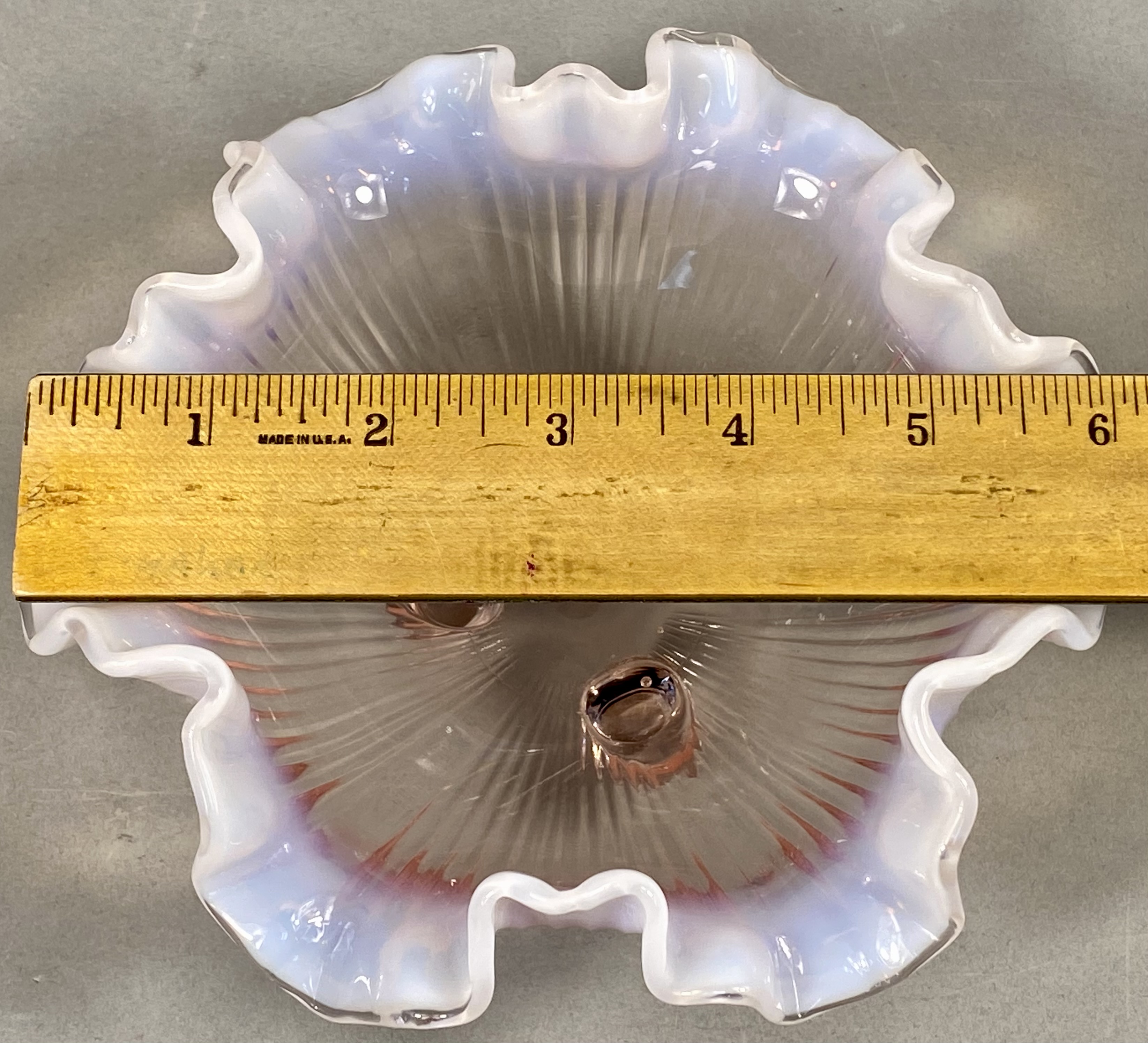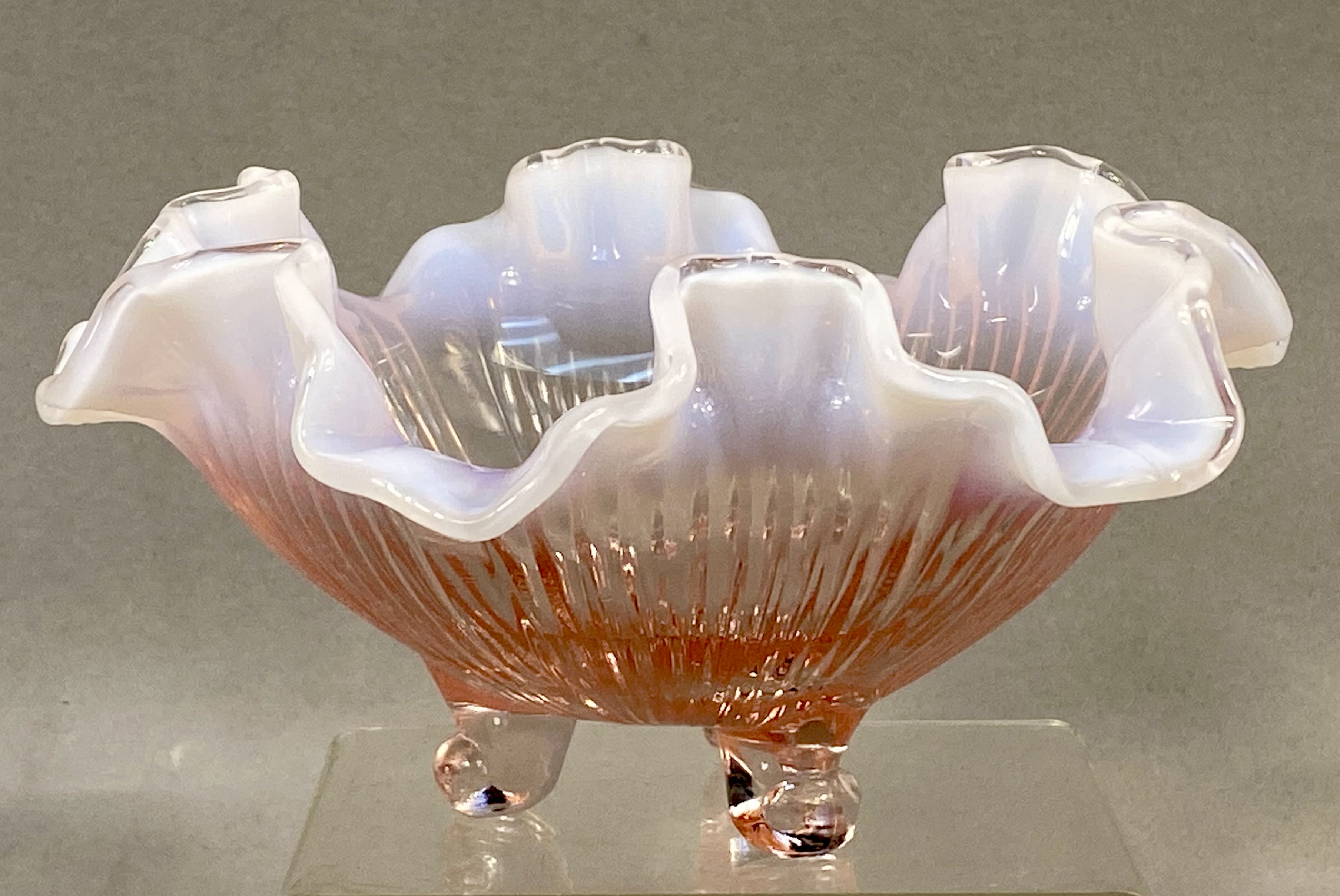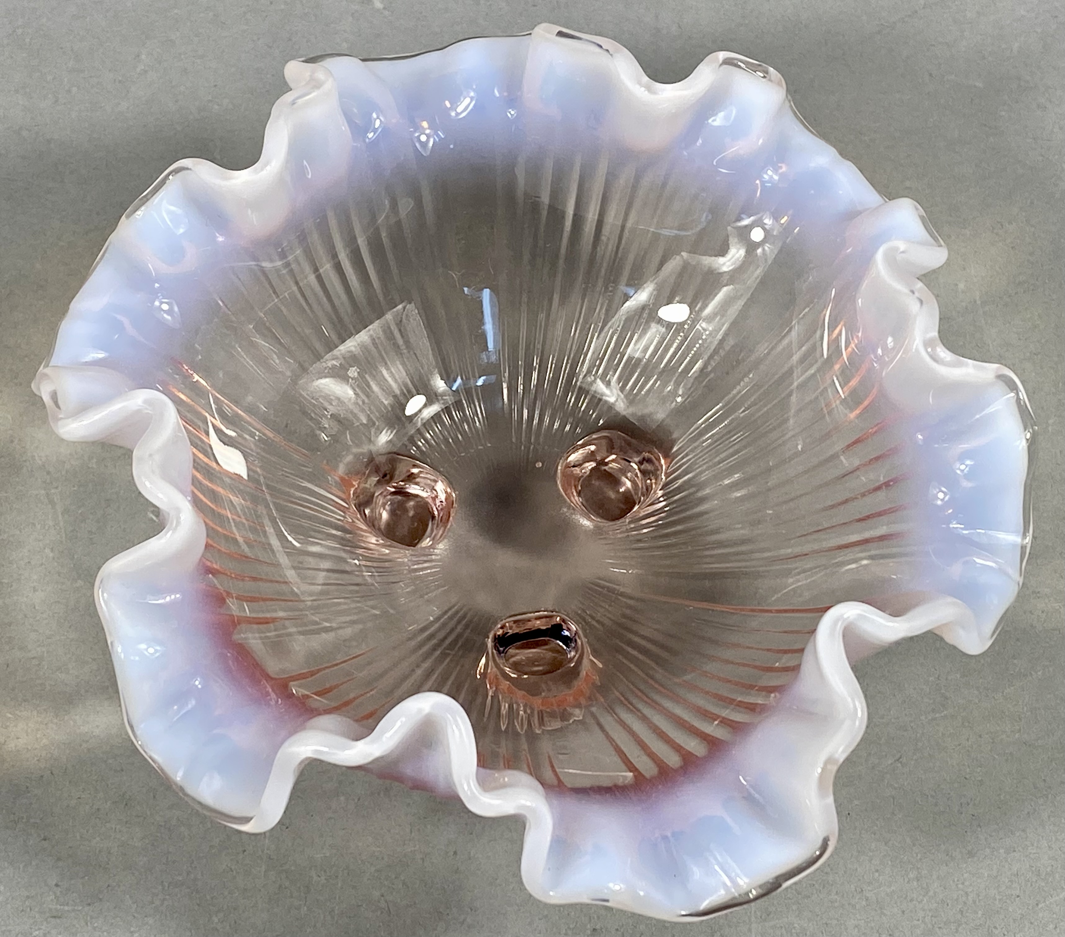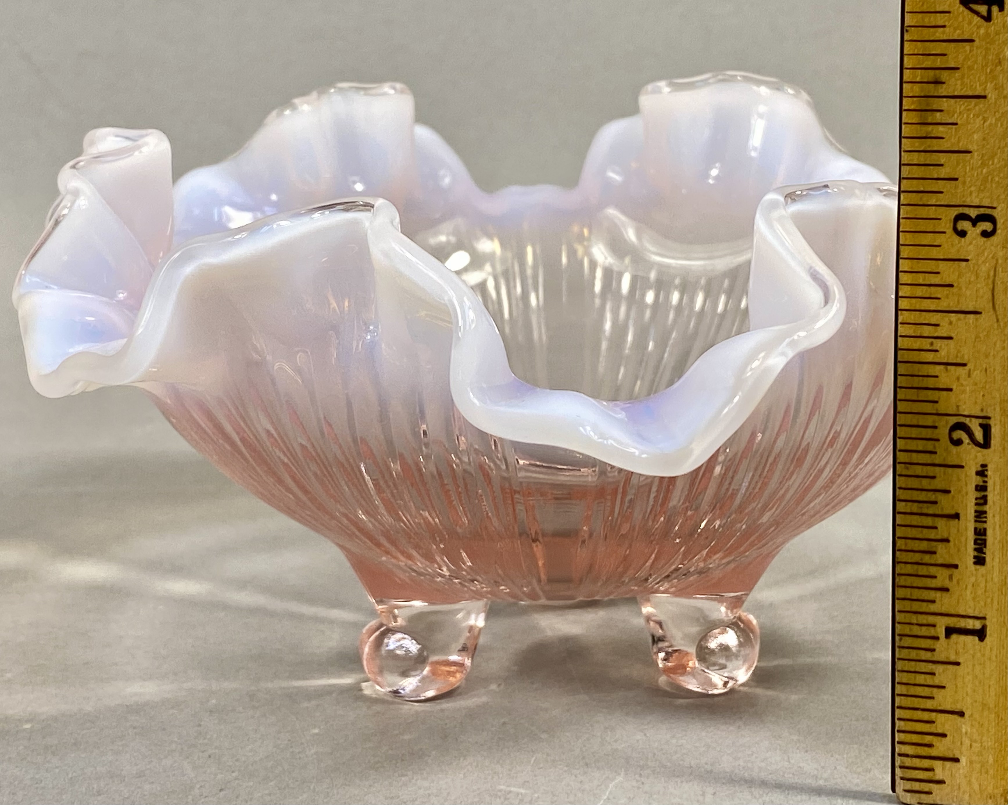 This press-molded glass bowl is in the Heirloom pattern, attributed to the Fostoria Glass Company. The piece features a transparent pink body, also described as rose or peach, with a distinct milky white opalescent treatment applied to the wide, hand-crimped ruffled rim. The exterior surface is detailed with molded vertical ribbing extending from the base toward the edge. The vessel is elevated by three integrated rounded feet. No factory marks, labels, or signatures are visible on the item.